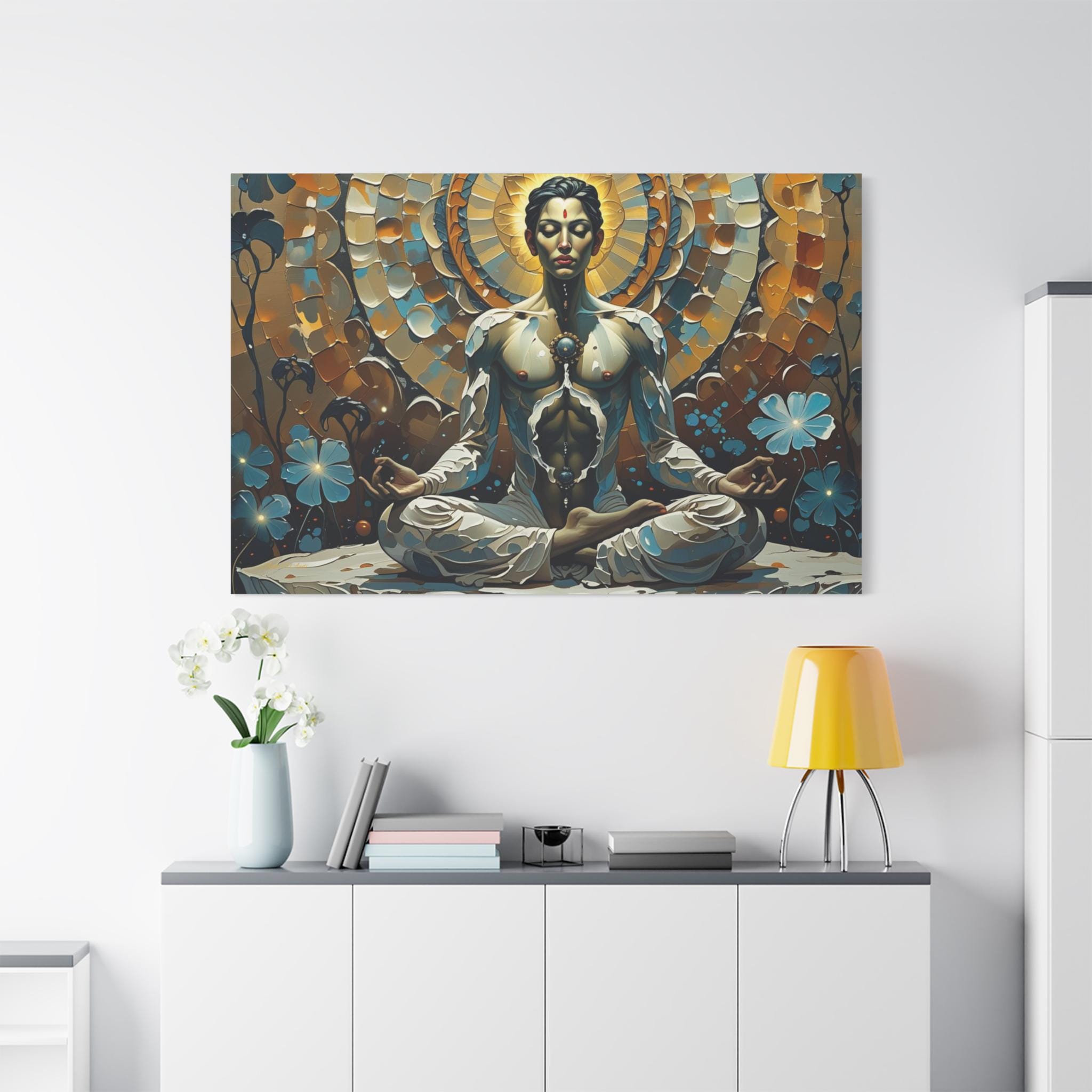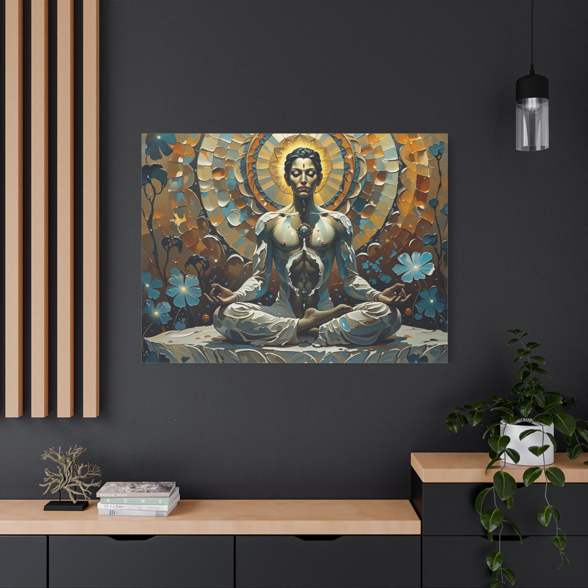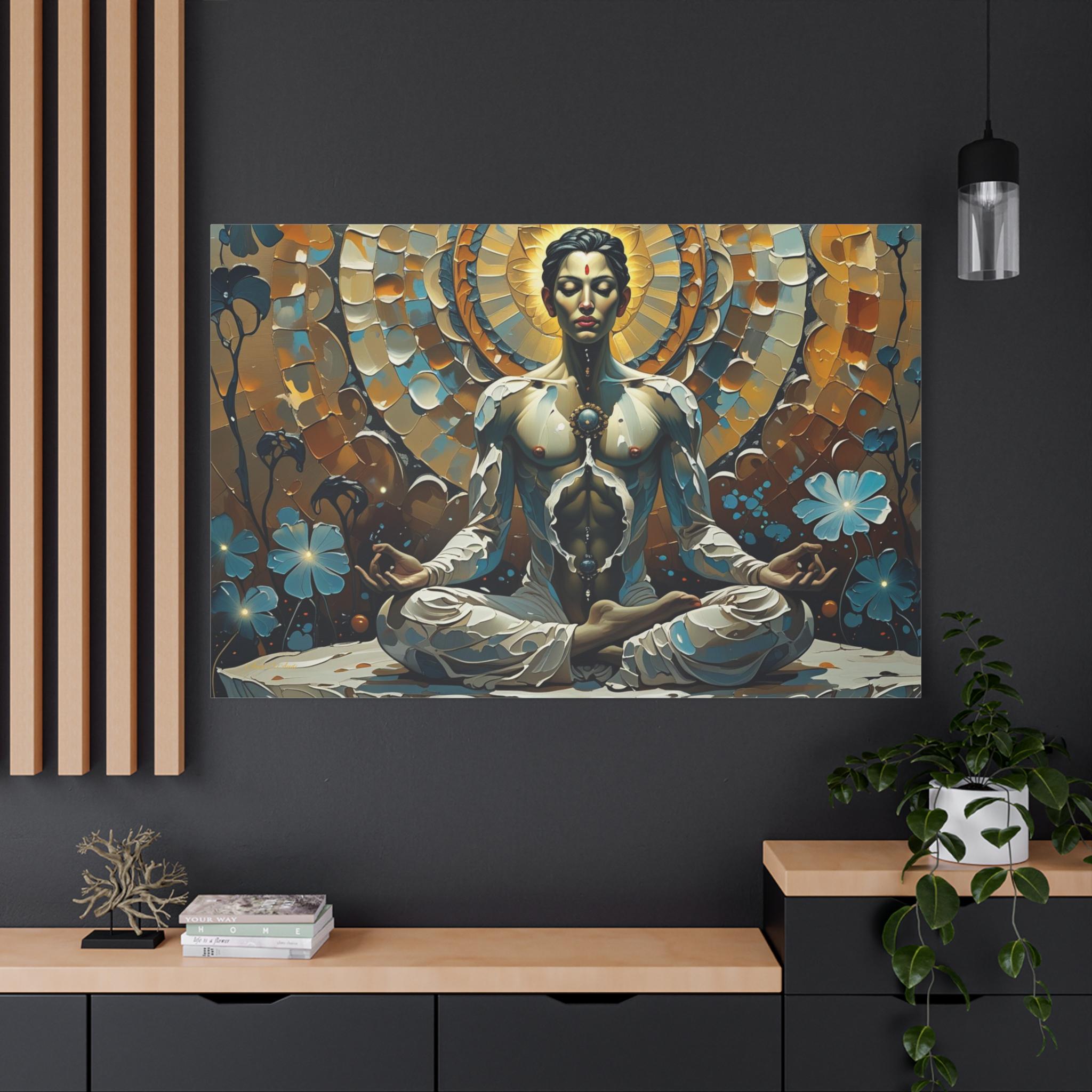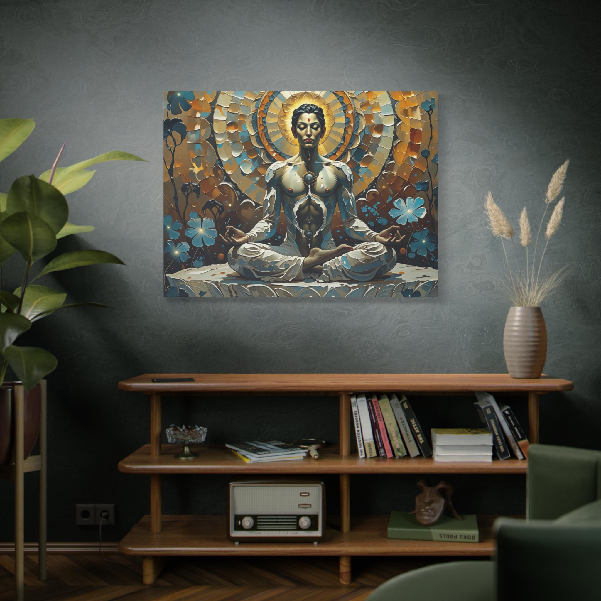 The artwork conveys a sense of profound introspection, transcendence, and inner light overcoming physical form. The intense gaze and the cosmic background make it a powerful, sophisticated statement piece suitable for spaces dedicated to mindfulness, contemporary design, or spiritual exploration.