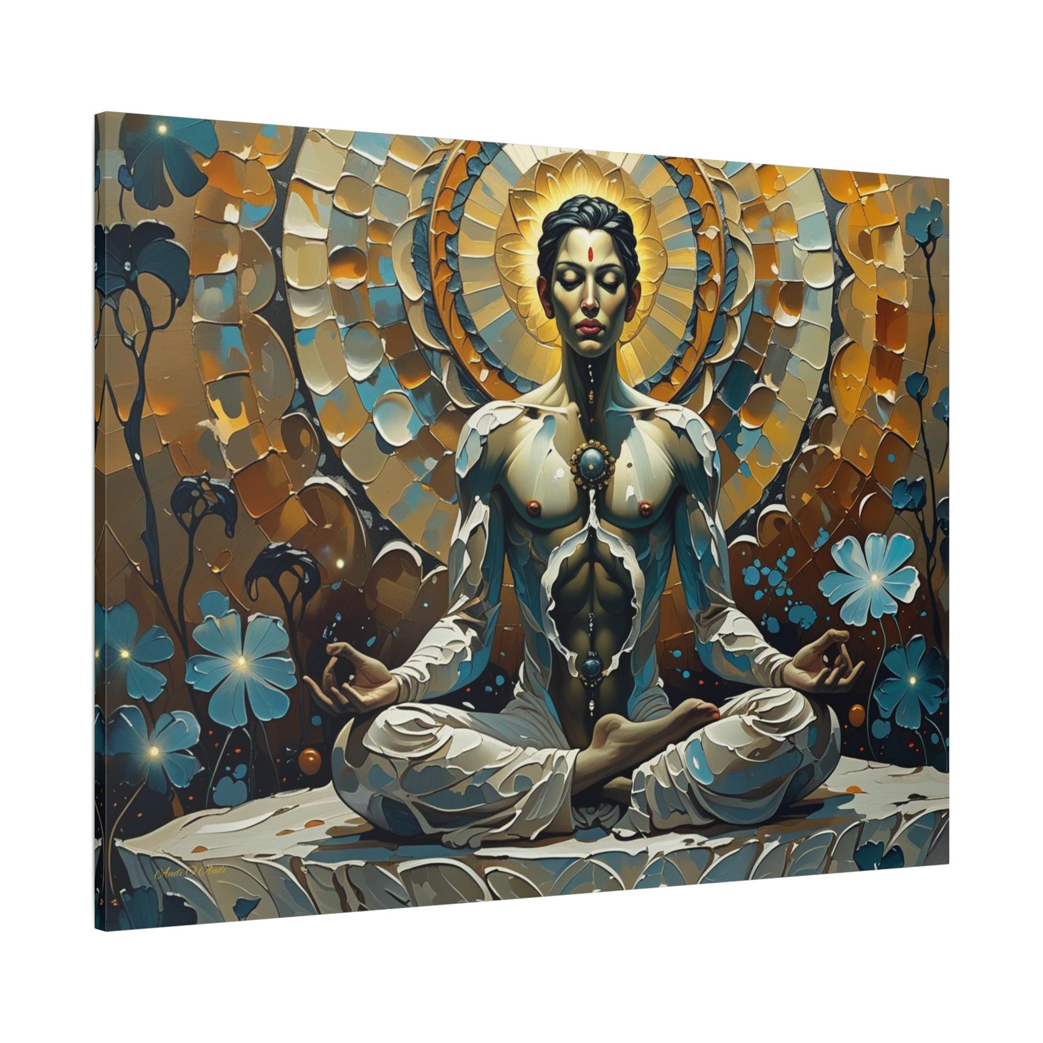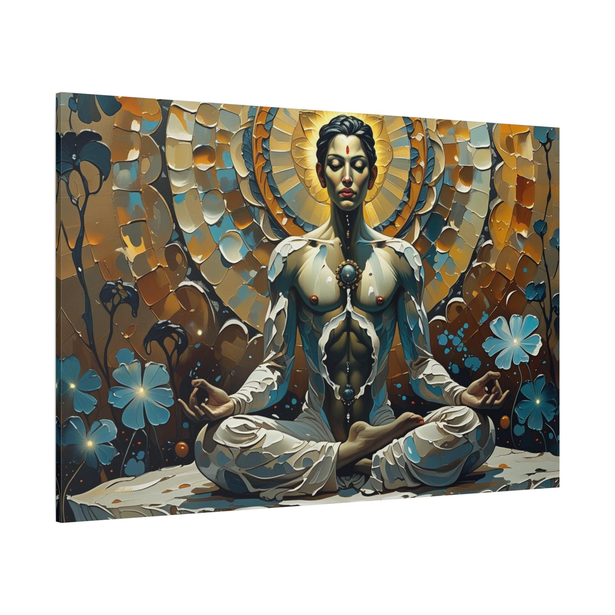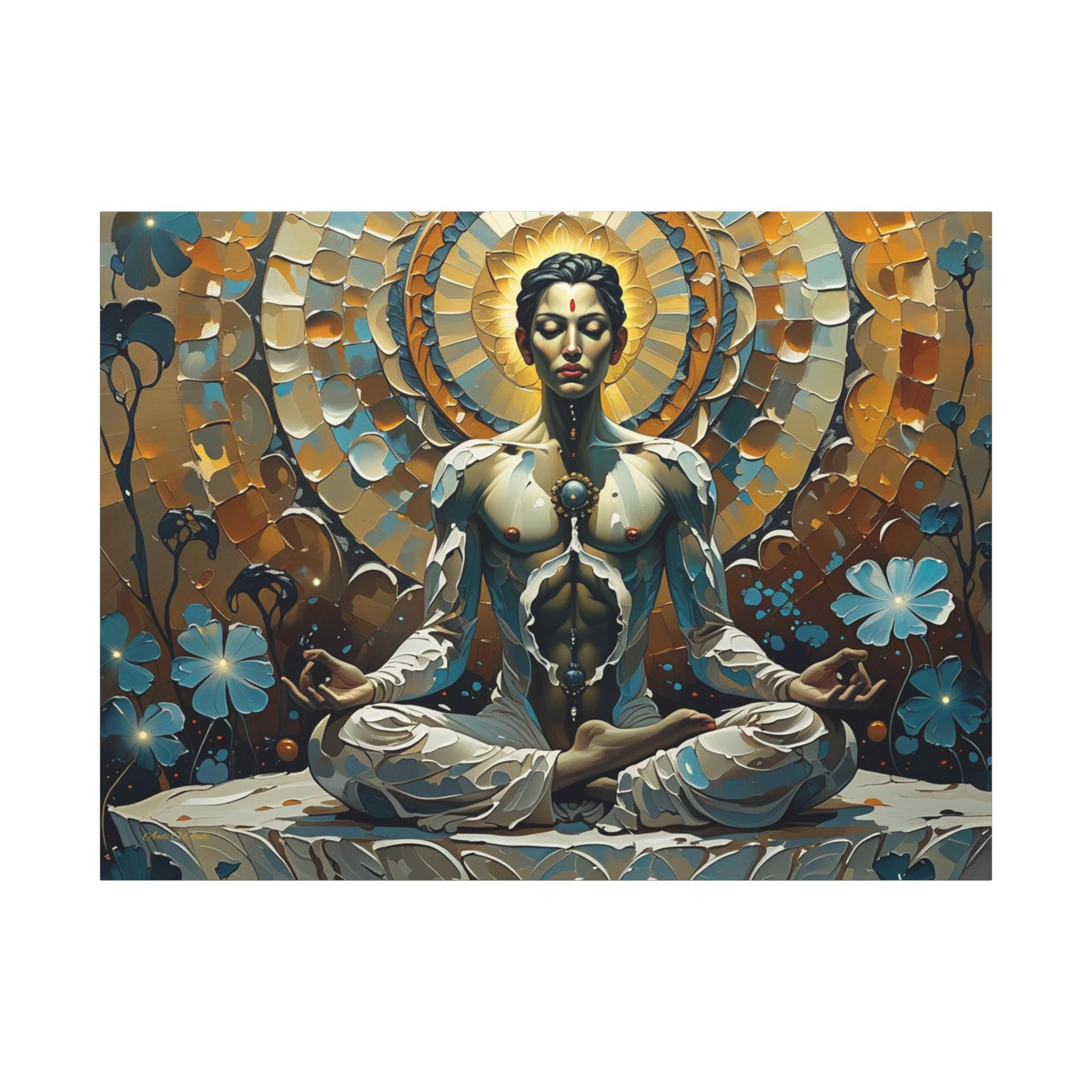 The artwork conveys a sense of profound introspection, transcendence, and inner light overcoming physical form. The intense gaze and the cosmic background make it a powerful, sophisticated statement piece suitable for spaces dedicated to mindfulness, contemporary design, or spiritual exploration.