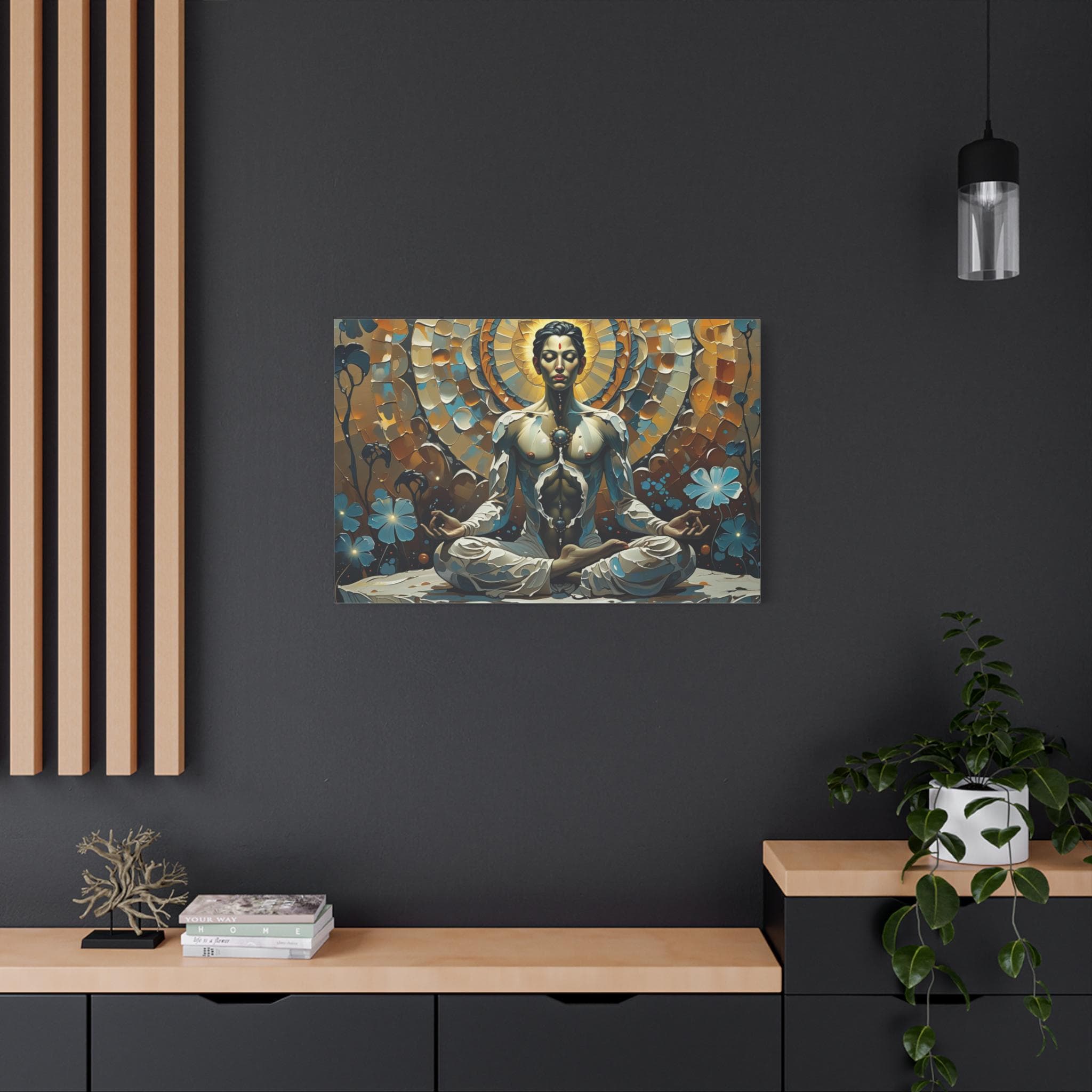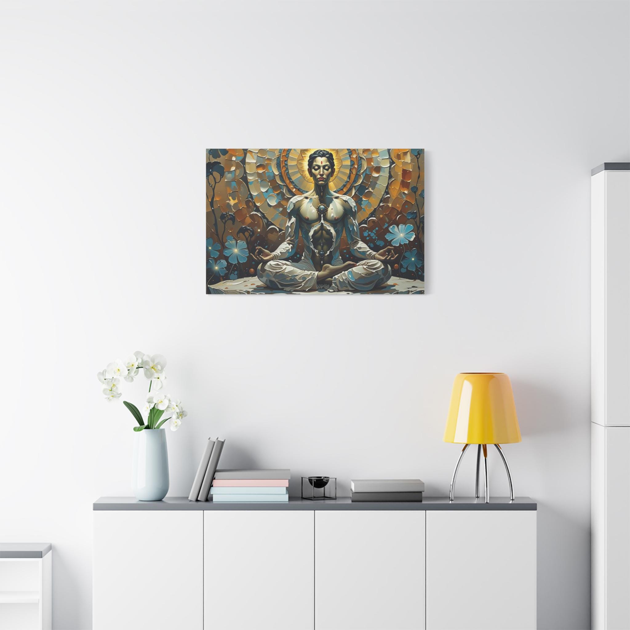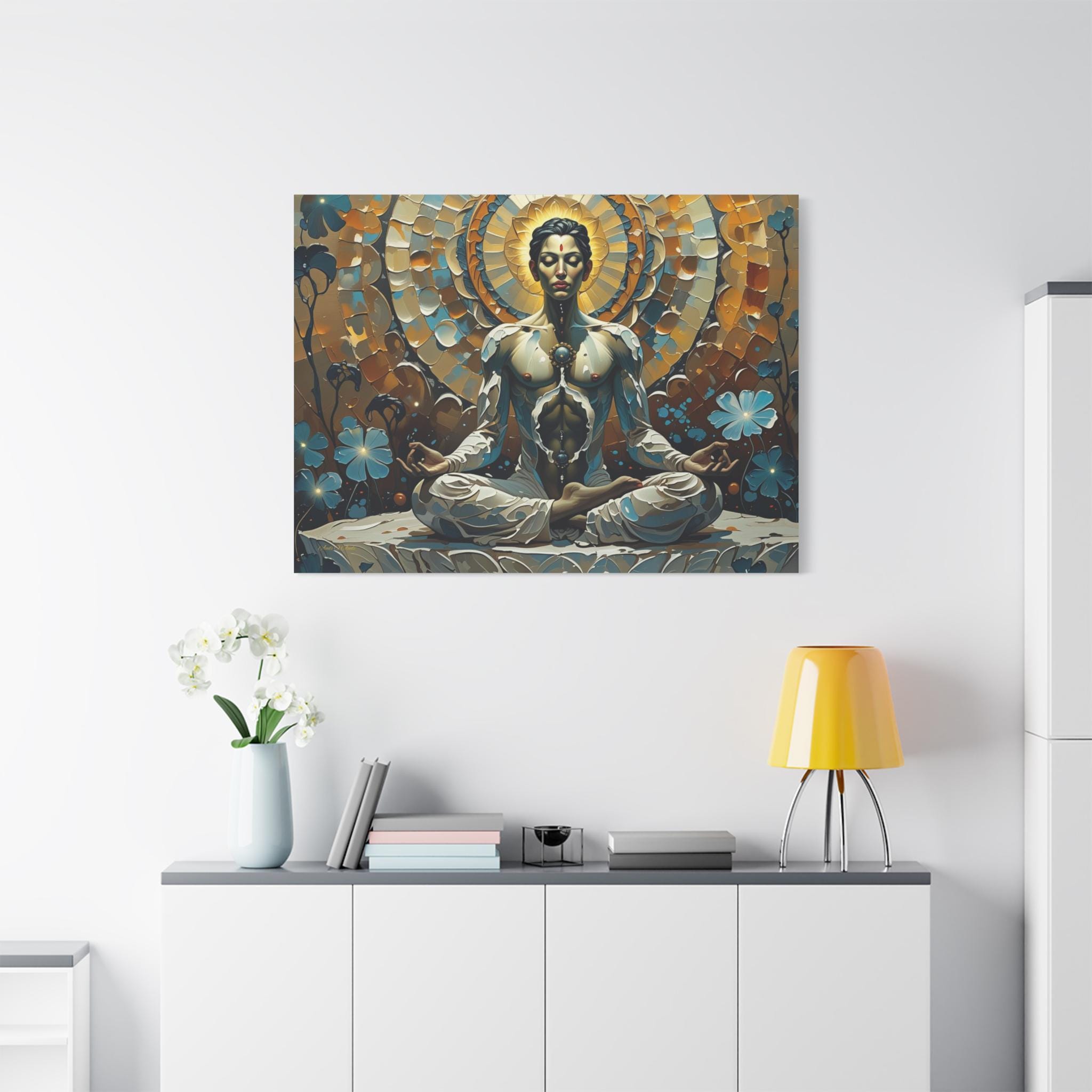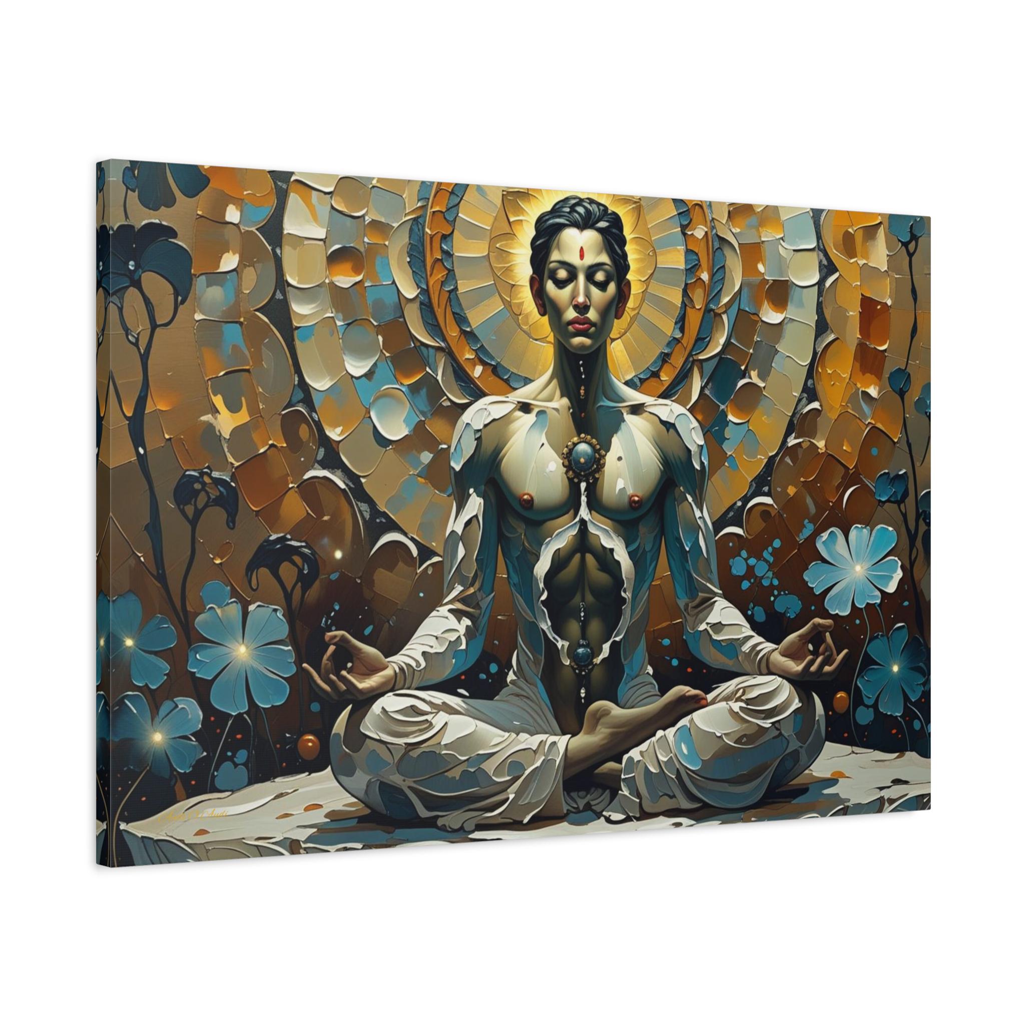 The artwork conveys a sense of profound introspection, transcendence, and inner light overcoming physical form. The intense gaze and the cosmic background make it a powerful, sophisticated statement piece suitable for spaces dedicated to mindfulness, contemporary design, or spiritual exploration.