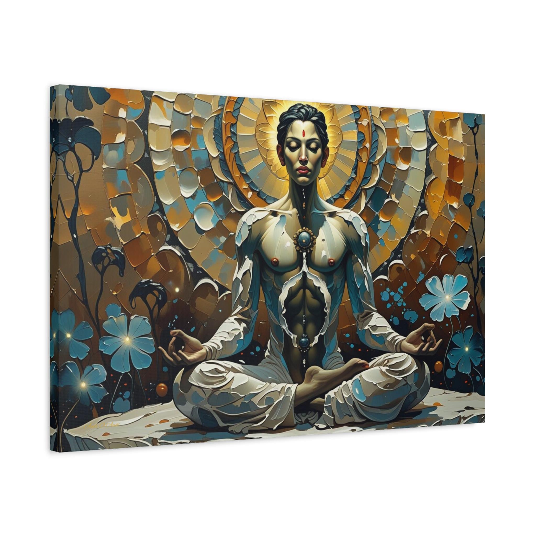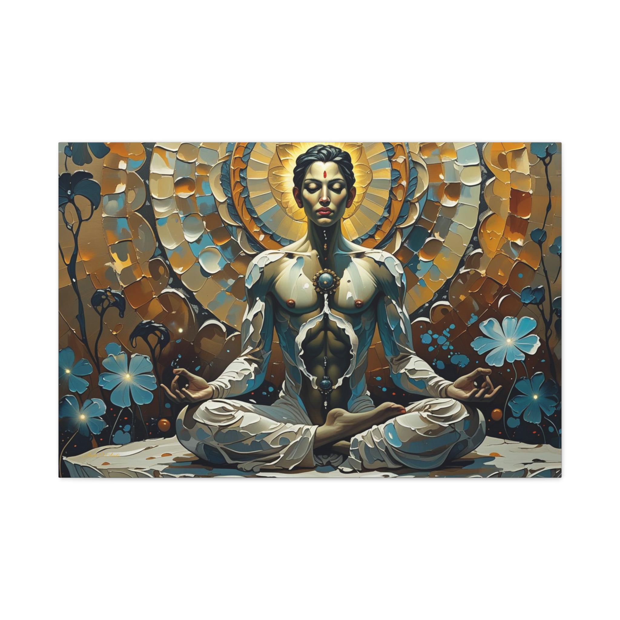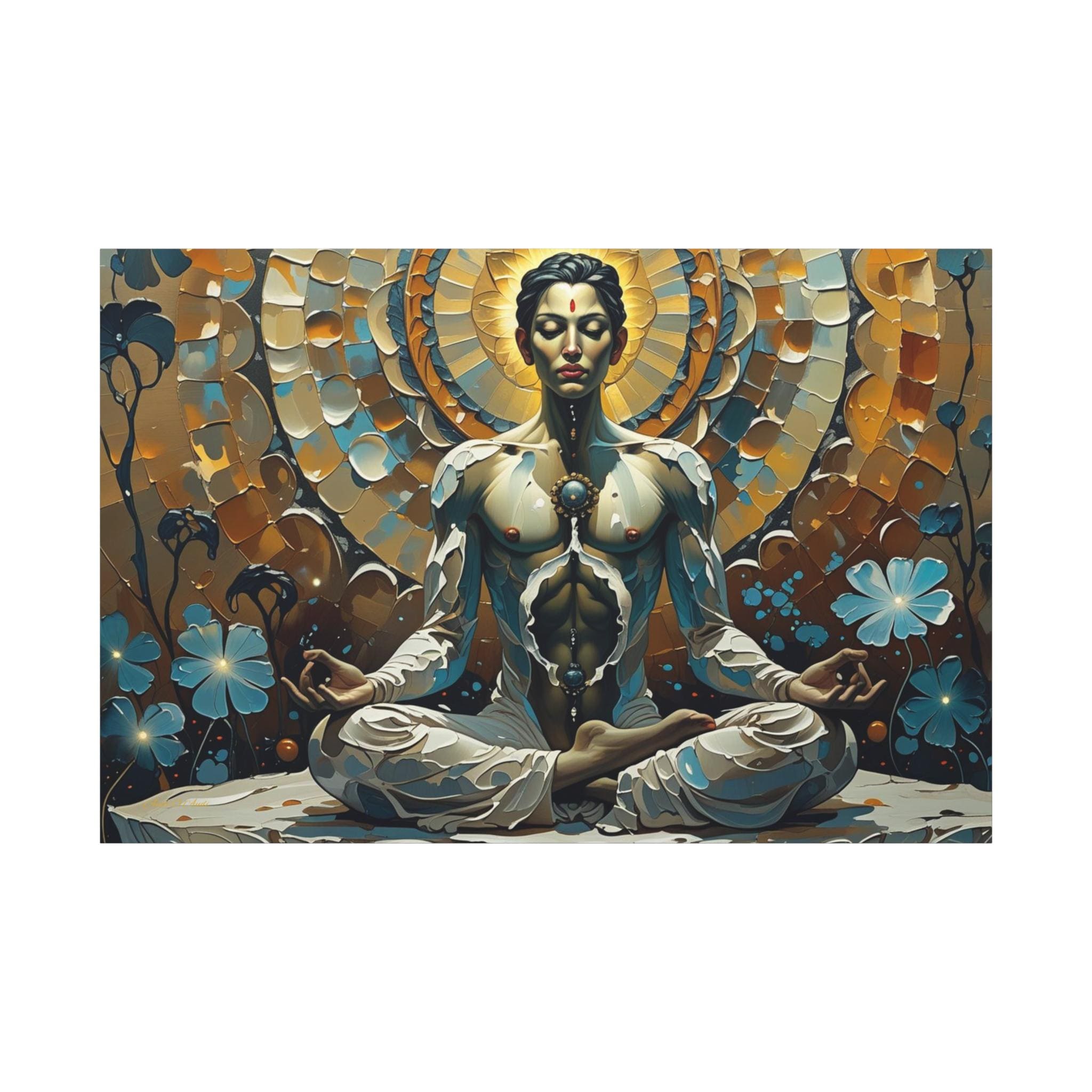 The composition is centered on a figure in deep meditation (Padmasana), who is the picture of intense focus. The figure is seated on a stylized stone platform, with the eyes gently closed and the hands in a mudra. The body itself is rendered in a fragmented, nearly skeletal or armor-like fashion, suggesting a transcended or ethereal state. The figure is backed by an enormous, dynamic mandala or radial pattern composed of overlapping, segmented circles that resemble stained glass or fractured light.