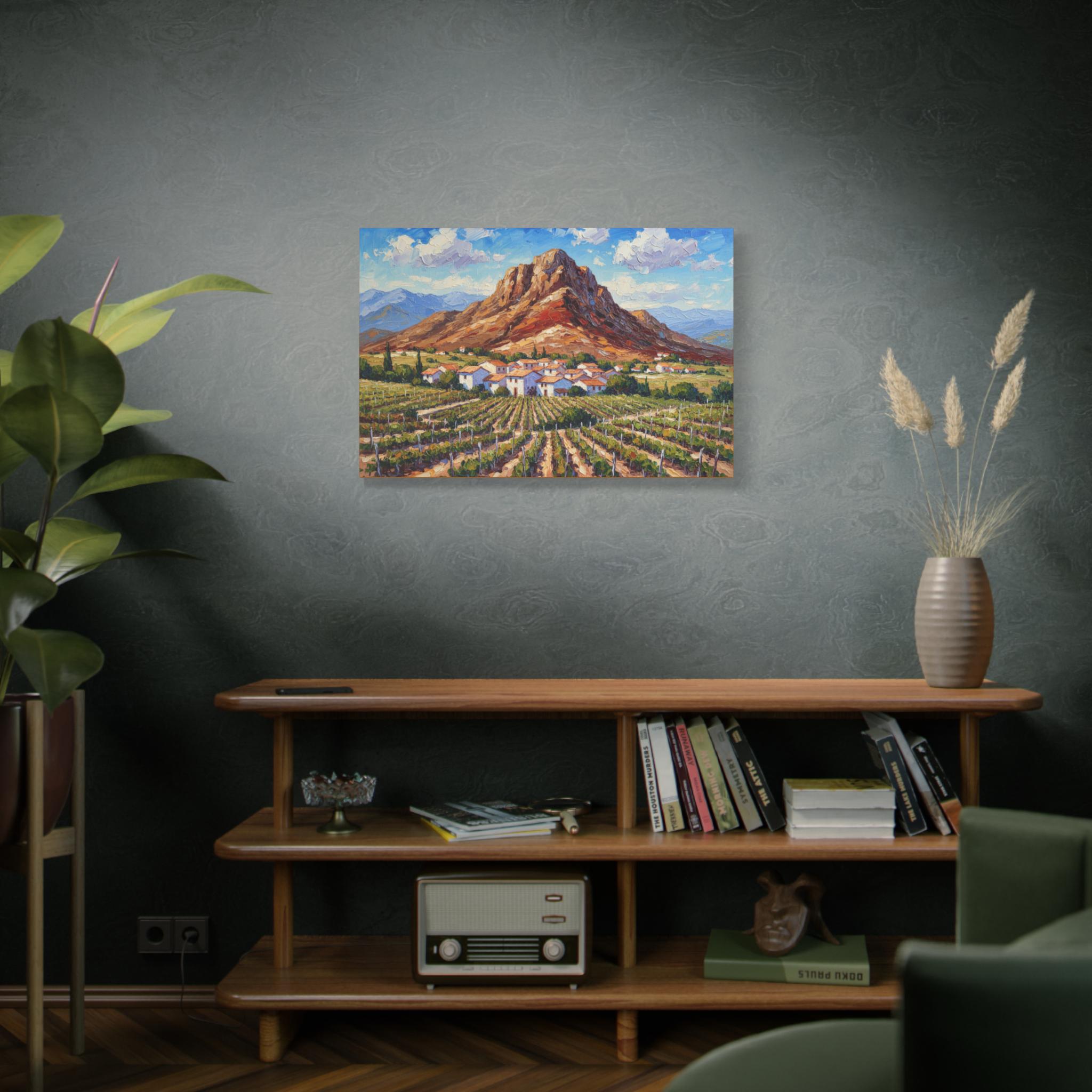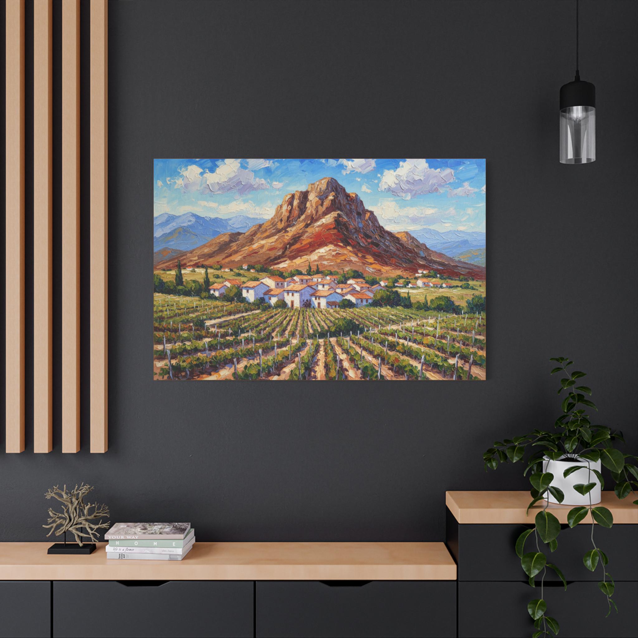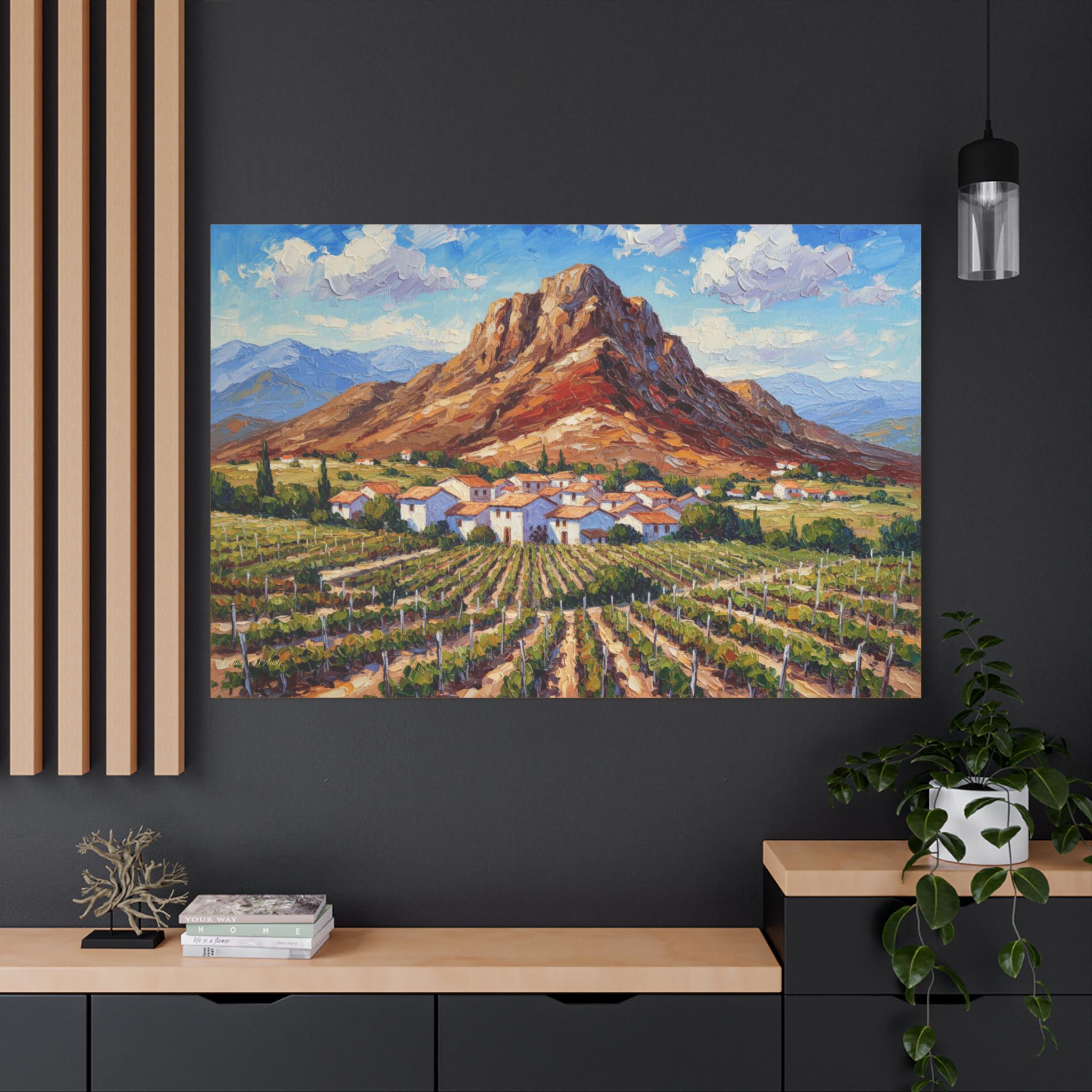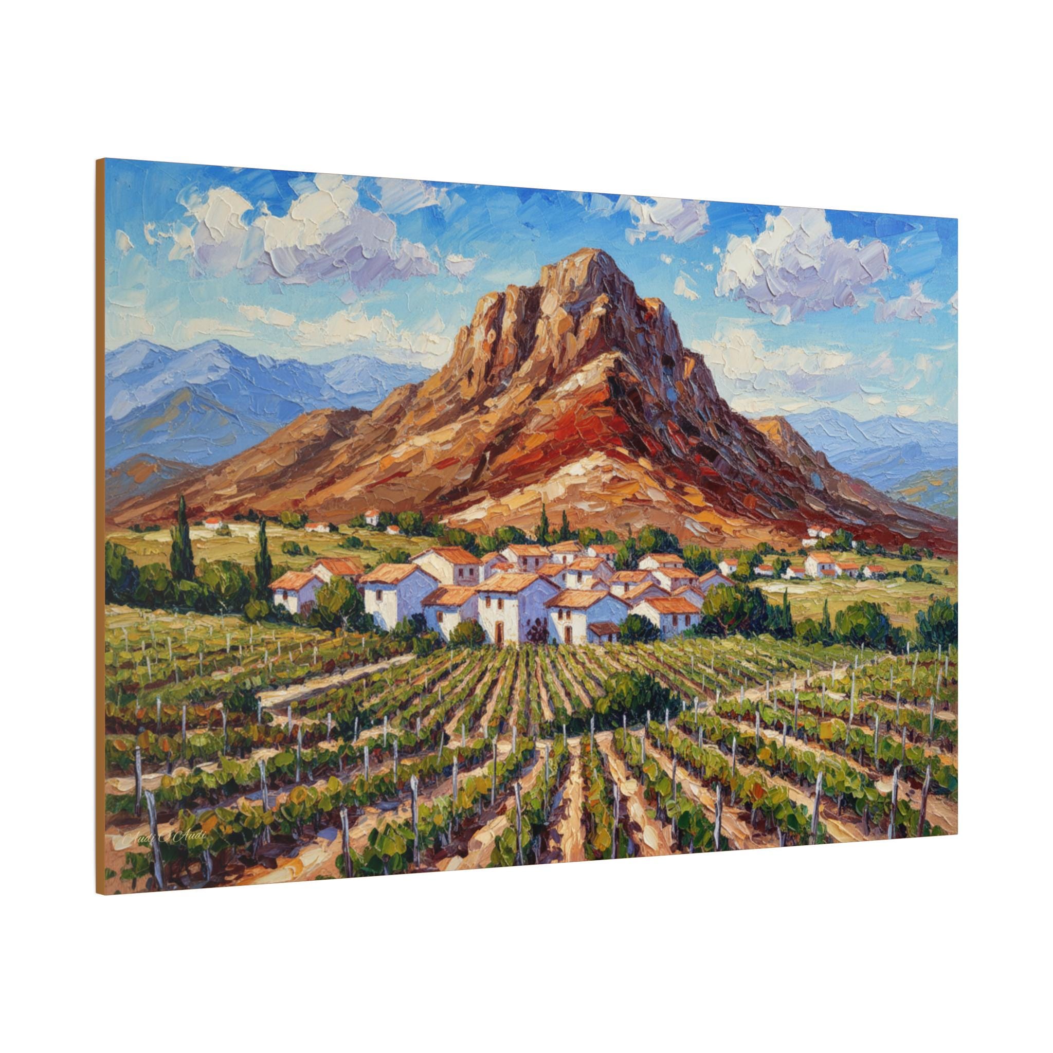 Vineyard Sentinel" is a vibrant landscape Canvas Print executed Impressionistic style, characterized by thick, energetic layers of paint (impasto). The composition is masterfully divided into three distinct yet harmoniously linked planes: the foreground vineyard, the middle-ground village, and the commanding mountain backdrop.