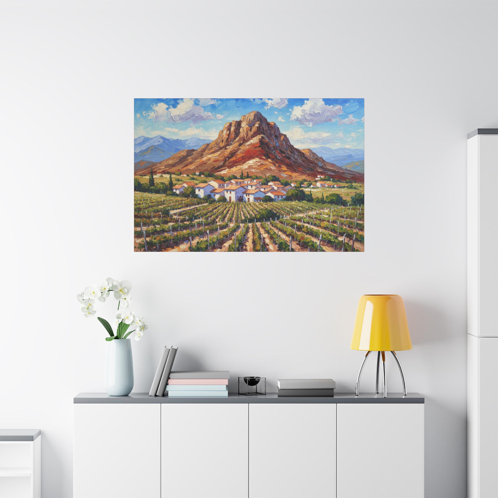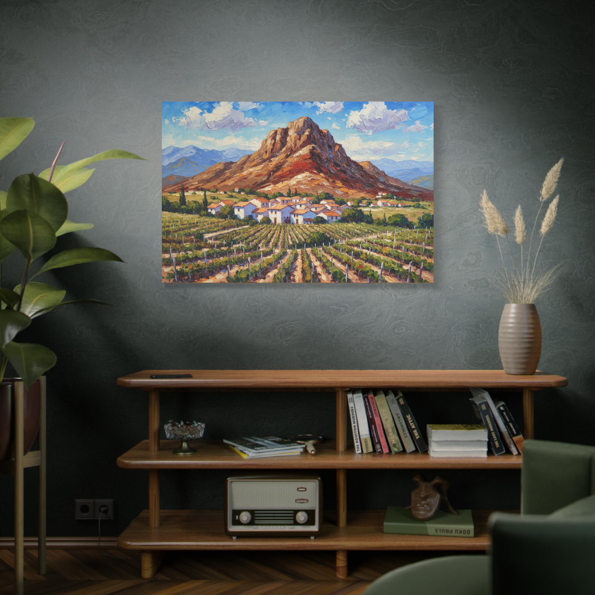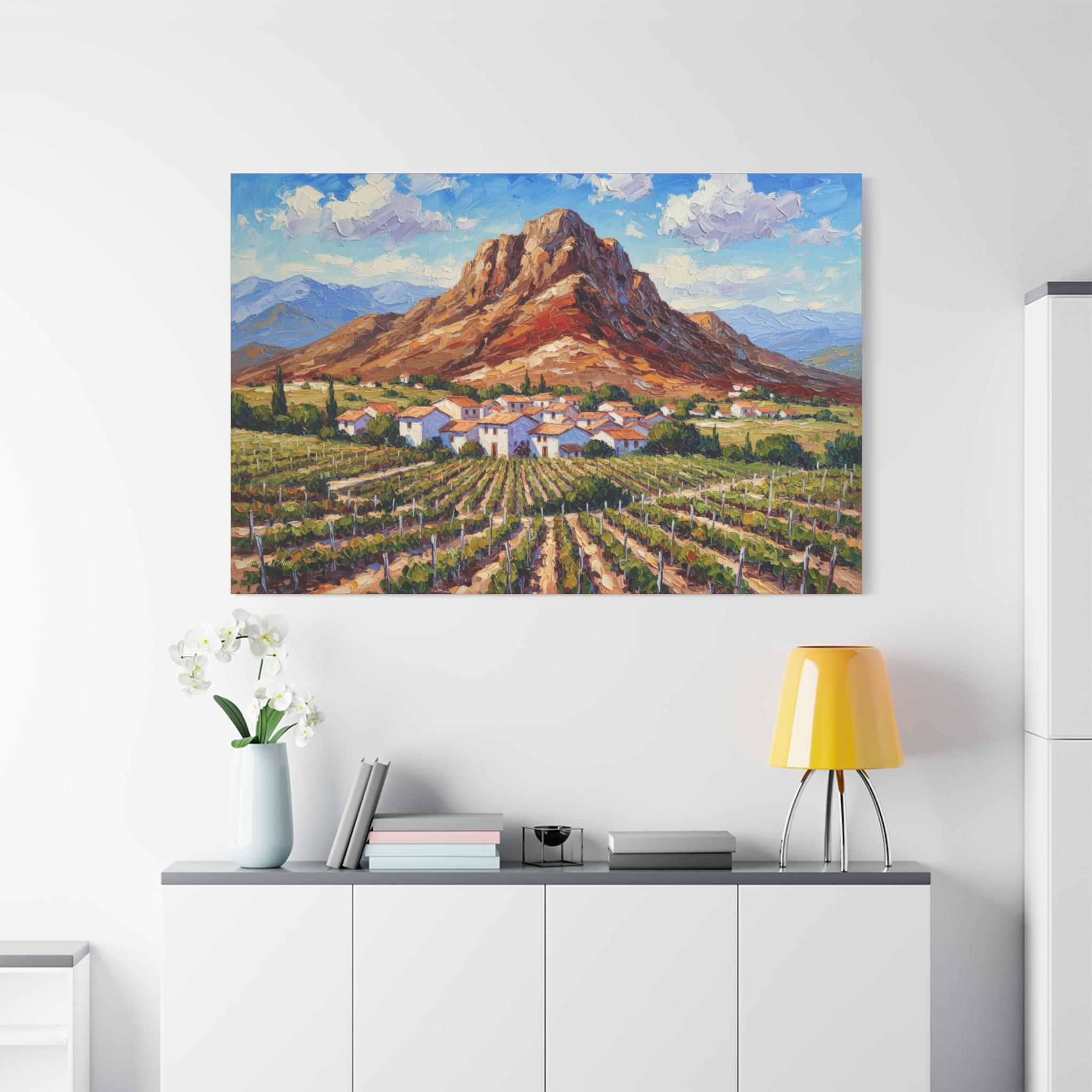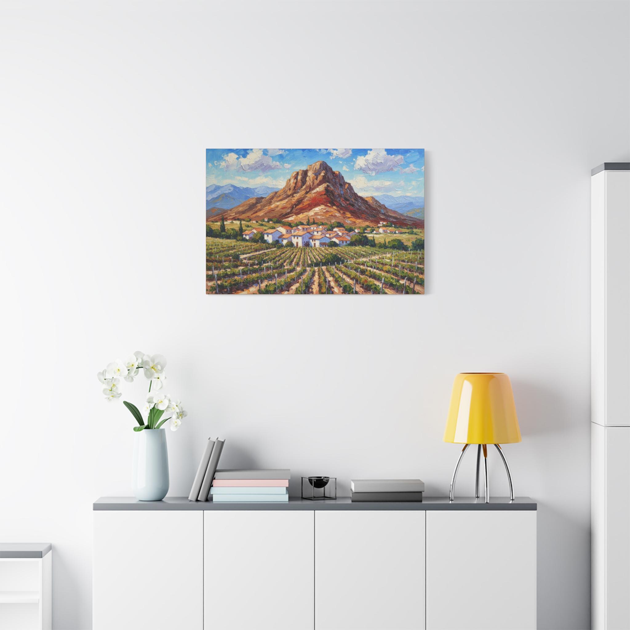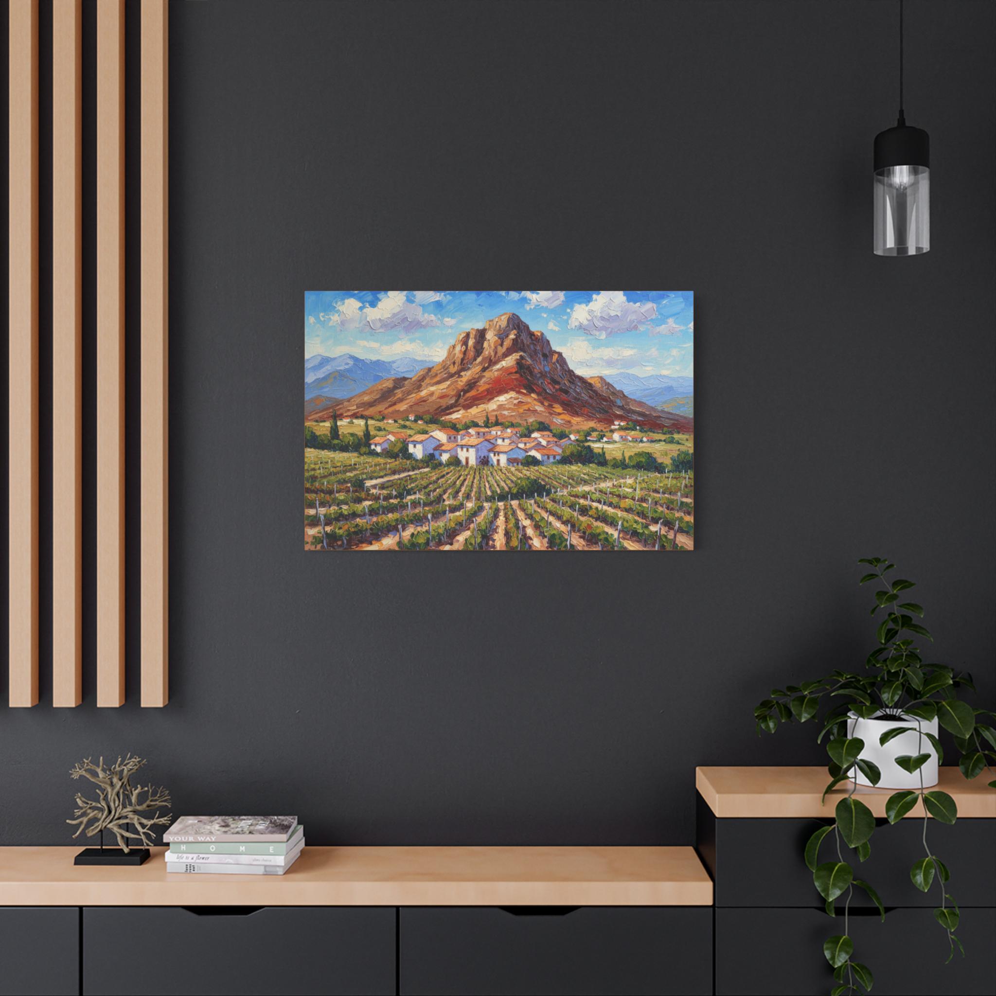 Vineyard Sentinel" is a vibrant landscape Canvas Print executed Impressionistic style, characterized by thick, energetic layers of paint (impasto). The composition is masterfully divided into three distinct yet harmoniously linked planes: the foreground vineyard, the middle-ground village, and the commanding mountain backdrop.