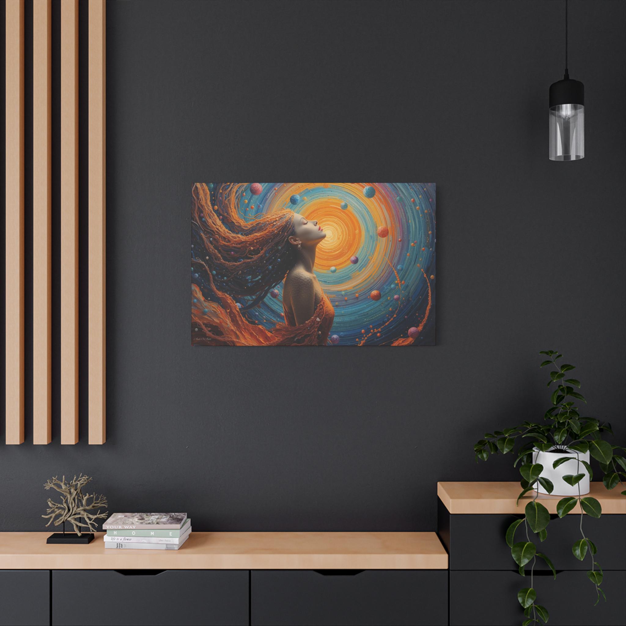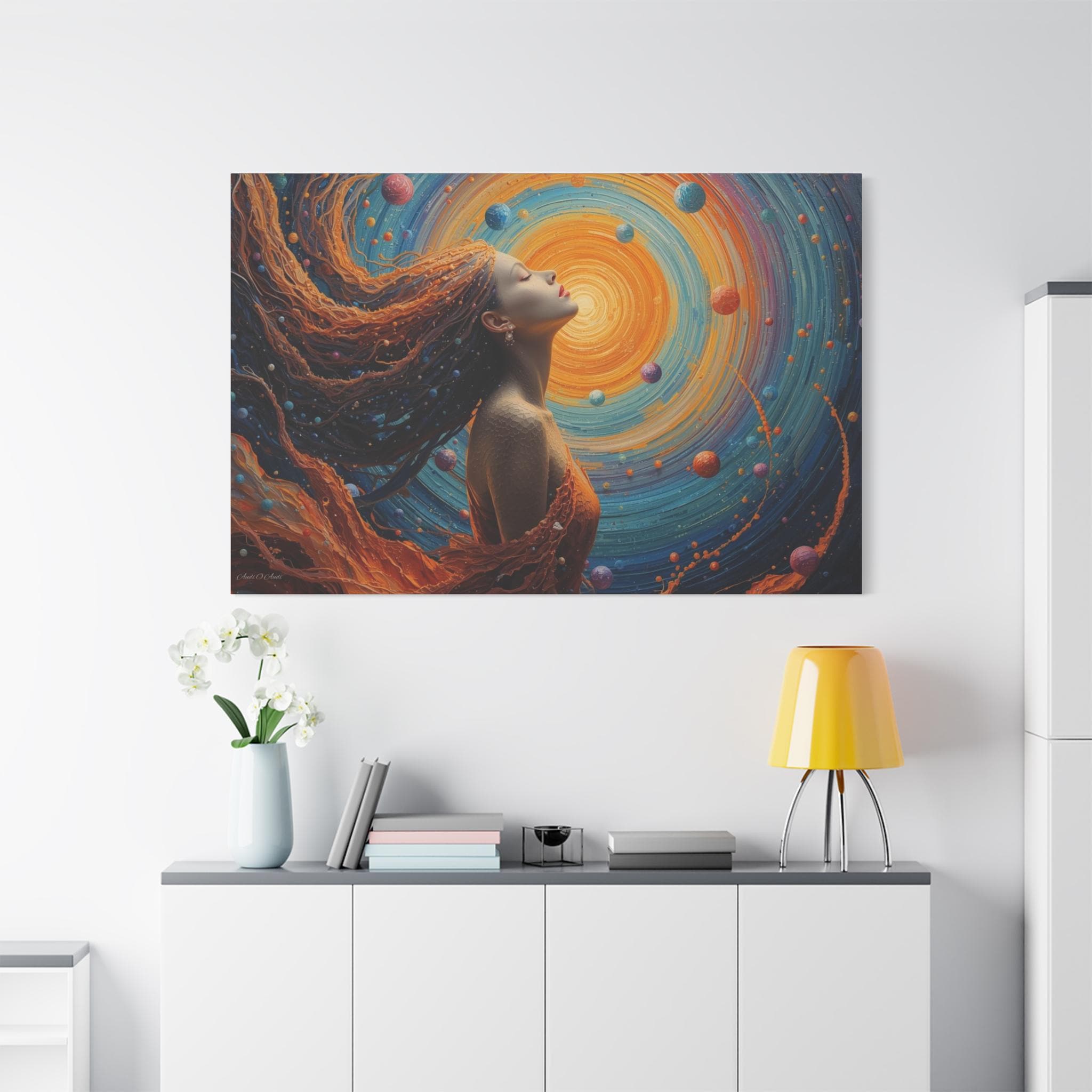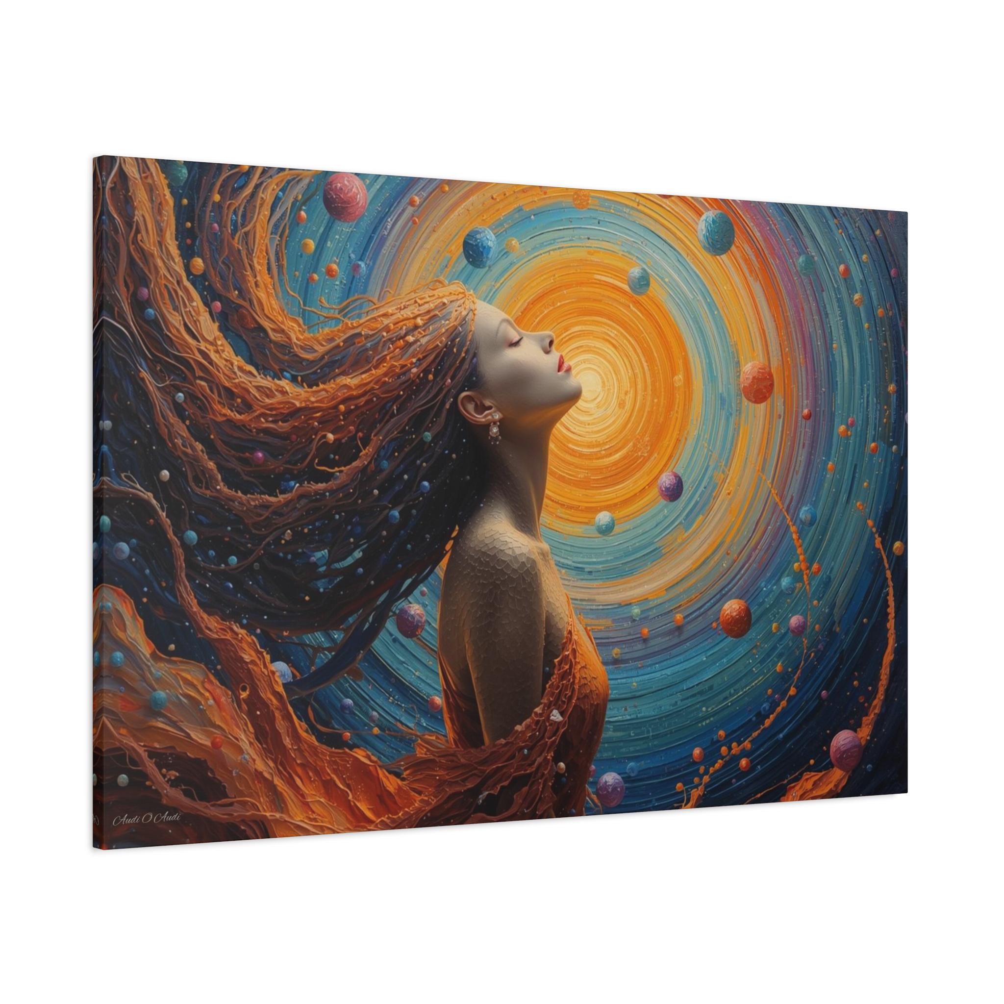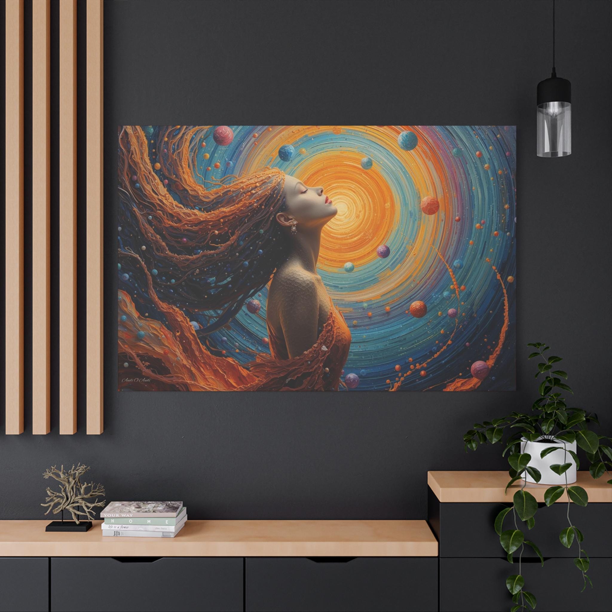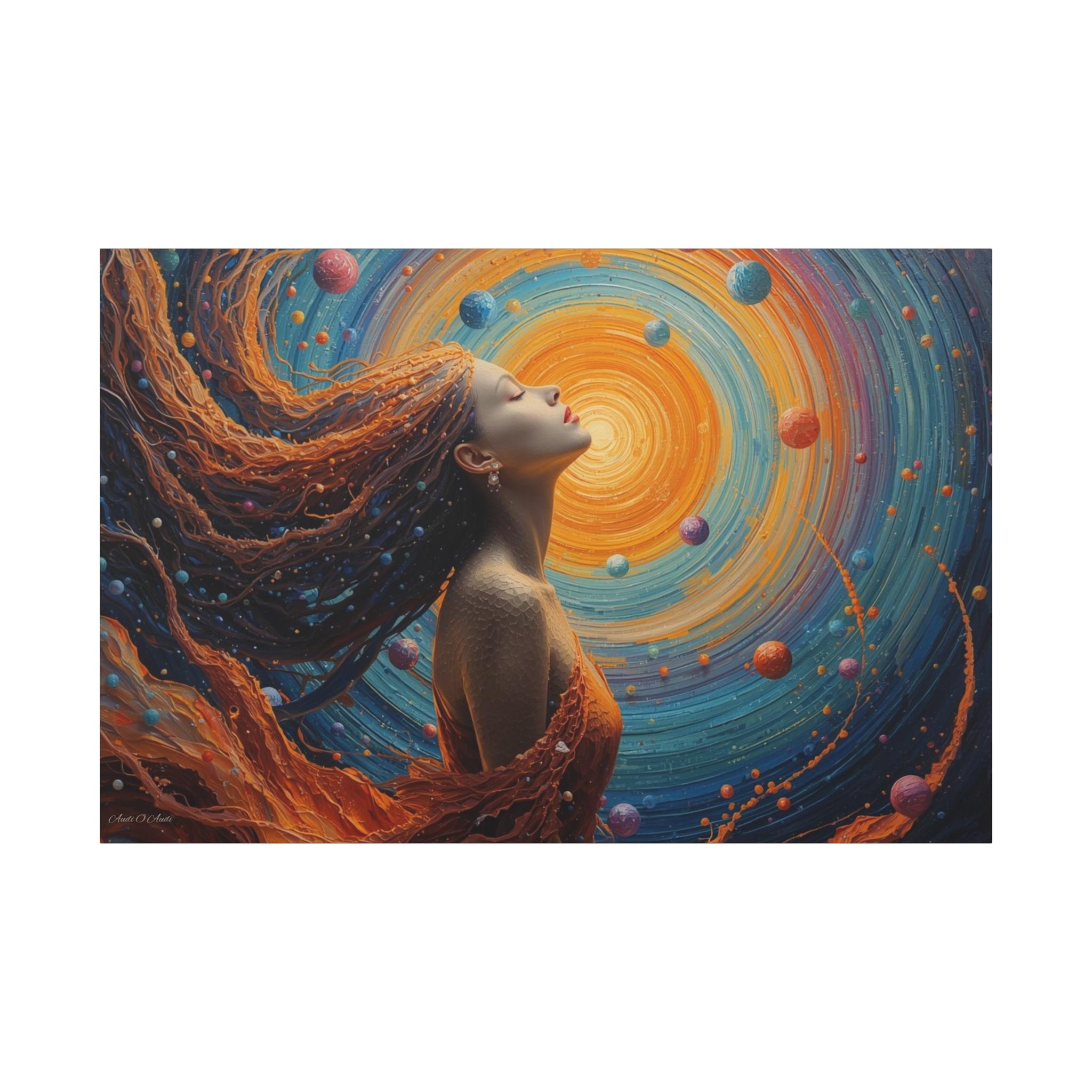 "Solaris Requiem" is a breathtaking, highly detailed canvas print that merges the beauty of the human form with the majesty of the cosmos. The central figure—an ethereal woman with eyes closed in an expression of blissful reverence—is presented in profile, her posture conveying a profound sense of ascension and connection.