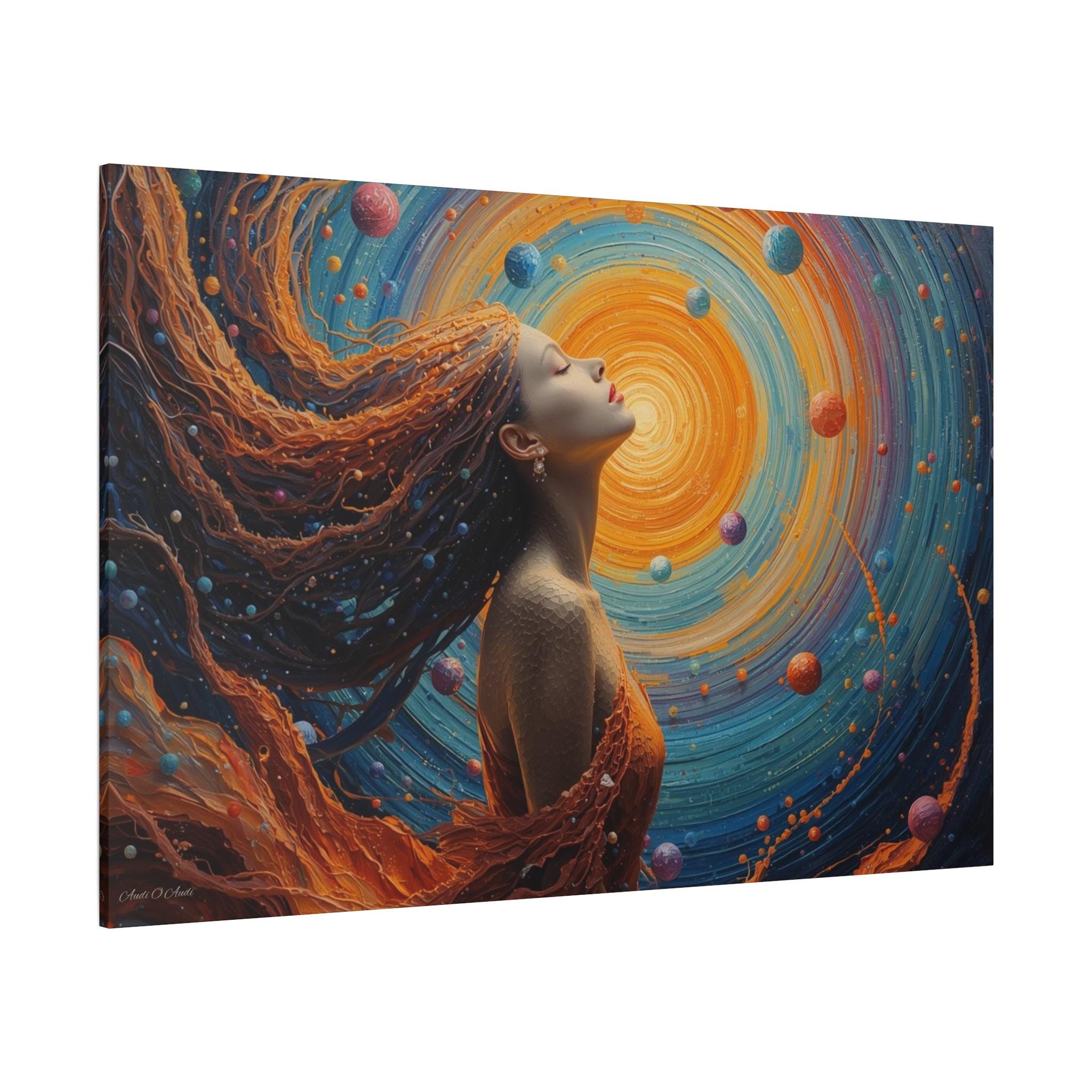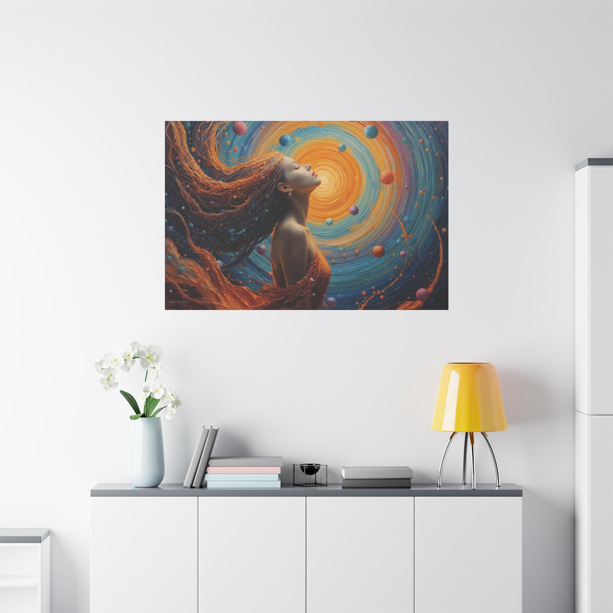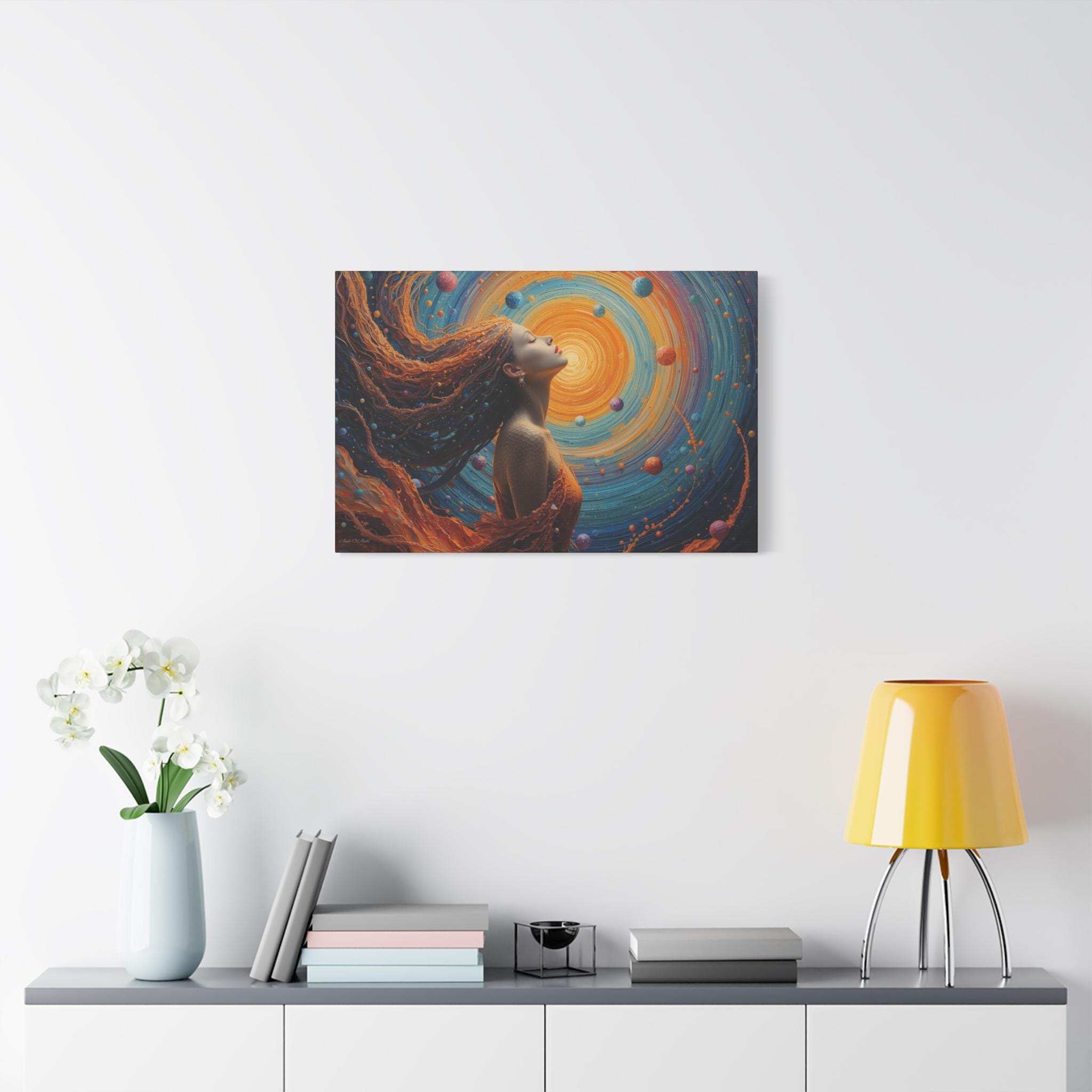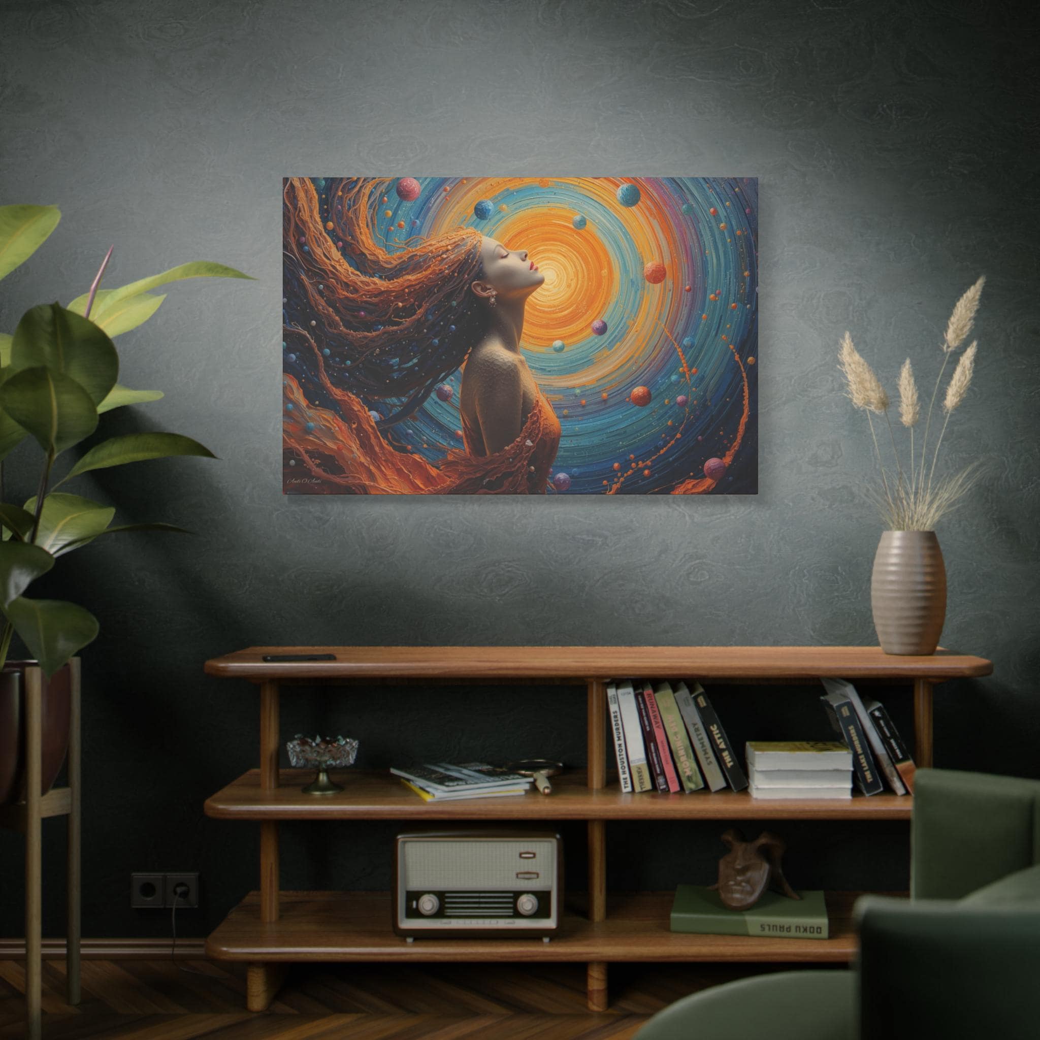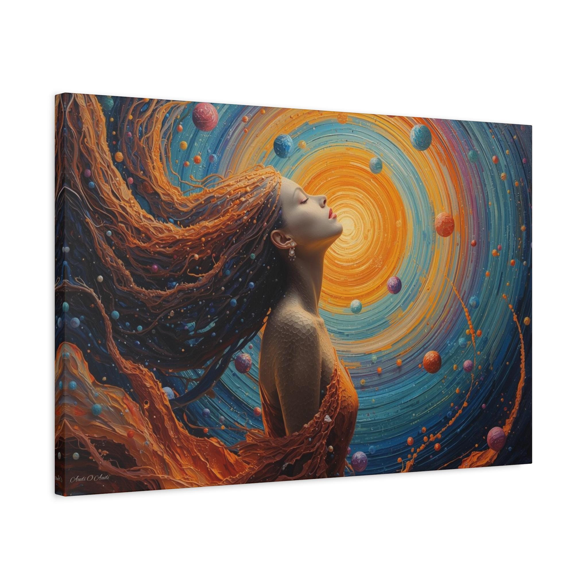 "Solaris Requiem" is a breathtaking, highly detailed canvas print that merges the beauty of the human form with the majesty of the cosmos. The central figure—an ethereal woman with eyes closed in an expression of blissful reverence—is presented in profile, her posture conveying a profound sense of ascension and connection.