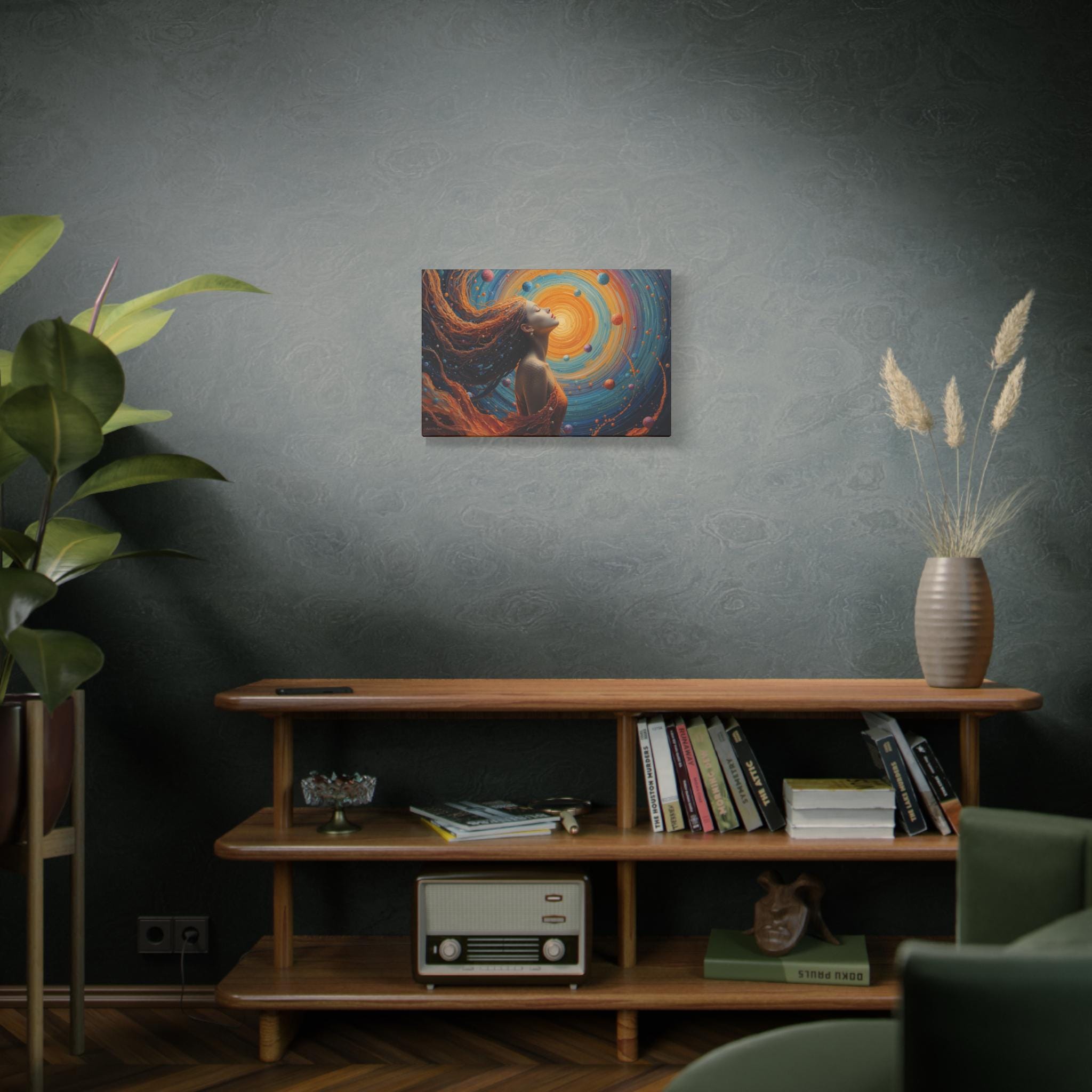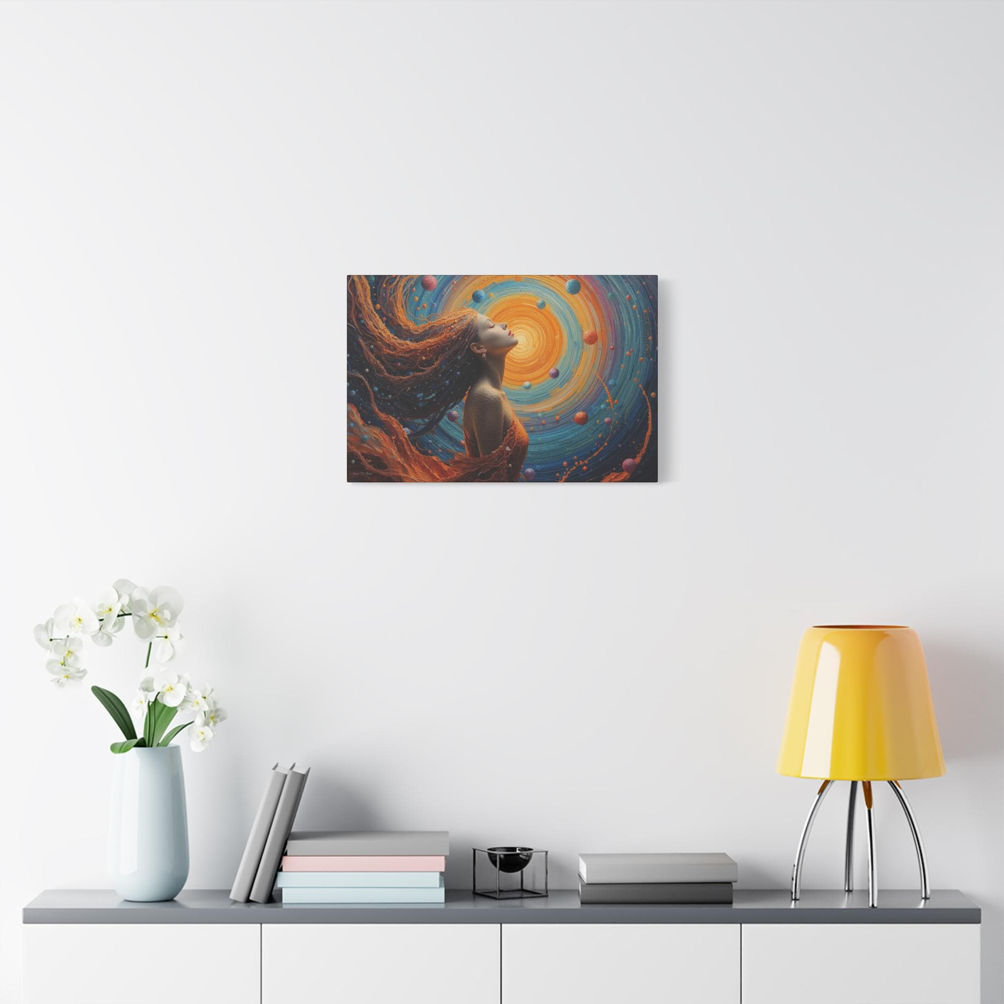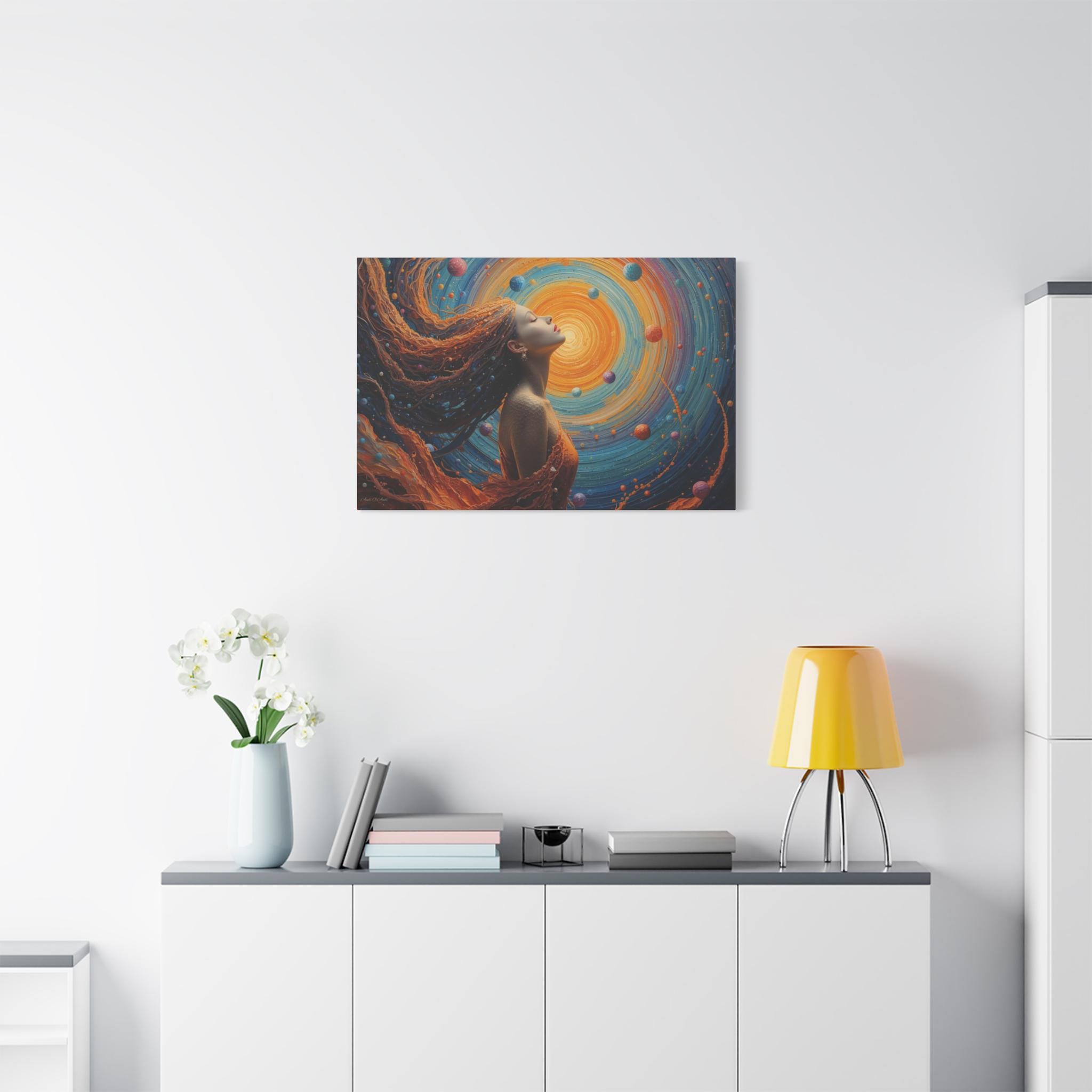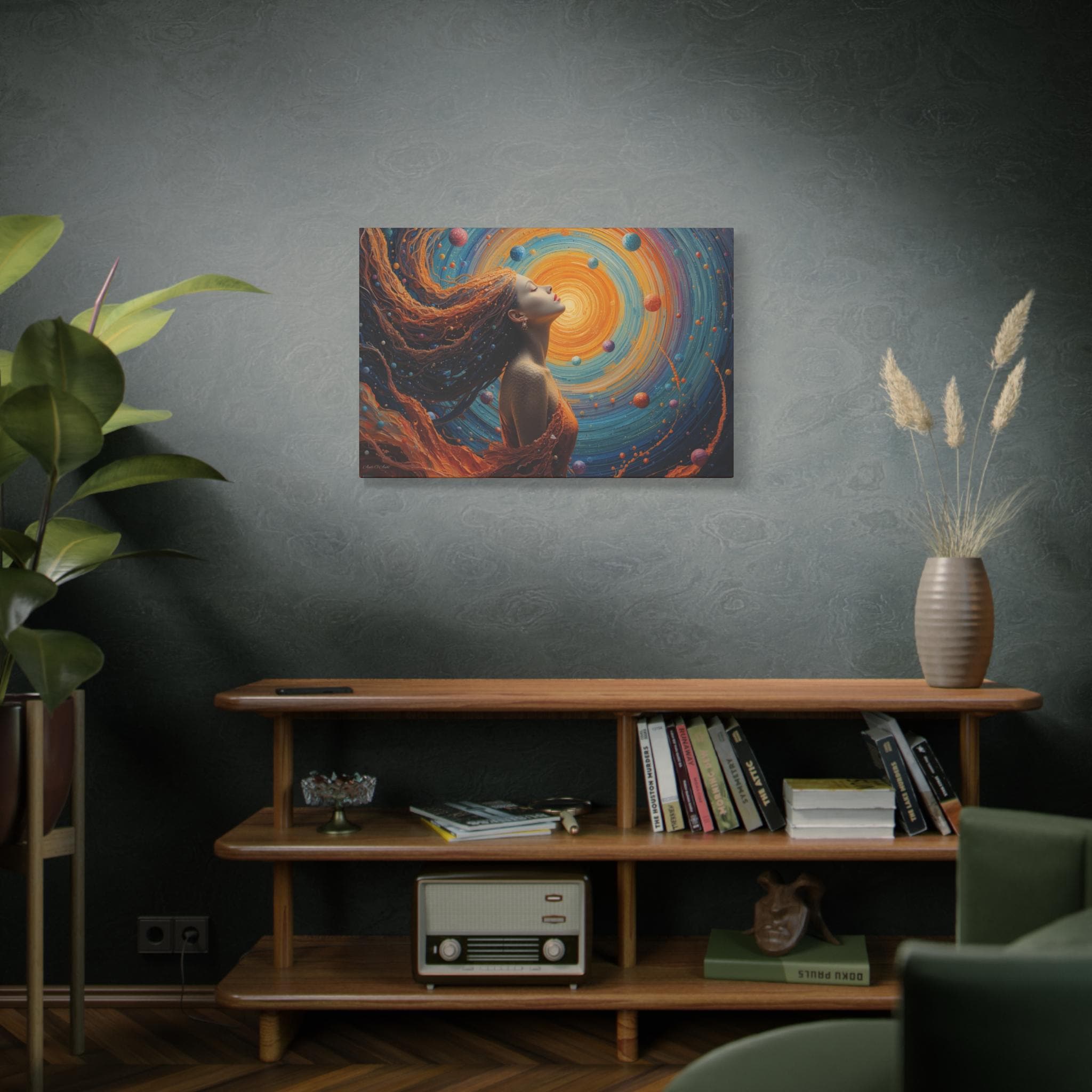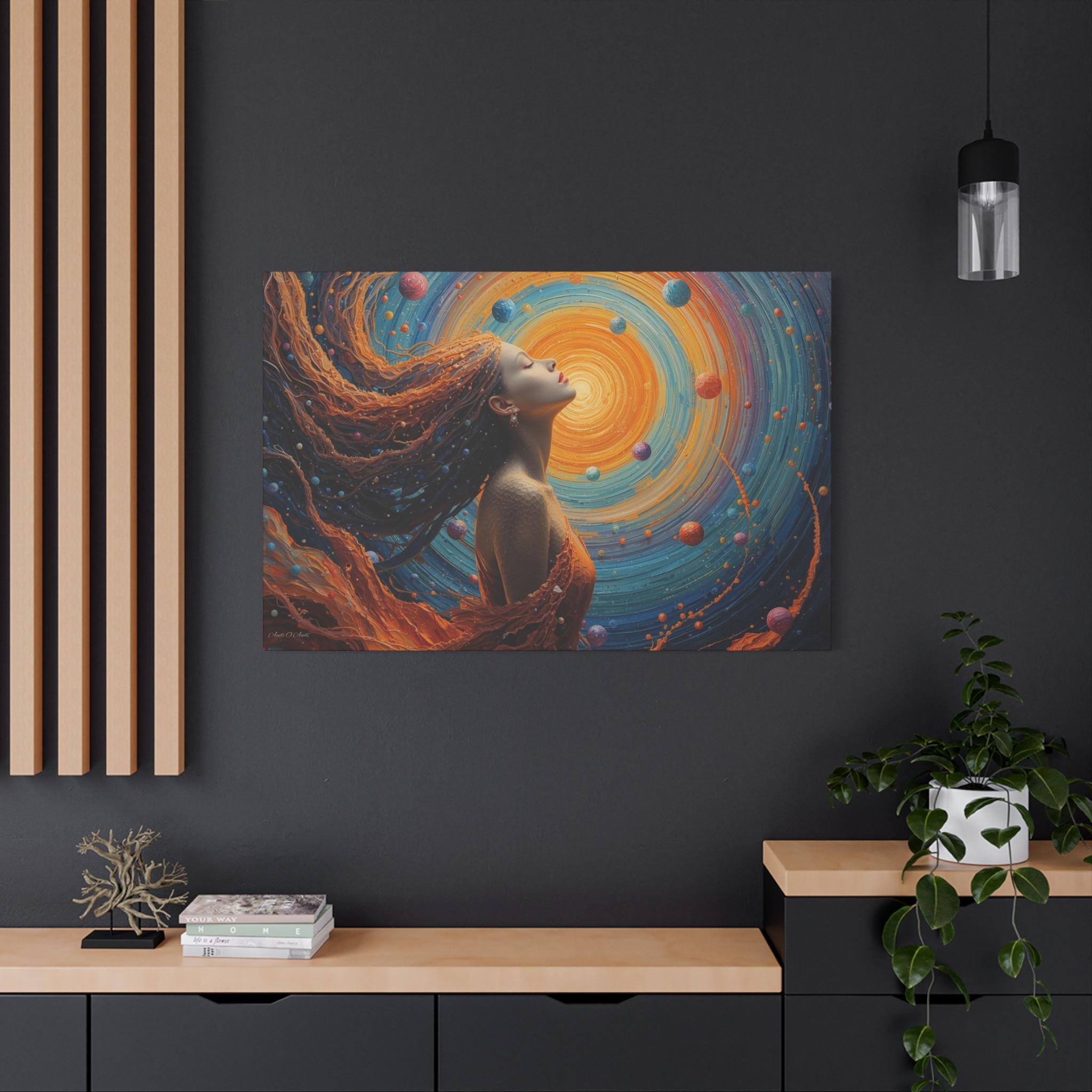 "Solaris Requiem" is a breathtaking, highly detailed canvas print that merges the beauty of the human form with the majesty of the cosmos. The central figure—an ethereal woman with eyes closed in an expression of blissful reverence—is presented in profile, her posture conveying a profound sense of ascension and connection.