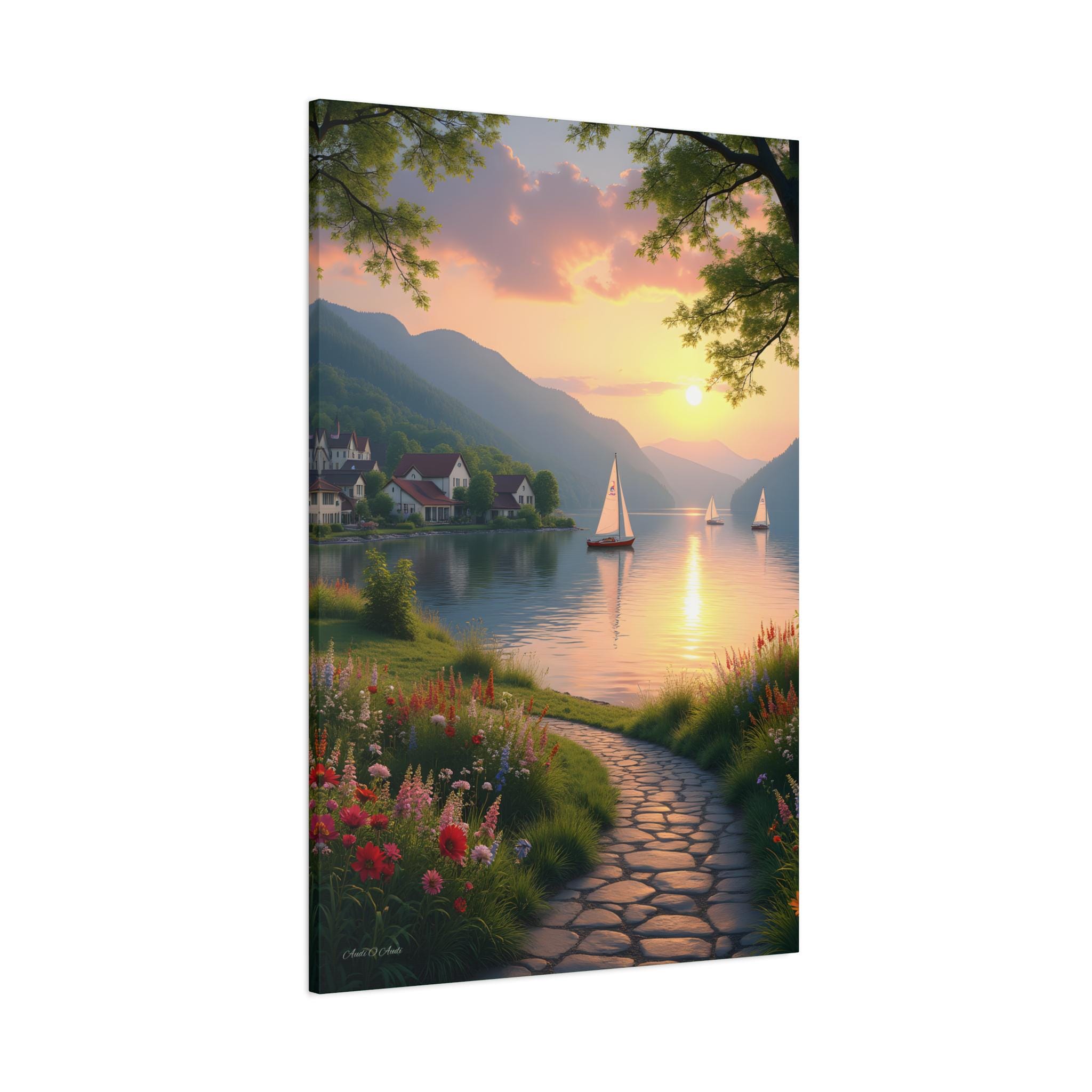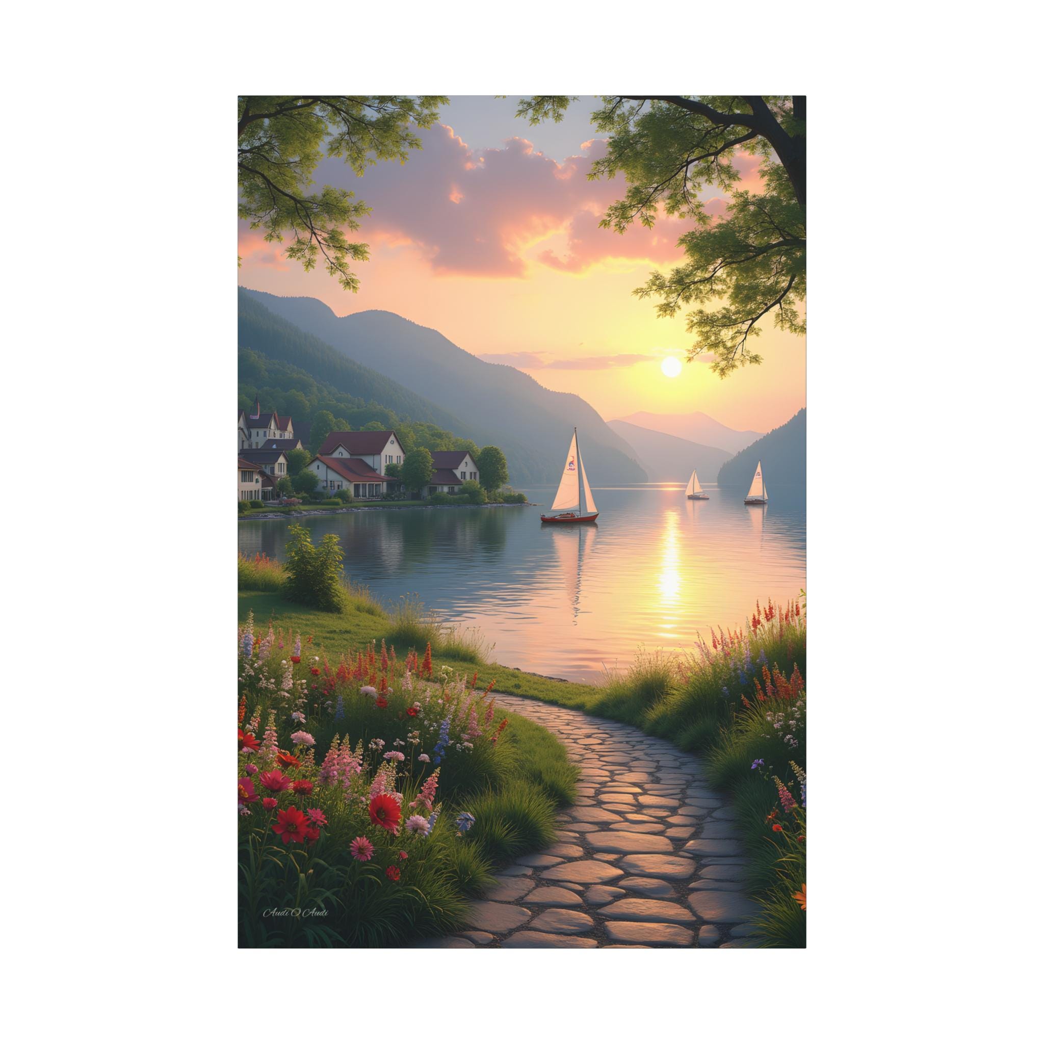 The composition is a classic and inviting portrait-oriented view. A winding cobblestone path anchors the foreground, creating a strong leading line that draws the viewer's eye into the scene. This path is framed by lush green grasses and a profusion of brightly colored wildflowers, adding depth and visual interest. The middle ground is dominated by a peaceful lake reflecting the brilliant light of the setting sun, with small sailboats gliding across the surface. The background features rolling, hazy mountains and a charming cluster of European-style houses nestled beneath them.