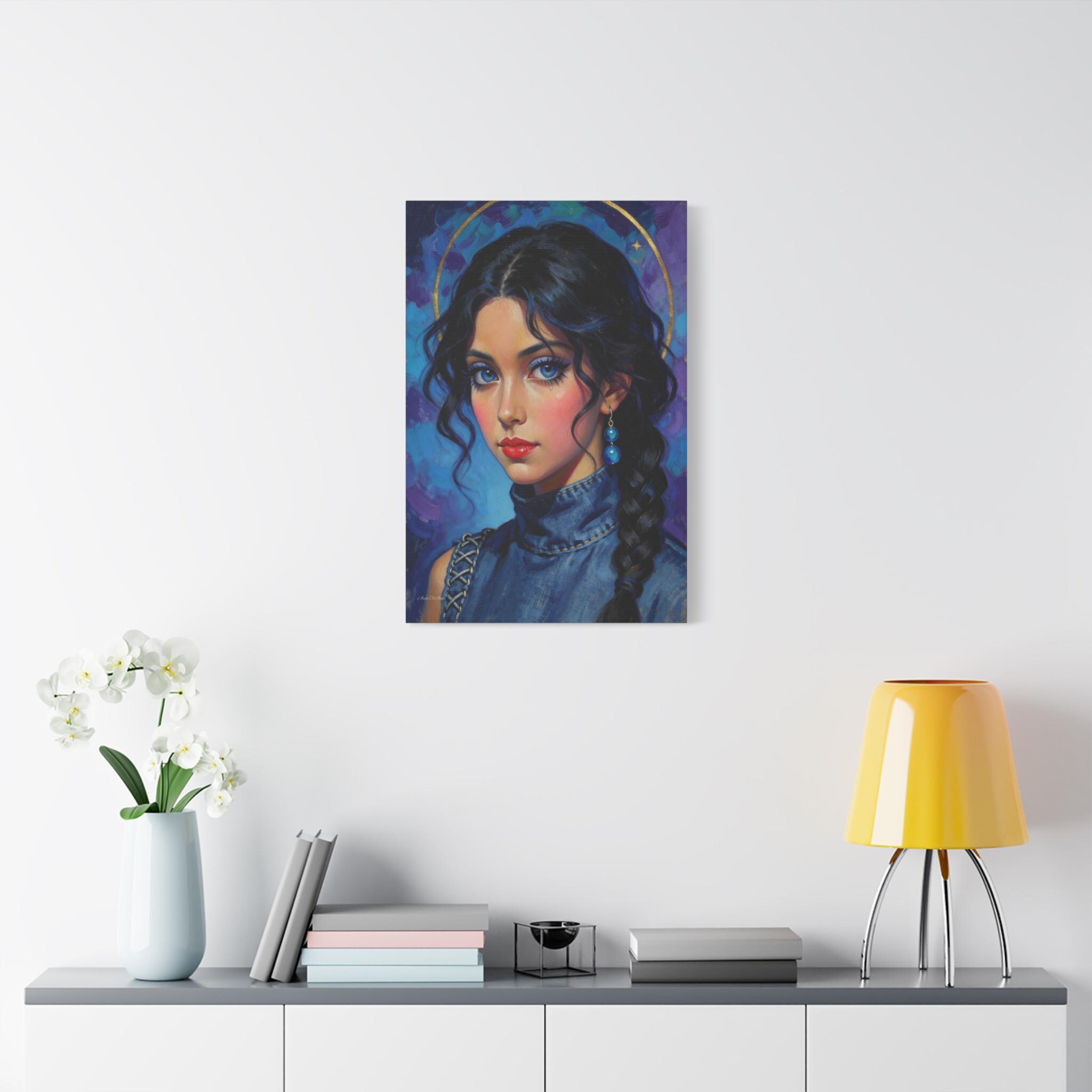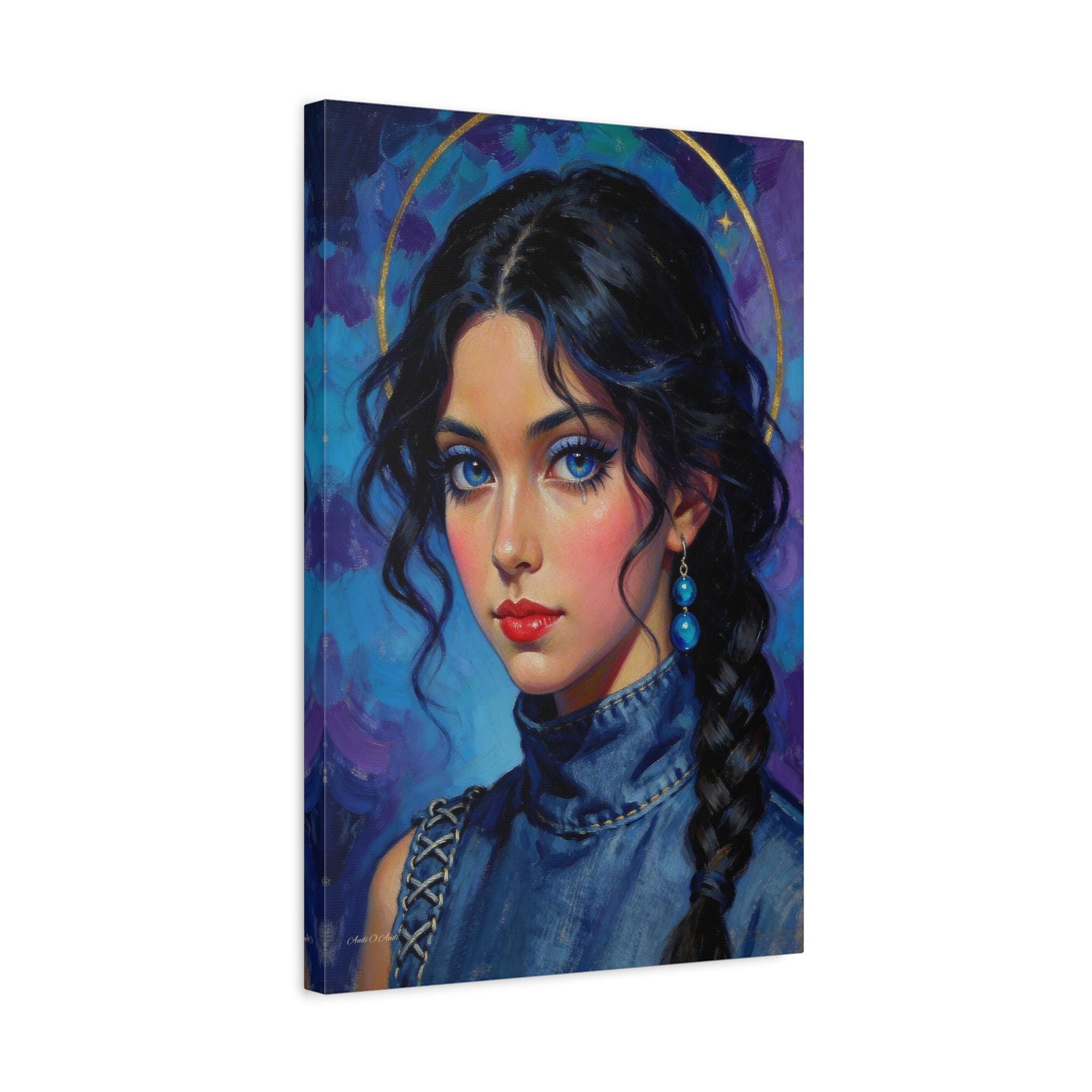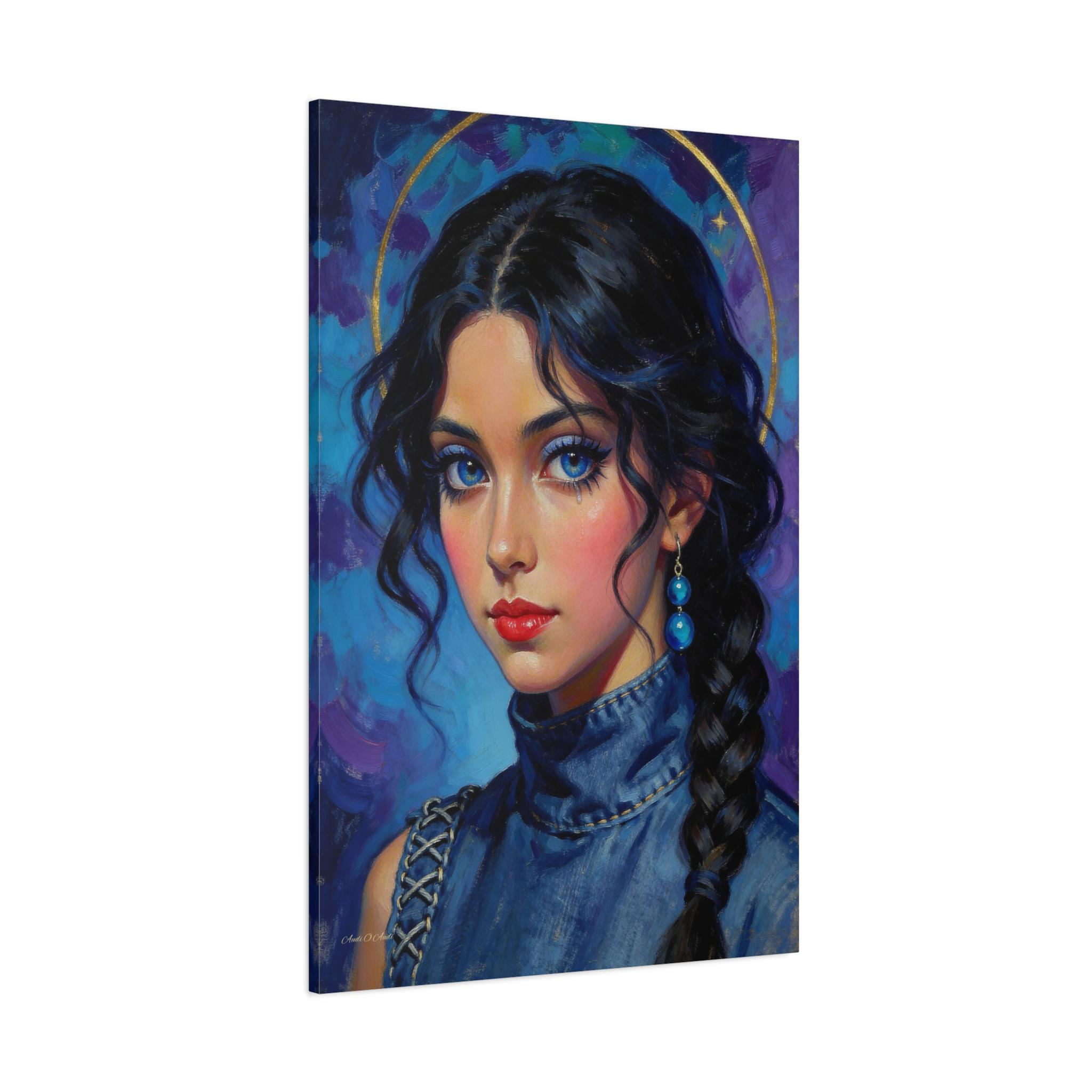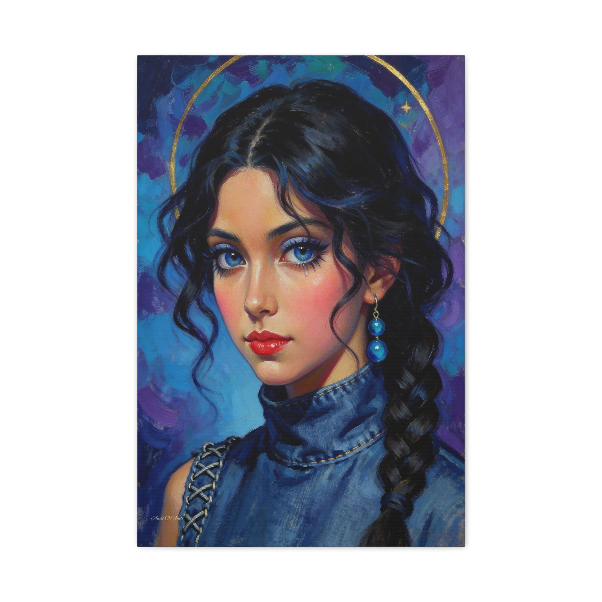 Behold the "Indigo Muse," a breathtaking canvas print that combines the rich, textural quality of oil painting with a bold, modern sensibility. This portrait features a young woman with a captivating, intense gaze and is rendered in a stunning palette of deep blues, violets, and touches of brilliant gold.