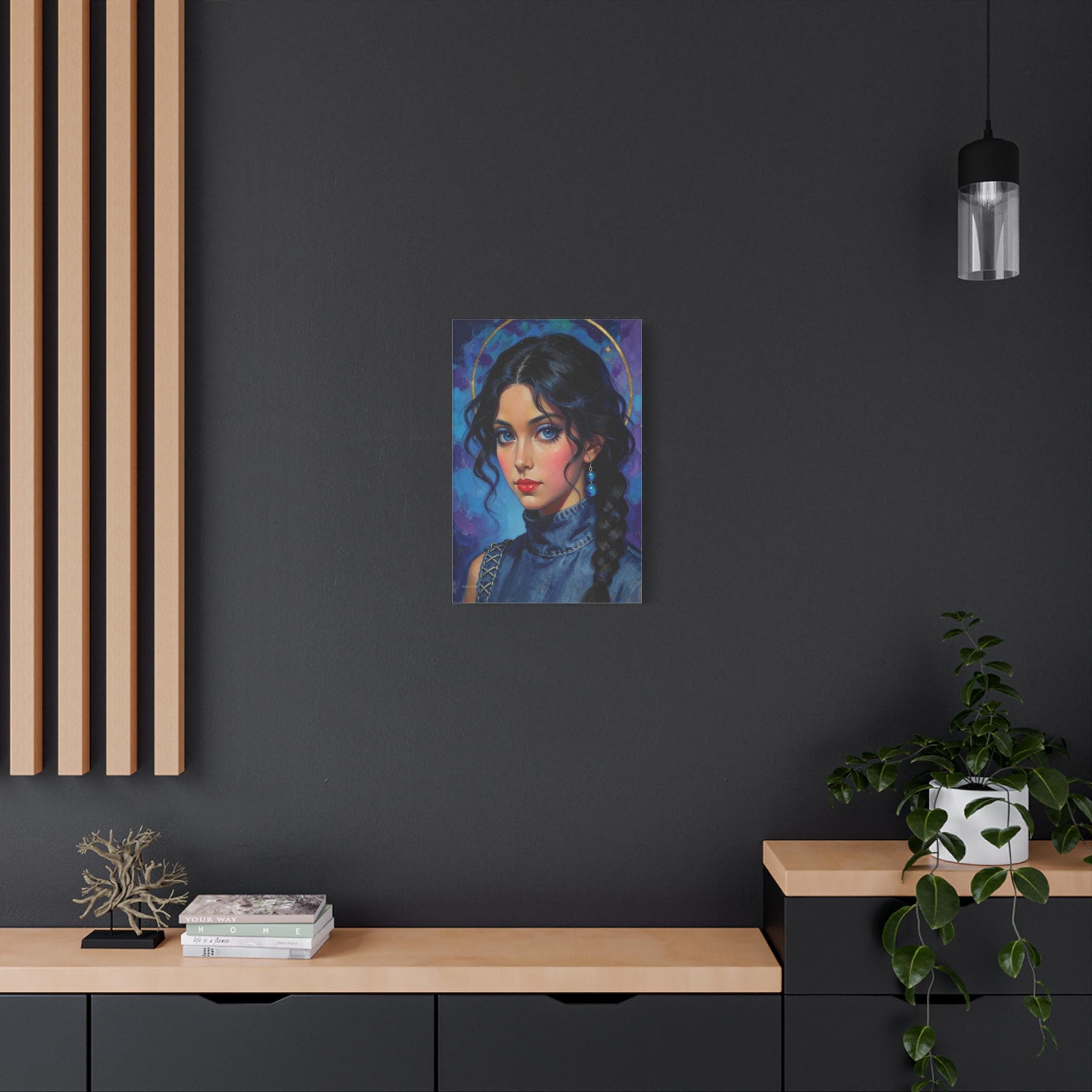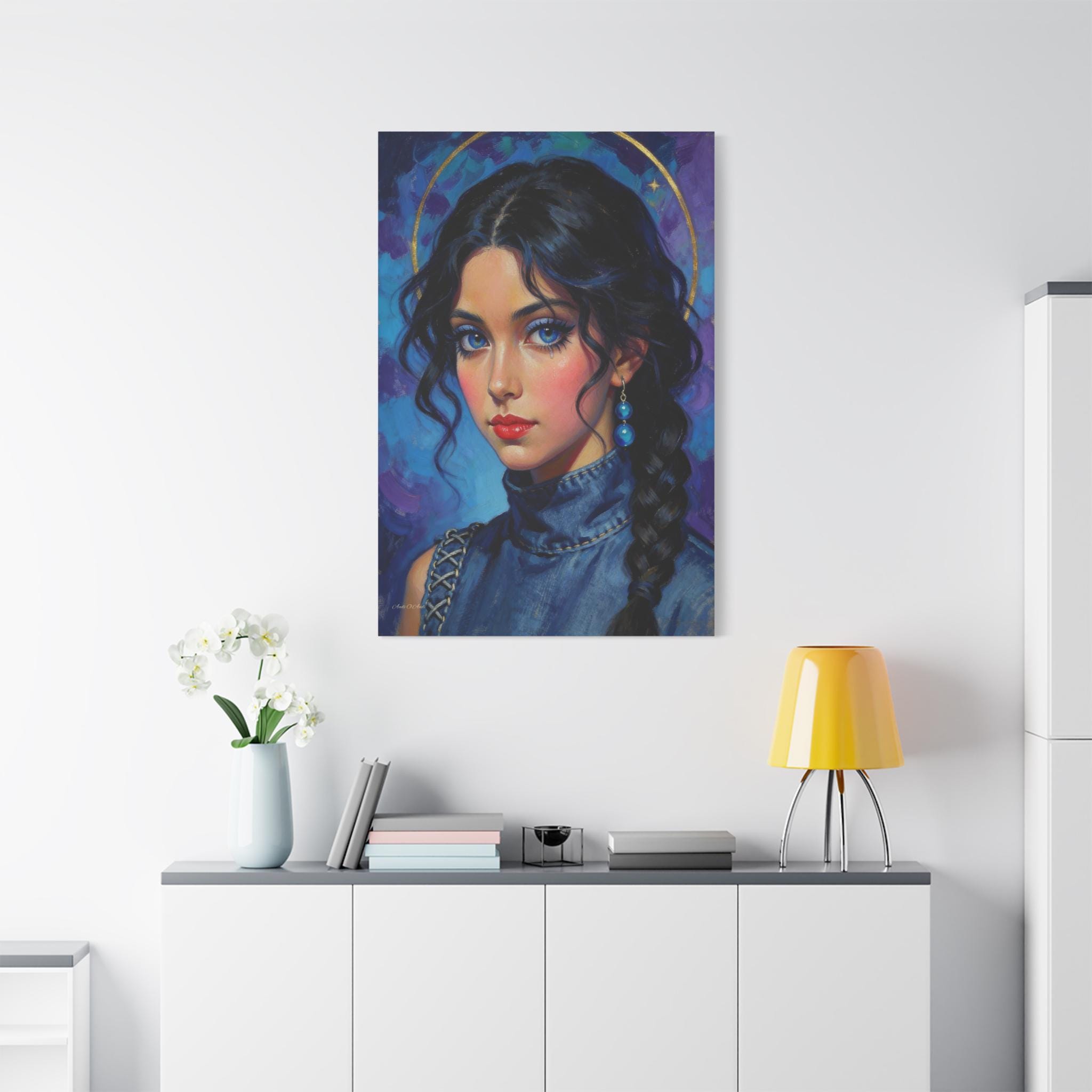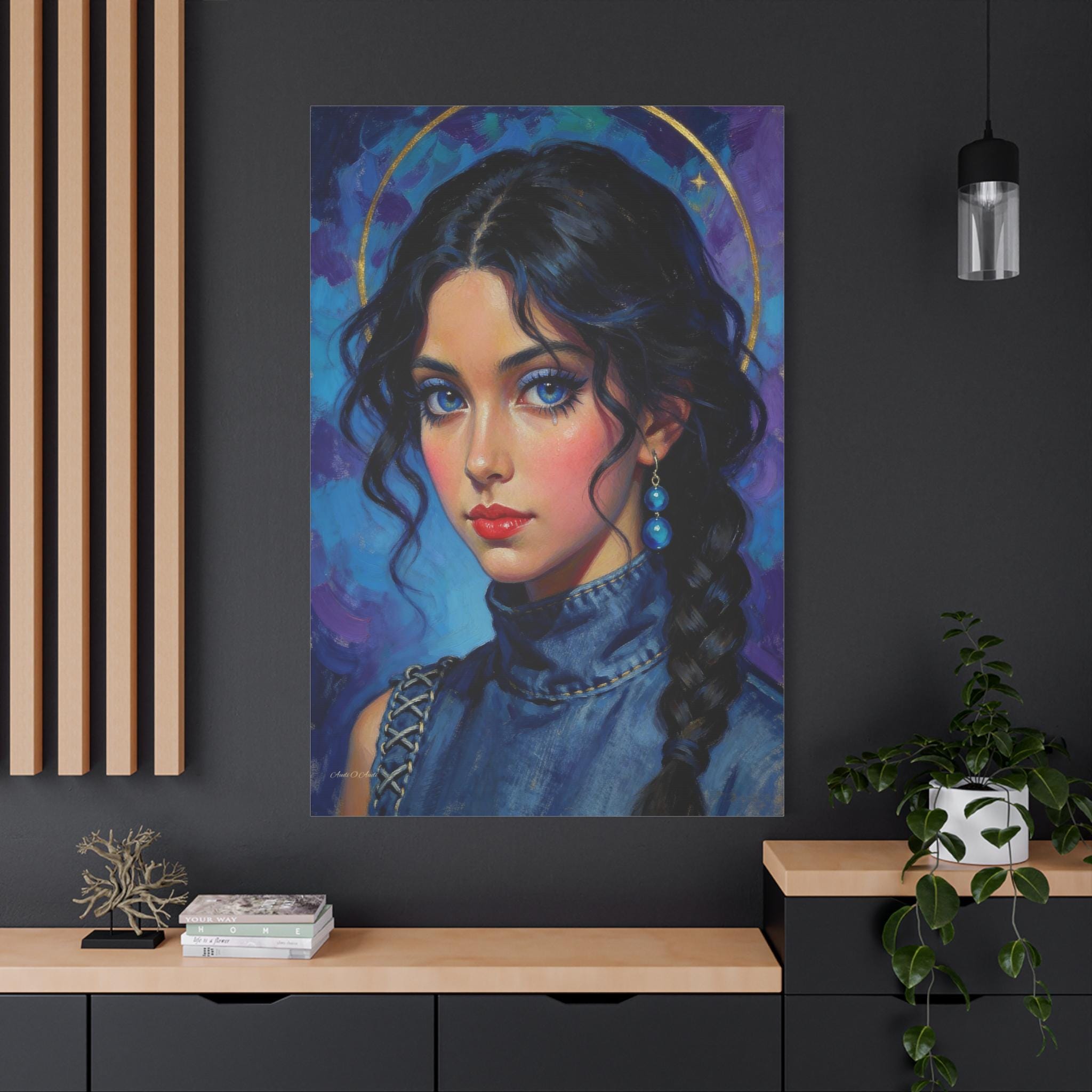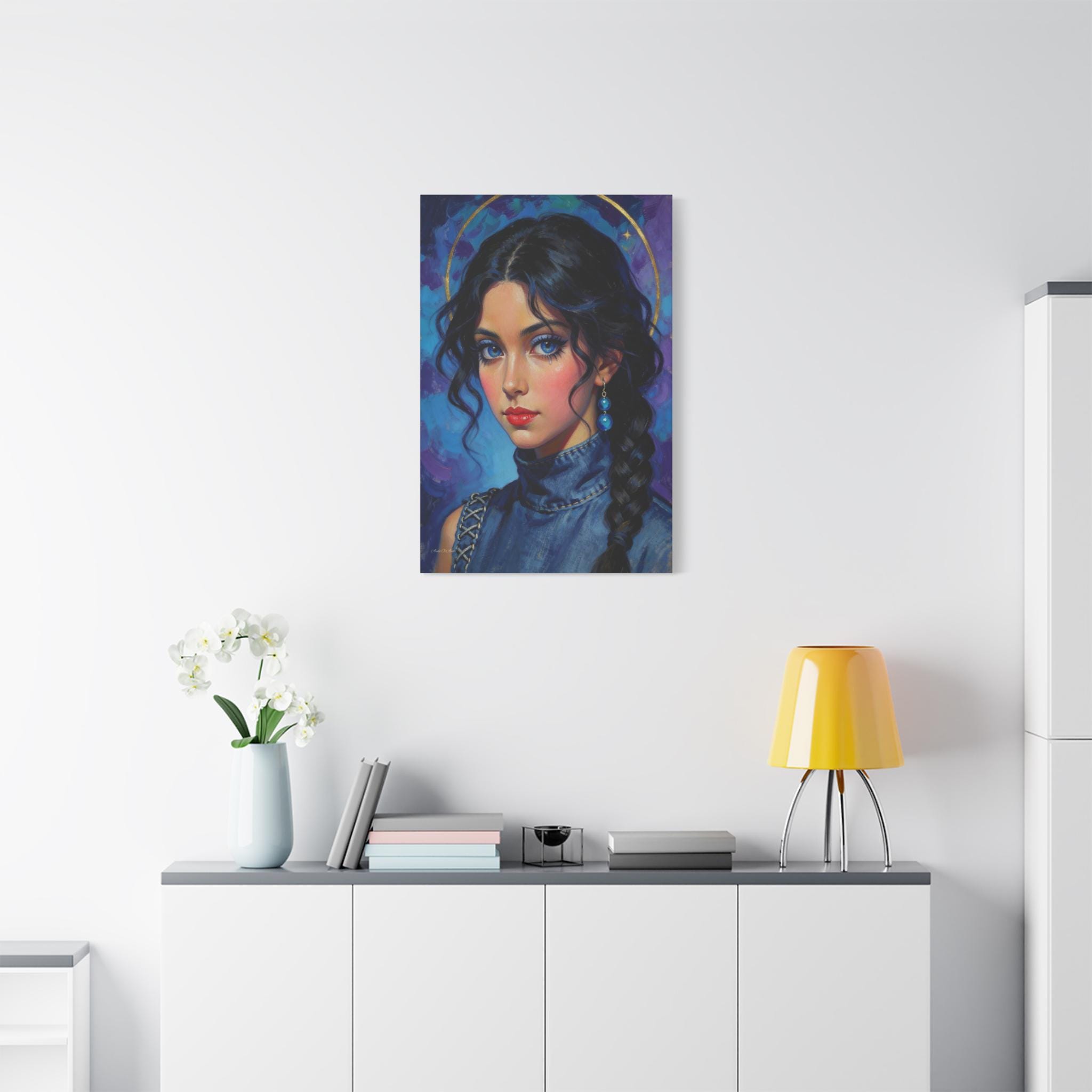 Behold the "Indigo Muse," a breathtaking canvas print that combines the rich, textural quality of oil painting with a bold, modern sensibility. This portrait features a young woman with a captivating, intense gaze and is rendered in a stunning palette of deep blues, violets, and touches of brilliant gold.