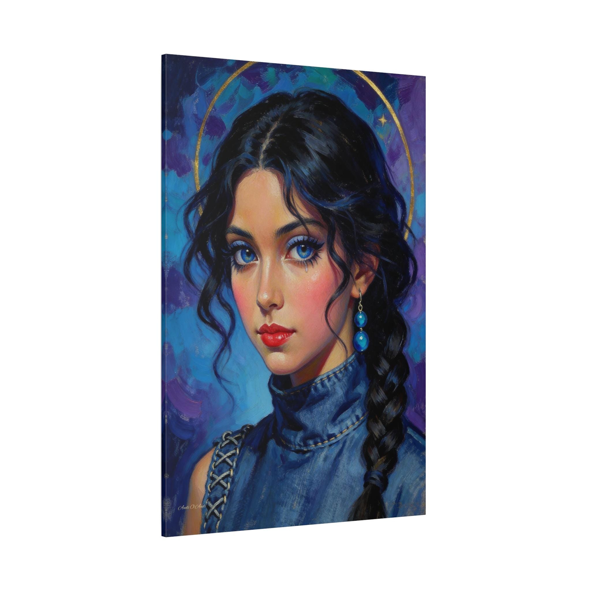 Artistry and Detail: The artwork is characterized by expressive, visible brushstrokes in the background, creating a vibrant, abstract field of amethyst and indigo. The subject is crowned with a subtle, radiant gold leaf halo, lending her a spiritual or iconic quality, reminiscent of classical religious art but reframed in a denim collar. Her brilliant blue eyes and striking red lips provide a vivid contrast to the surrounding cool tones. Note the delicate detail of the single tear, adding powerful emotional depth.