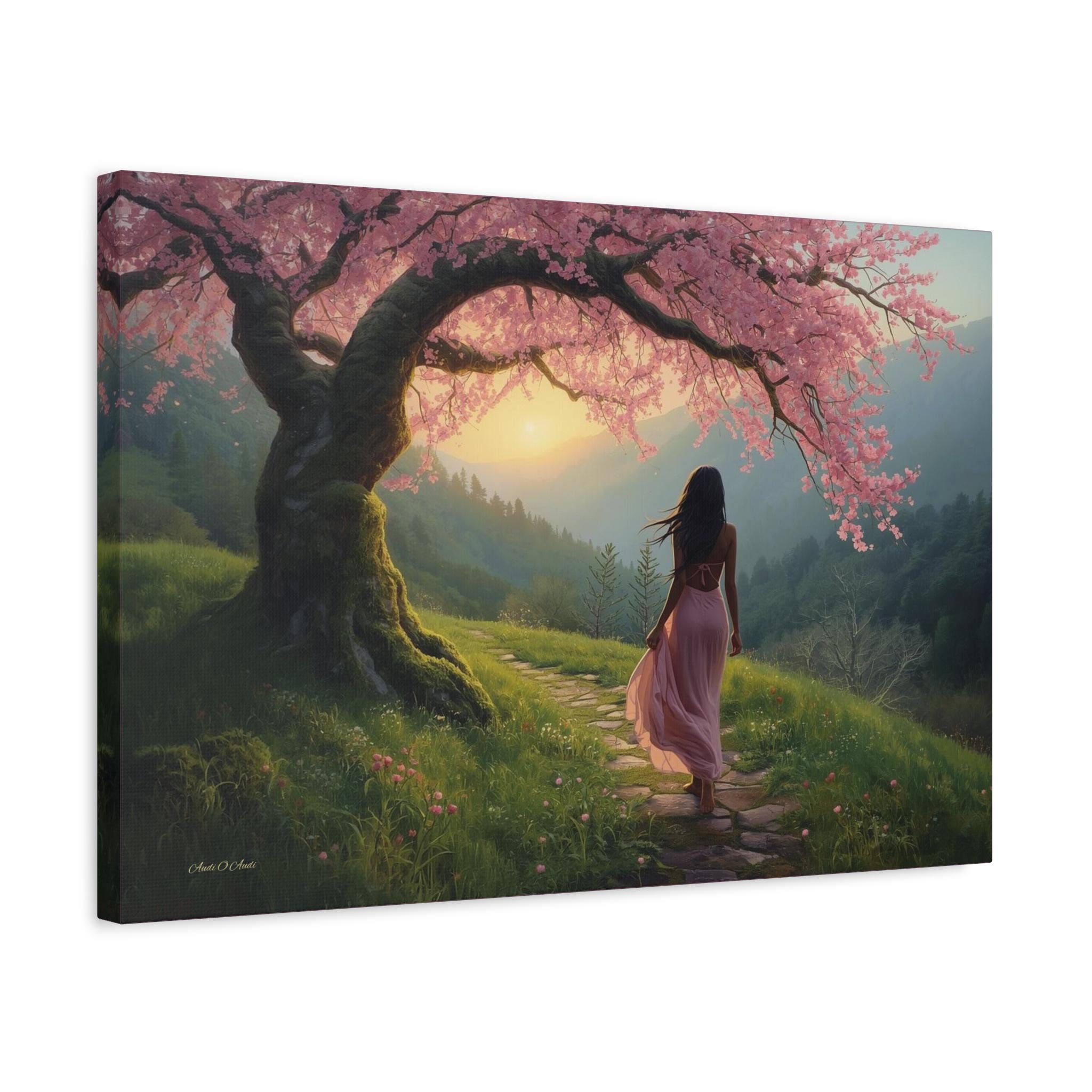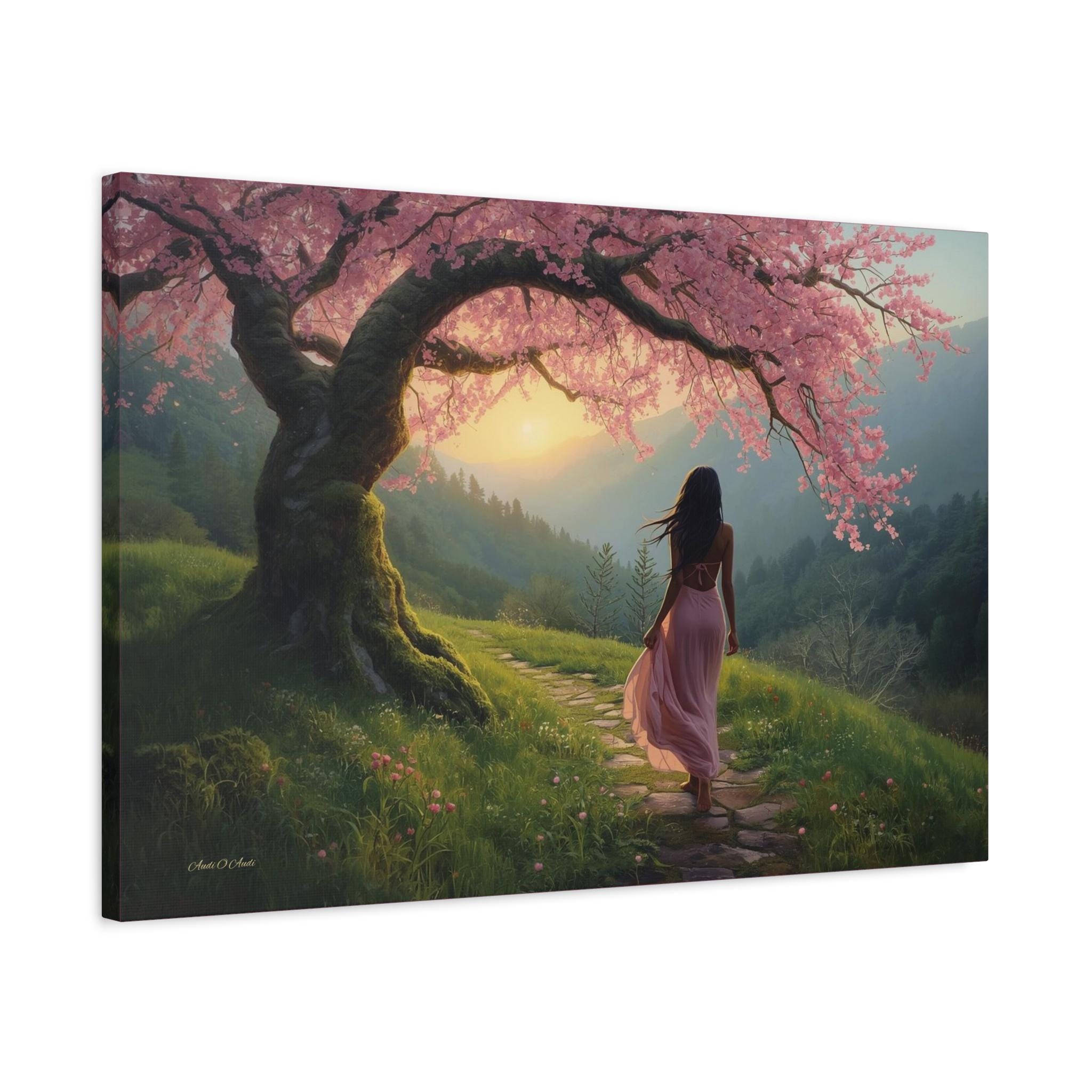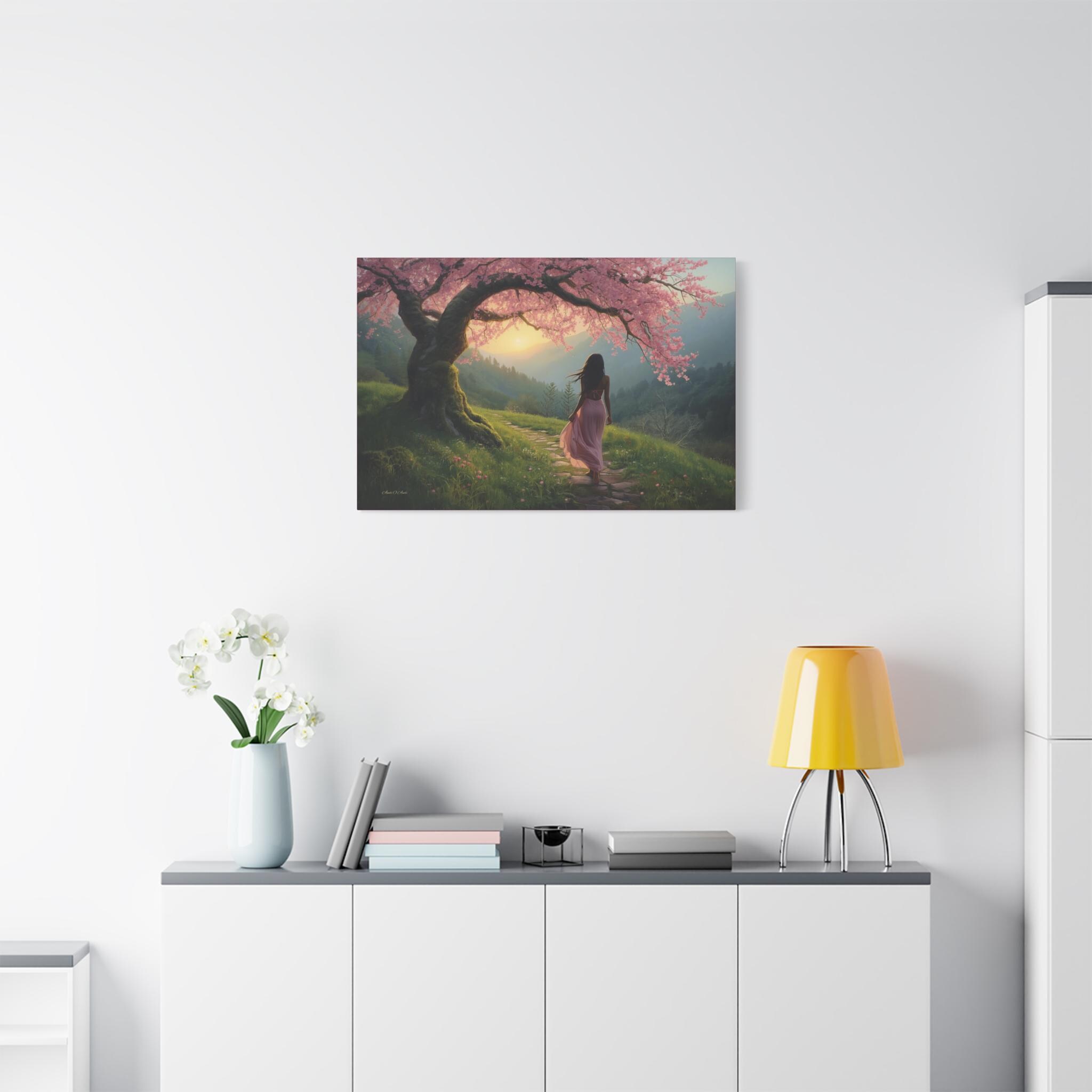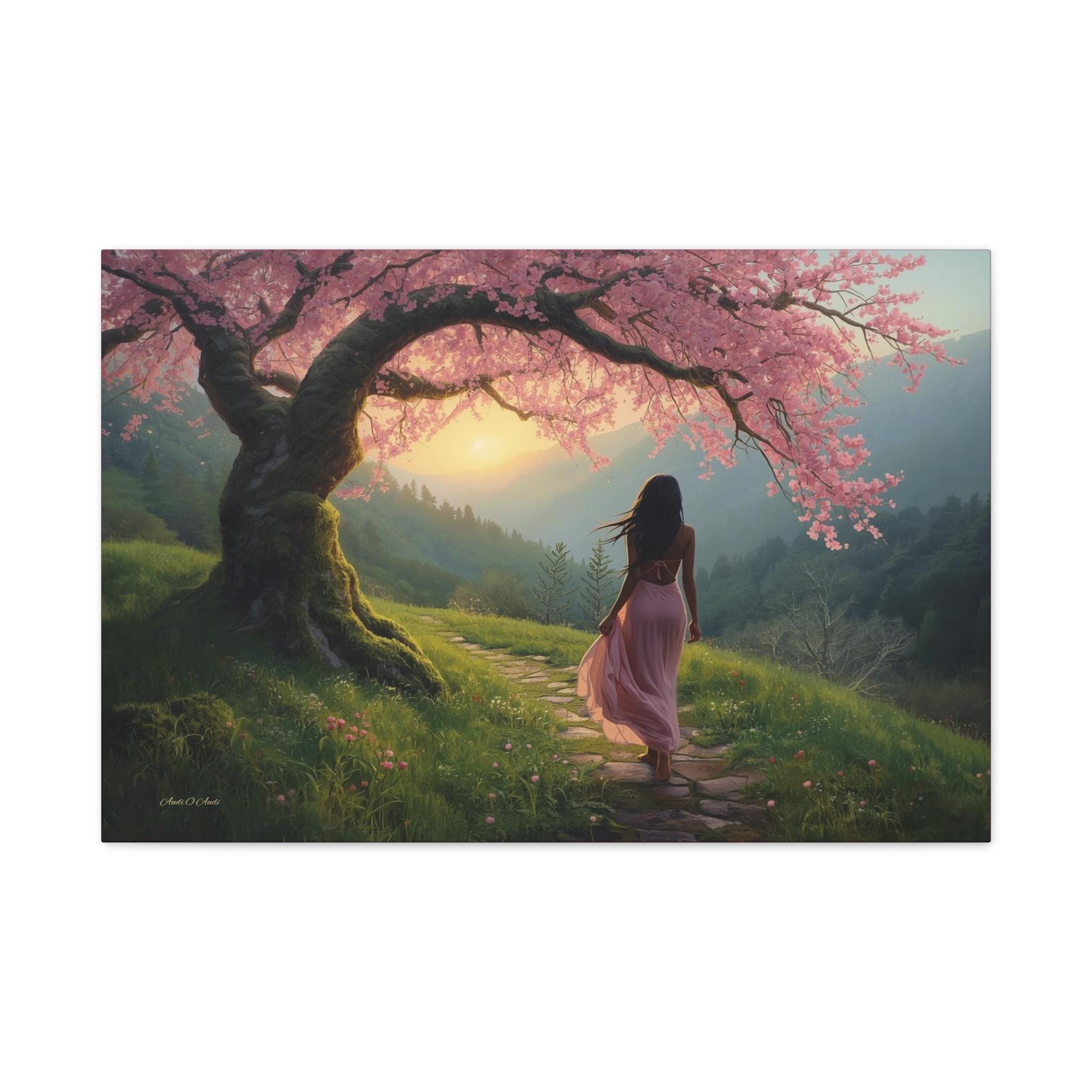 Step into a quiet dream every time you look at "Under the Blossom Sky”, a romantic fantasy landscape canvas print that feels like a still frame from a beautiful story.