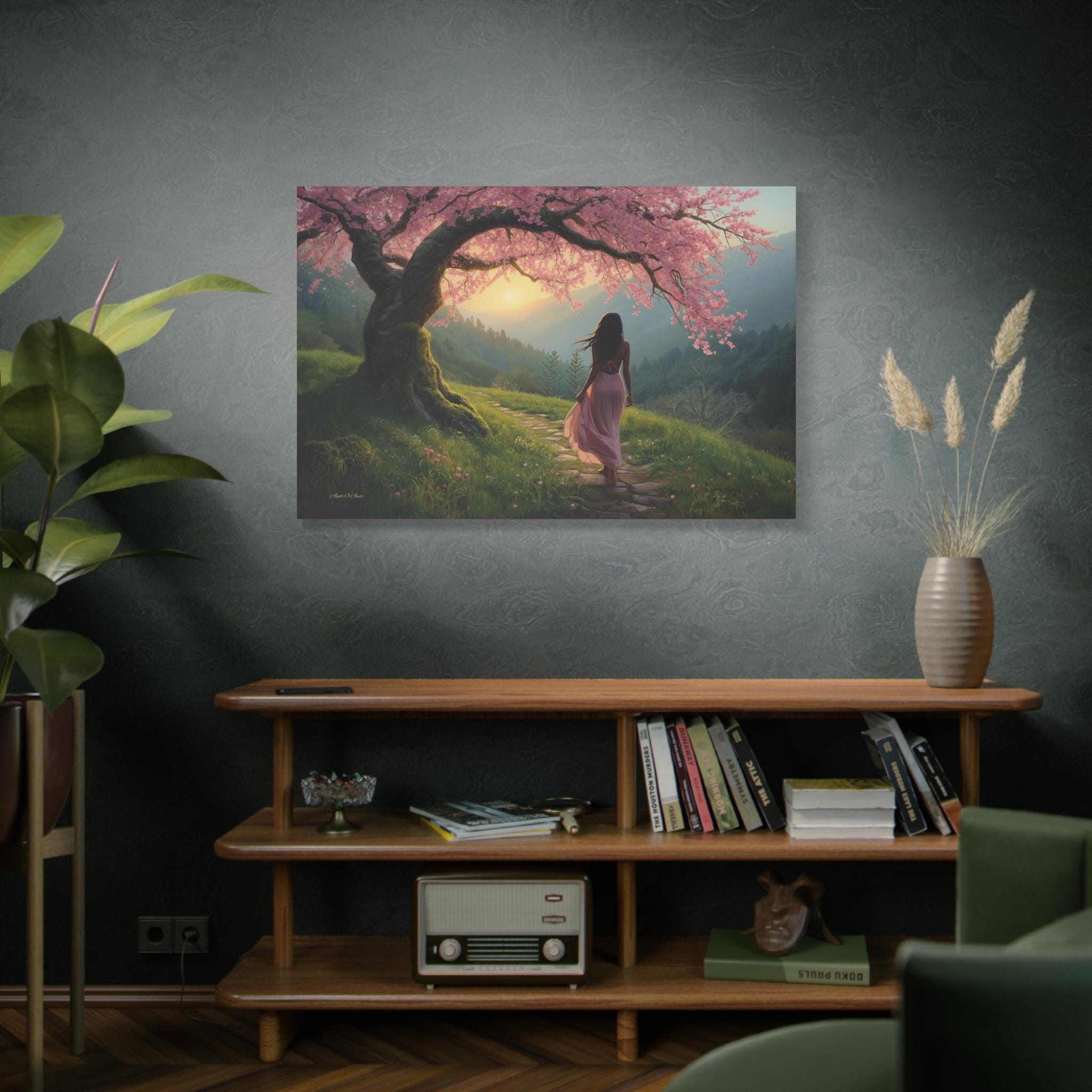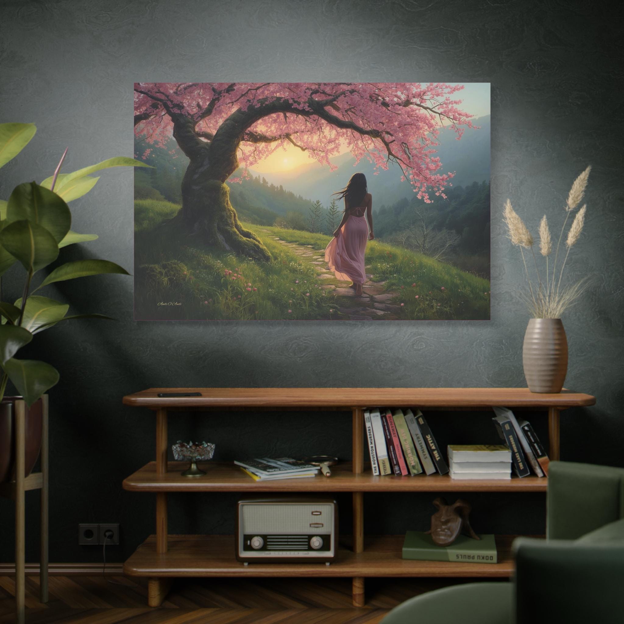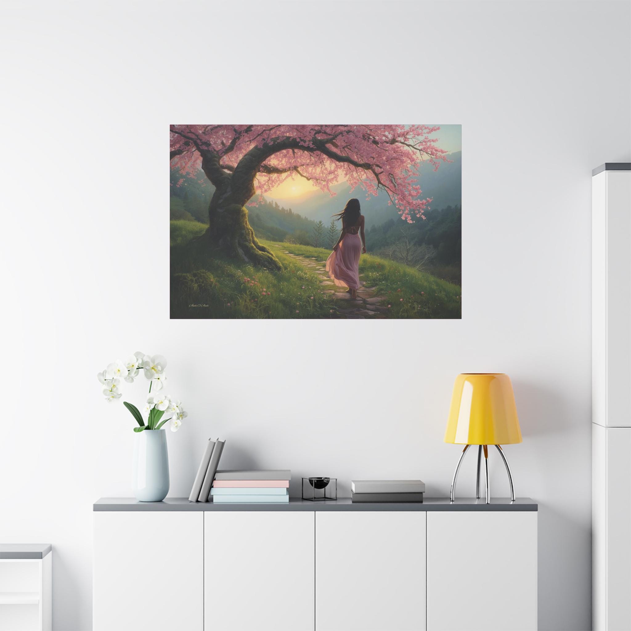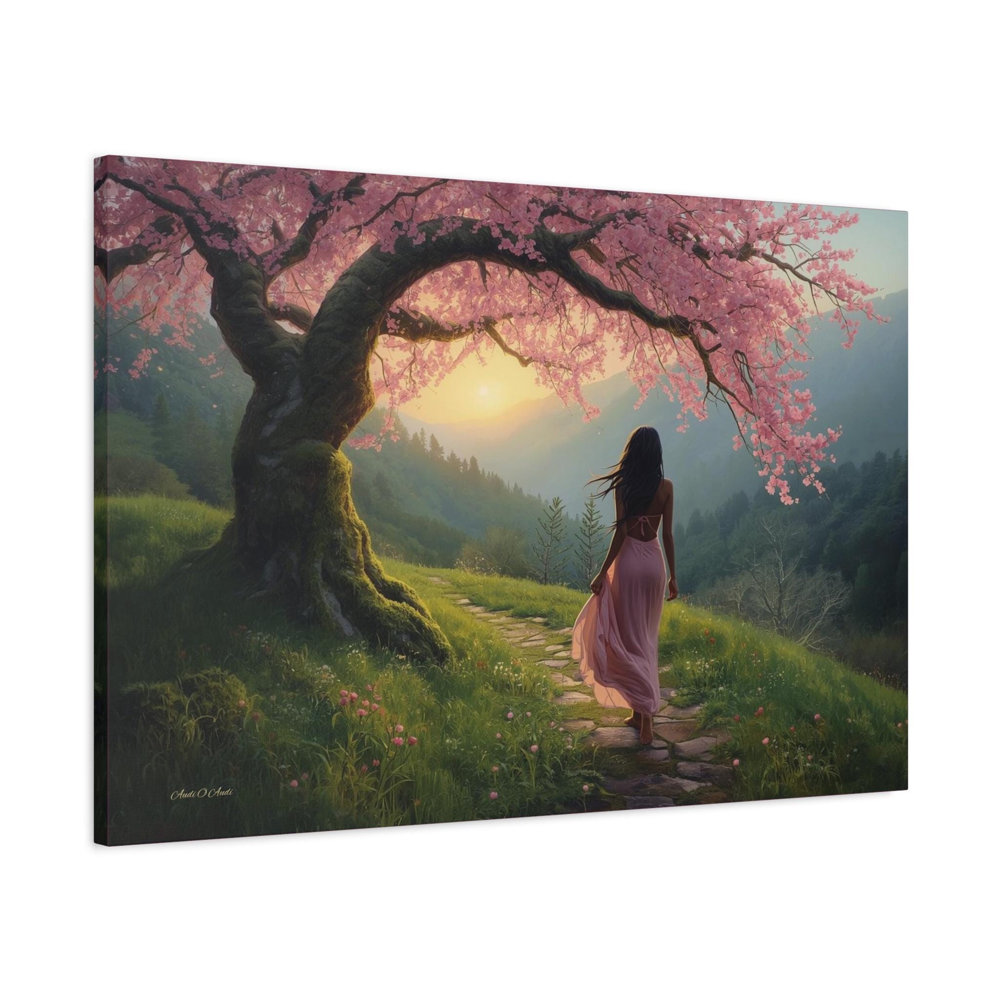 Step into a quiet dream every time you look at "Under the Blossom Sky”, a romantic fantasy landscape canvas print that feels like a still frame from a beautiful story.