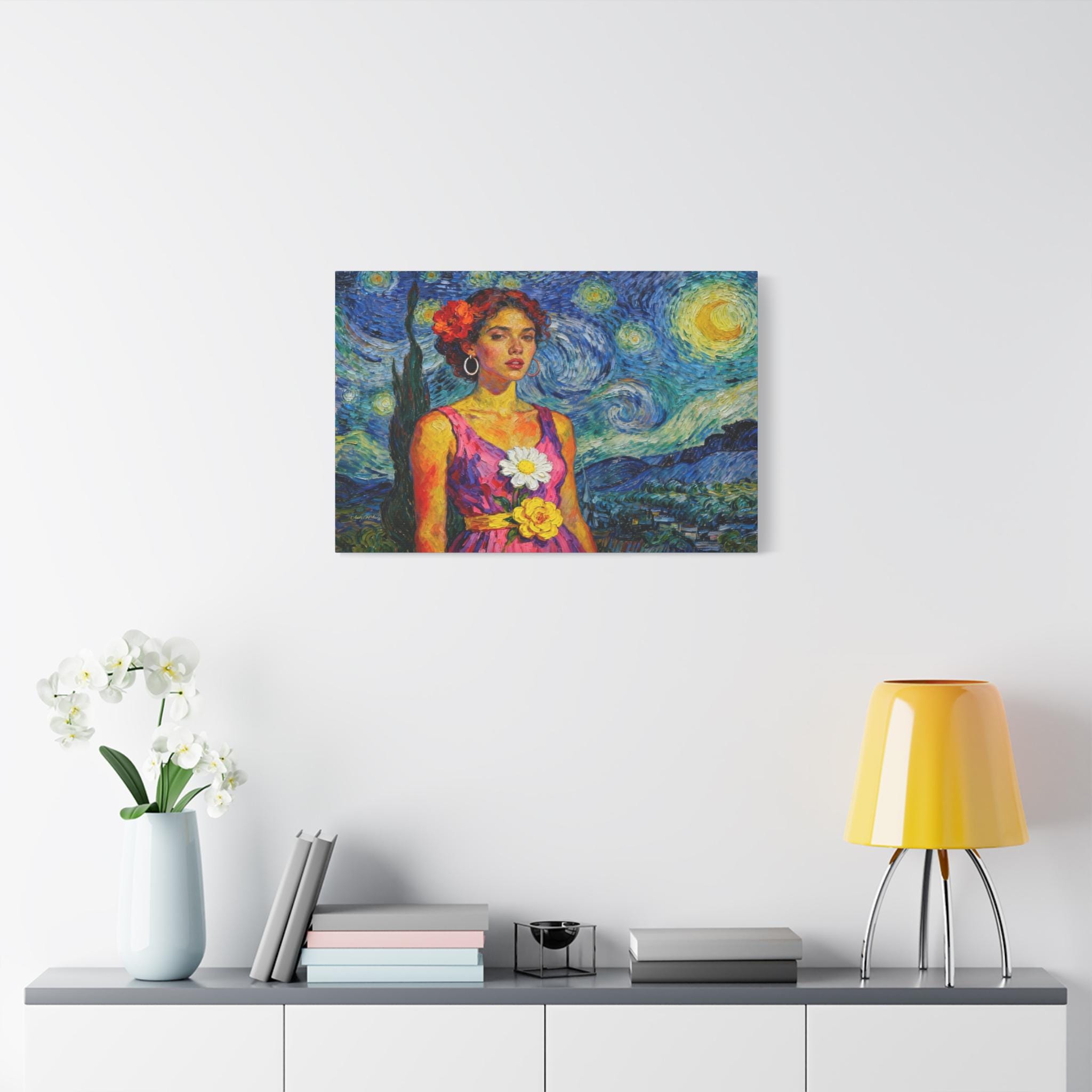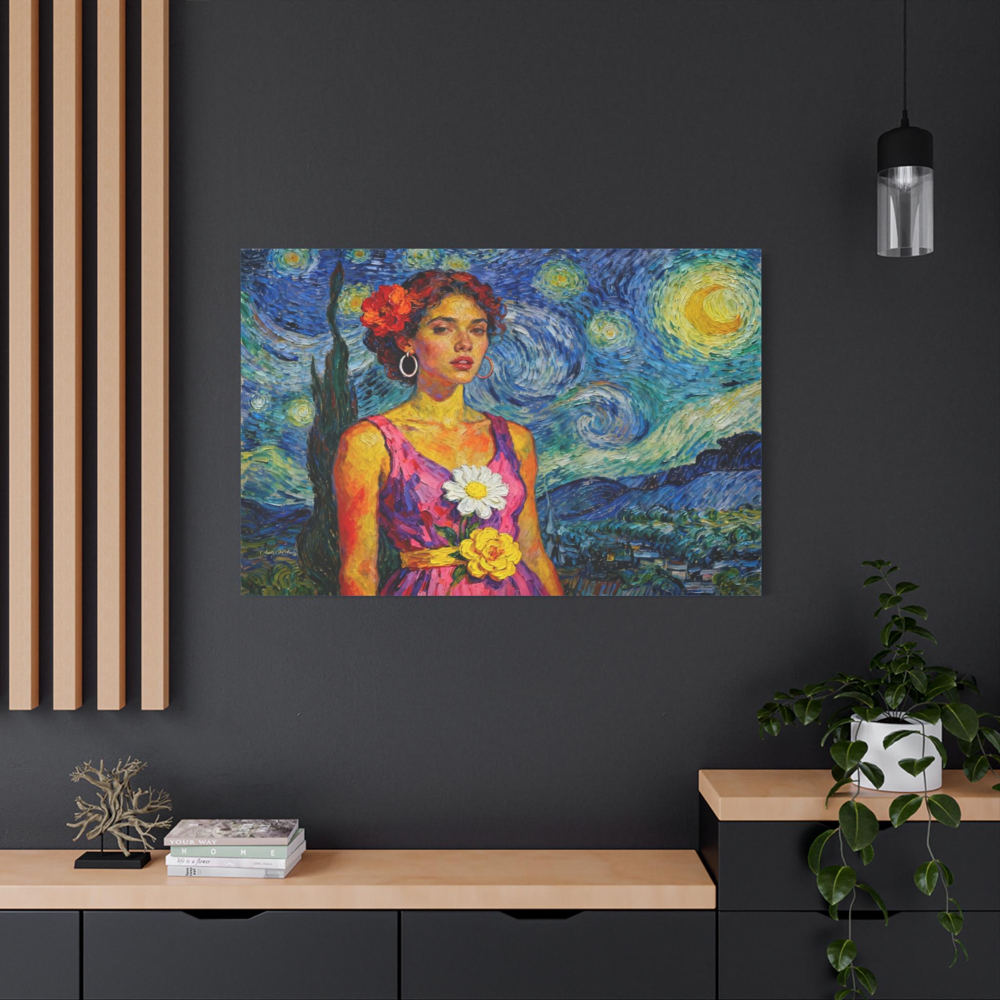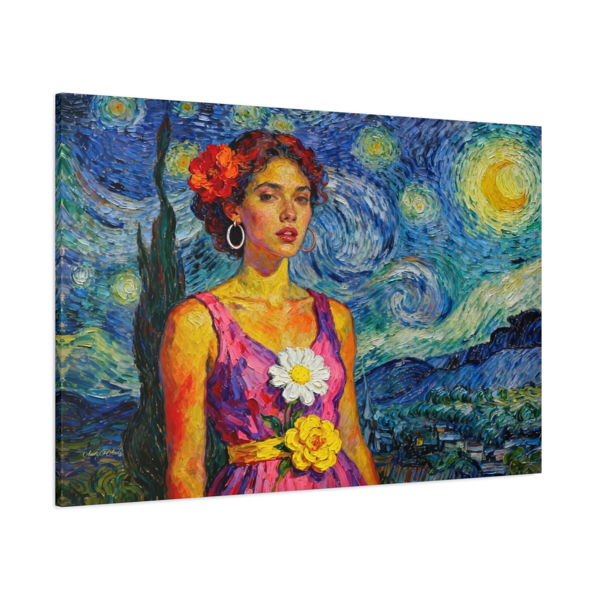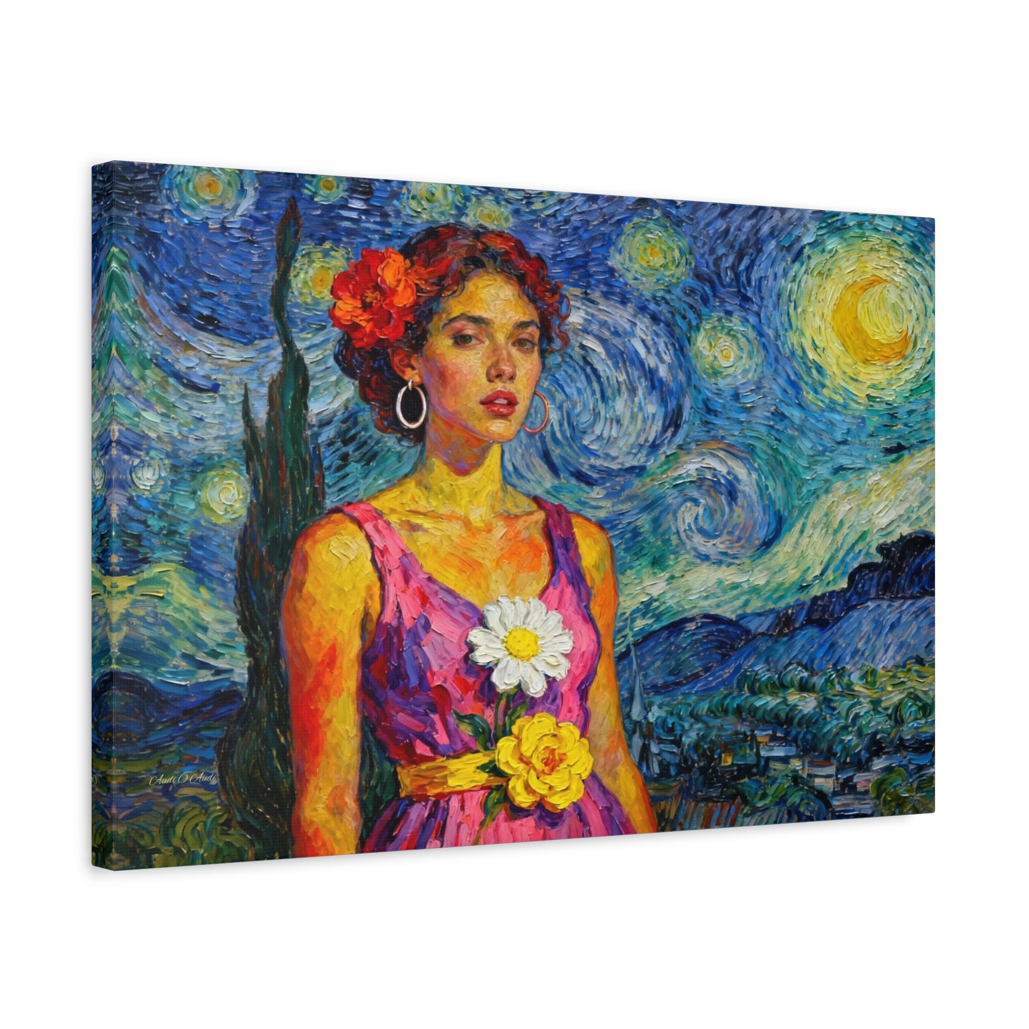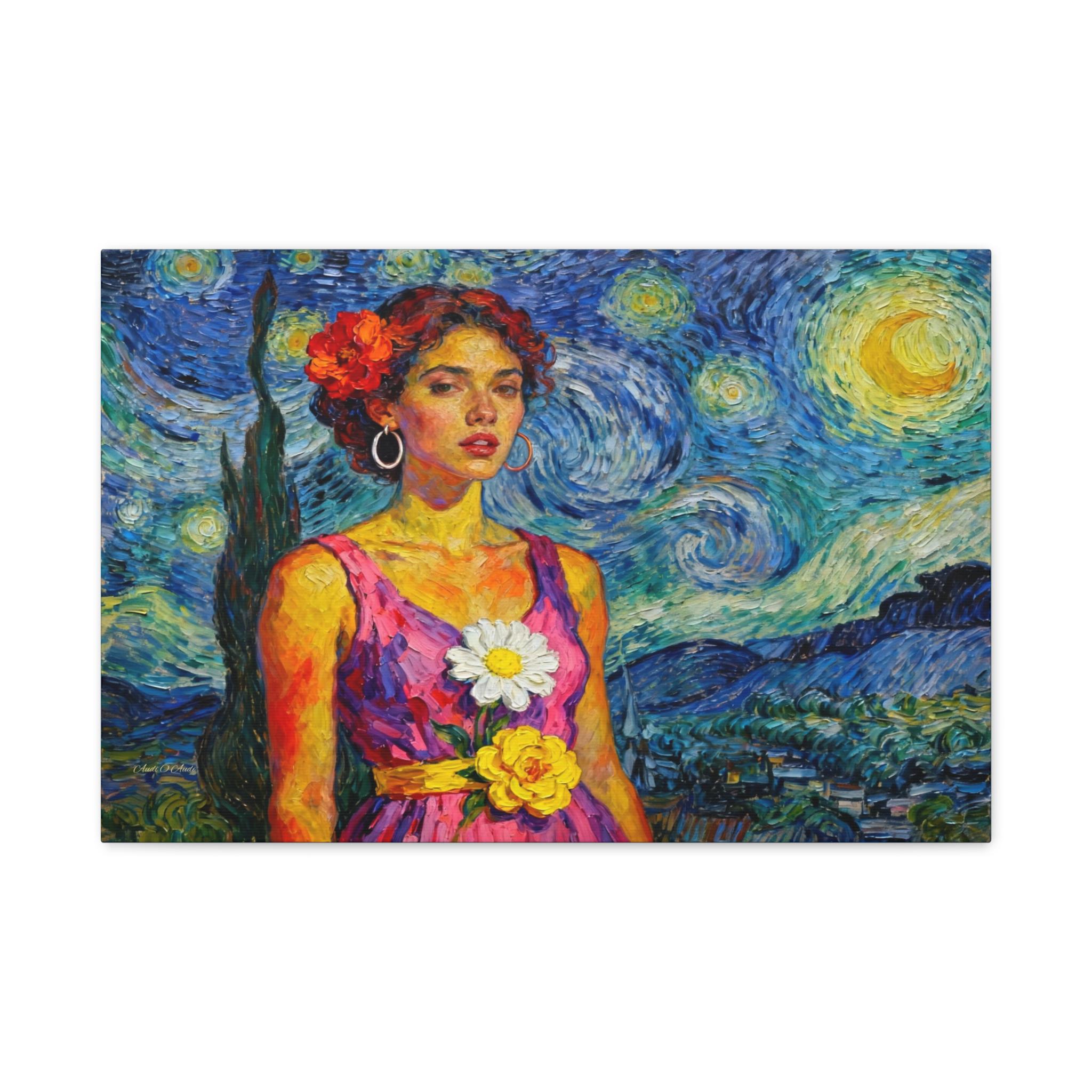This extraordinary canvas print captures the unmistakable energy and passion of Vincent van Gogh, reimagining his iconic Starry Night as the backdrop for a captivating portrait. Titled "The Cypress Muse," this piece is a dynamic celebration of color, texture, and light.
