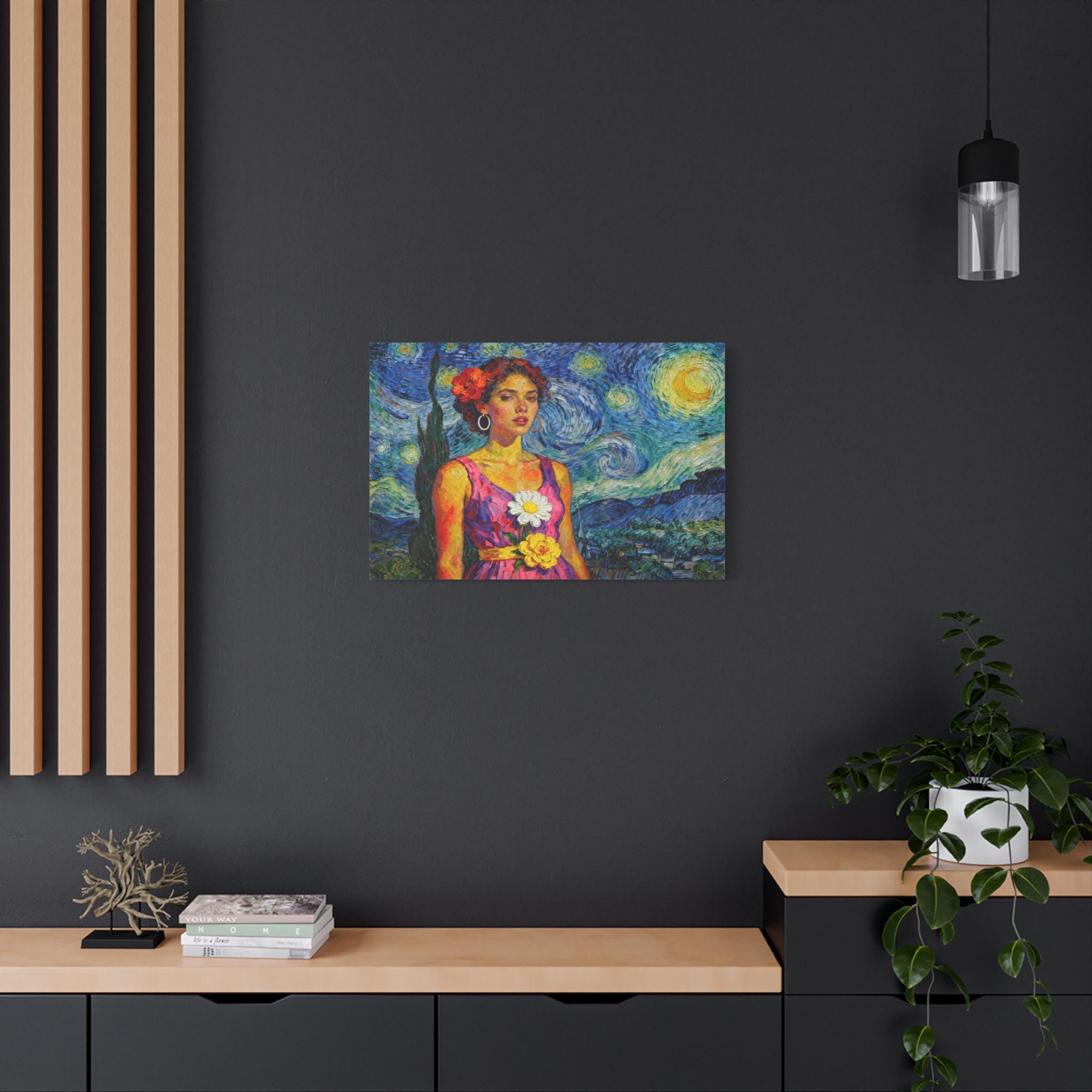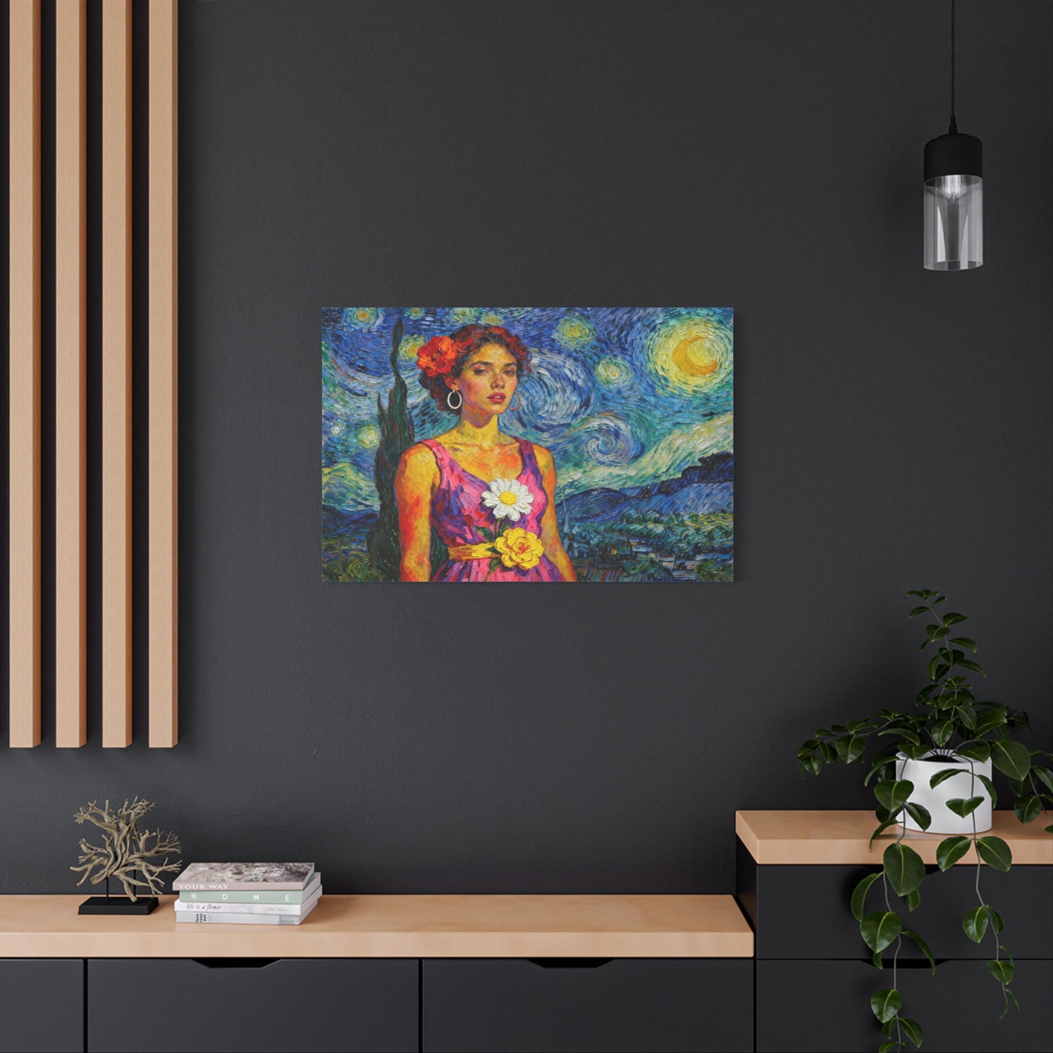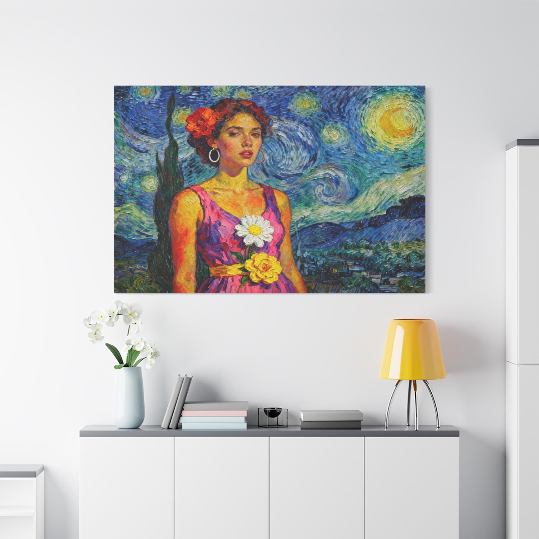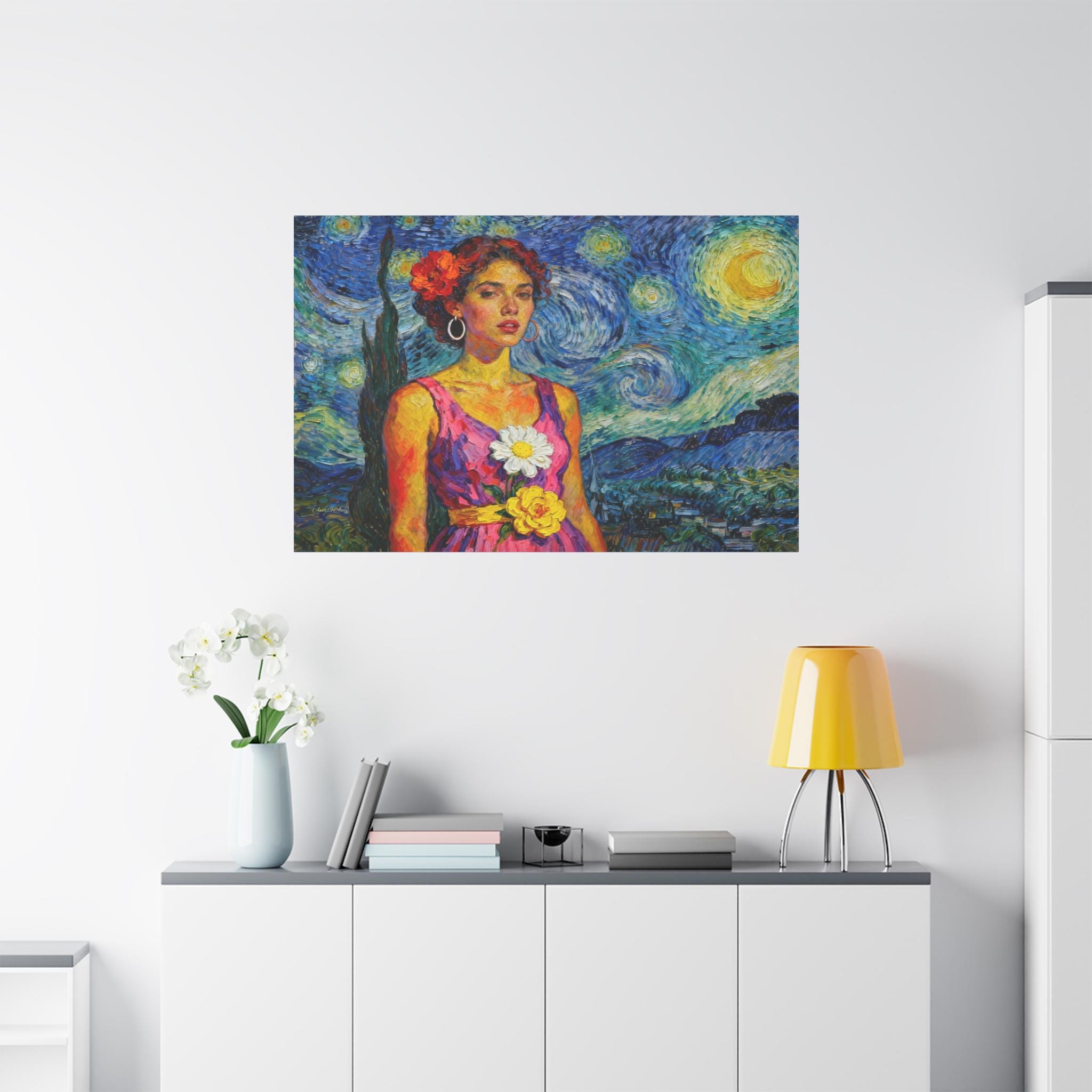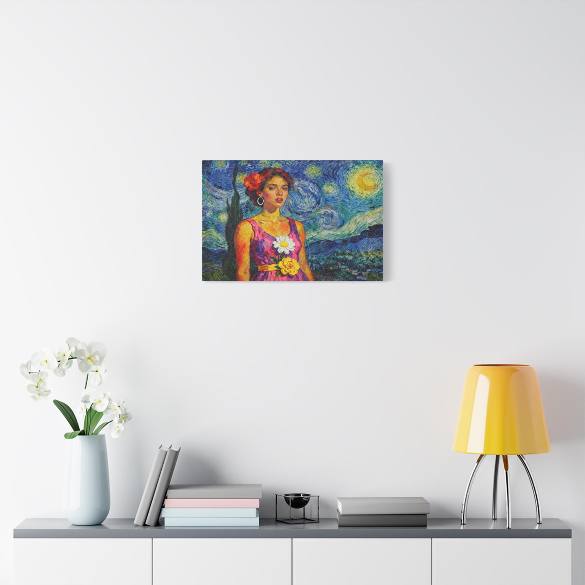 This extraordinary canvas print captures the unmistakable energy and passion of Vincent van Gogh, reimagining his iconic Starry Night as the backdrop for a captivating portrait. Titled "The Cypress Muse," this piece is a dynamic celebration of color, texture, and light.