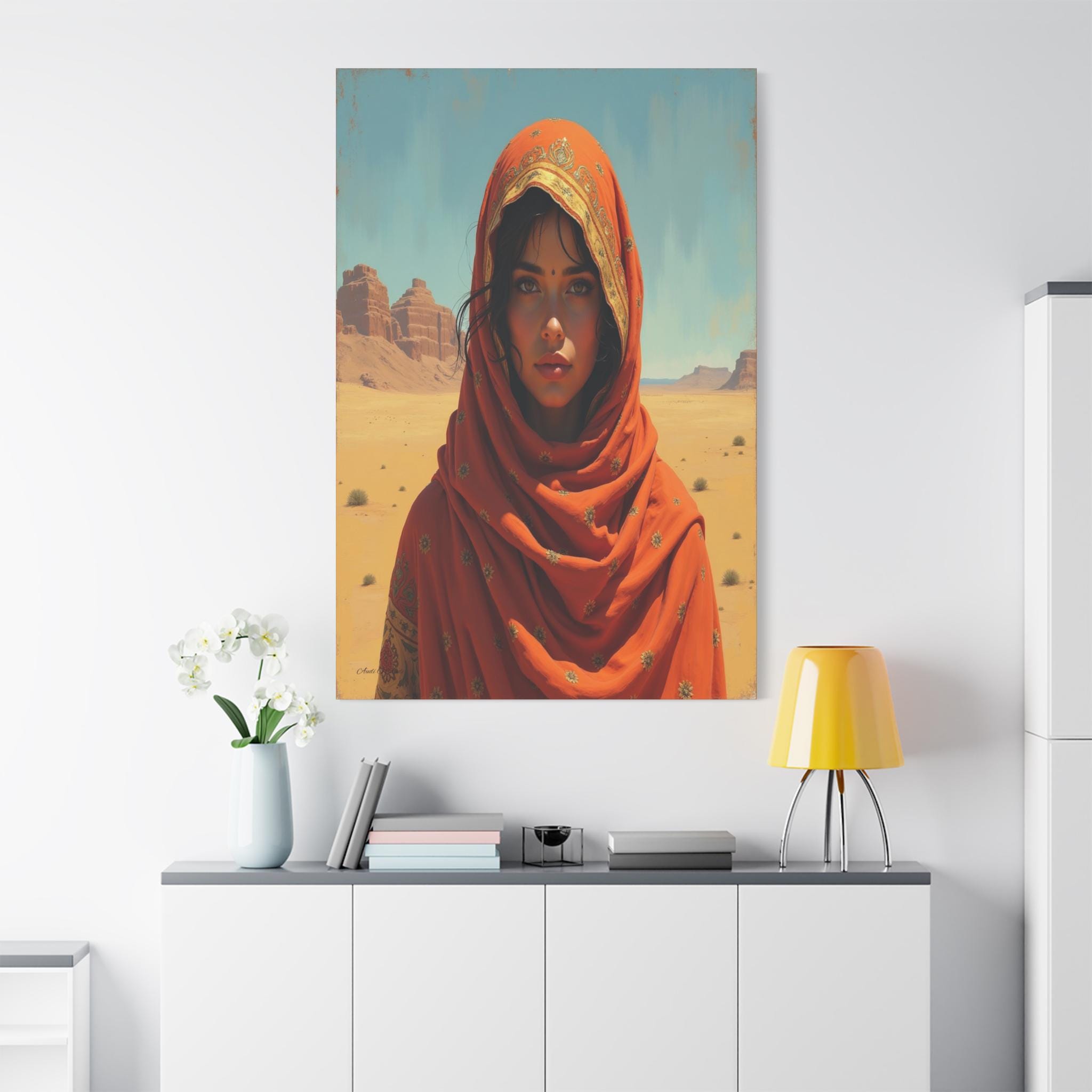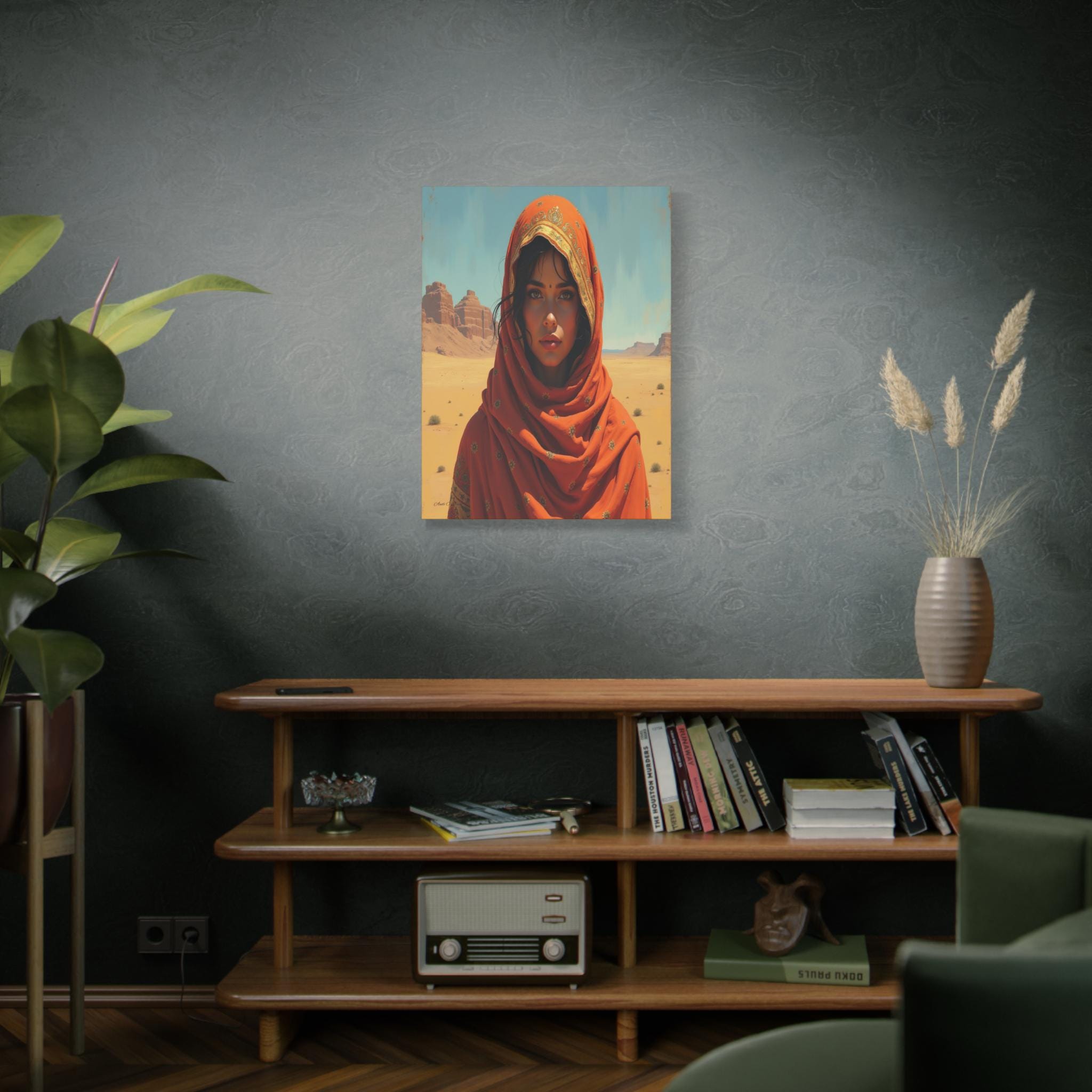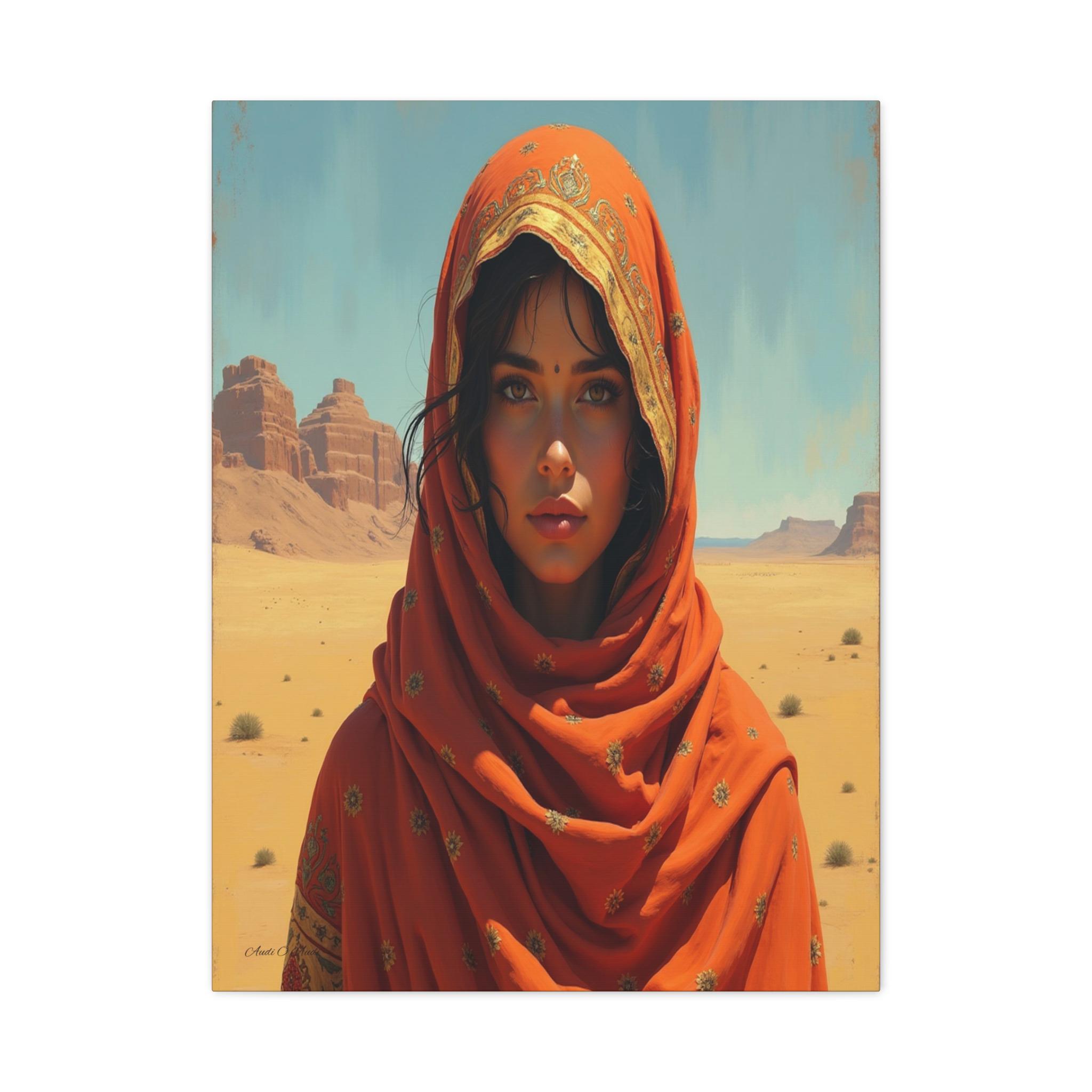 Add a touch of mystery and vibrant culture to your walls with "Saffron Desert Queen." This captivating portrait features a stunning woman clad in a richly detailed saffron headscarf, standing against a backdrop of majestic desert rock formations.