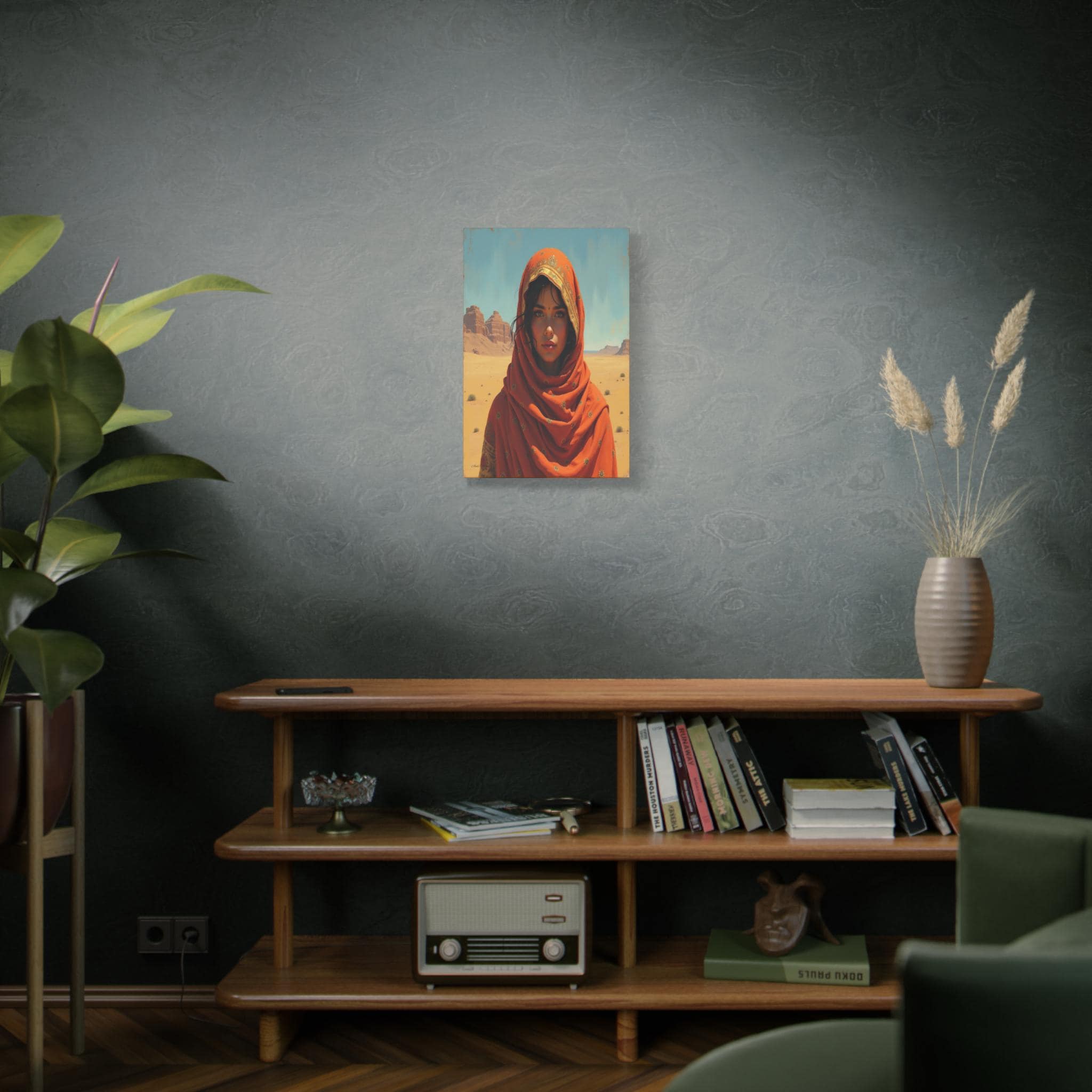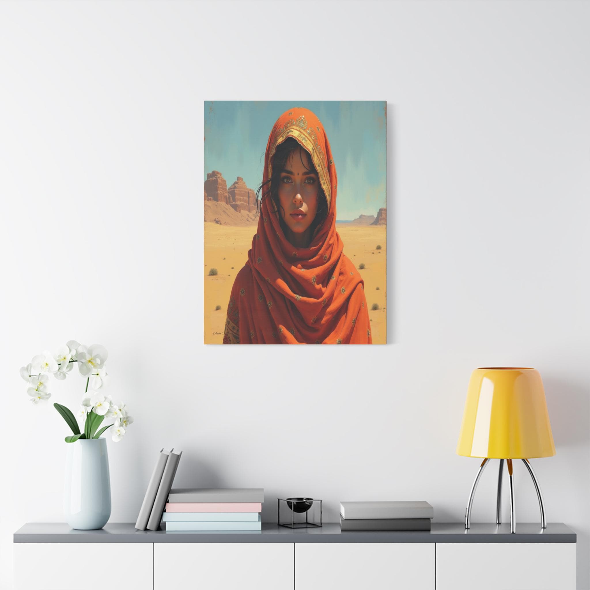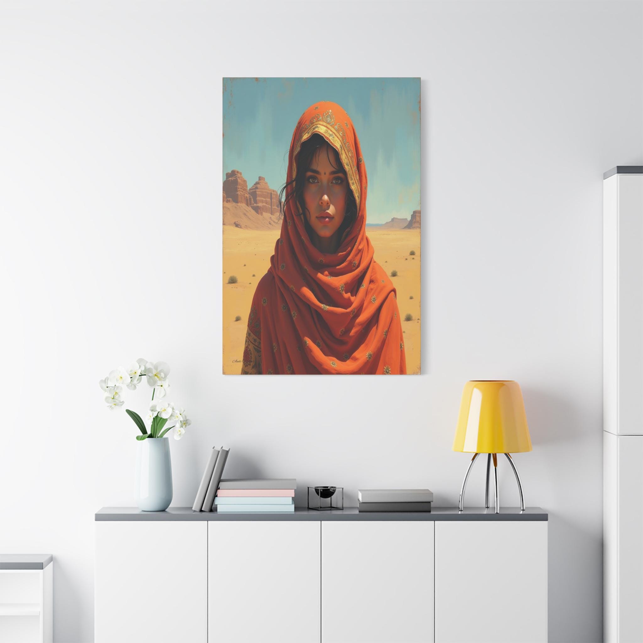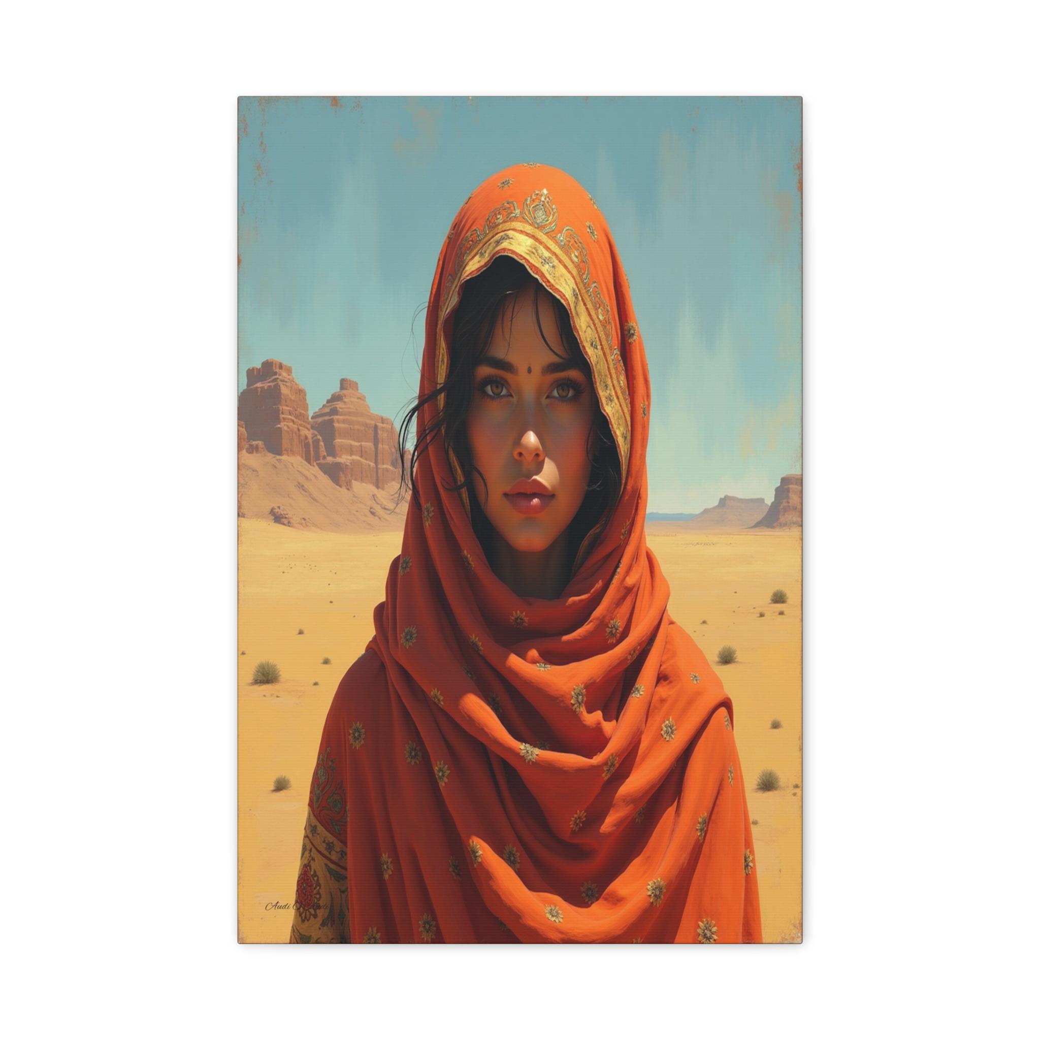 Add a touch of mystery and vibrant culture to your walls with "Saffron Desert Queen." This captivating portrait features a stunning woman clad in a richly detailed saffron headscarf, standing against a backdrop of majestic desert rock formations.