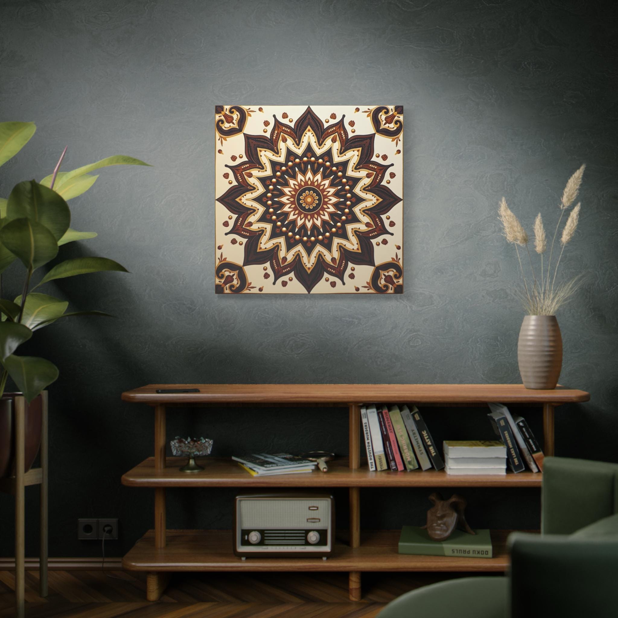 The piece evokes a sense of meditative calm, ancient wisdom, and balanced stability. Its rich colors and intricate detail make it a visually weighty and grounding element, perfect for adding texture and sophistication to a modern or eclectic interior space.
