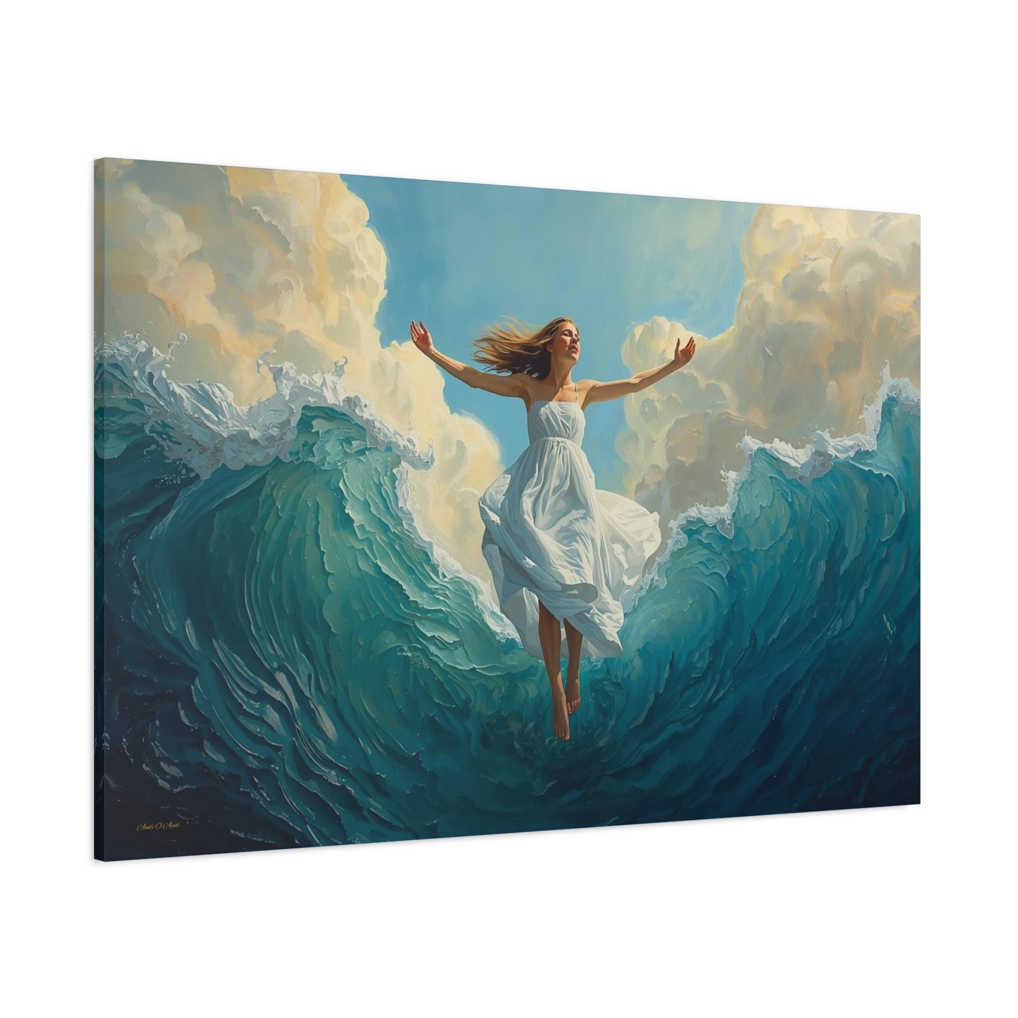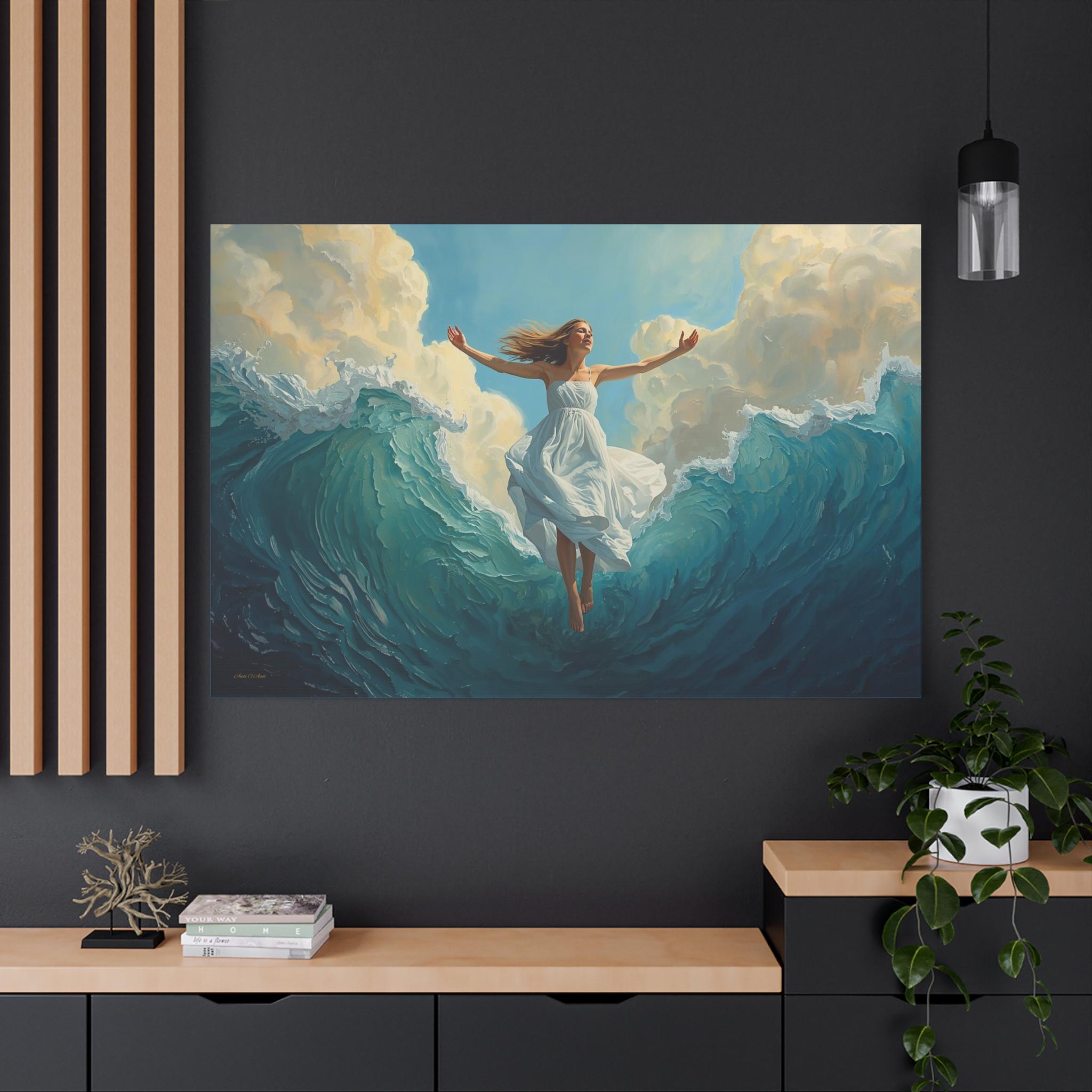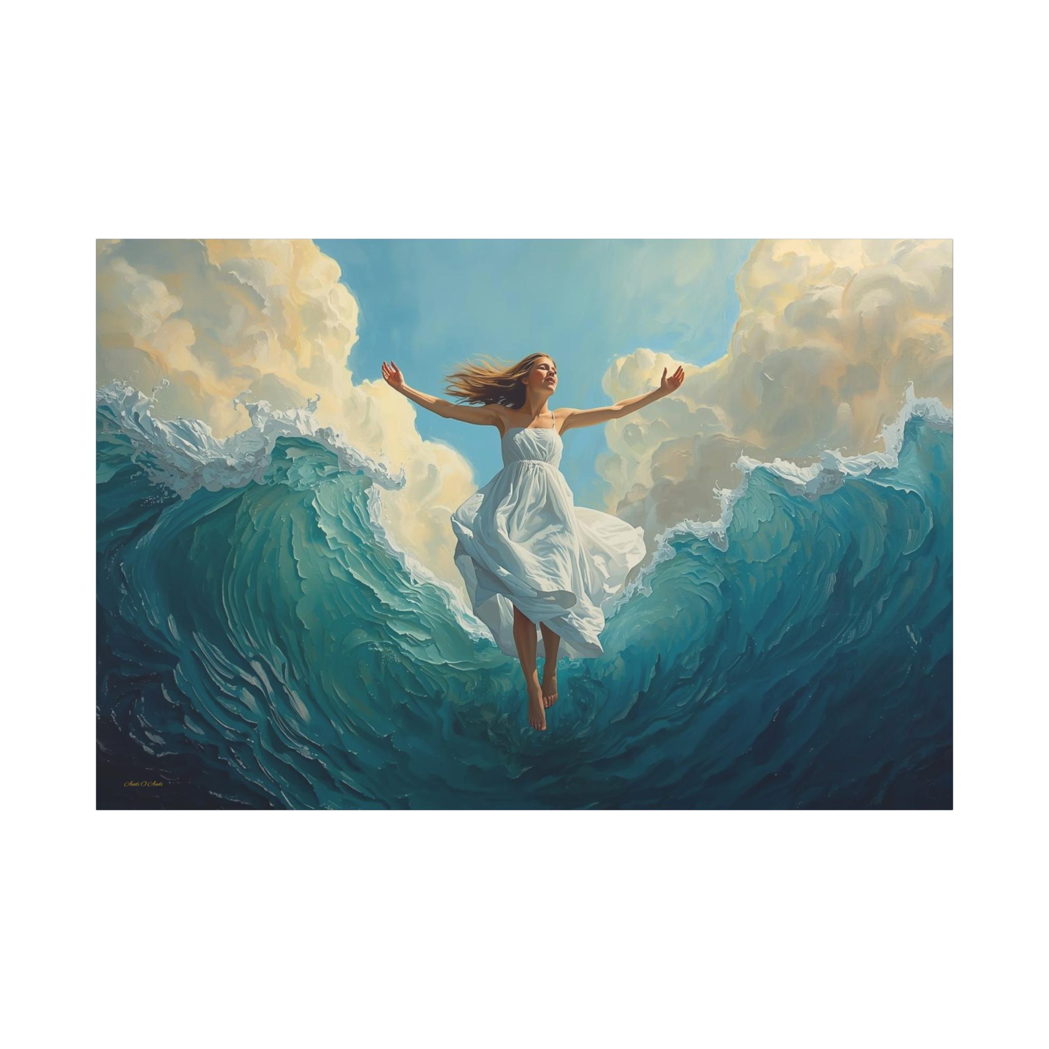 Experience the profound feeling of weightlessness and triumph with this spectacular canvas print. Ascension Above the Tide captures the very moment a woman, robed in luminous white, rises effortlessly from the crest of a monumental, churning sea.