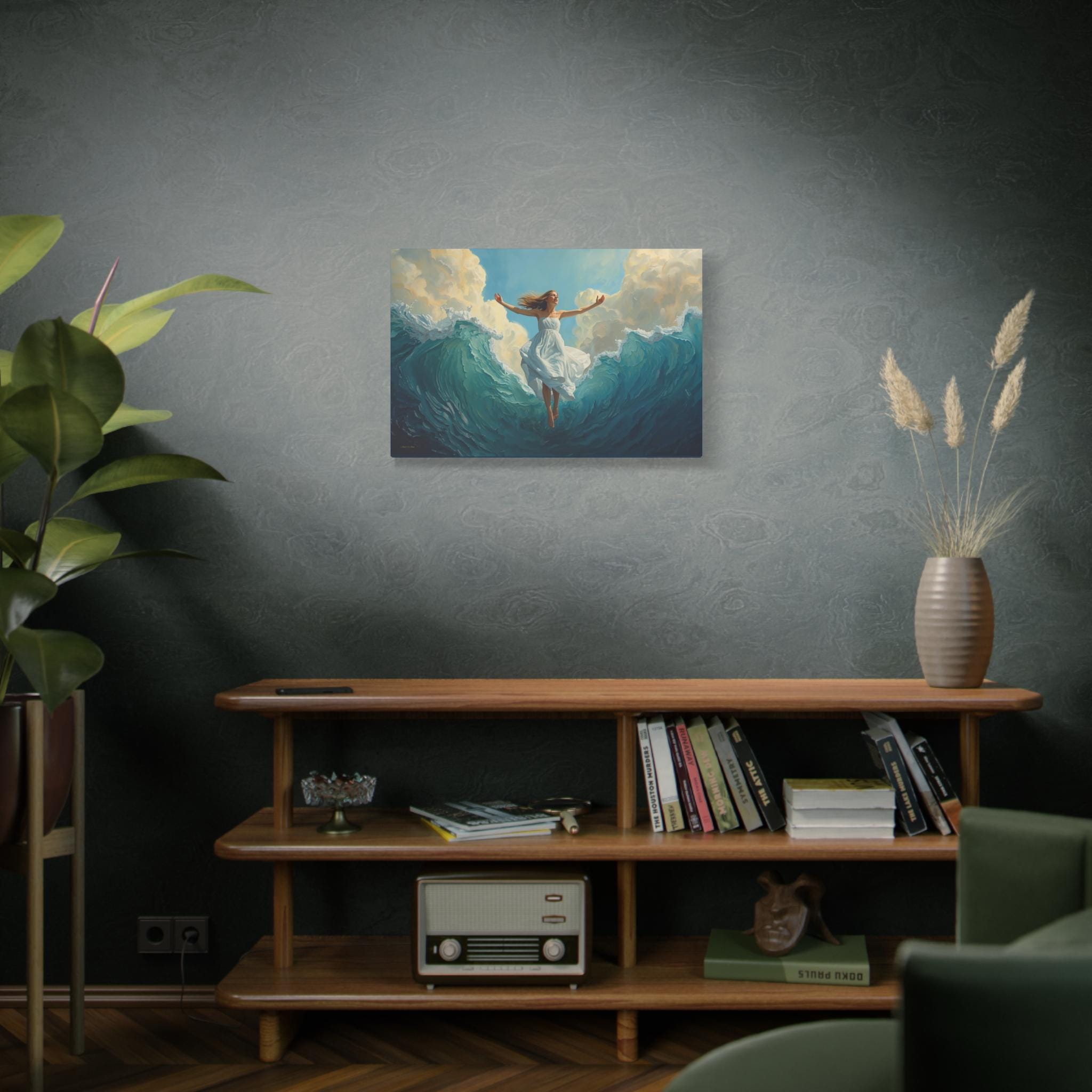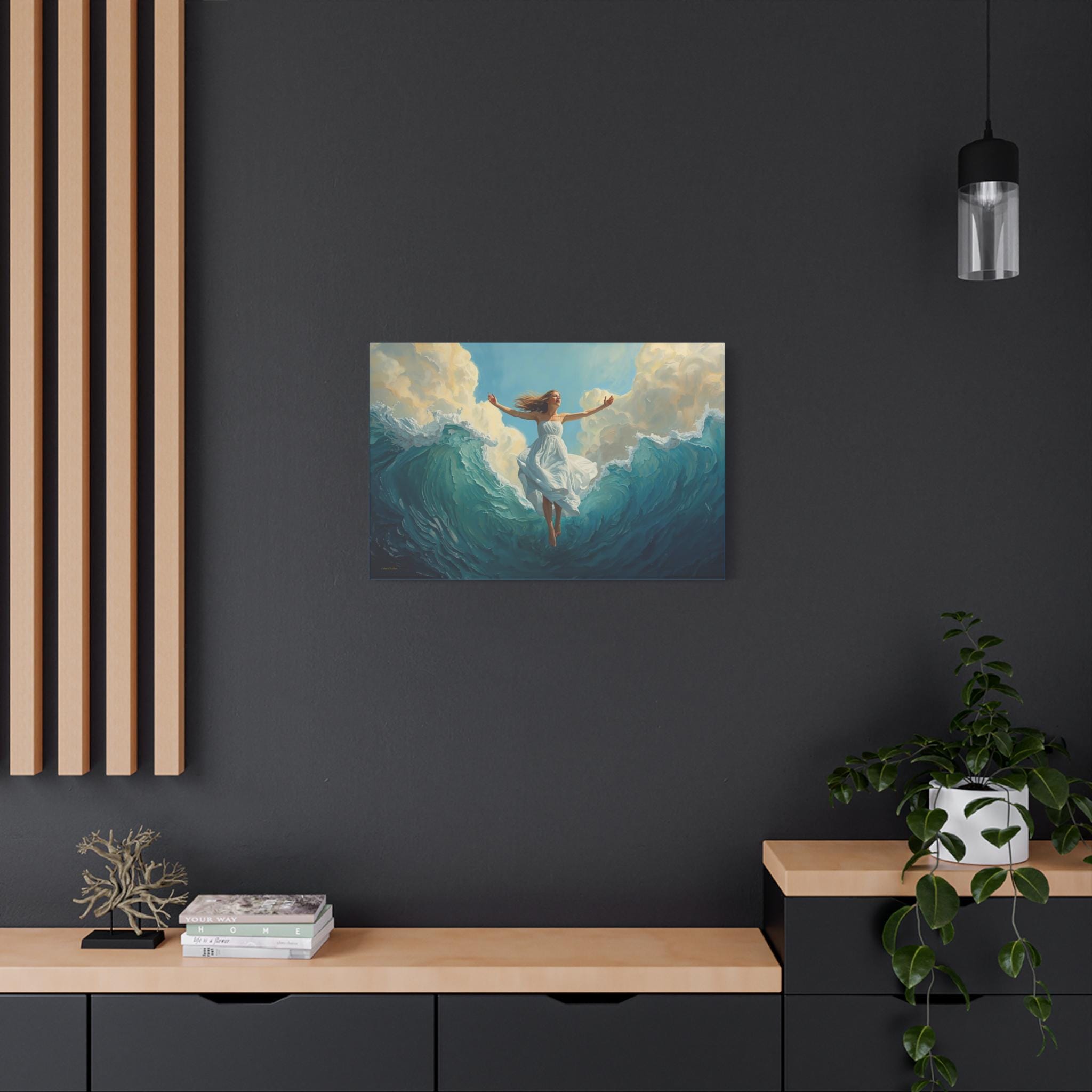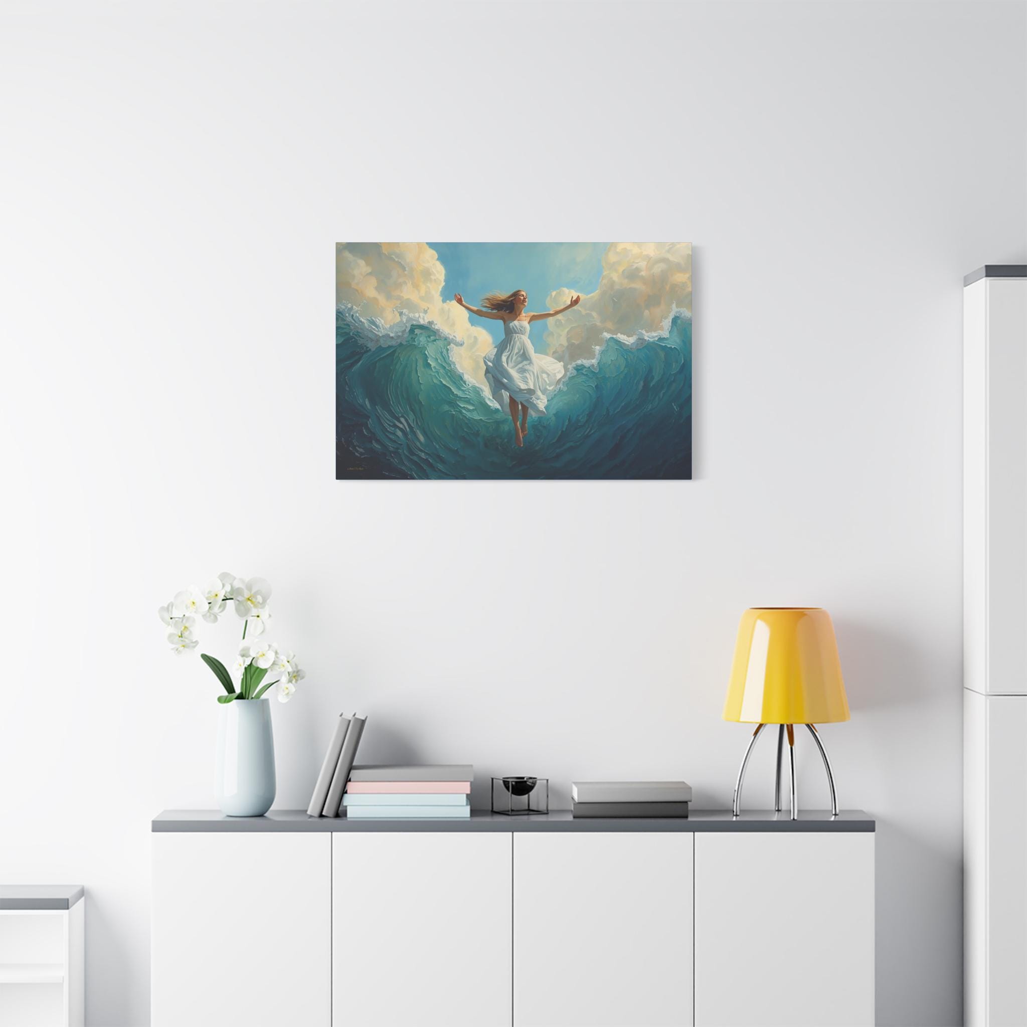 Experience the profound feeling of weightlessness and triumph with this spectacular canvas print. Ascension Above the Tide captures the very moment a woman, robed in luminous white, rises effortlessly from the crest of a monumental, churning sea.