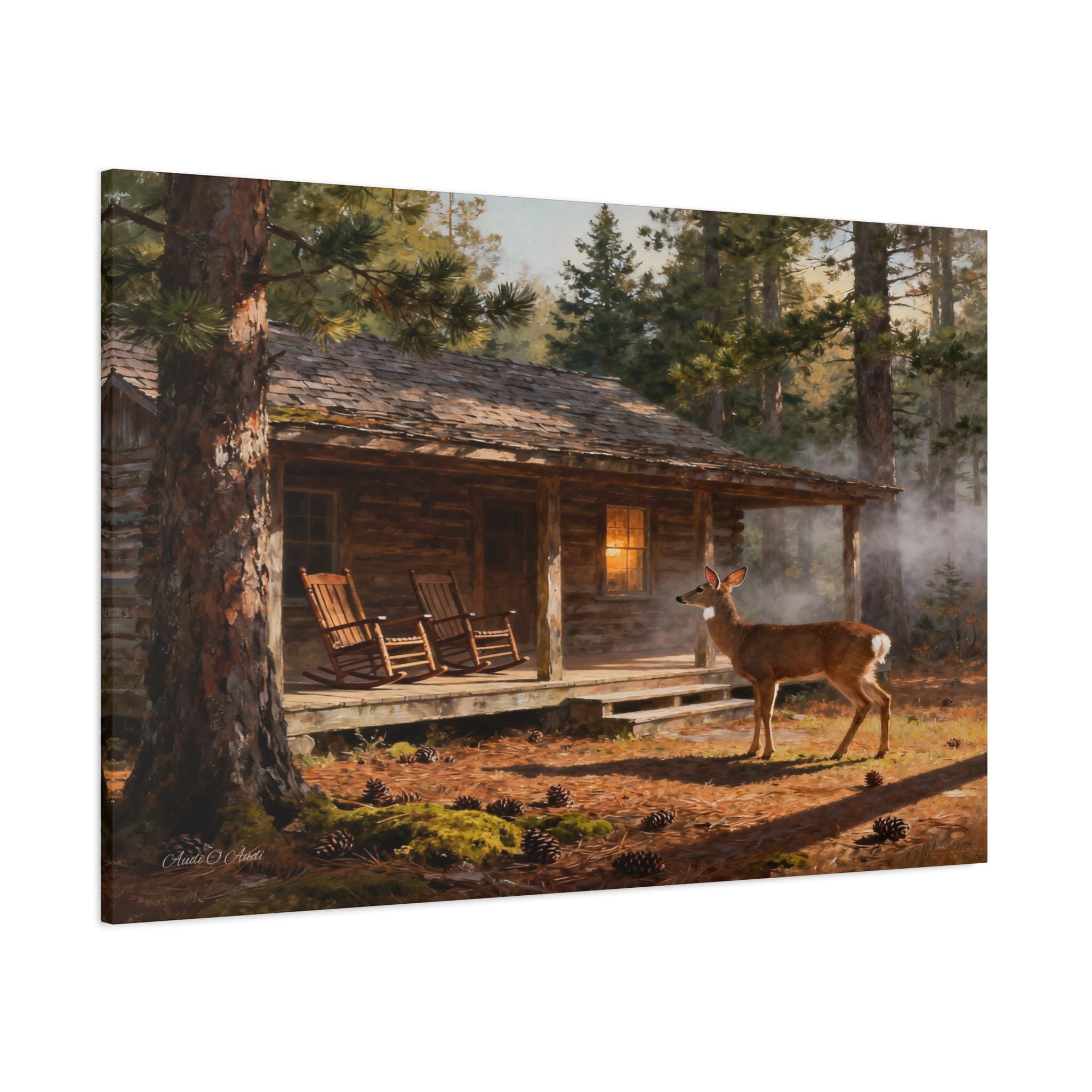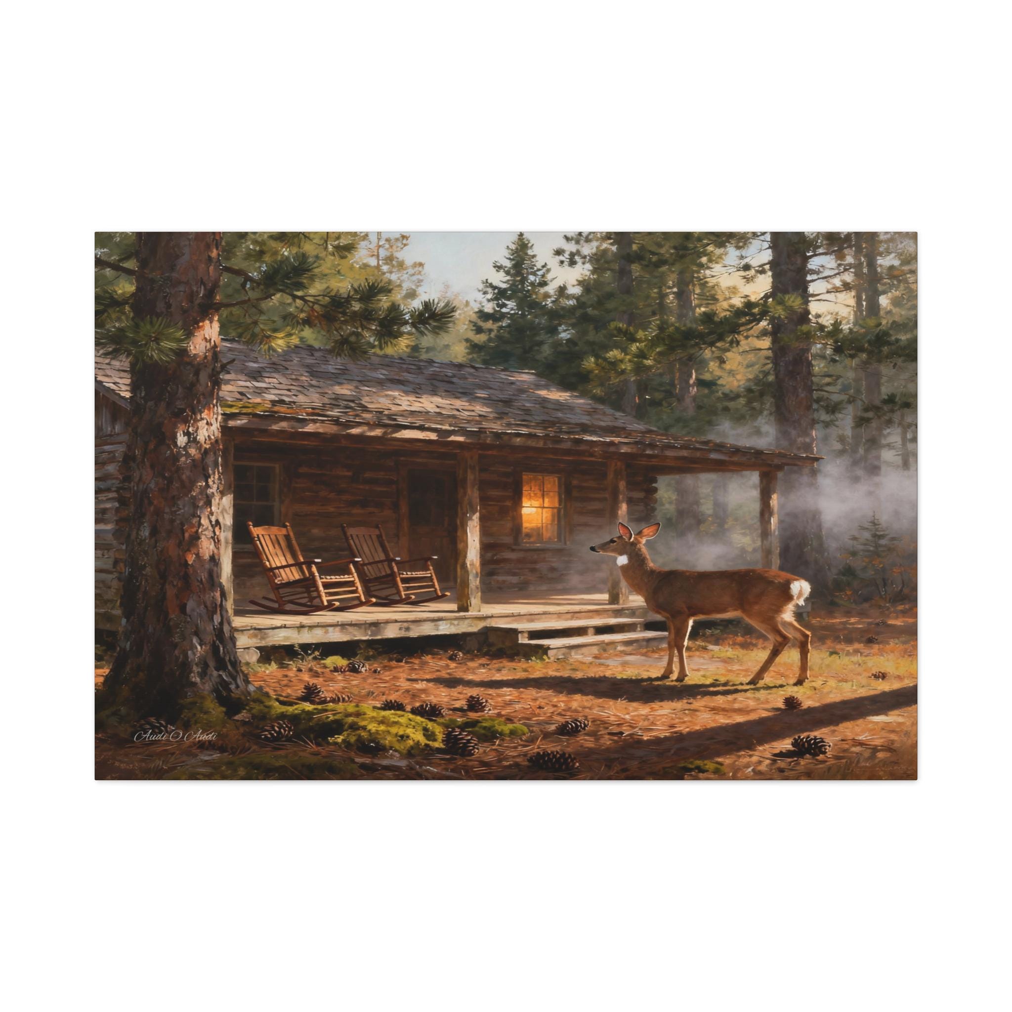 Immerse yourself in the tranquility of the wilderness with this stunning, high-quality canvas print. Titled "Forest Dawn Retreat," this artwork captures a serene, sun-drenched morning outside a cozy, rustic log cabin deep within the woods.