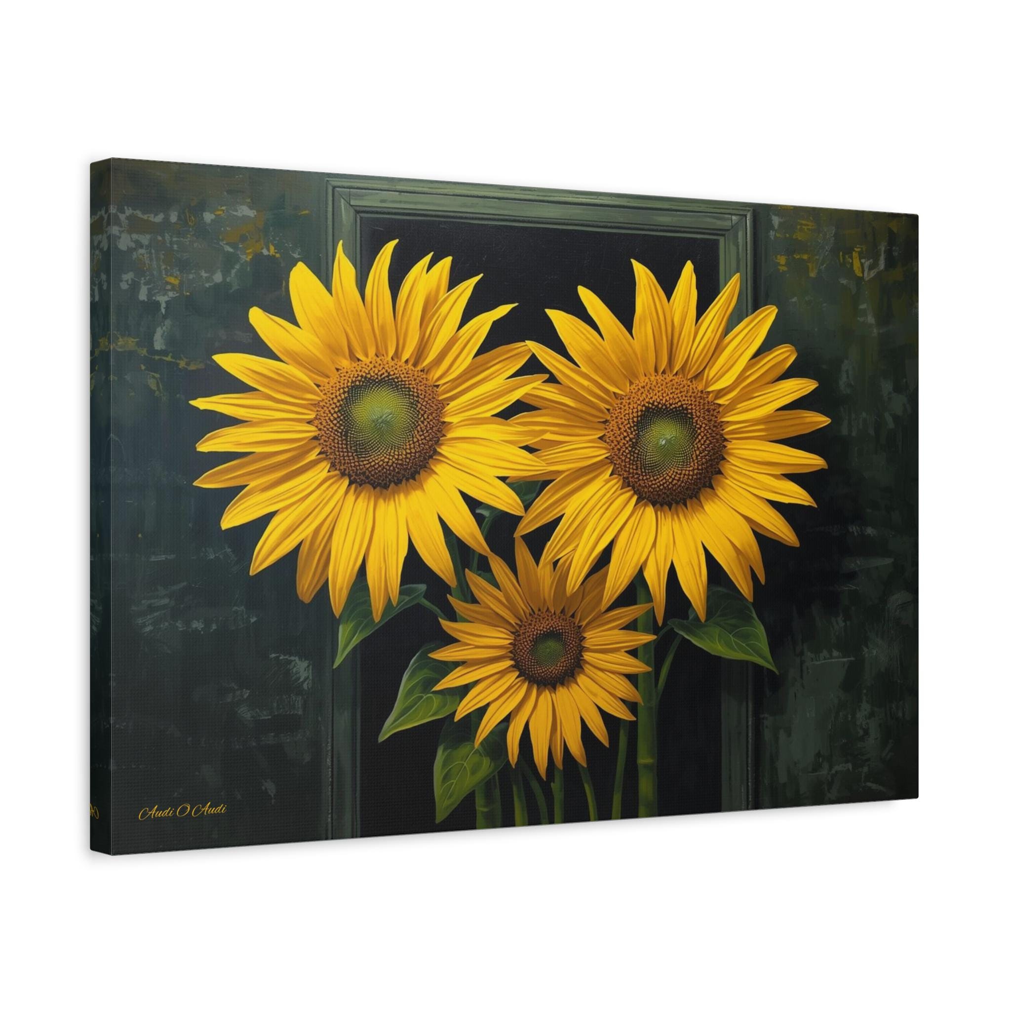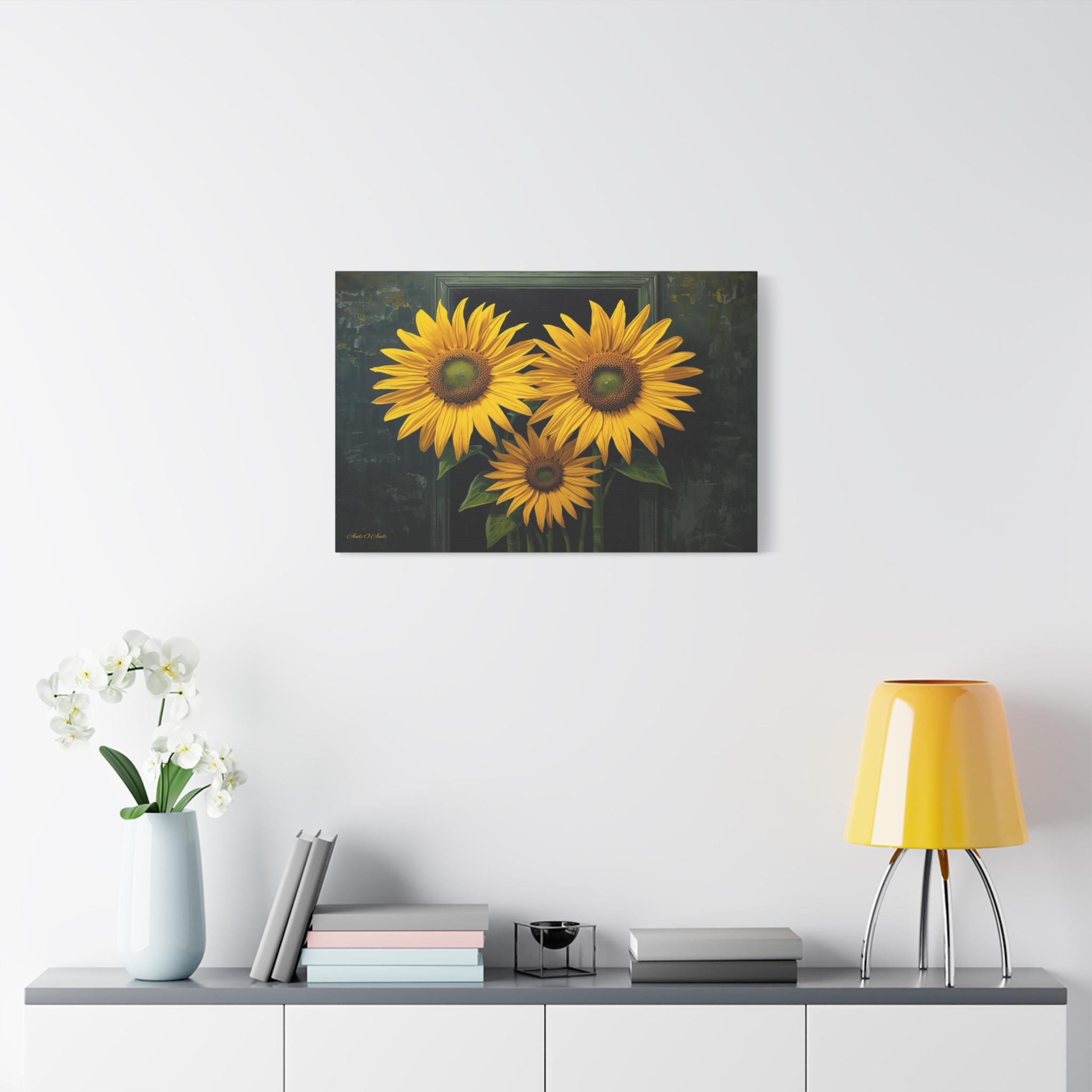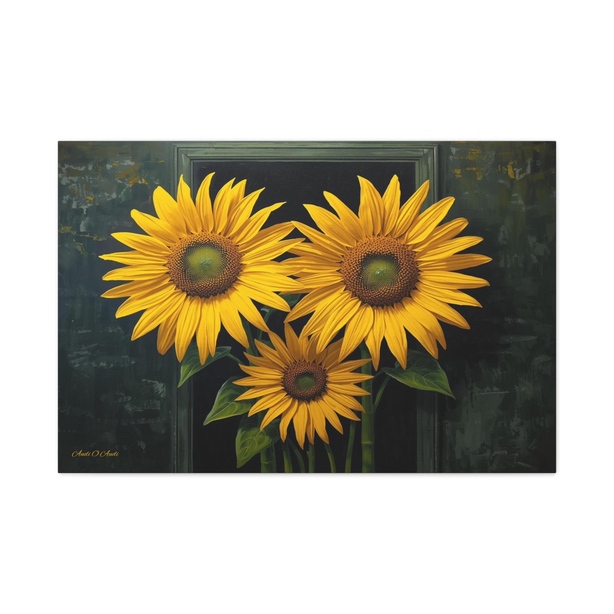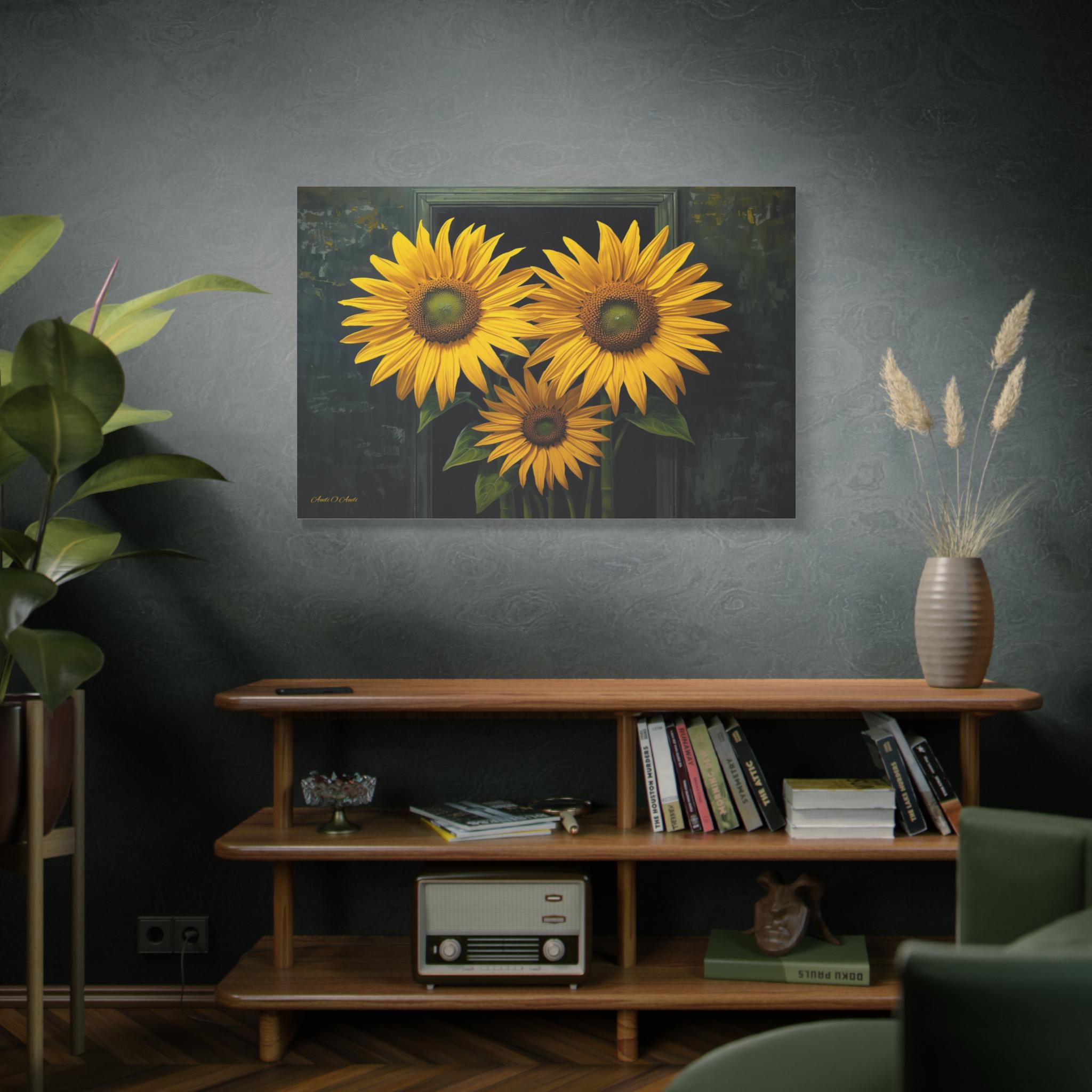 Bring a burst of sophisticated sunshine into your home with this striking sunflower canvas print. This captivating botanical artwork features three monumental, brilliantly yellow sunflowers in full bloom, set against a rich, moody background of deep greens and shadows.
