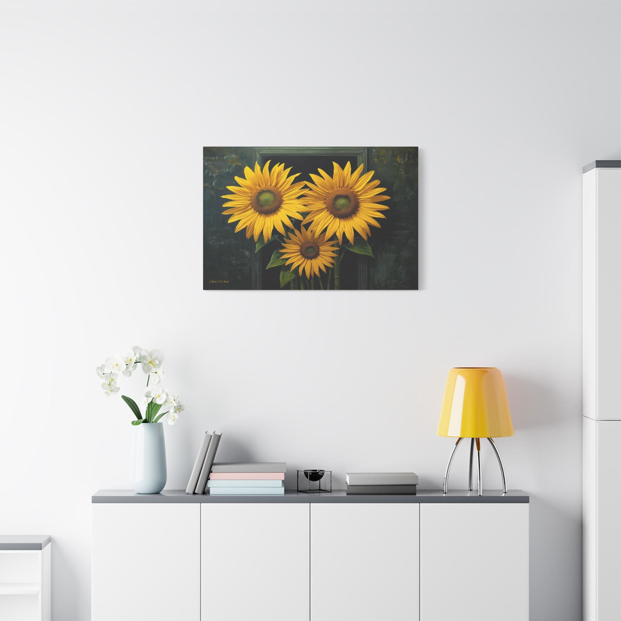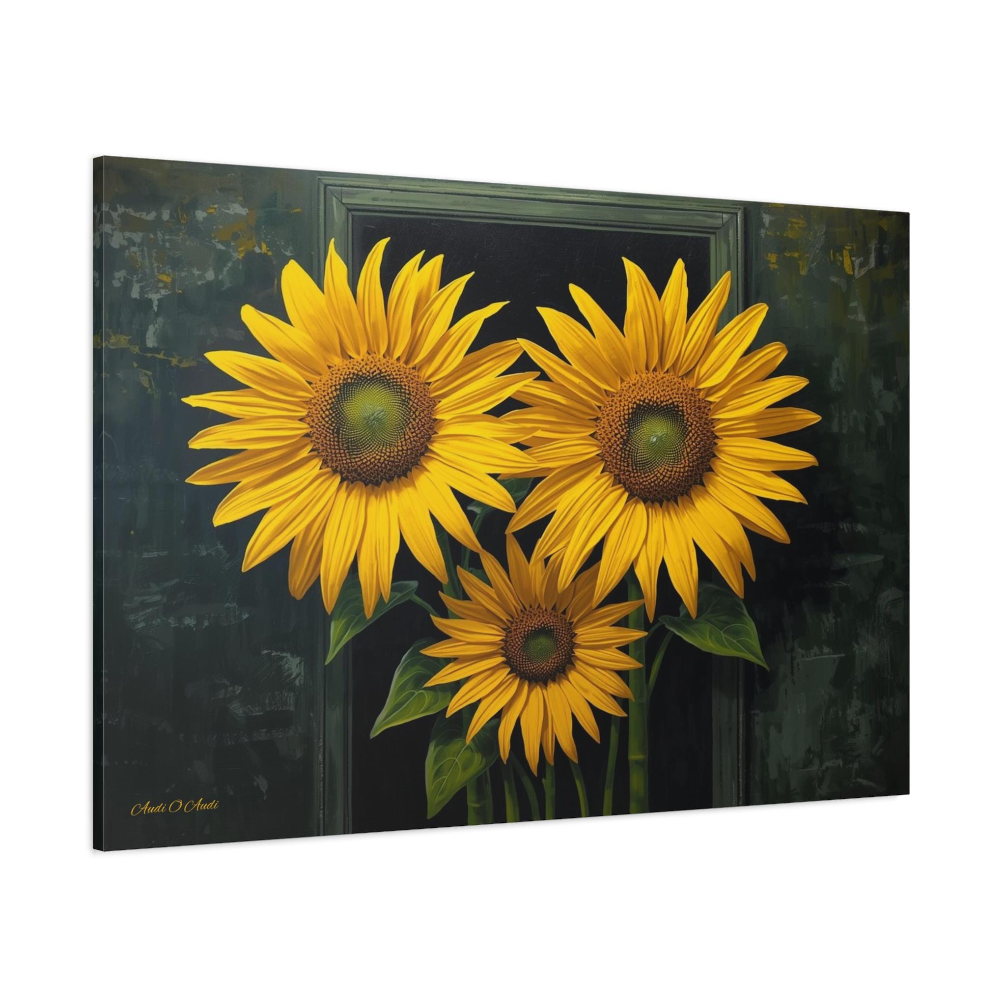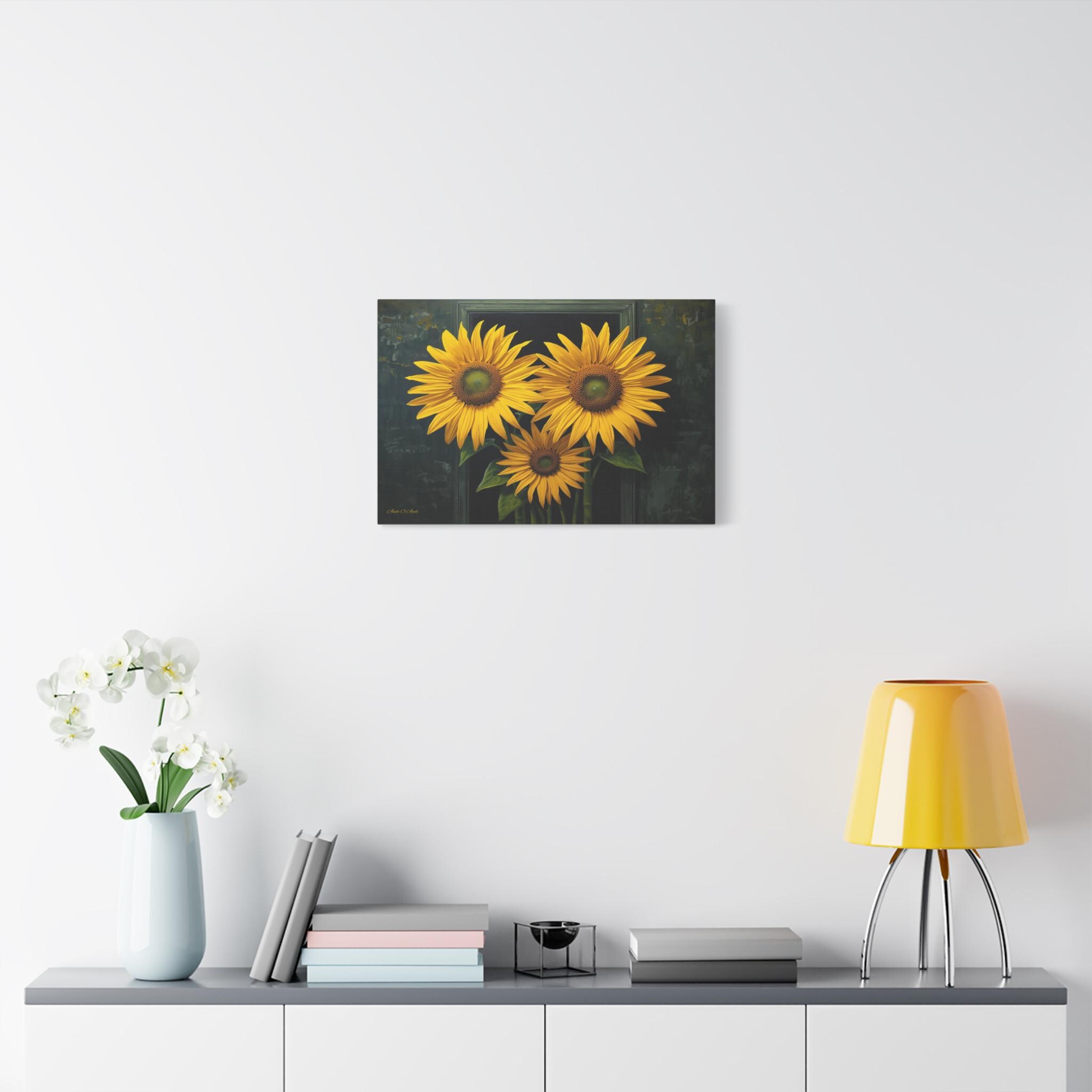 Bring a burst of sophisticated sunshine into your home with this striking sunflower canvas print. This captivating botanical artwork features three monumental, brilliantly yellow sunflowers in full bloom, set against a rich, moody background of deep greens and shadows.
