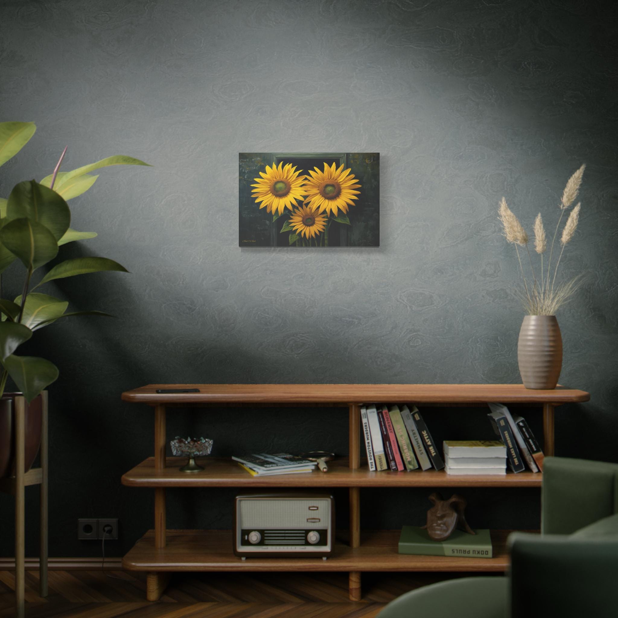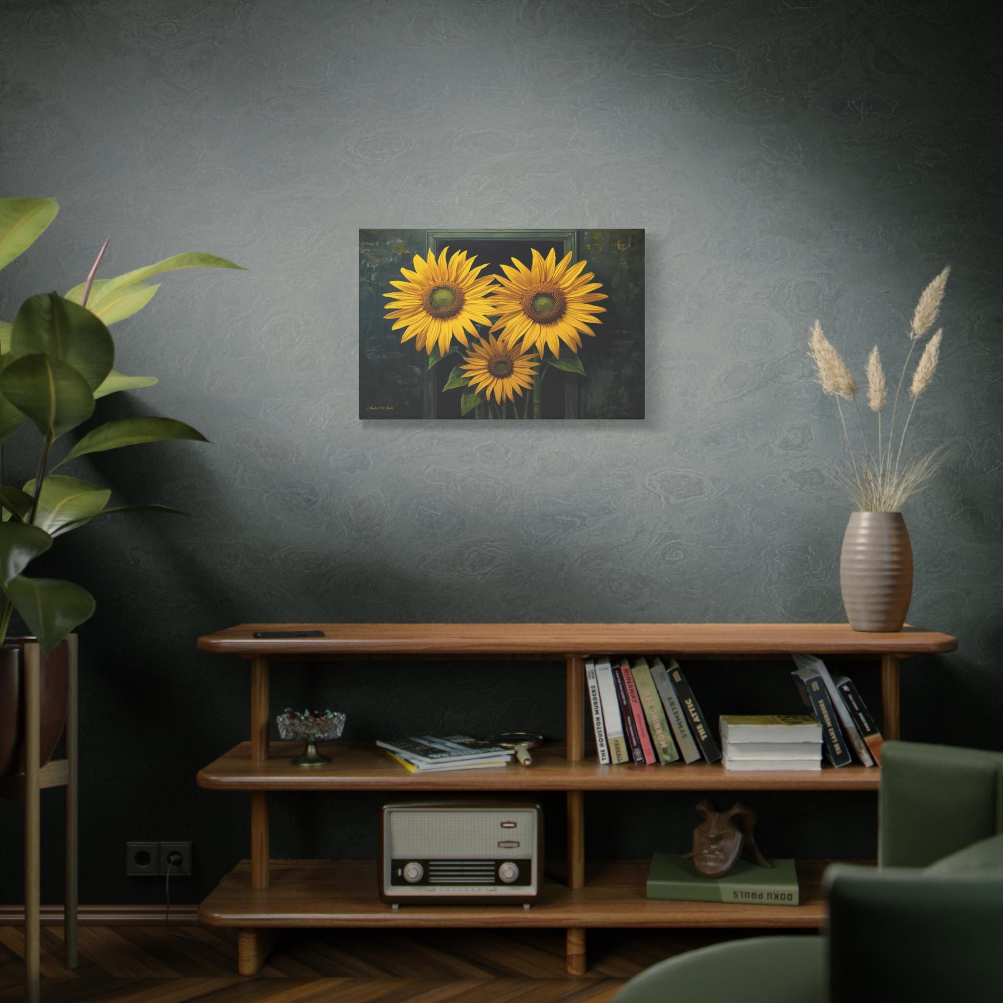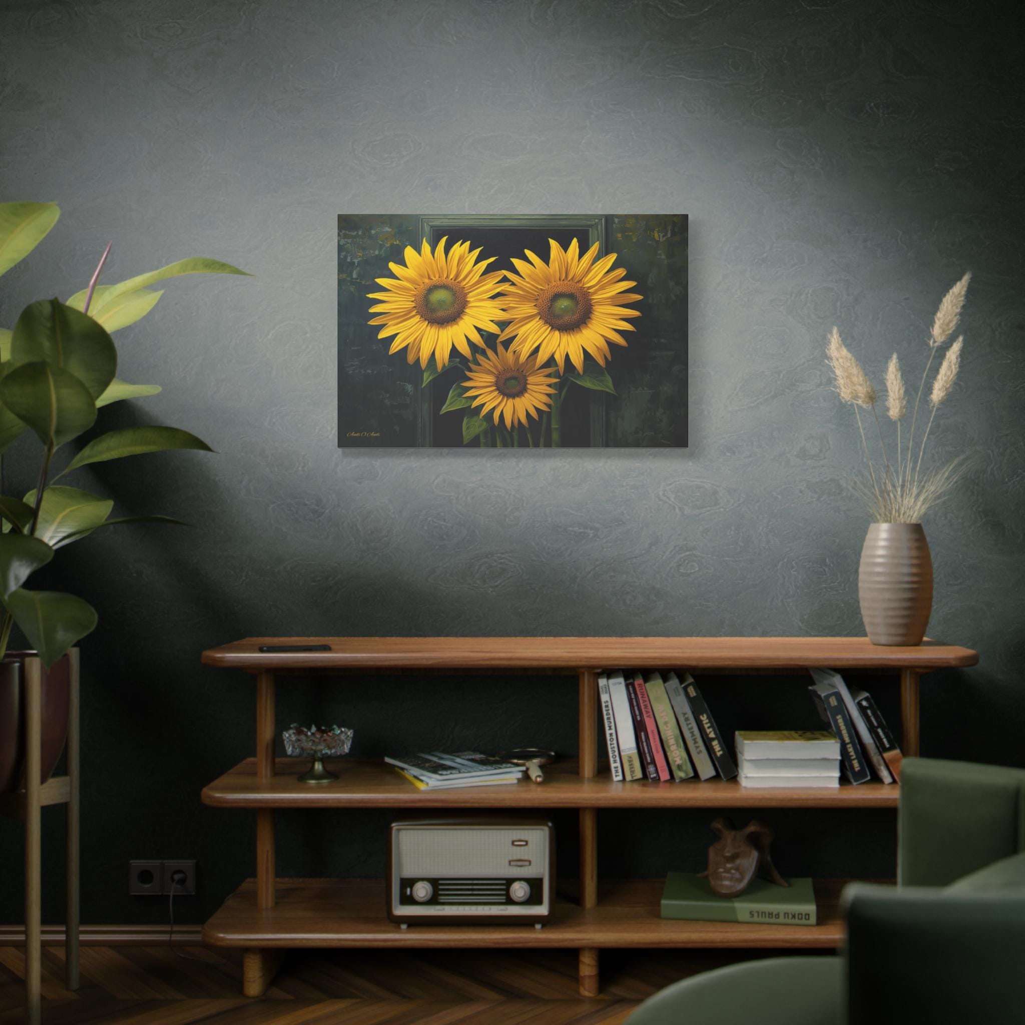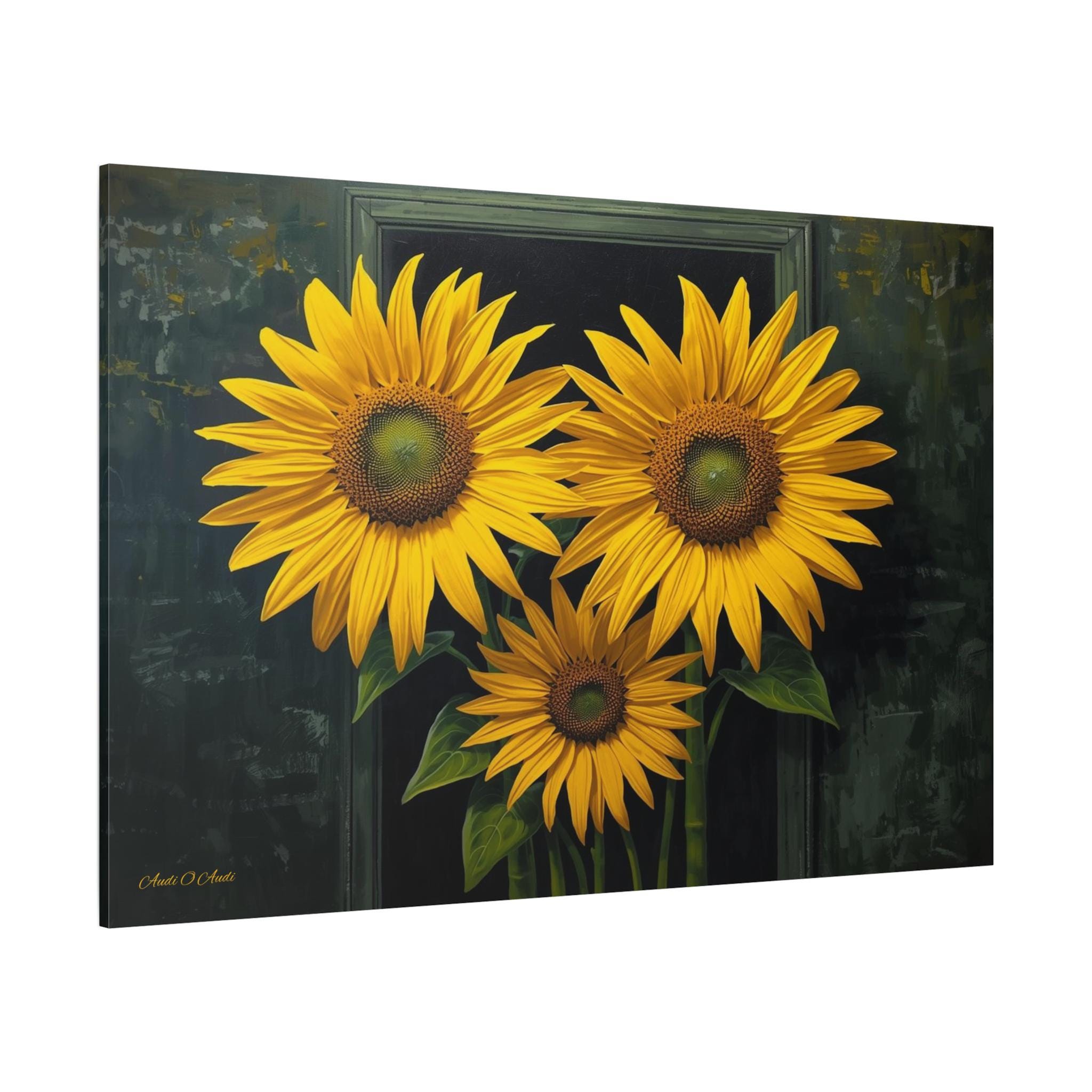 Bring a burst of sophisticated sunshine into your home with this striking sunflower canvas print. This captivating botanical artwork features three monumental, brilliantly yellow sunflowers in full bloom, set against a rich, moody background of deep greens and shadows.