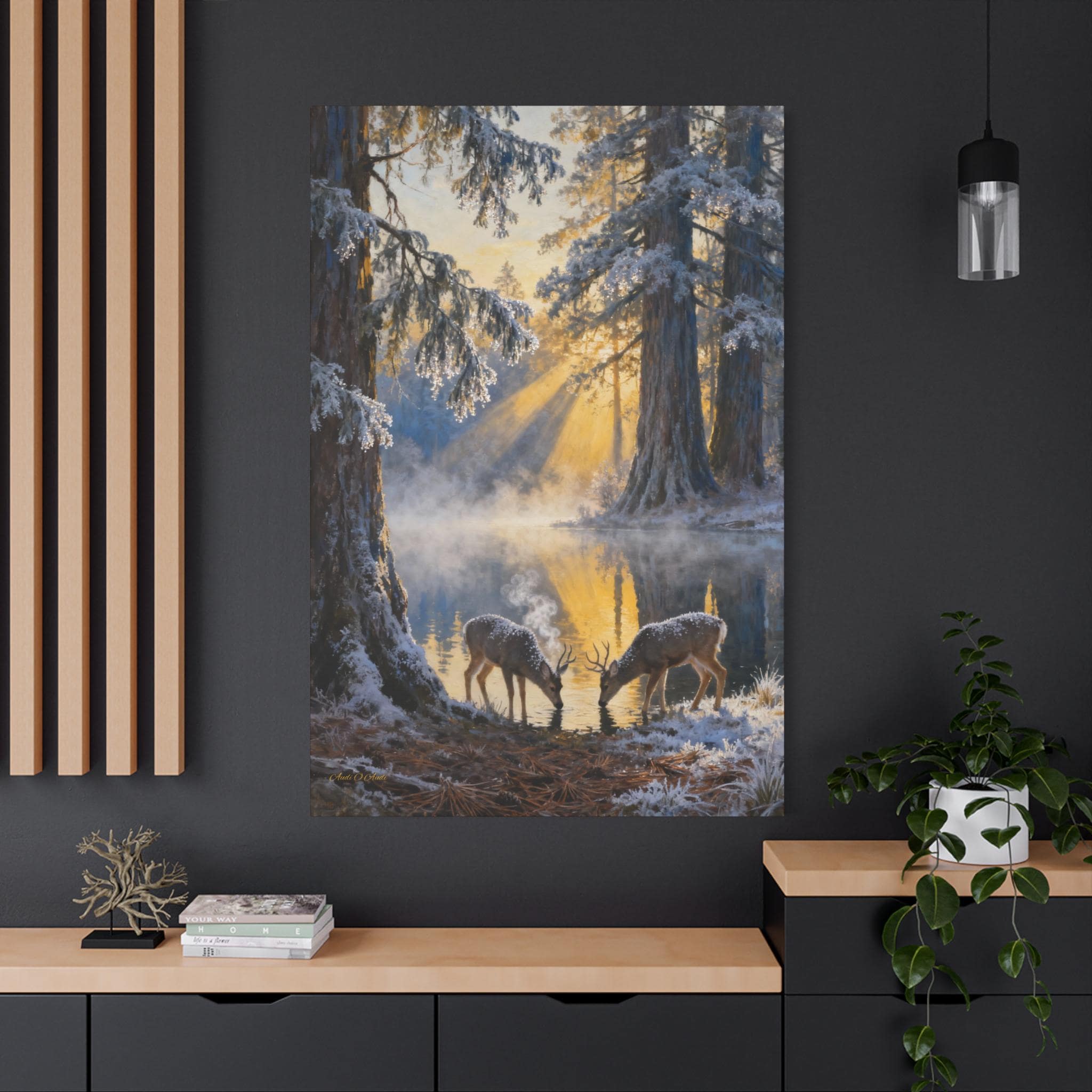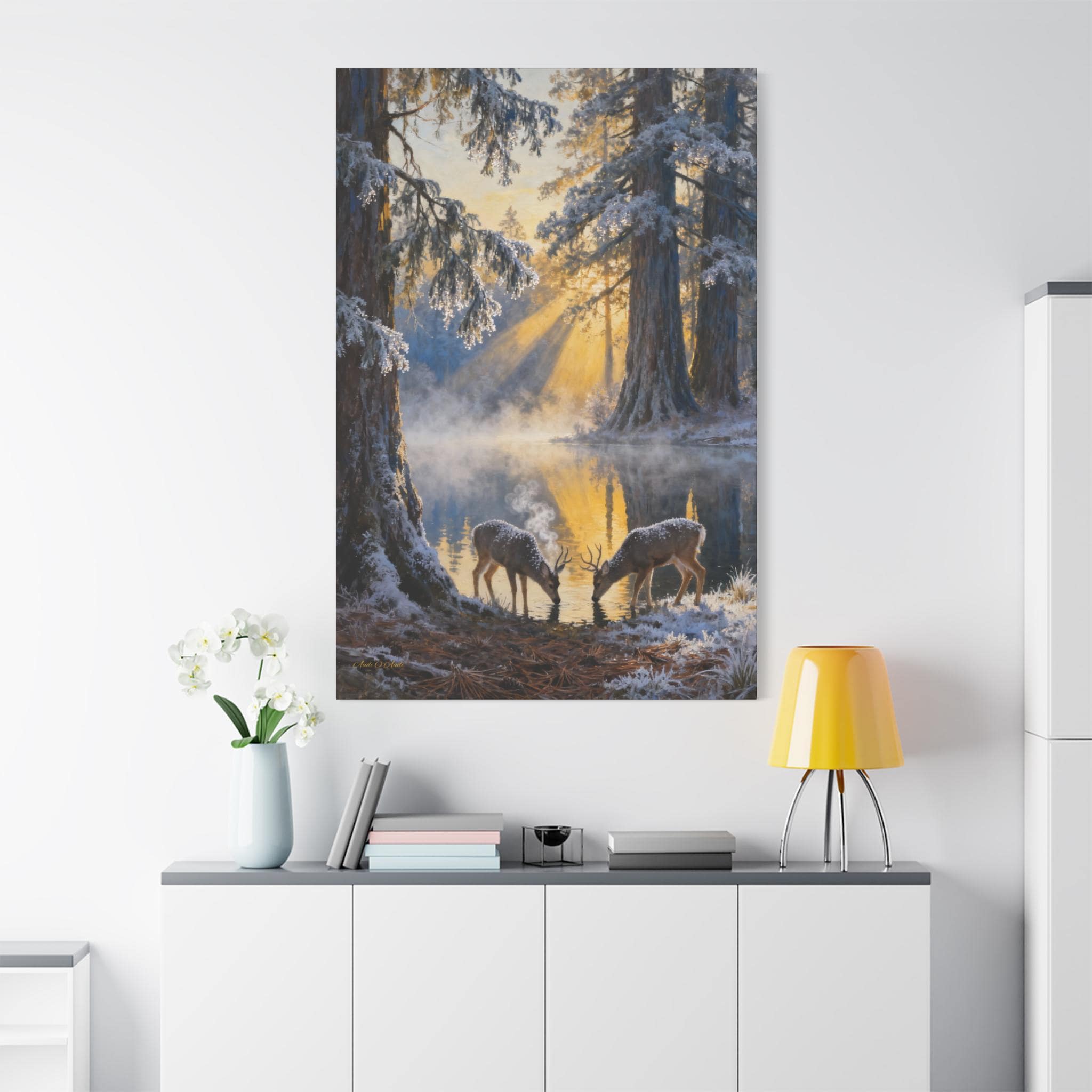Bring the calming and rustic atmosphere of nature into your home with this Frostlight at the Drinking Pool canvas. Perfect for animal lovers and nature enthusiasts, this home decoration adds a touch of wilderness to any room. Ideal for gifting to loved ones who appreciate the beauty of wildlife and the outdoors. Relevant for home decor, gifts for nature lovers, birthdays, housewarmings, and holidays.