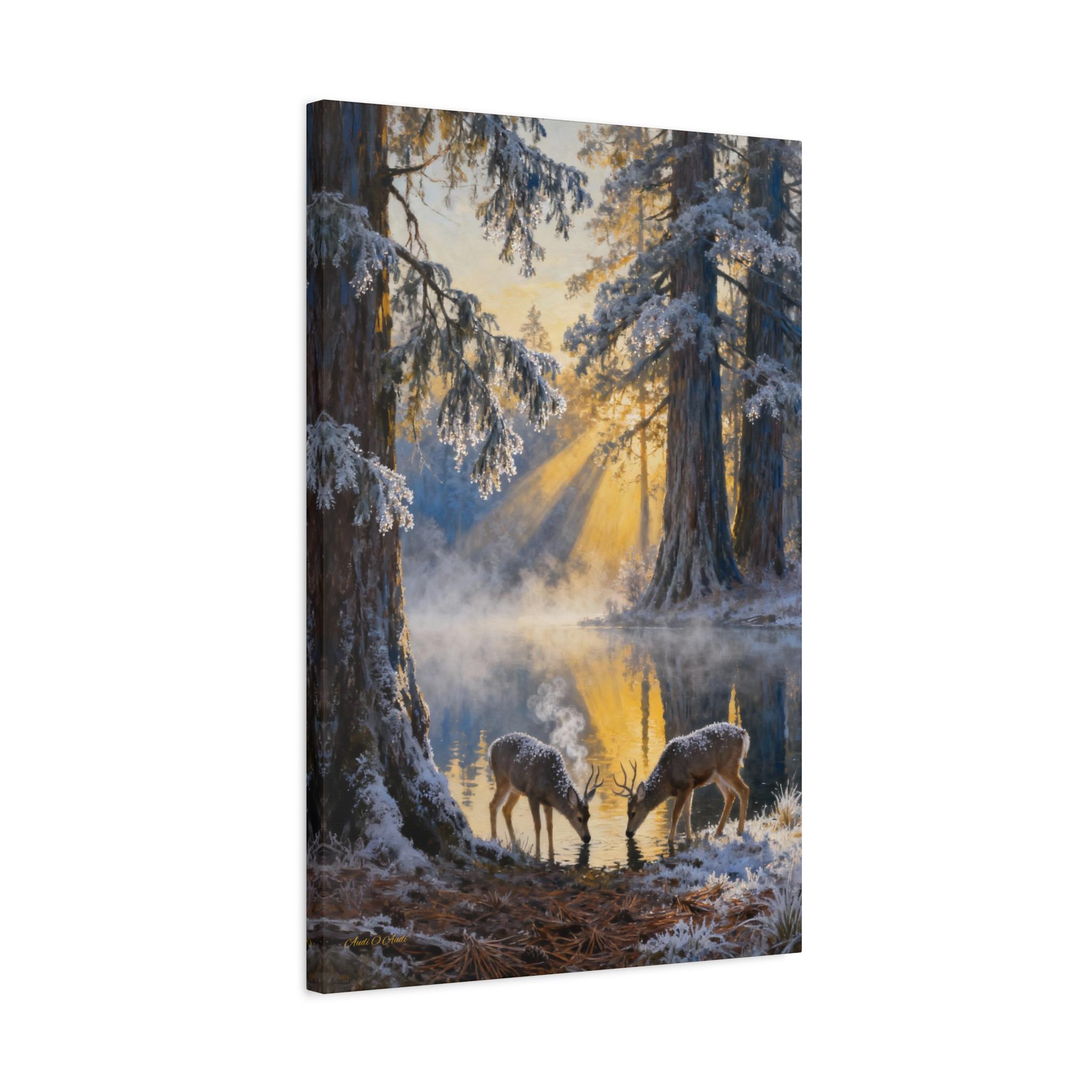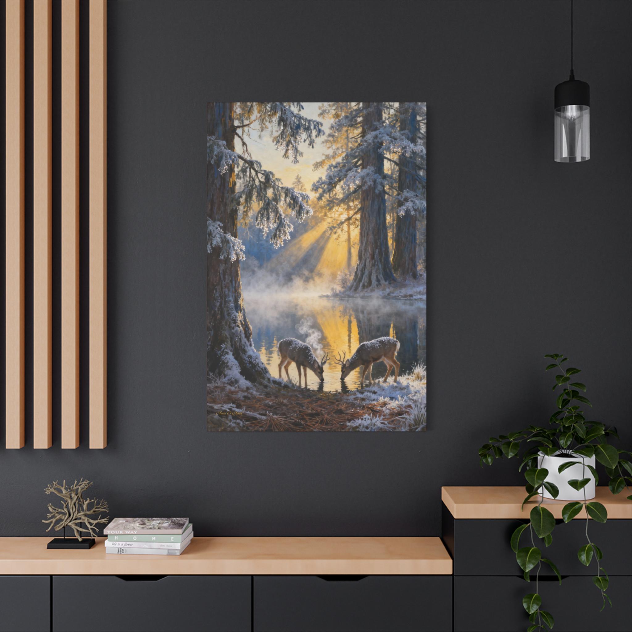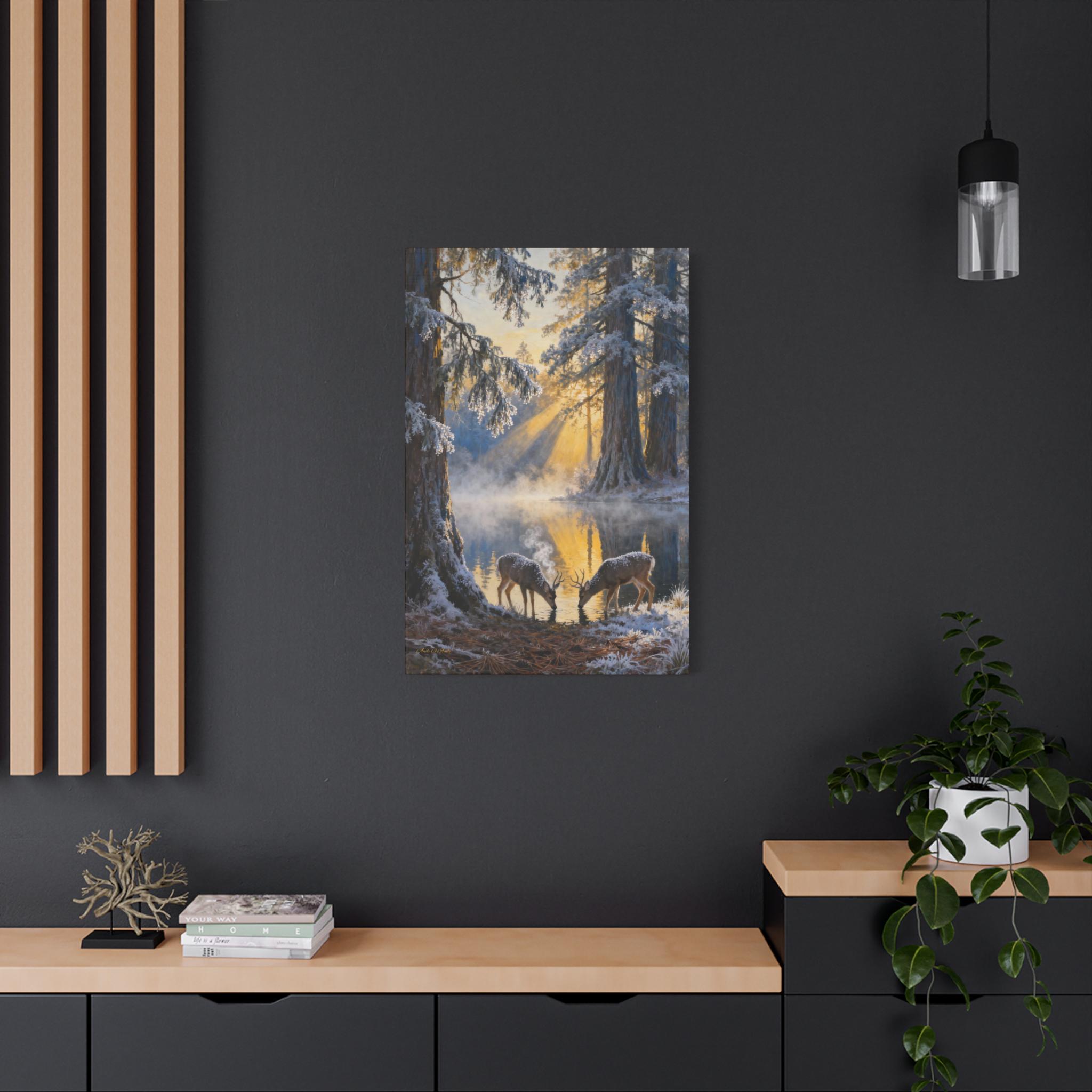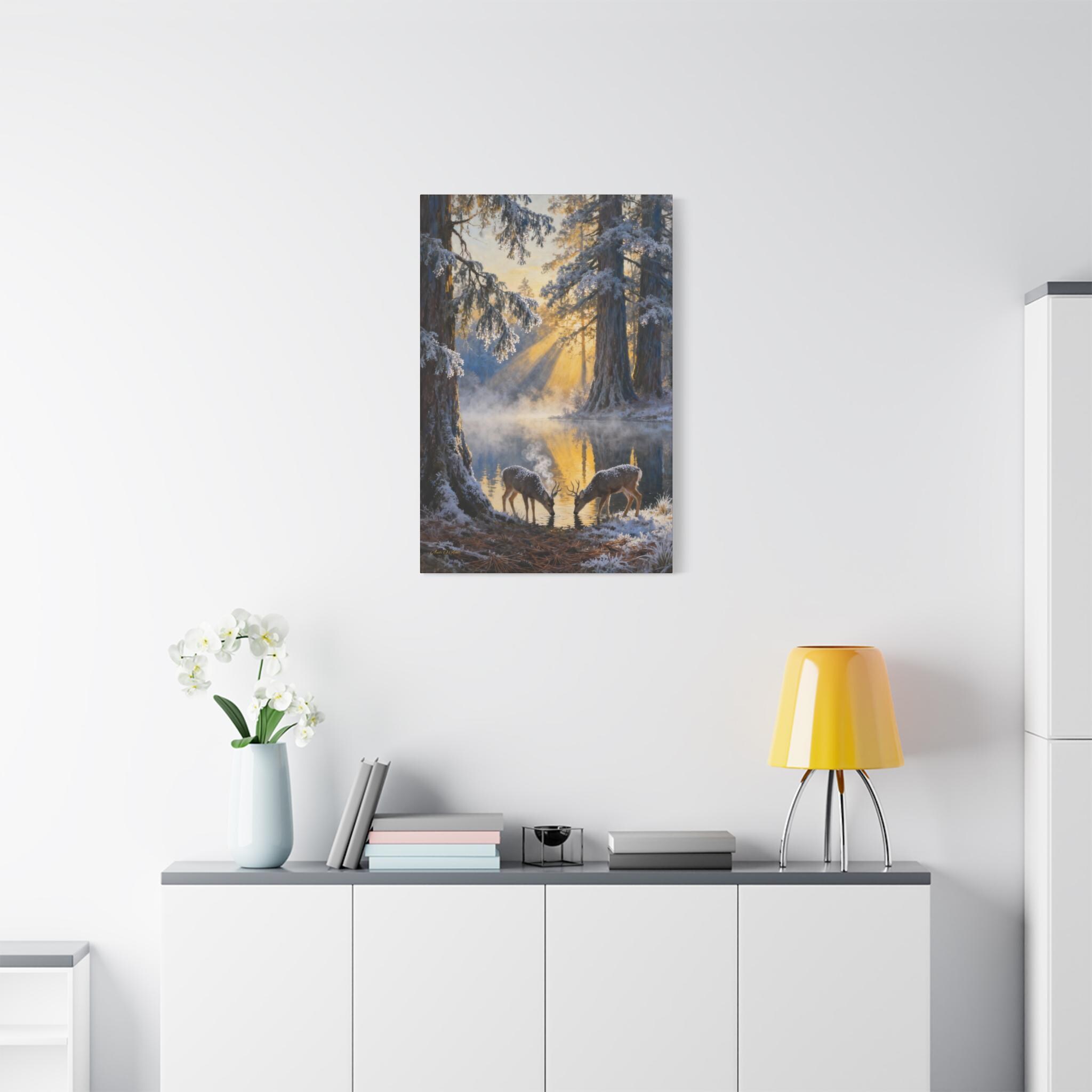 Frostlight at the Drinking Pool, Nature Decor, Rustic Home Decoration, Animal Lovers Gift, Stretched Matte Canvas. Size 40"X60"