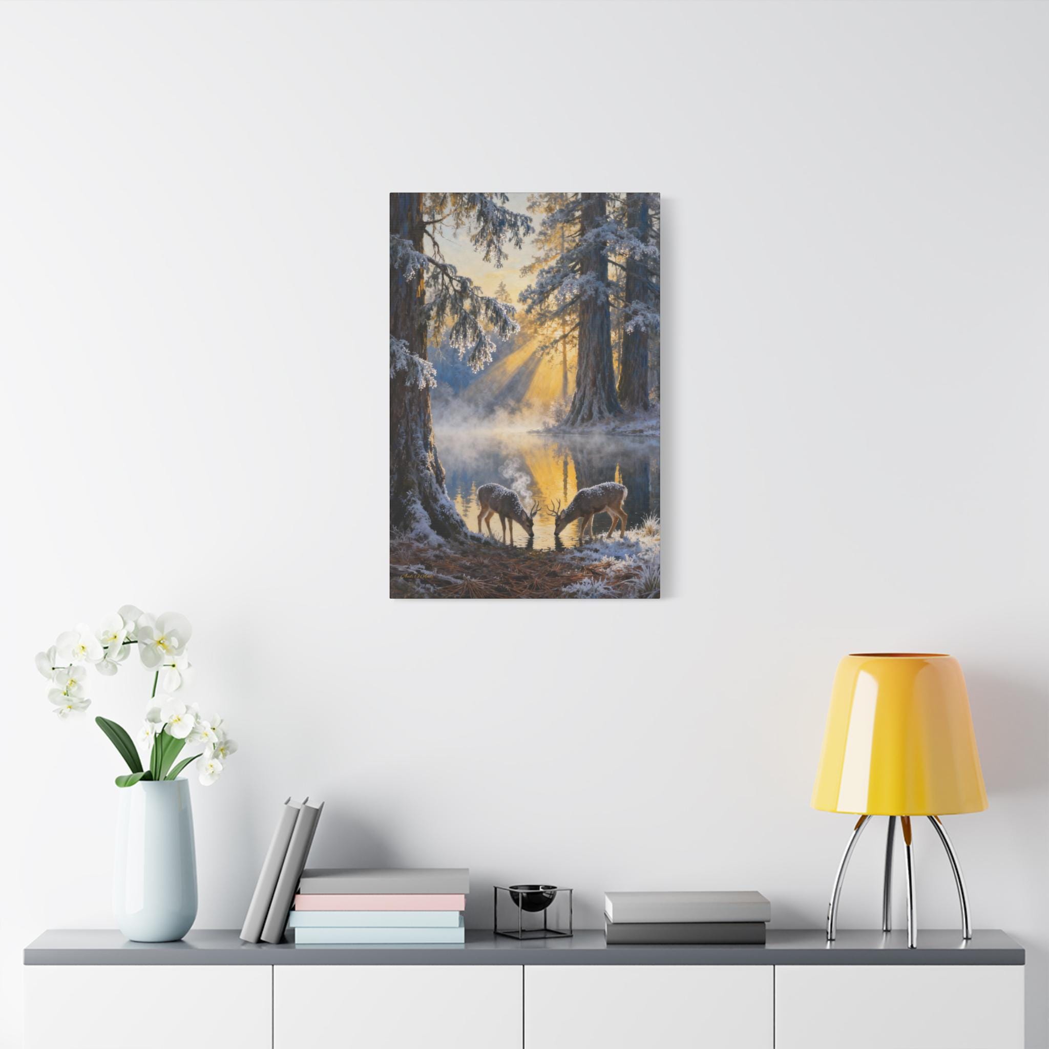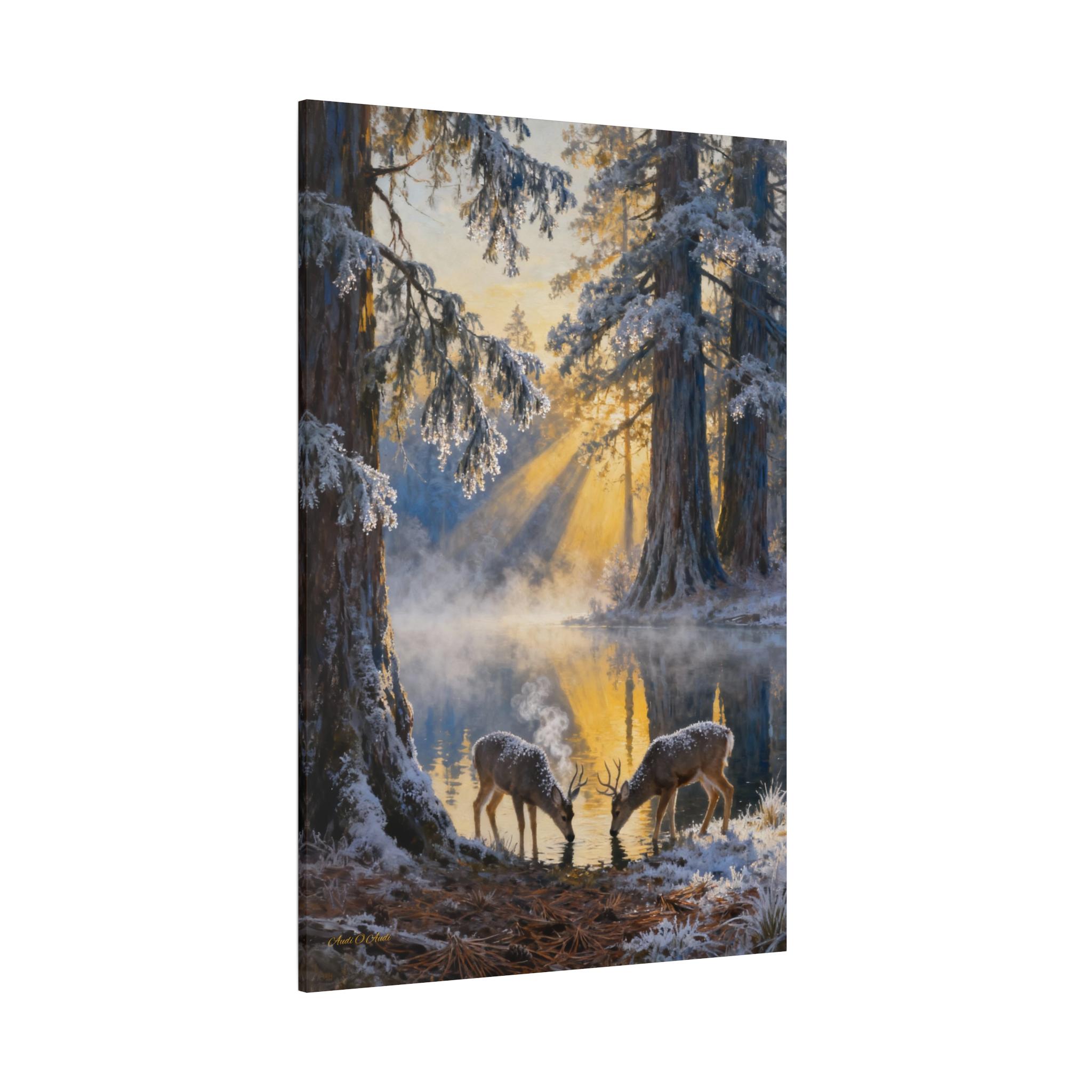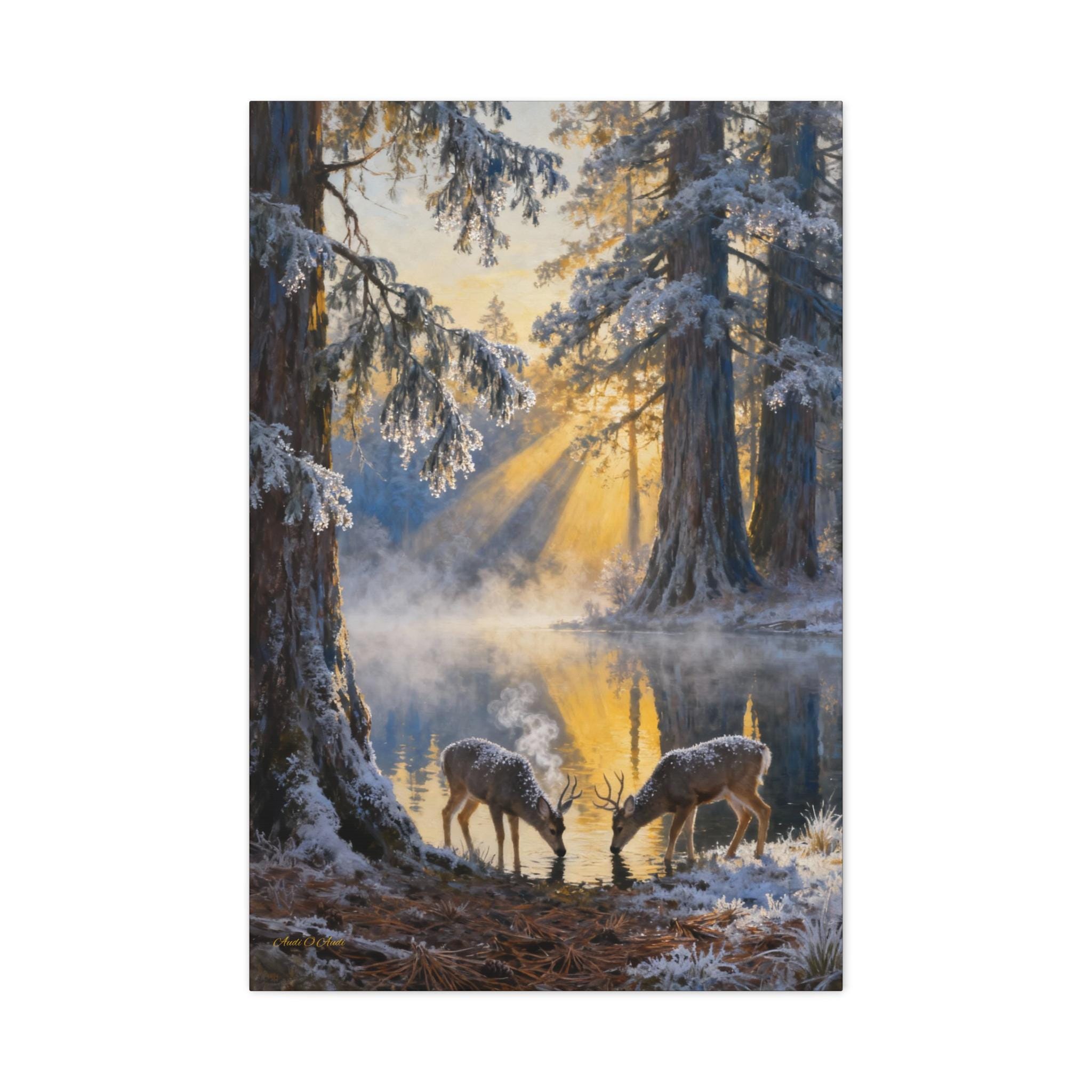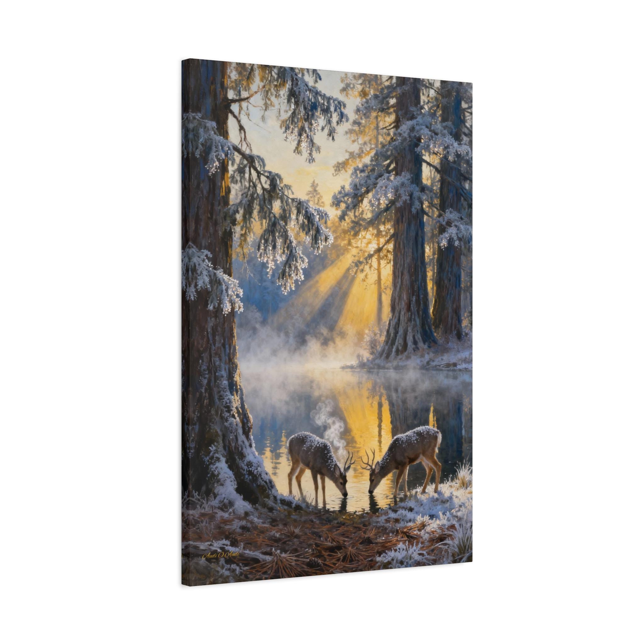 Frostlight at the Drinking Pool, Nature Decor, Rustic Home Decoration, Animal Lovers Gift, Stretched Matte Canvas. Size 40"X60"