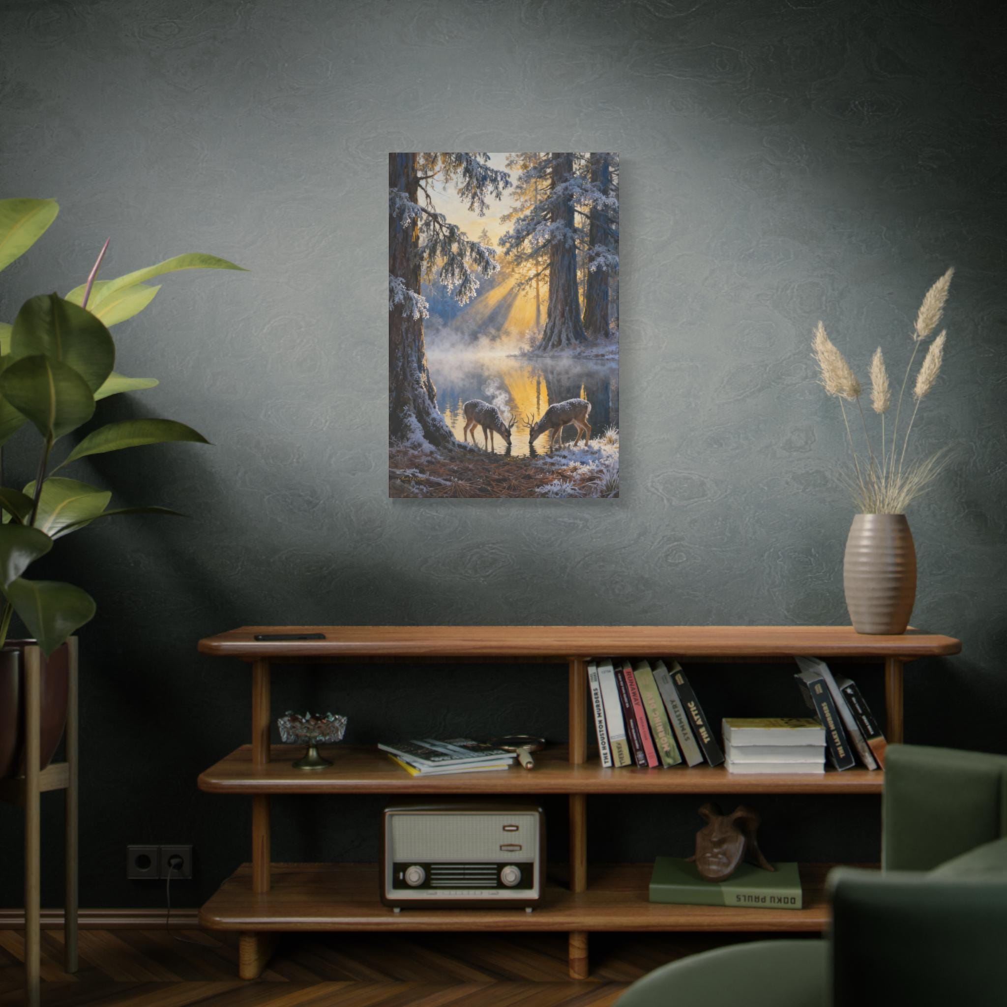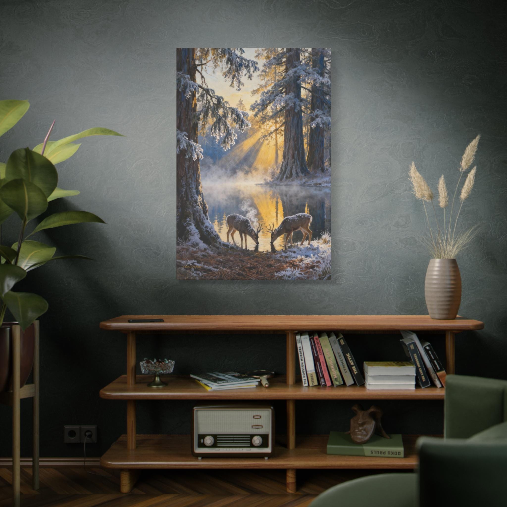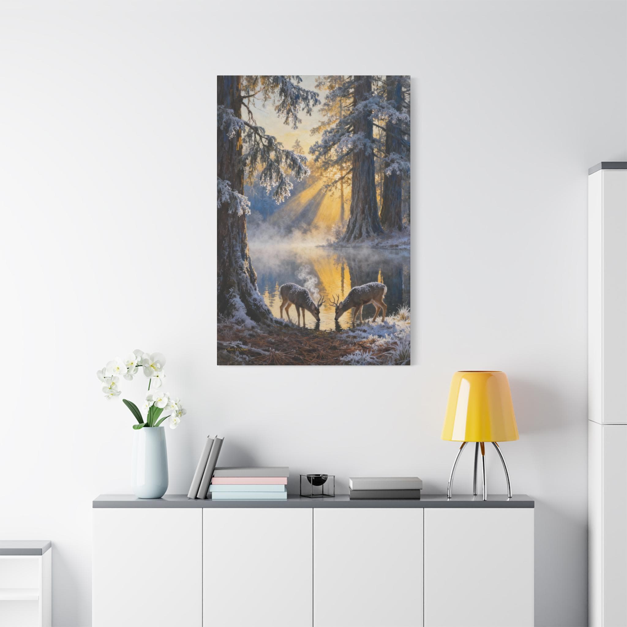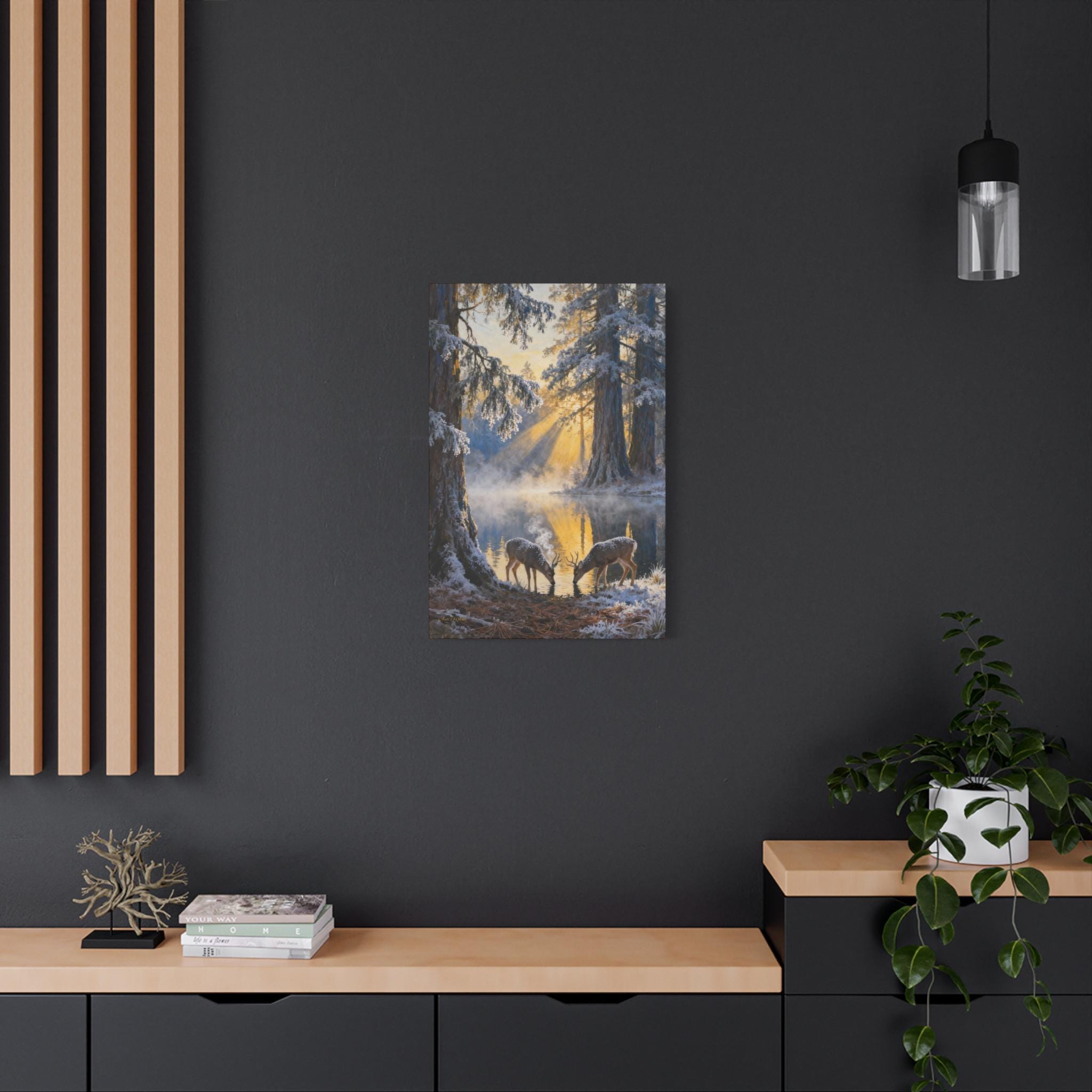 Frostlight at the Drinking Pool, Nature Decor, Rustic Home Decoration, Animal Lovers Gift, Stretched Matte Canvas. Size 40"X60"