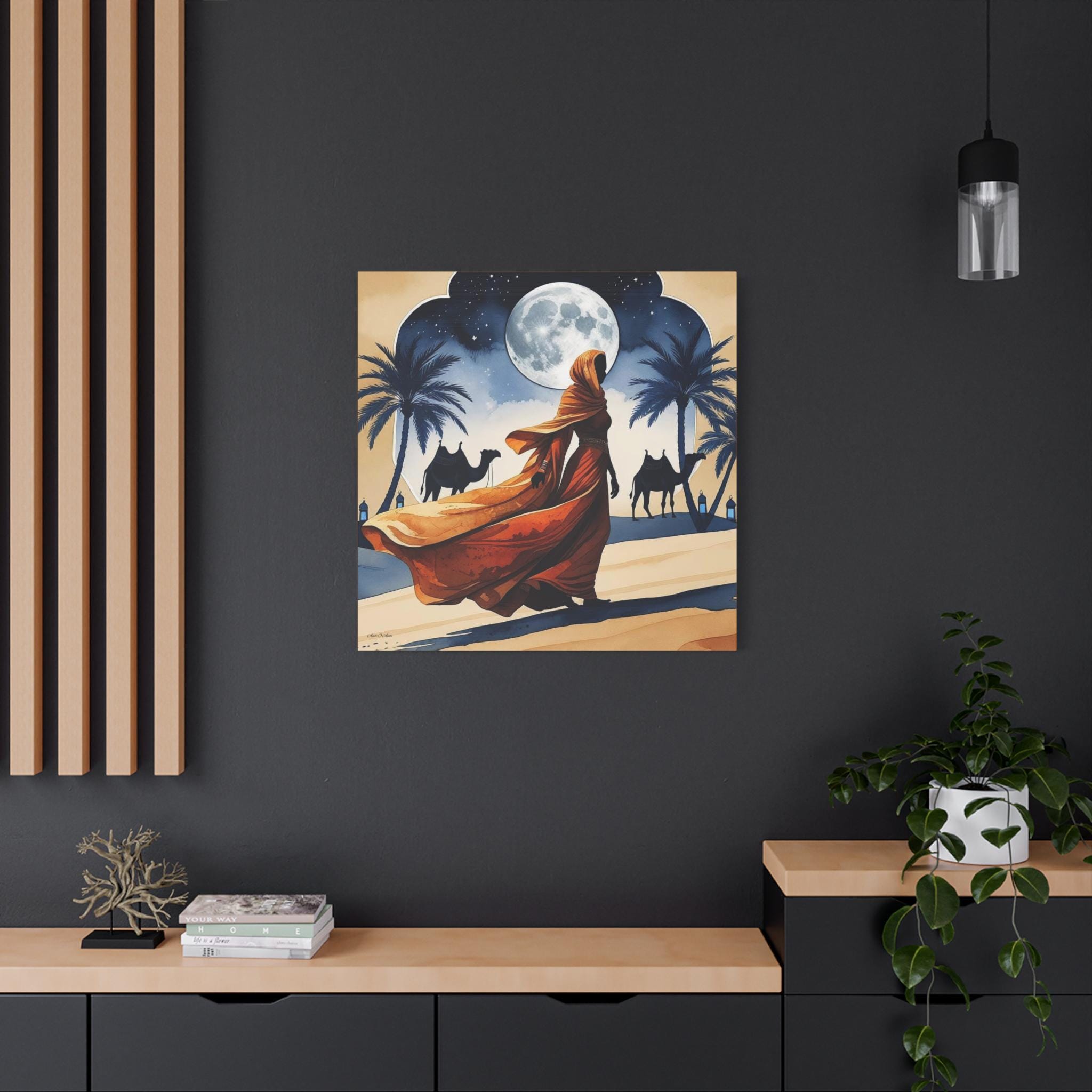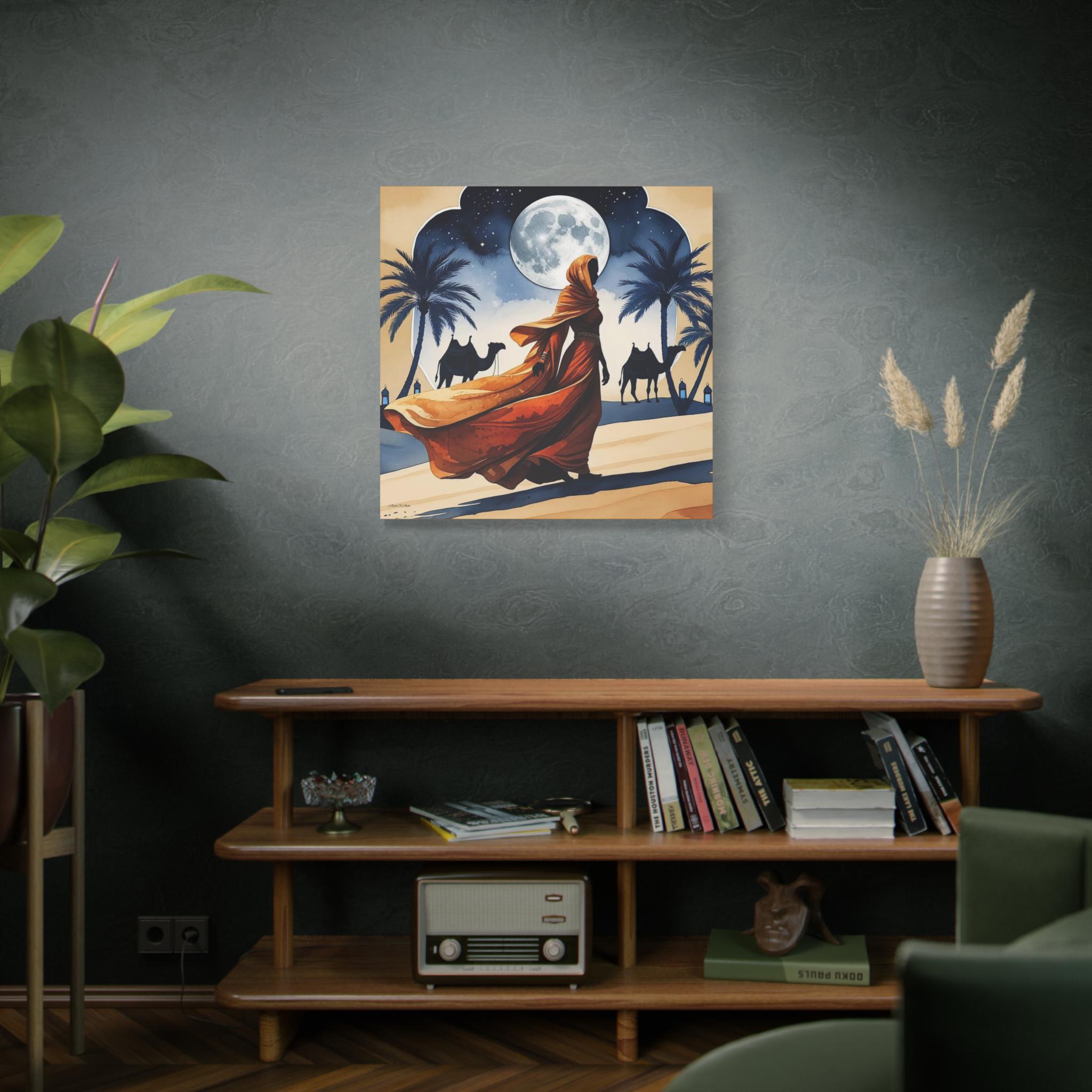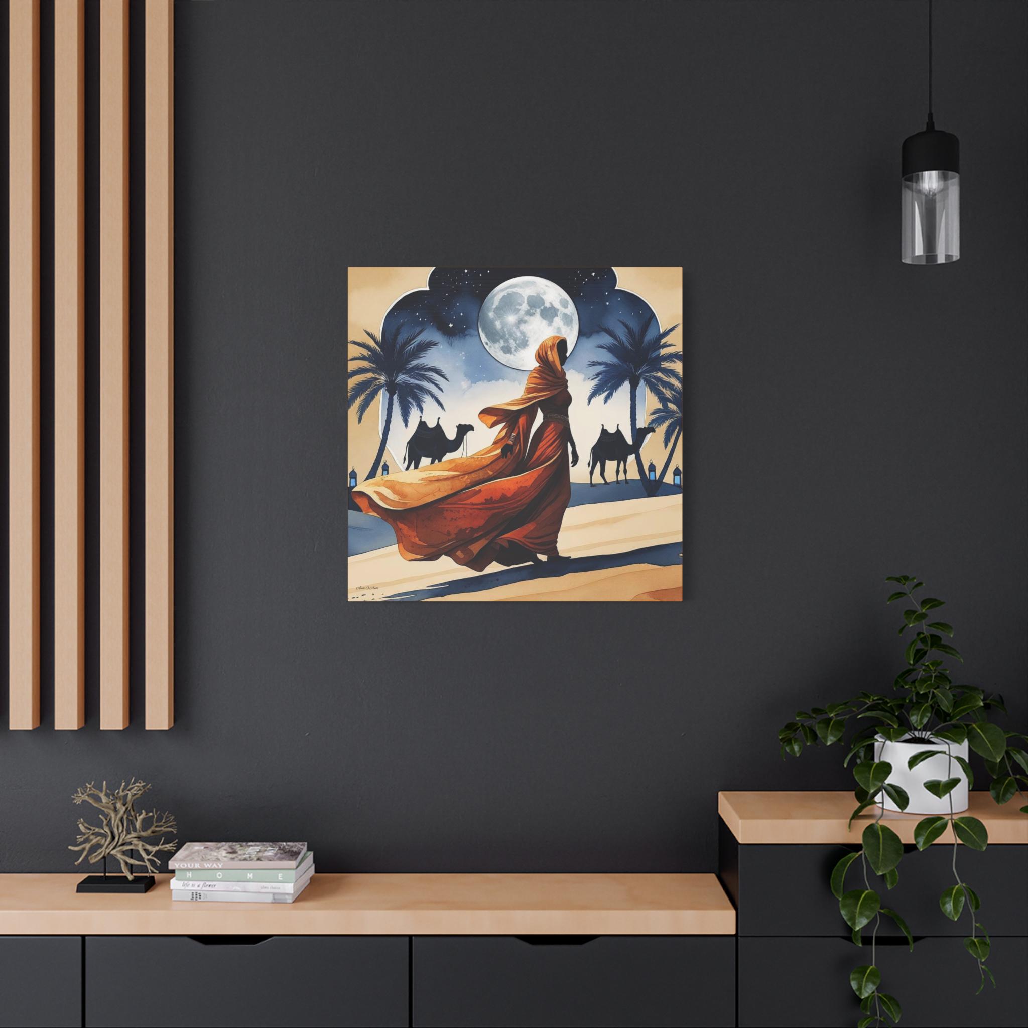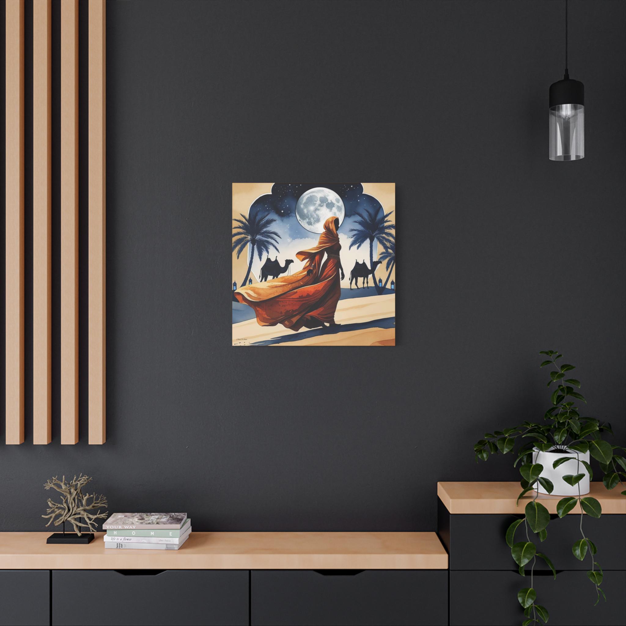 Command attention with this atmospheric canvas print that transports you to a mystical desert night. "Sentinel of the Crescent Moon" captures a solitary, cloaked figure traversing moonlit dunes, their fiery red robes flowing against the cool desert air, framed by silhouettes of camels and palm trees.