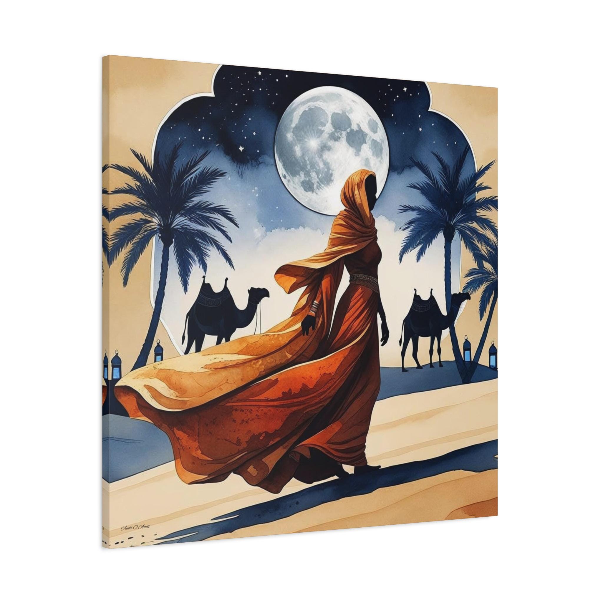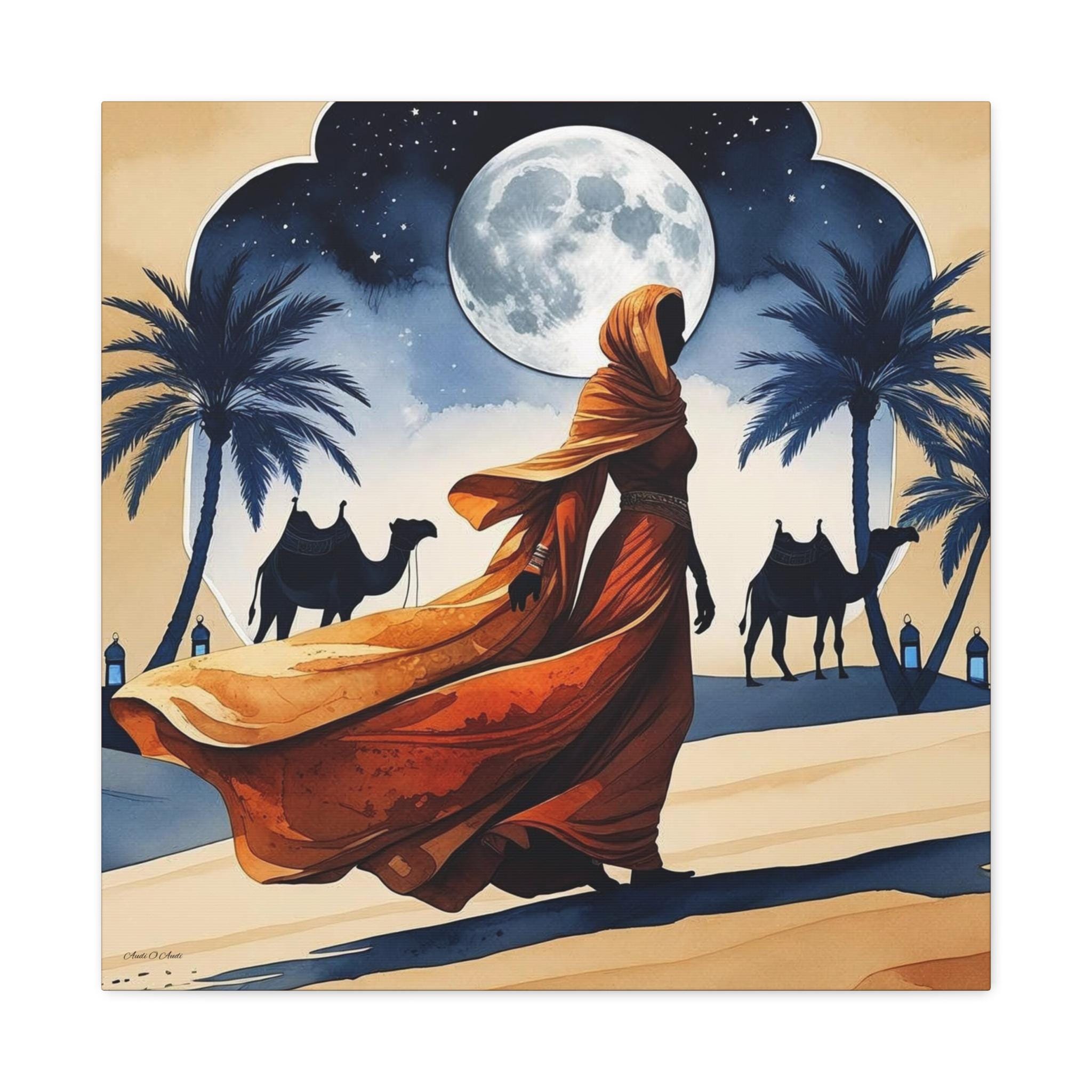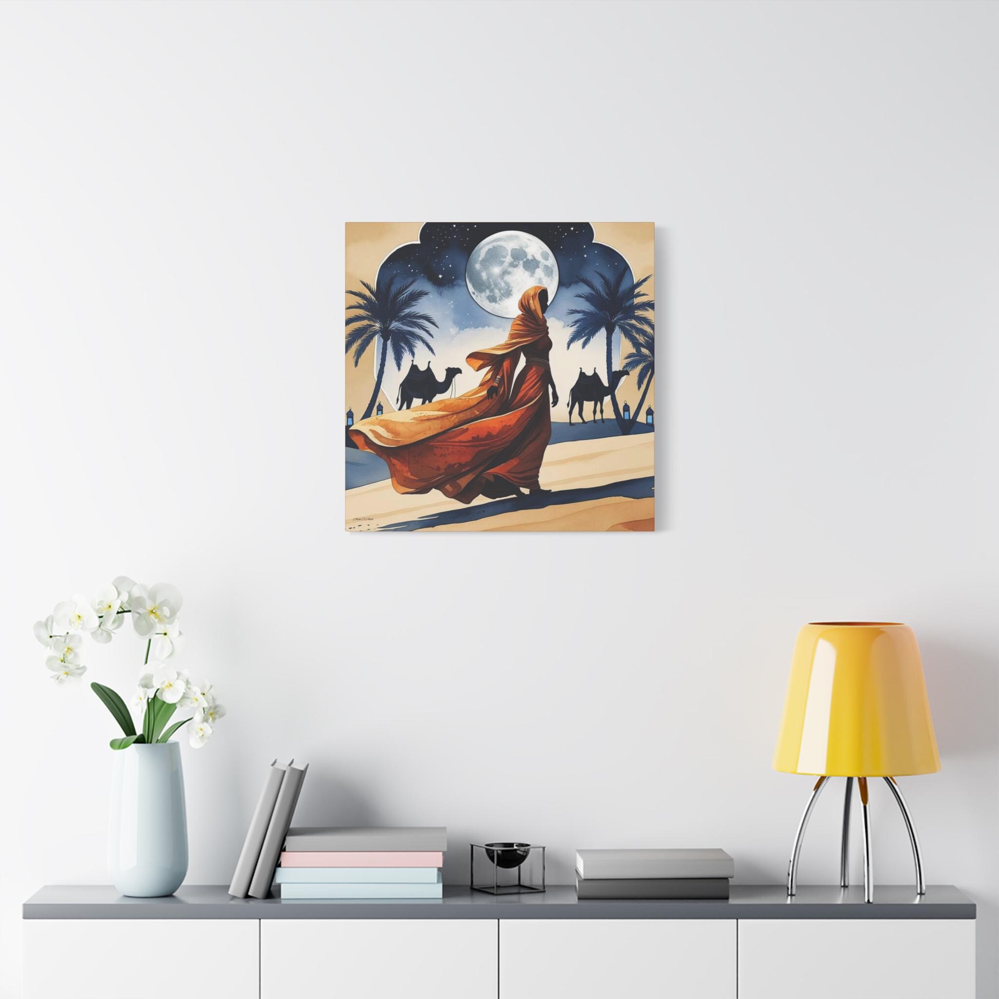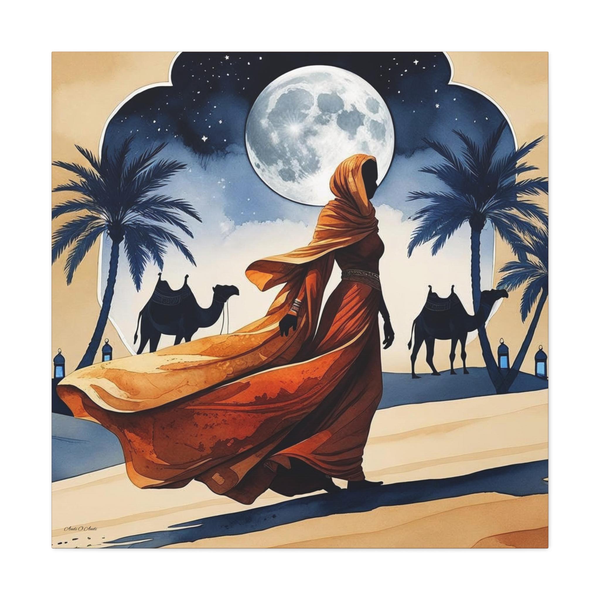 Command attention with this atmospheric canvas print that transports you to a mystical desert night. "Sentinel of the Crescent Moon" captures a solitary, cloaked figure traversing moonlit dunes, their fiery red robes flowing against the cool desert air, framed by silhouettes of camels and palm trees.