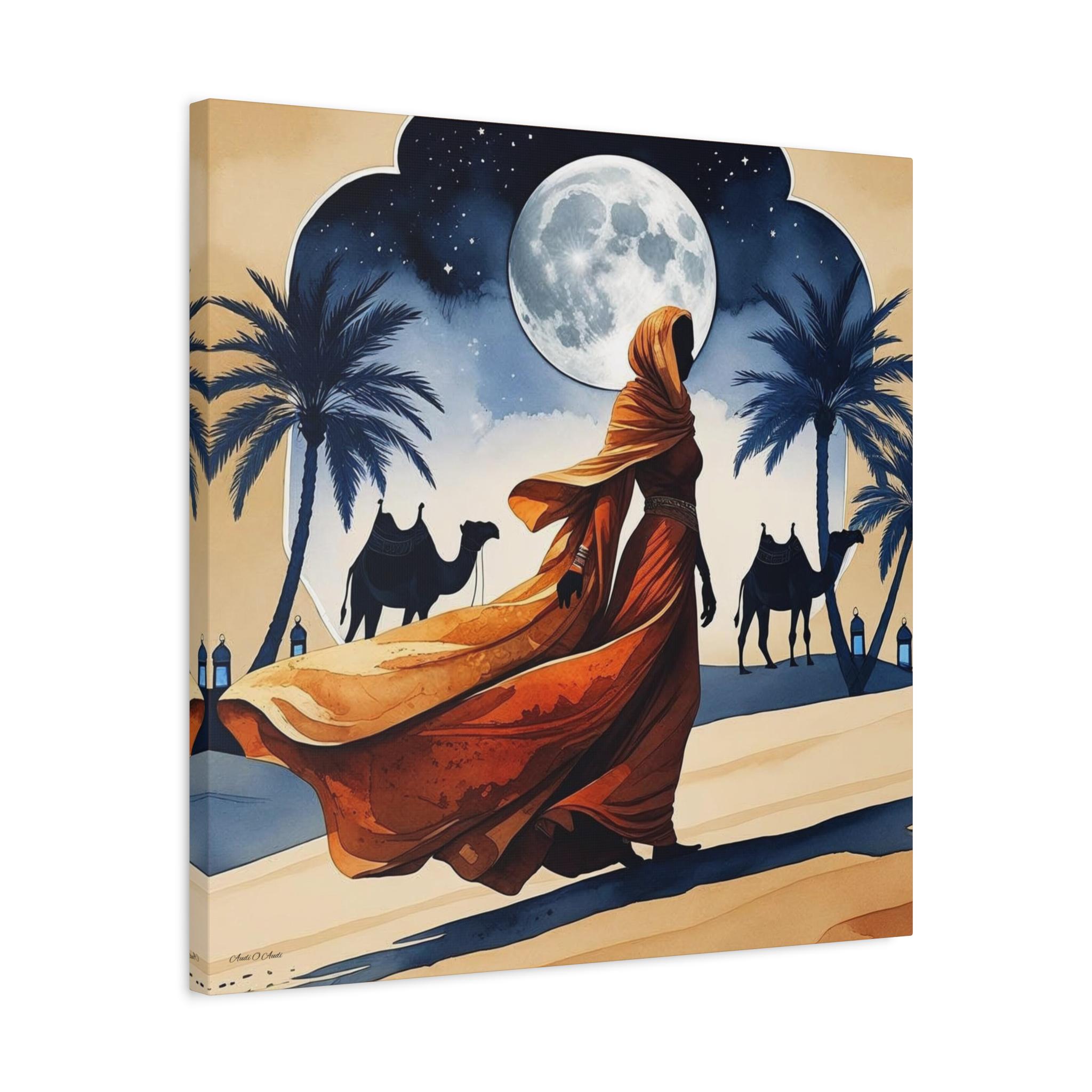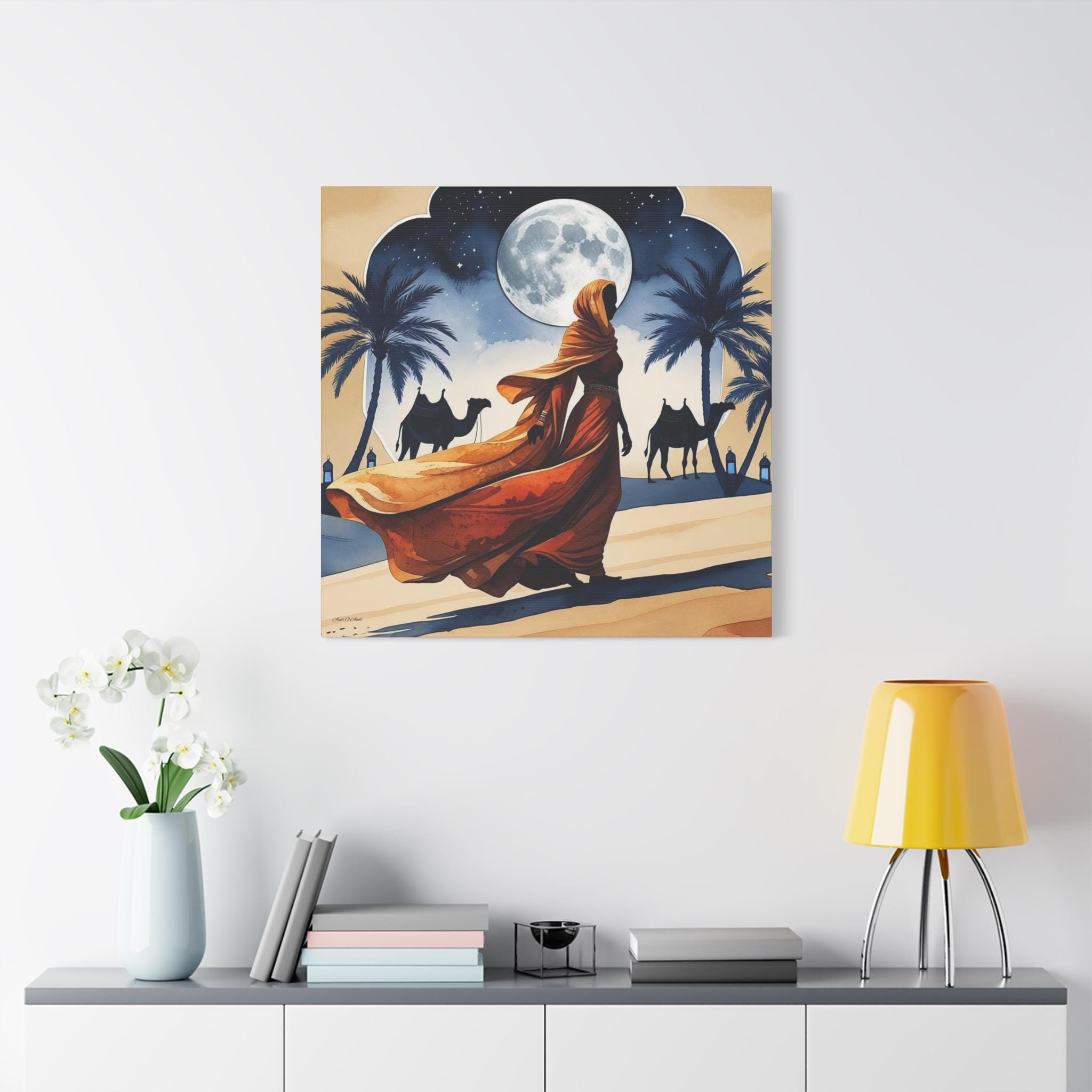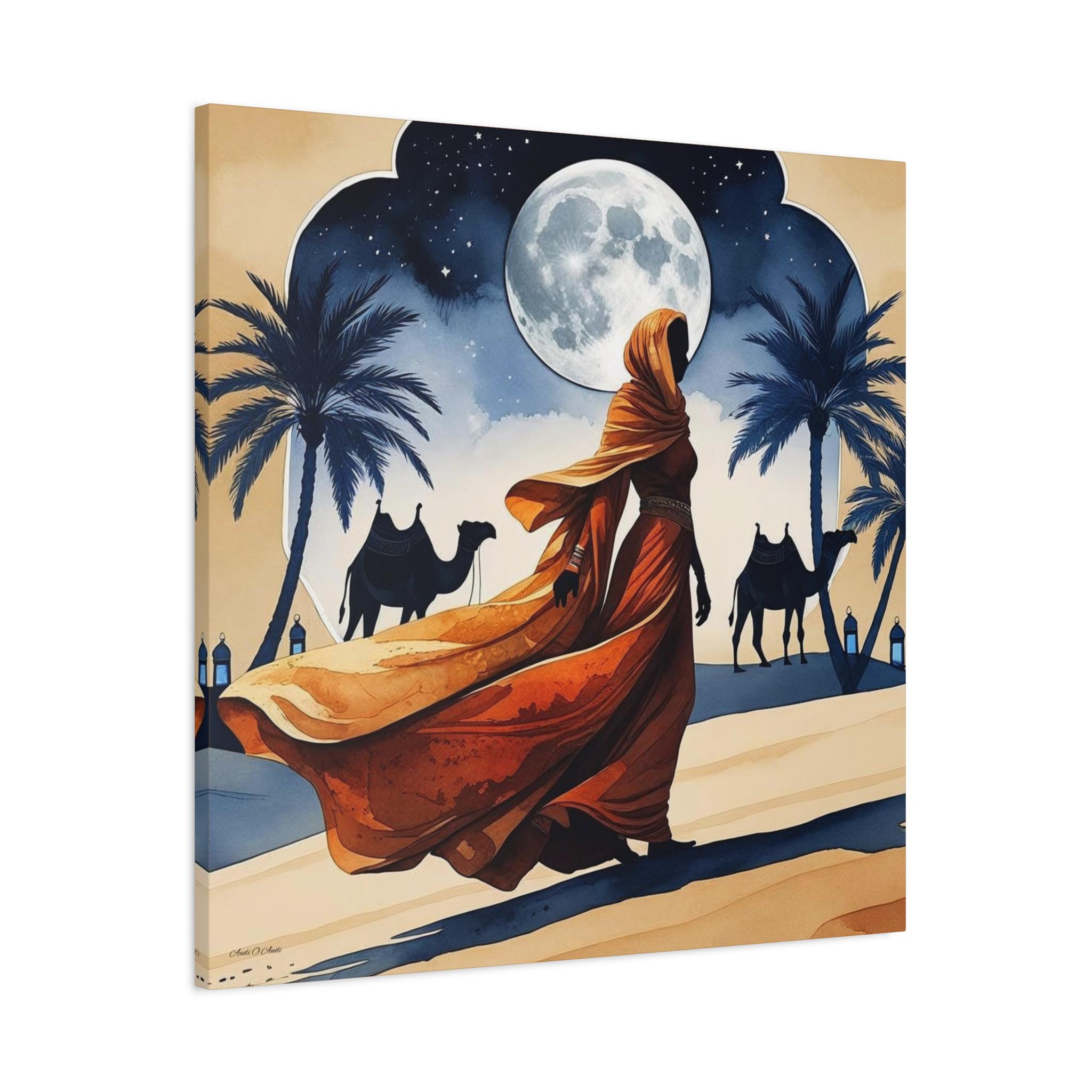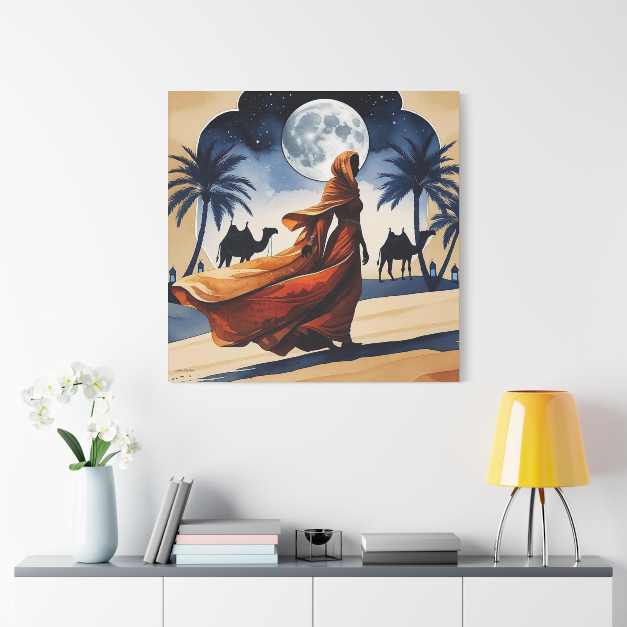 Command attention with this atmospheric canvas print that transports you to a mystical desert night. "Sentinel of the Crescent Moon" captures a solitary, cloaked figure traversing moonlit dunes, their fiery red robes flowing against the cool desert air, framed by silhouettes of camels and palm trees.