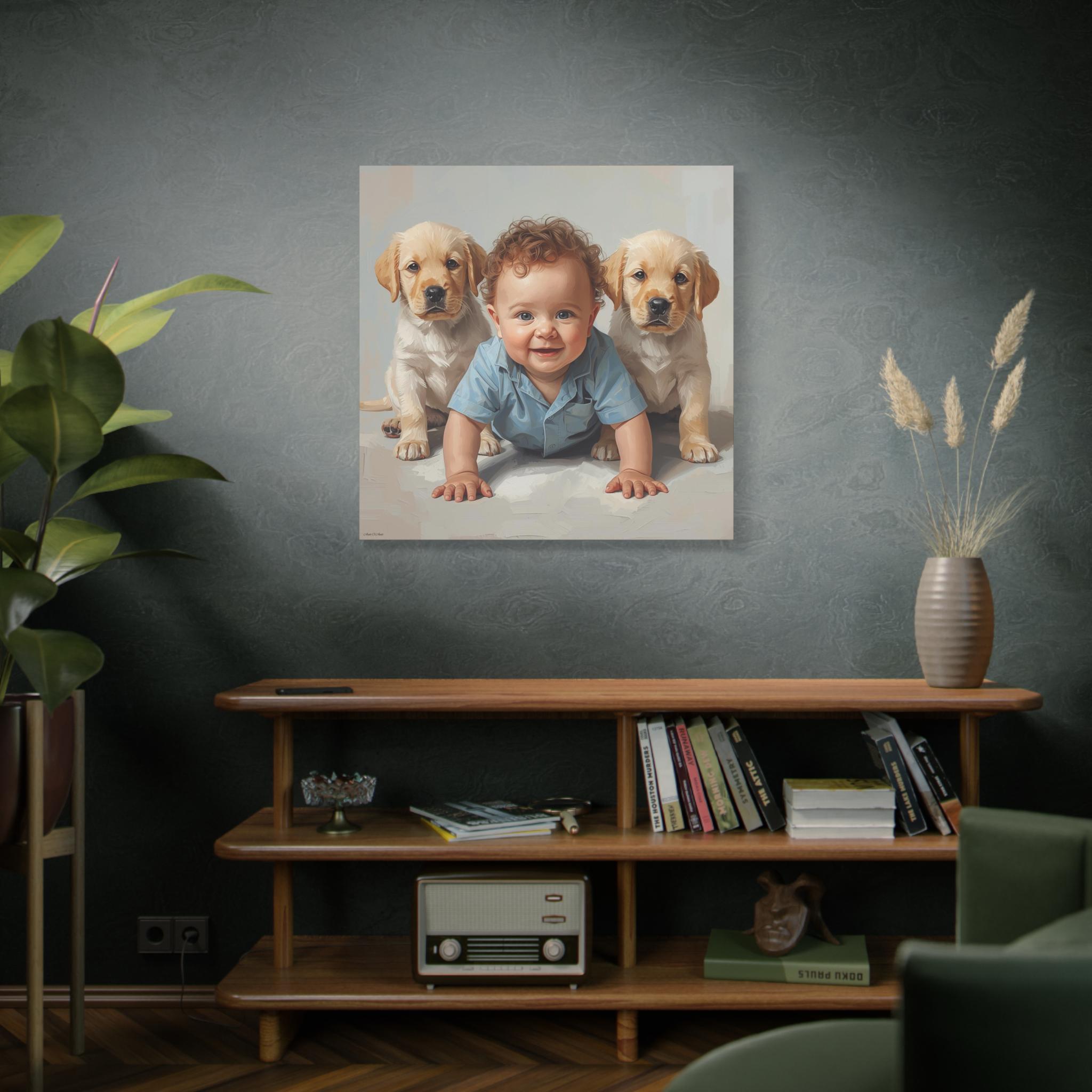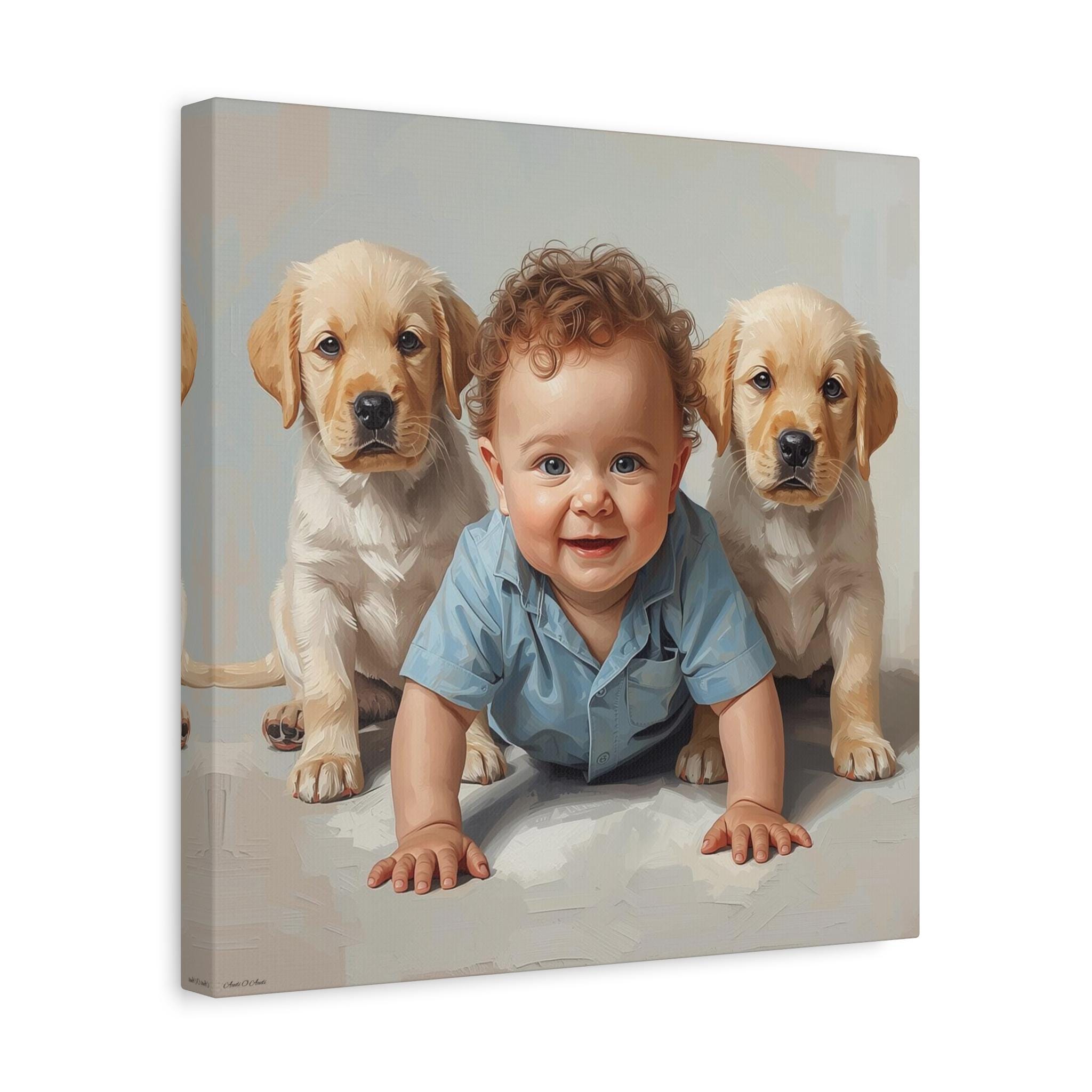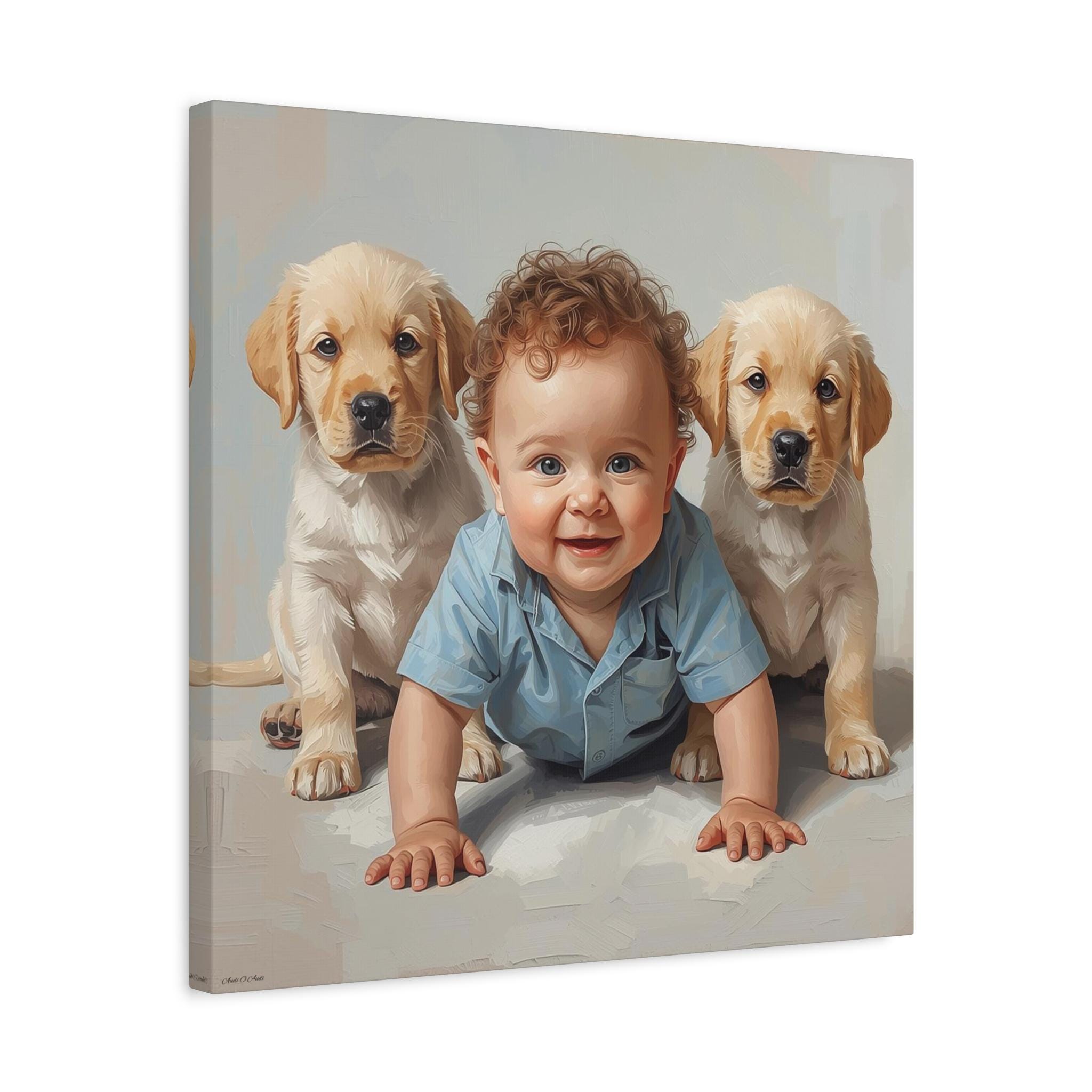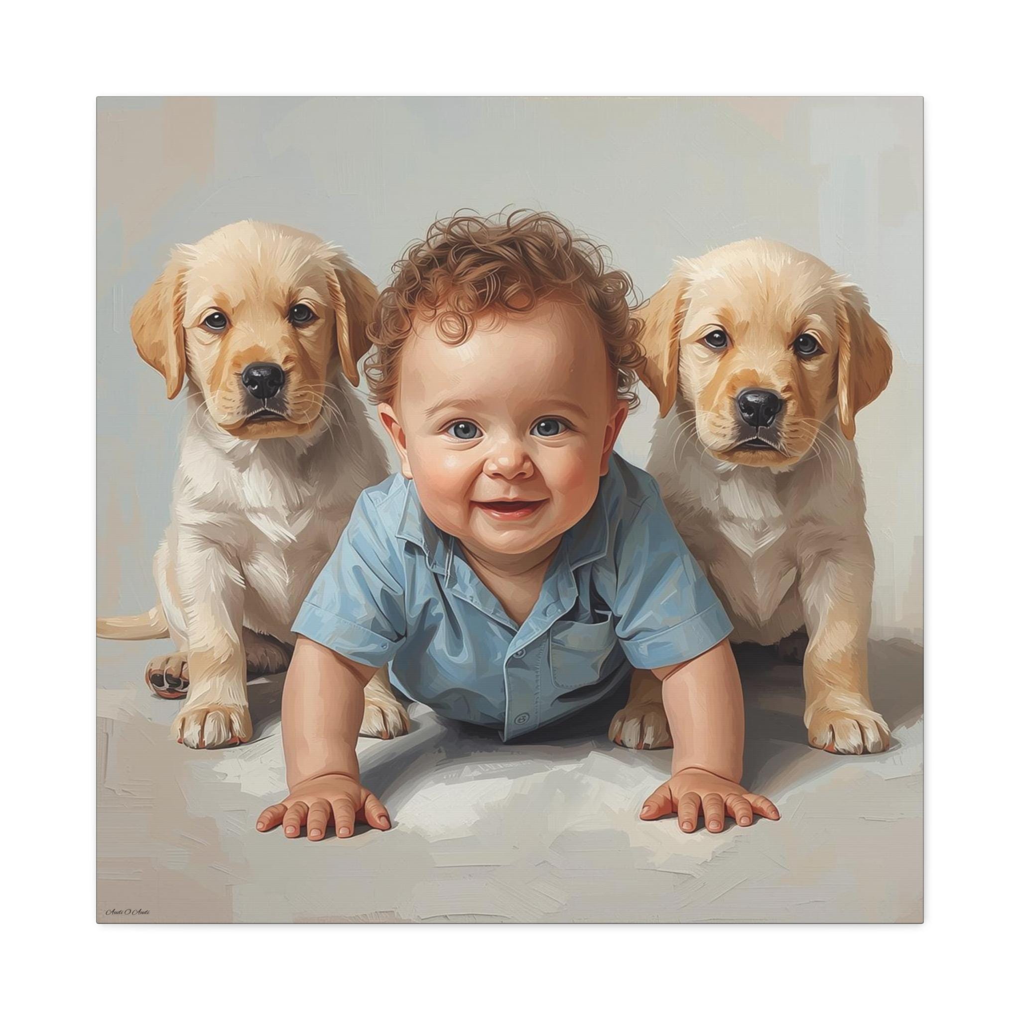 "First Companions" is an exquisitely rendered canvas print that celebrates the innocence and pure joy of early friendship. This piece captures a heartwarming moment between a charming, bright-eyed baby and two sweet Golden Retriever or Labrador puppies, flanking the child in a protective and endearing arrangement.