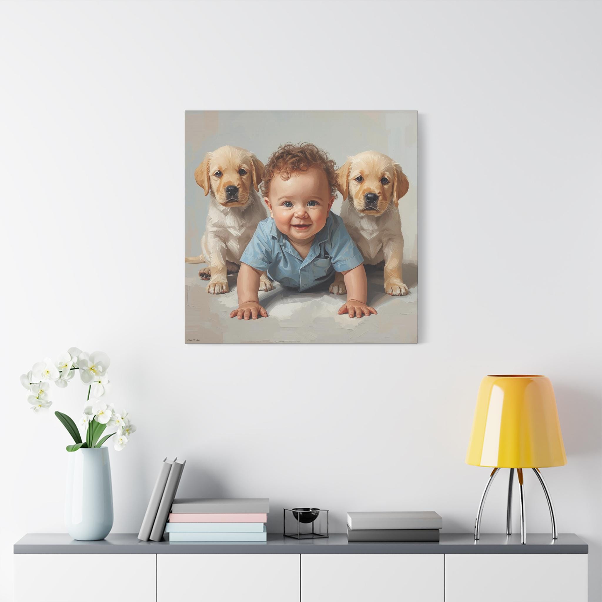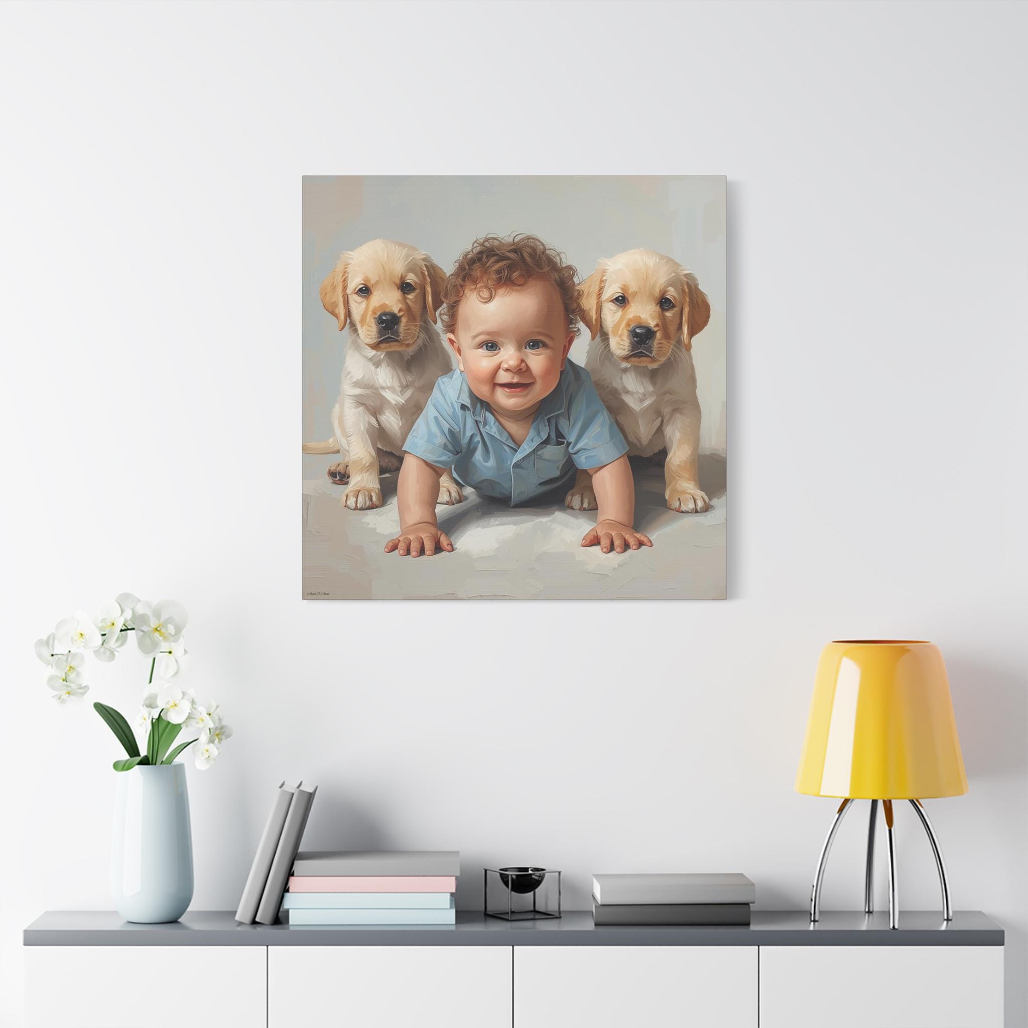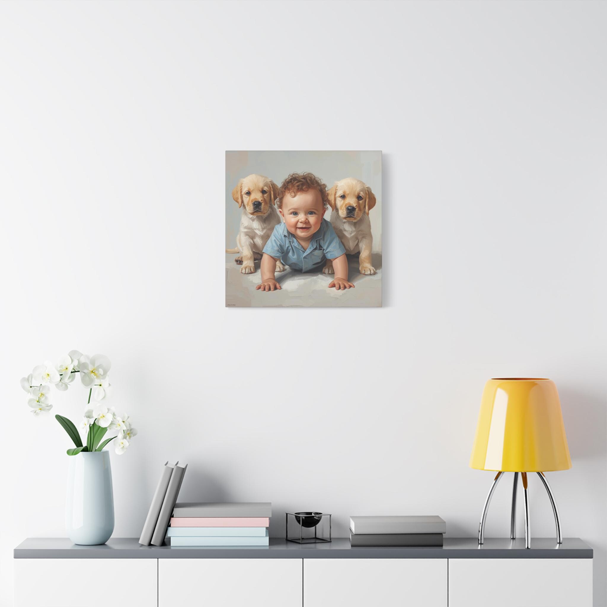 "First Companions" is an exquisitely rendered canvas print that celebrates the innocence and pure joy of early friendship. This piece captures a heartwarming moment between a charming, bright-eyed baby and two sweet Golden Retriever or Labrador puppies, flanking the child in a protective and endearing arrangement.