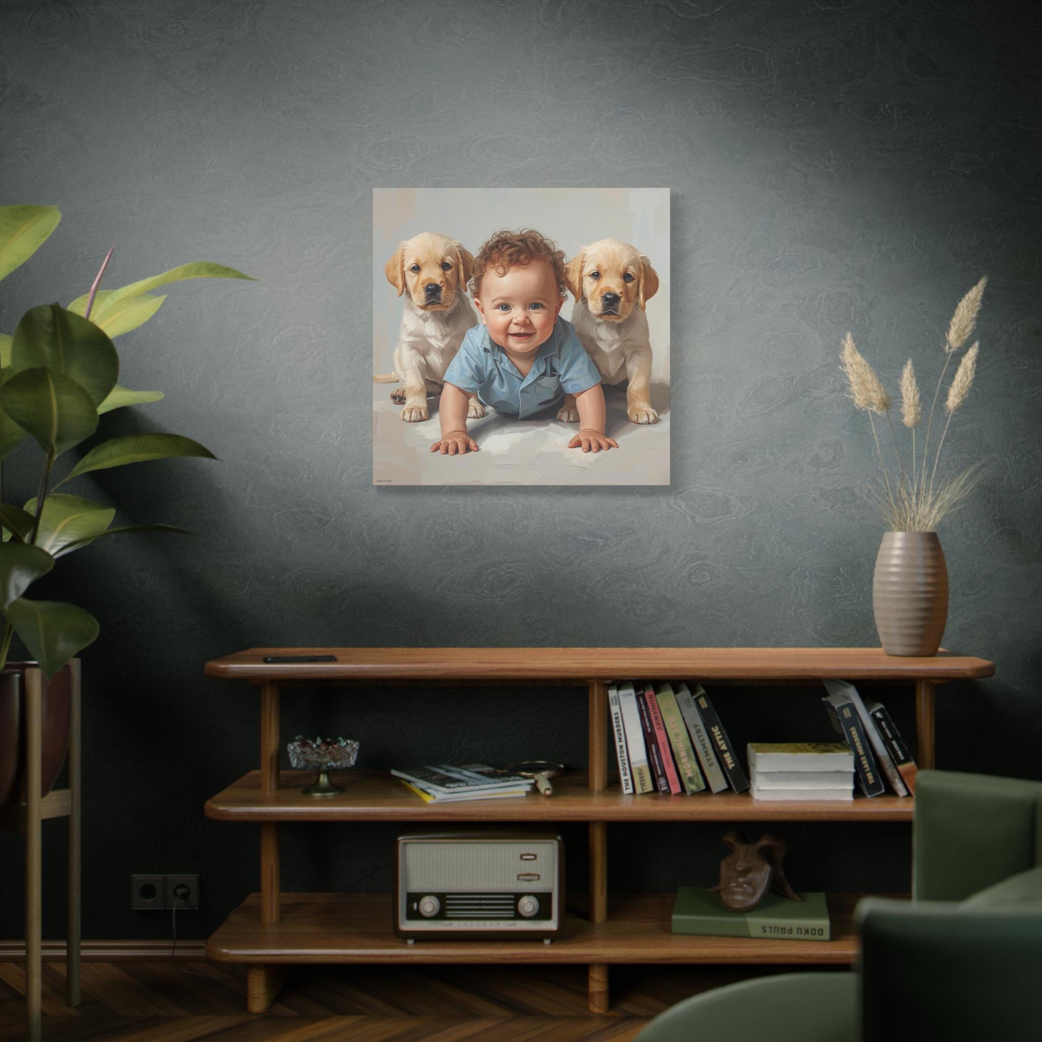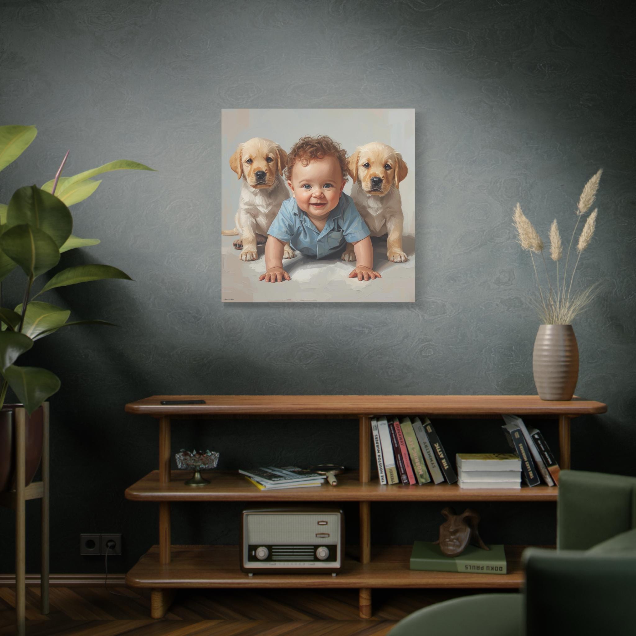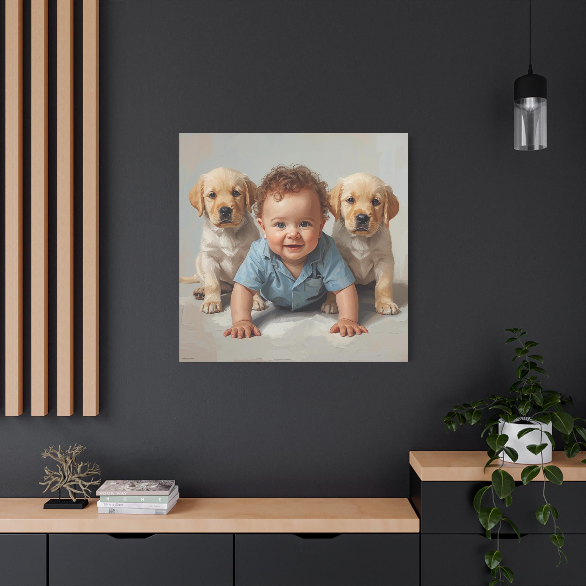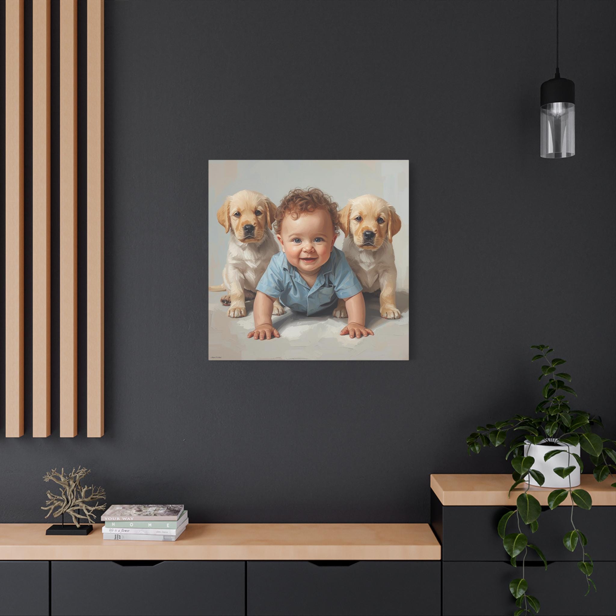 "First Companions" is an exquisitely rendered canvas print that celebrates the innocence and pure joy of early friendship. This piece captures a heartwarming moment between a charming, bright-eyed baby and two sweet Golden Retriever or Labrador puppies, flanking the child in a protective and endearing arrangement.