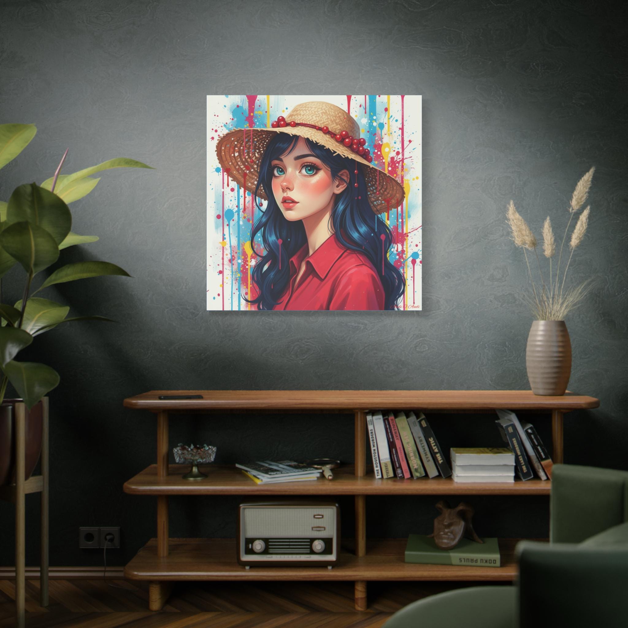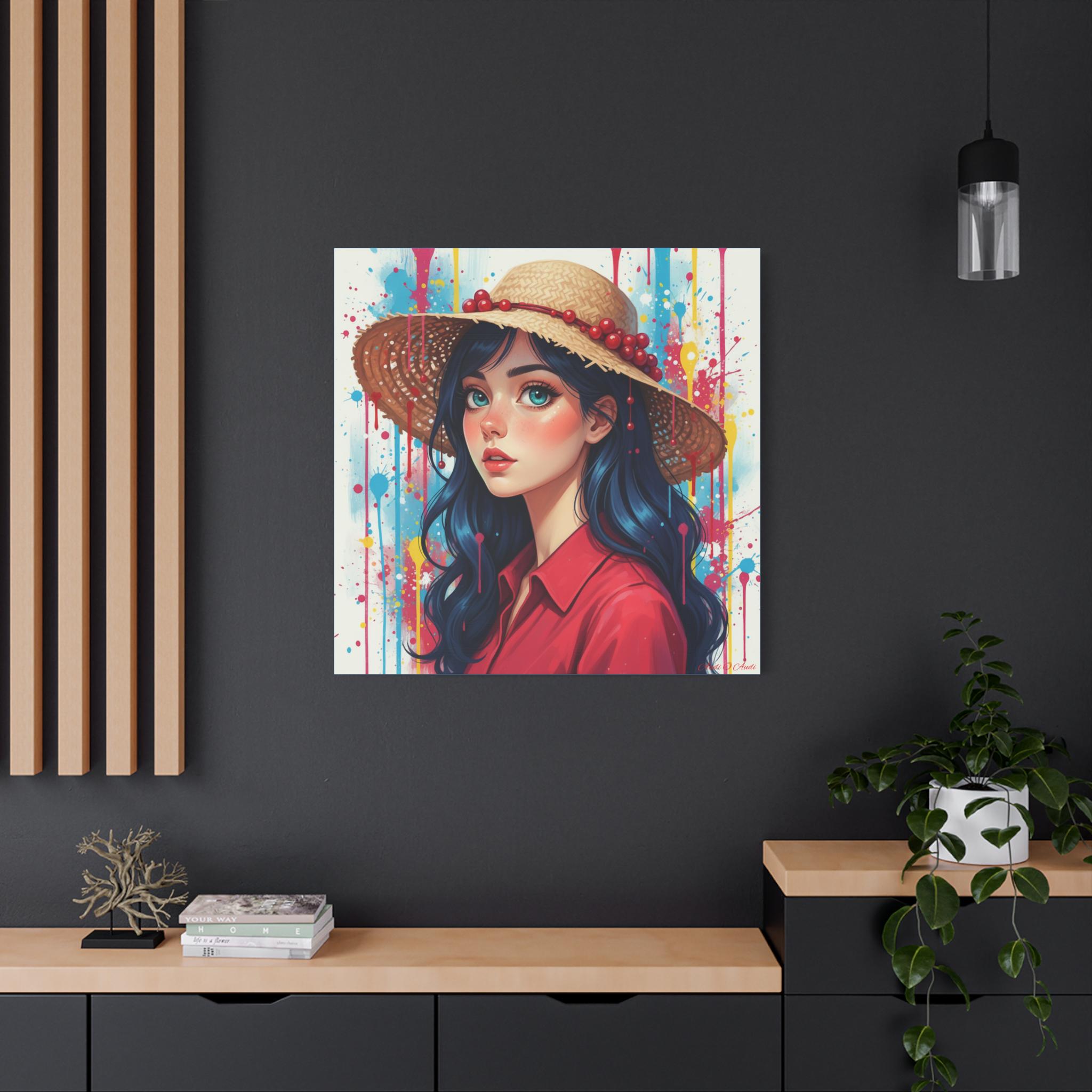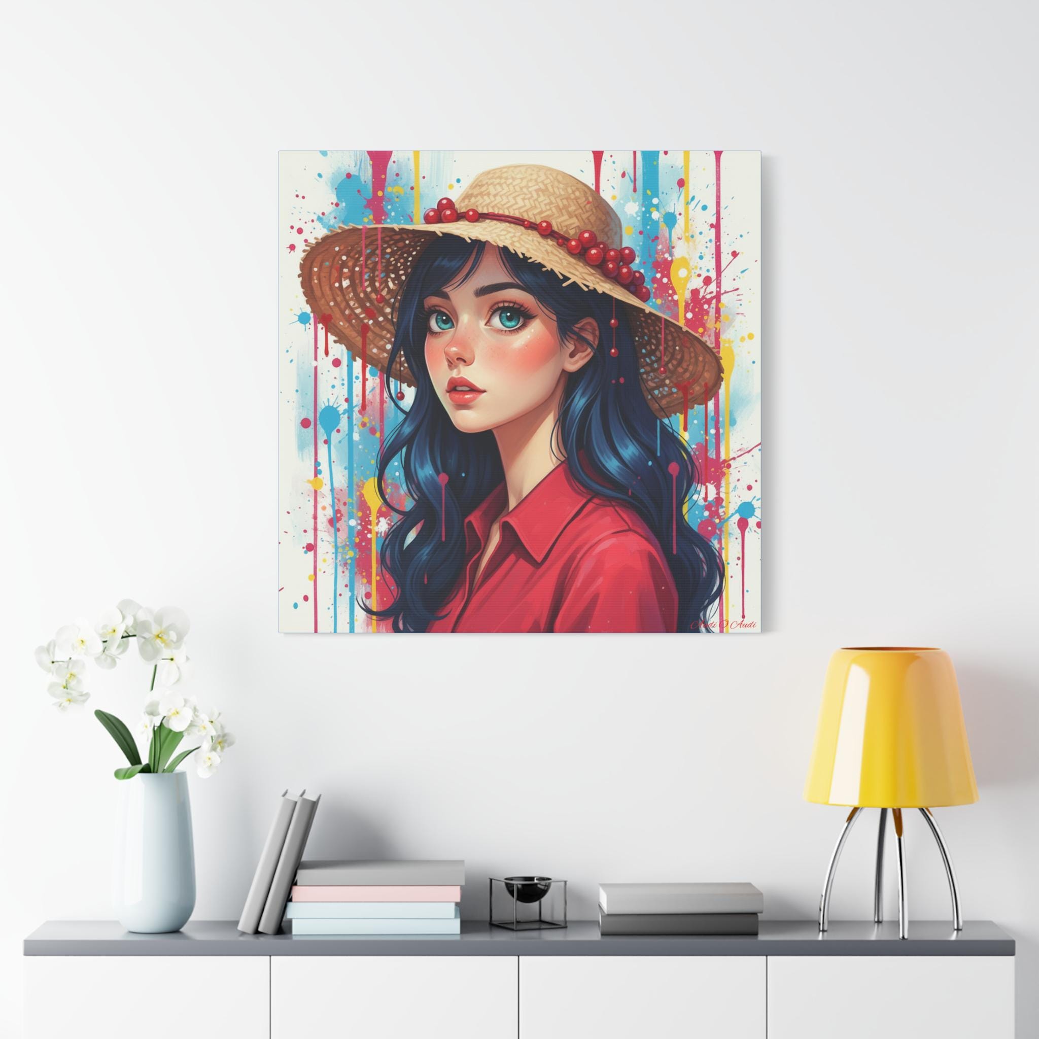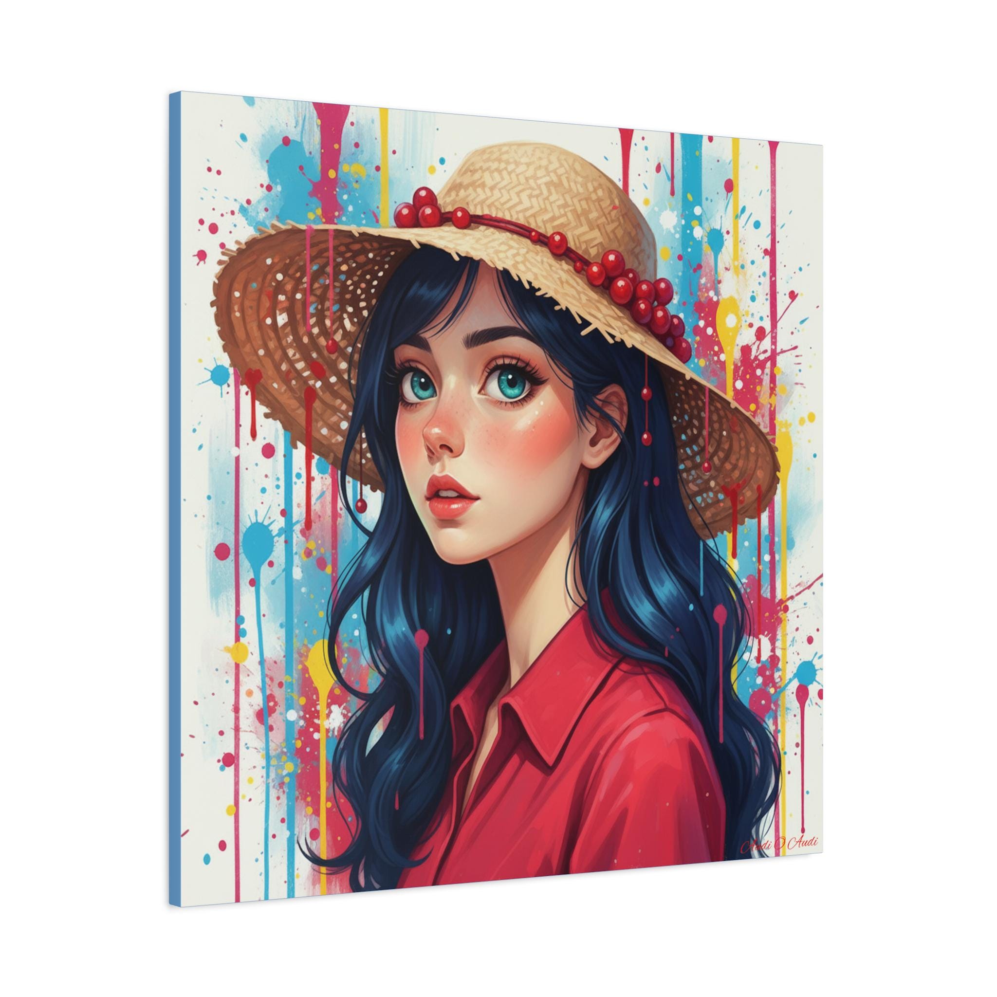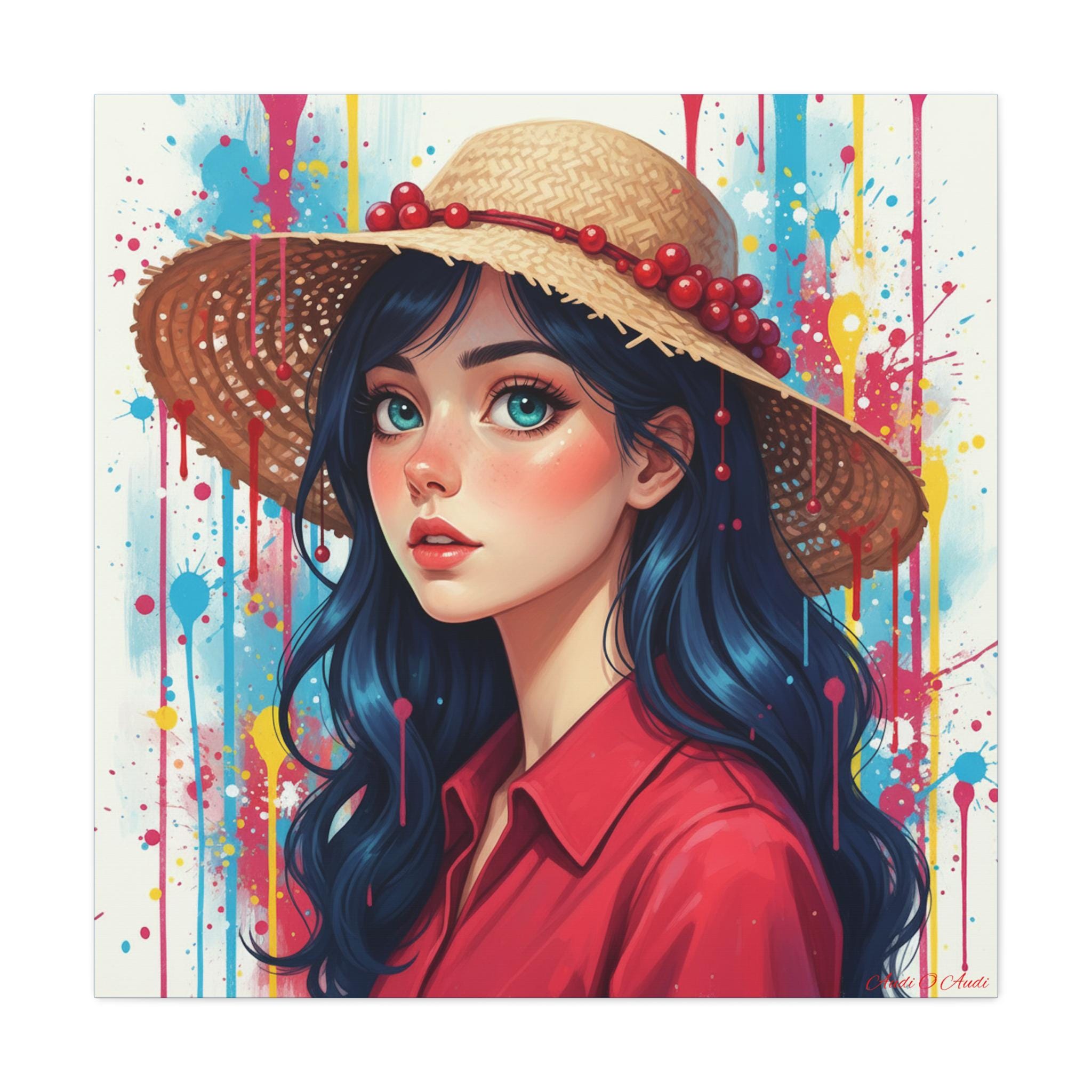 The Lady in the Straw Hat Stretched Canvas Art Print is a colorful portrait of a young woman that adds a vibrant touch to your home decor. This large size canvas (36"x36") exudes a lively and artistic atmosphere, perfect for art lovers and home decorators. Ideal for those looking to brighten up their living spaces or add a pop of color to their walls. Great for gifting on birthdays, housewarmings, or any special occasion.