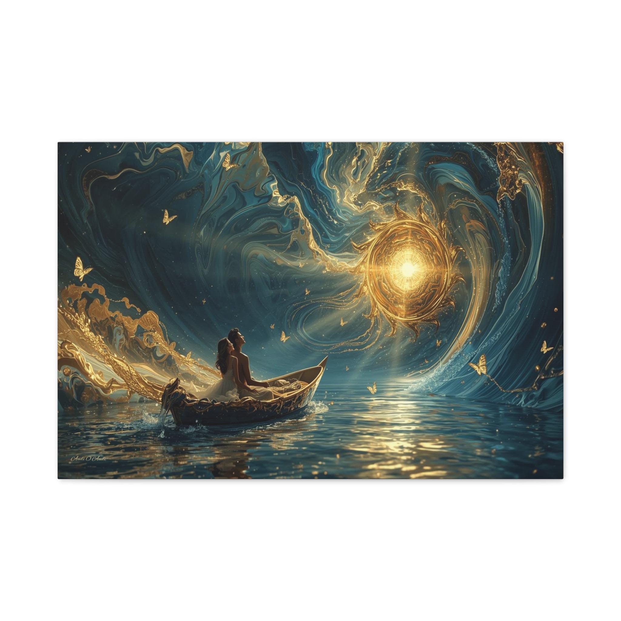 Transform your space into a dreamscape with "The Golden Voyage." This breathtaking canvas print depicts a couple seated in an ornate vessel, drifting through a surreal ocean of swirling deep blues and liquid gold.