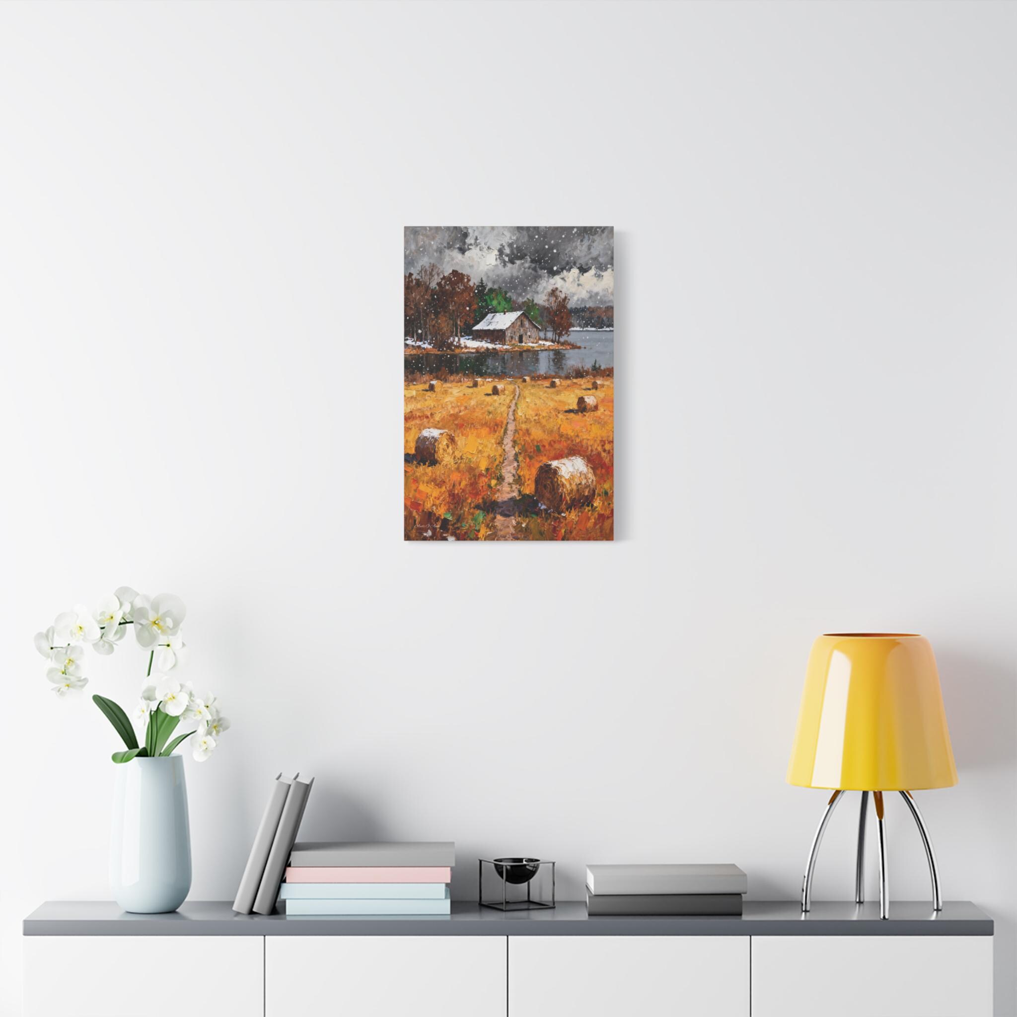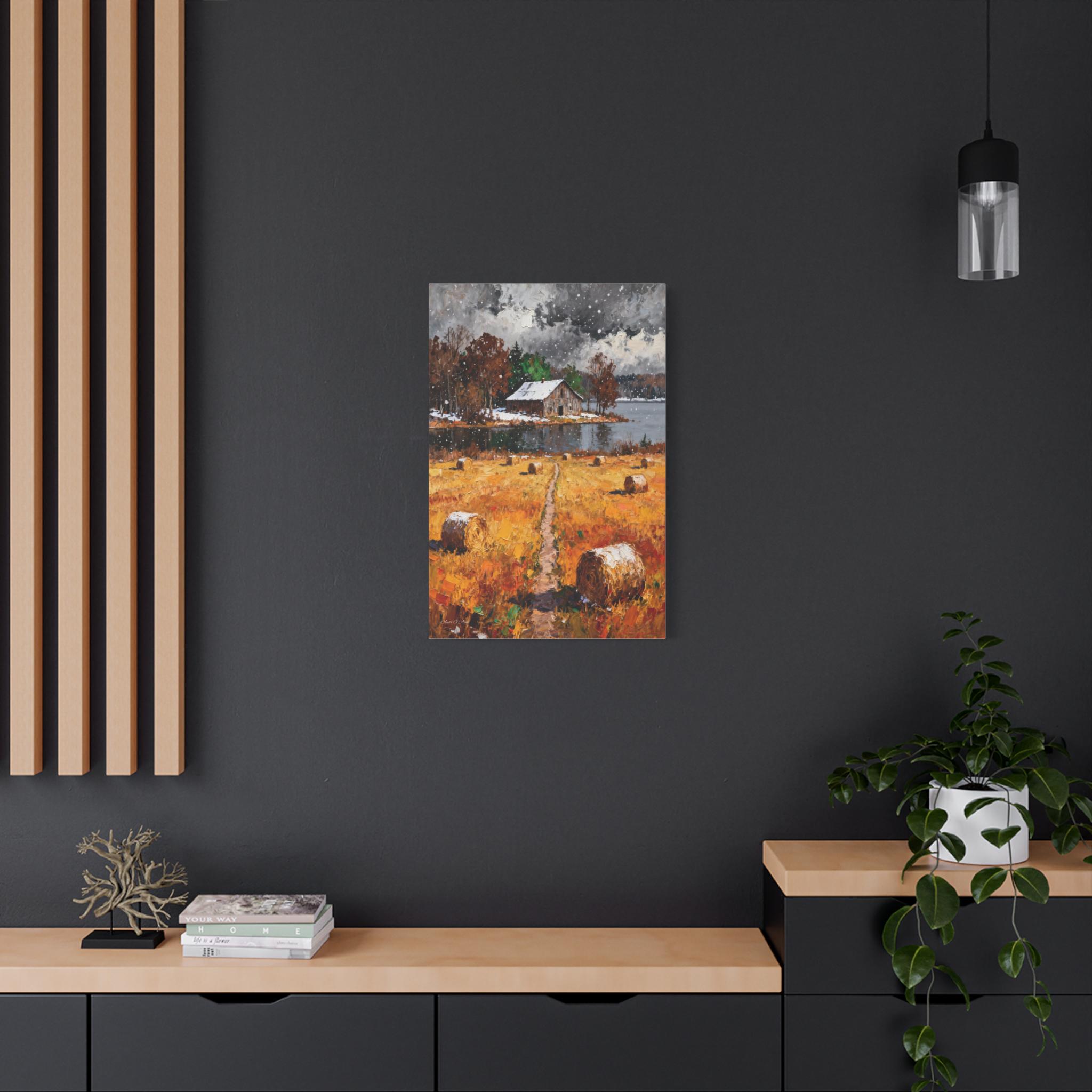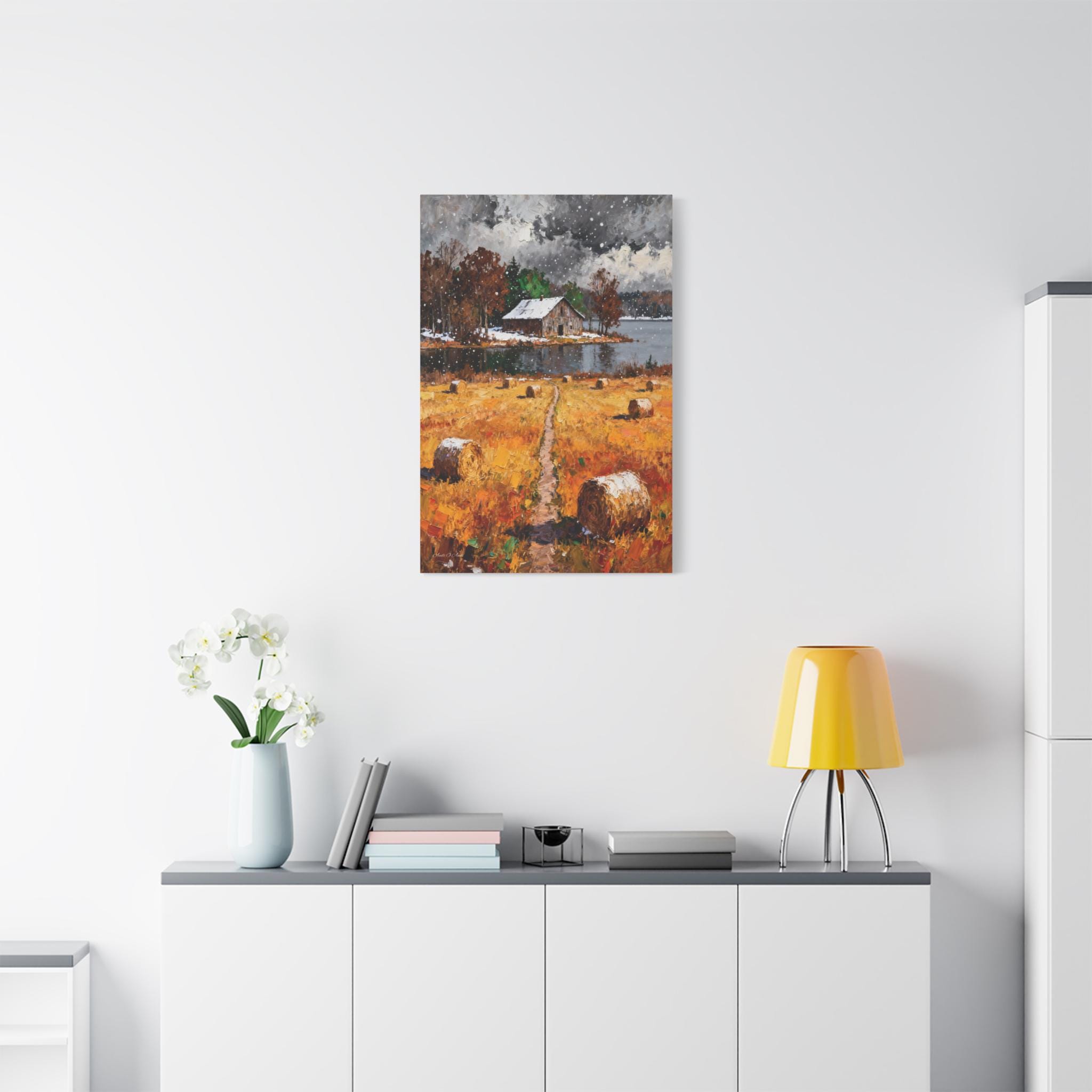 Bring the rustic charm of the changing seasons into your home with this "First Snow on the Harvest" Canvas Print.