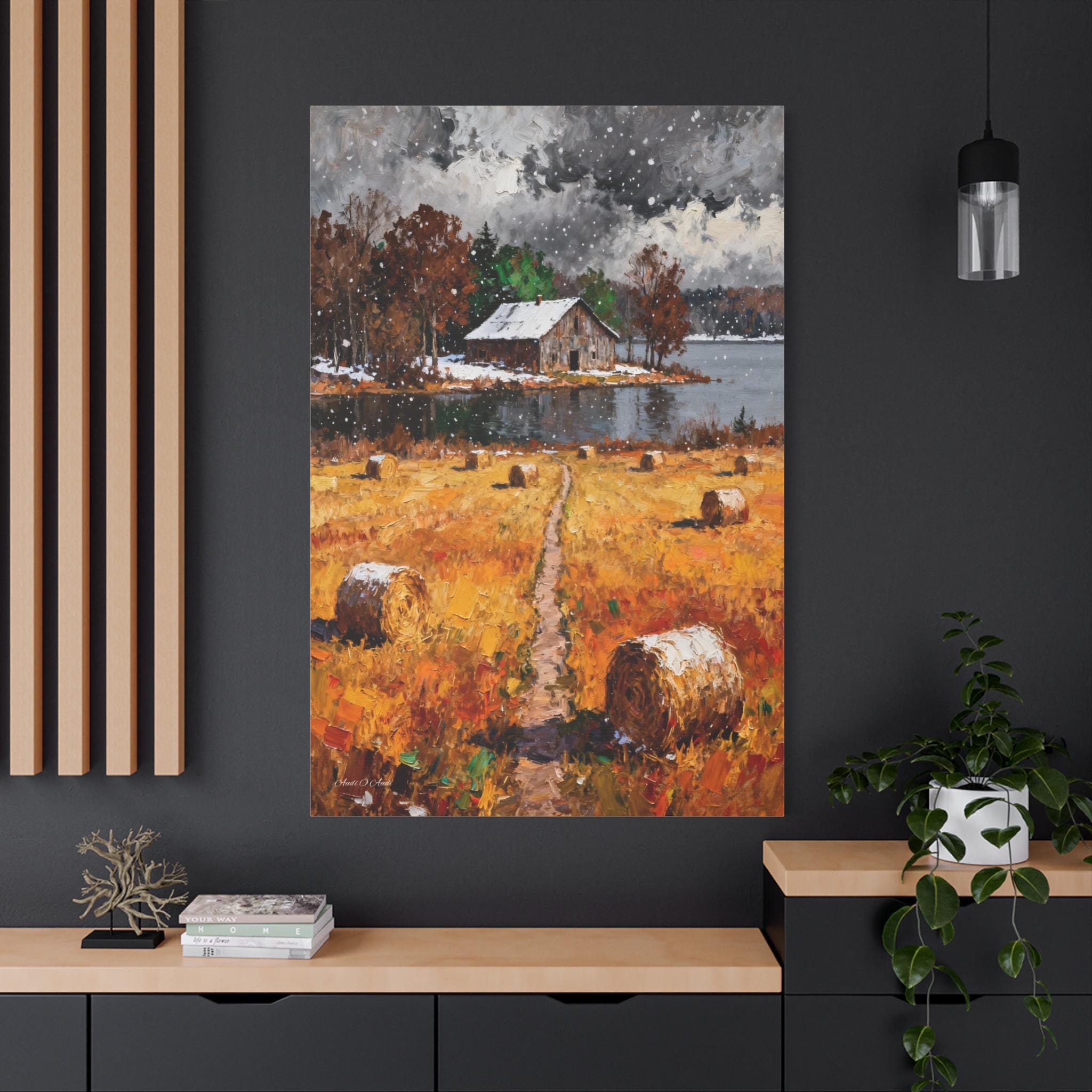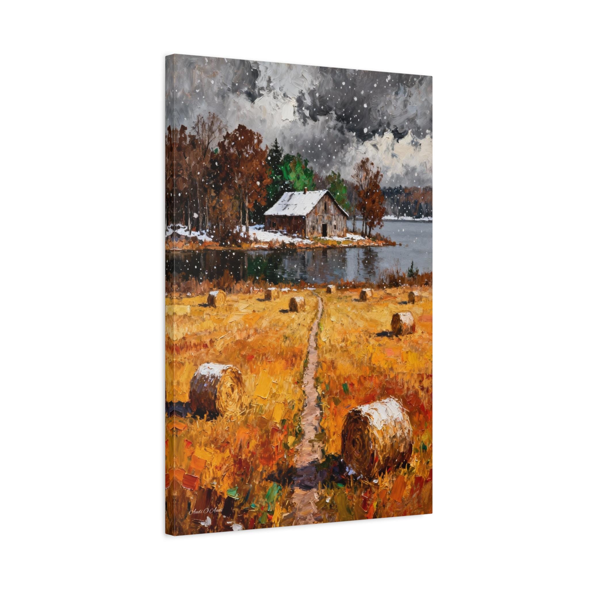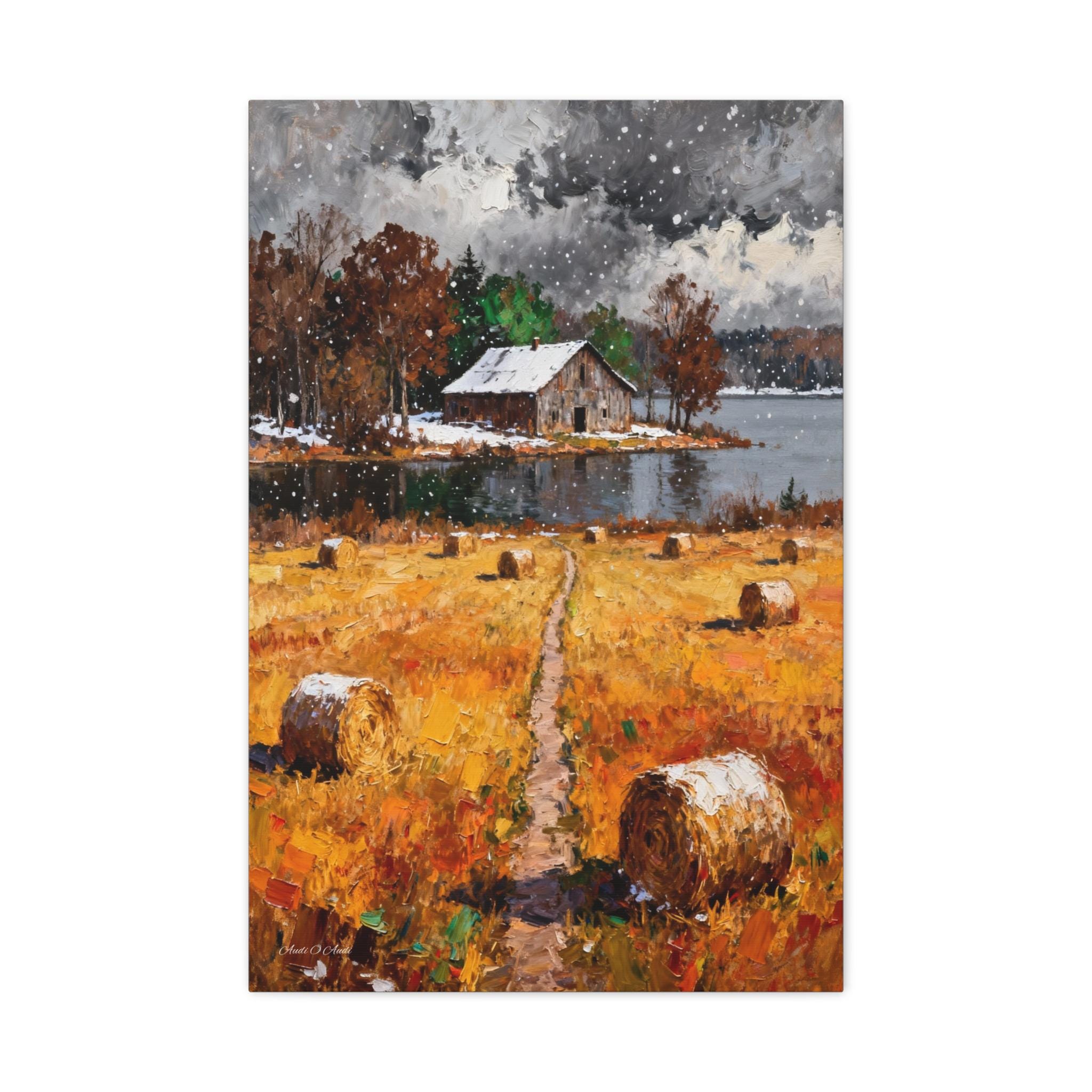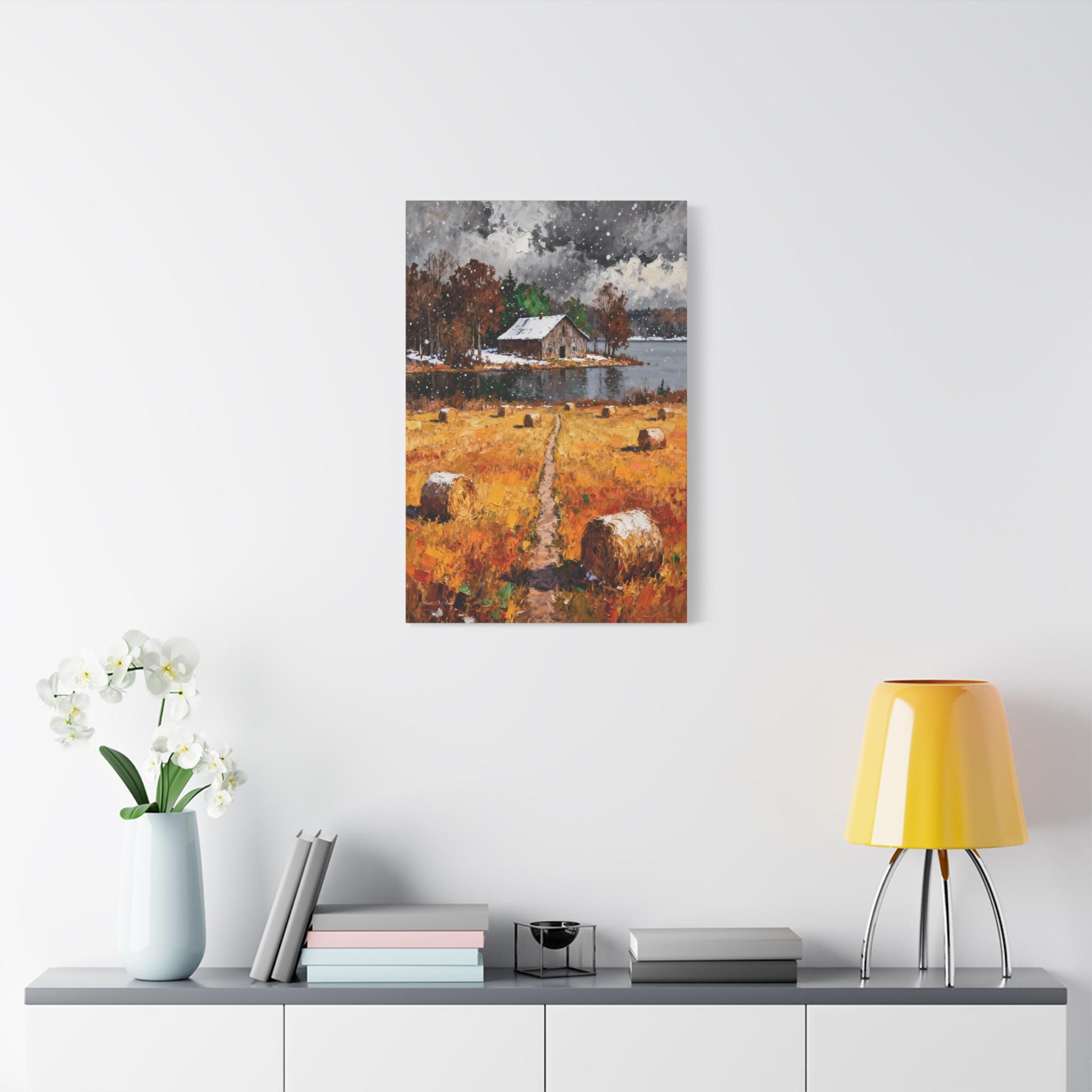 Bring the rustic charm of the changing seasons into your home with this "First Snow on the Harvest" Canvas Print.