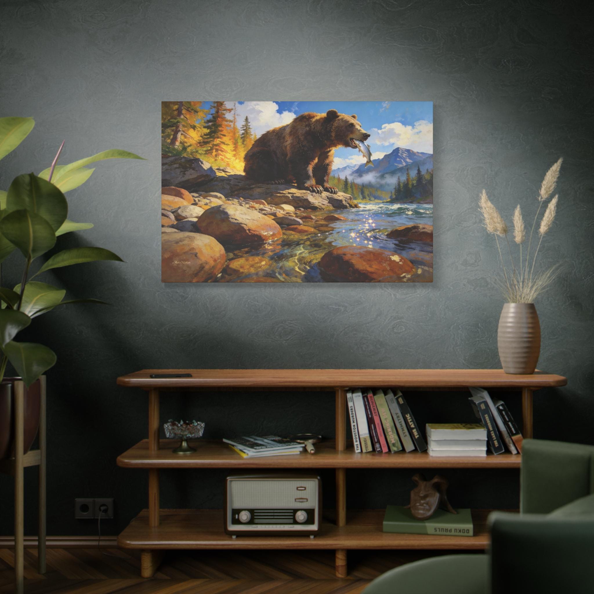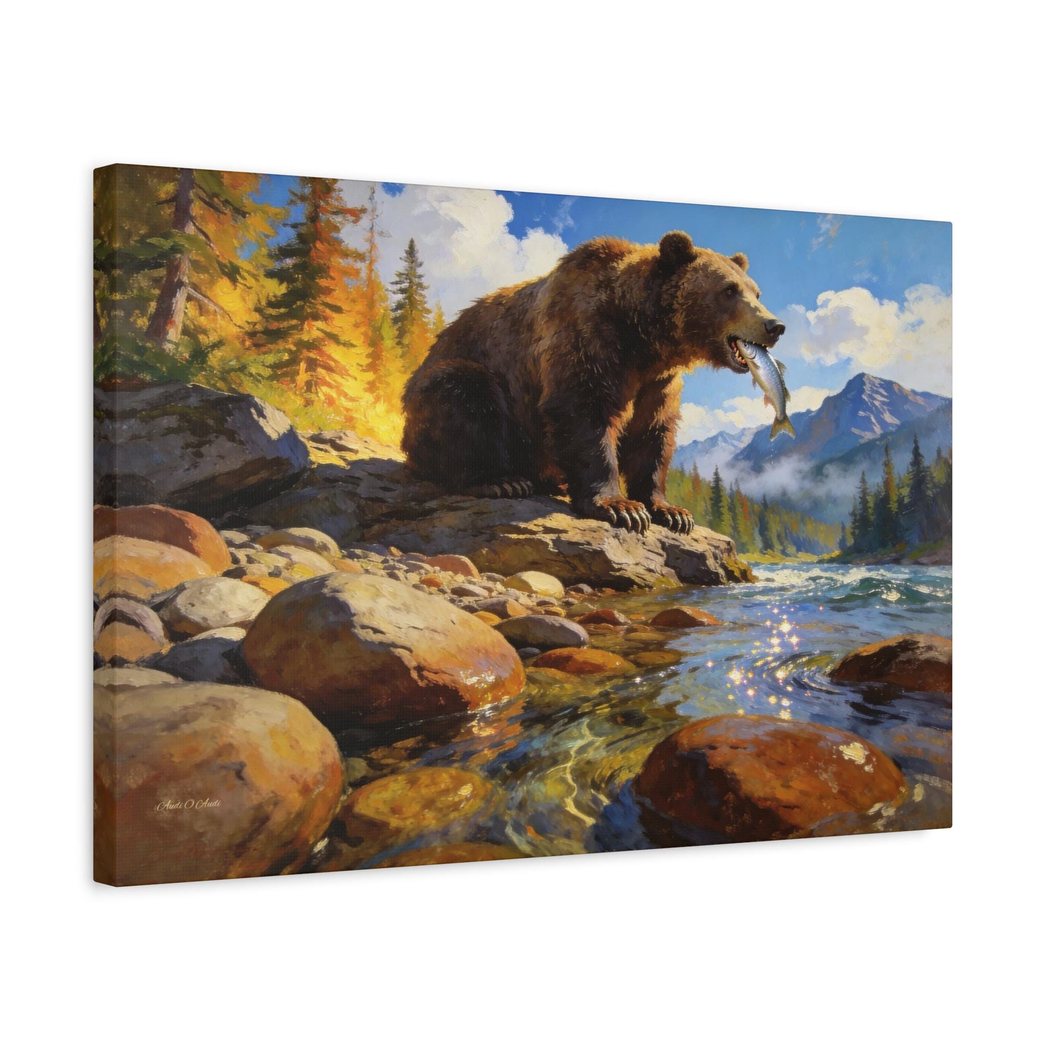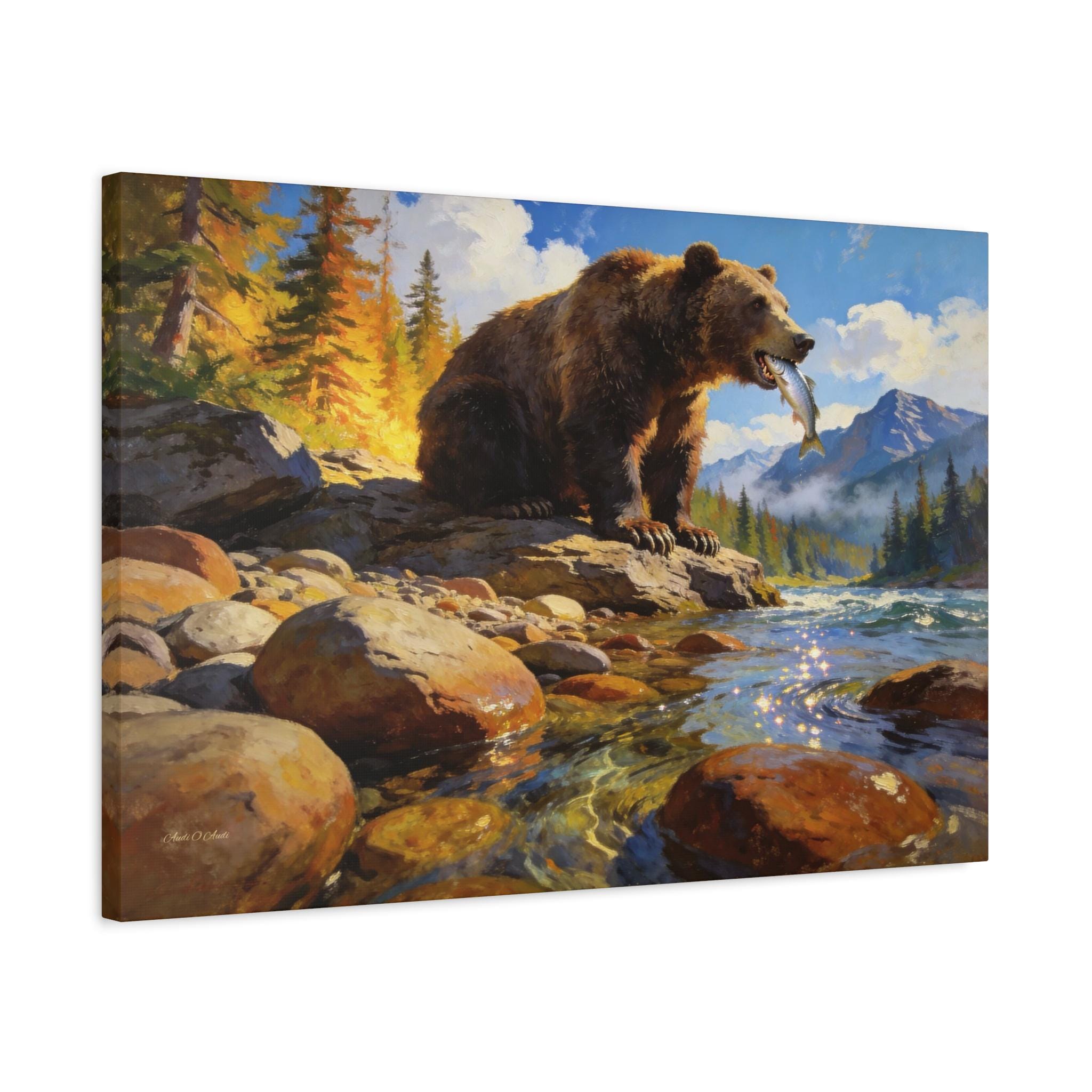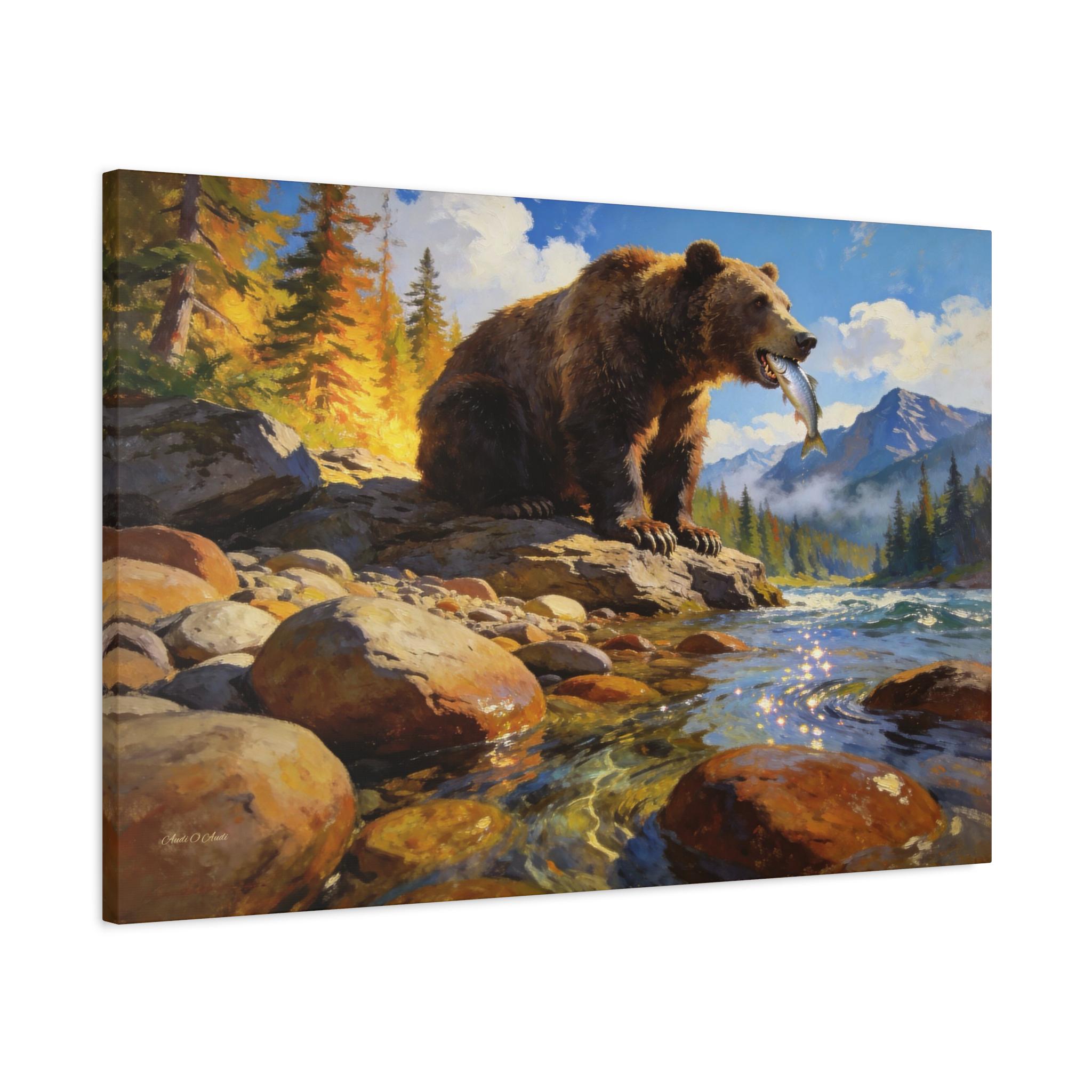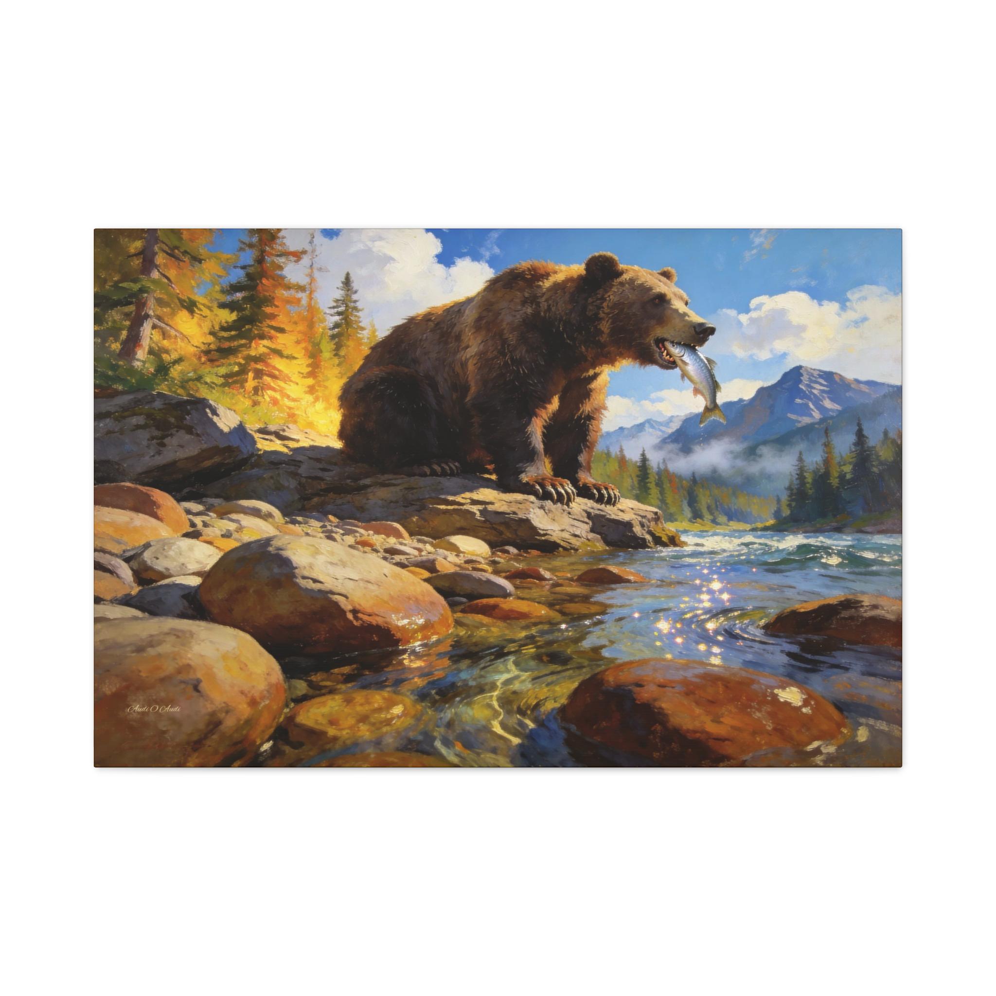 Bring the untamed beauty of the wilderness into your home with "The Golden Catch." This stunning canvas print captures a powerful moment in nature: a majestic grizzly bear securing its prize amidst a rushing river.