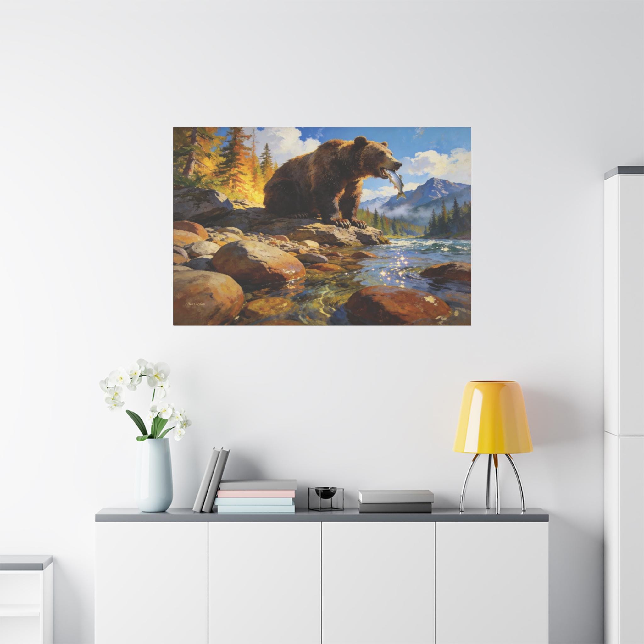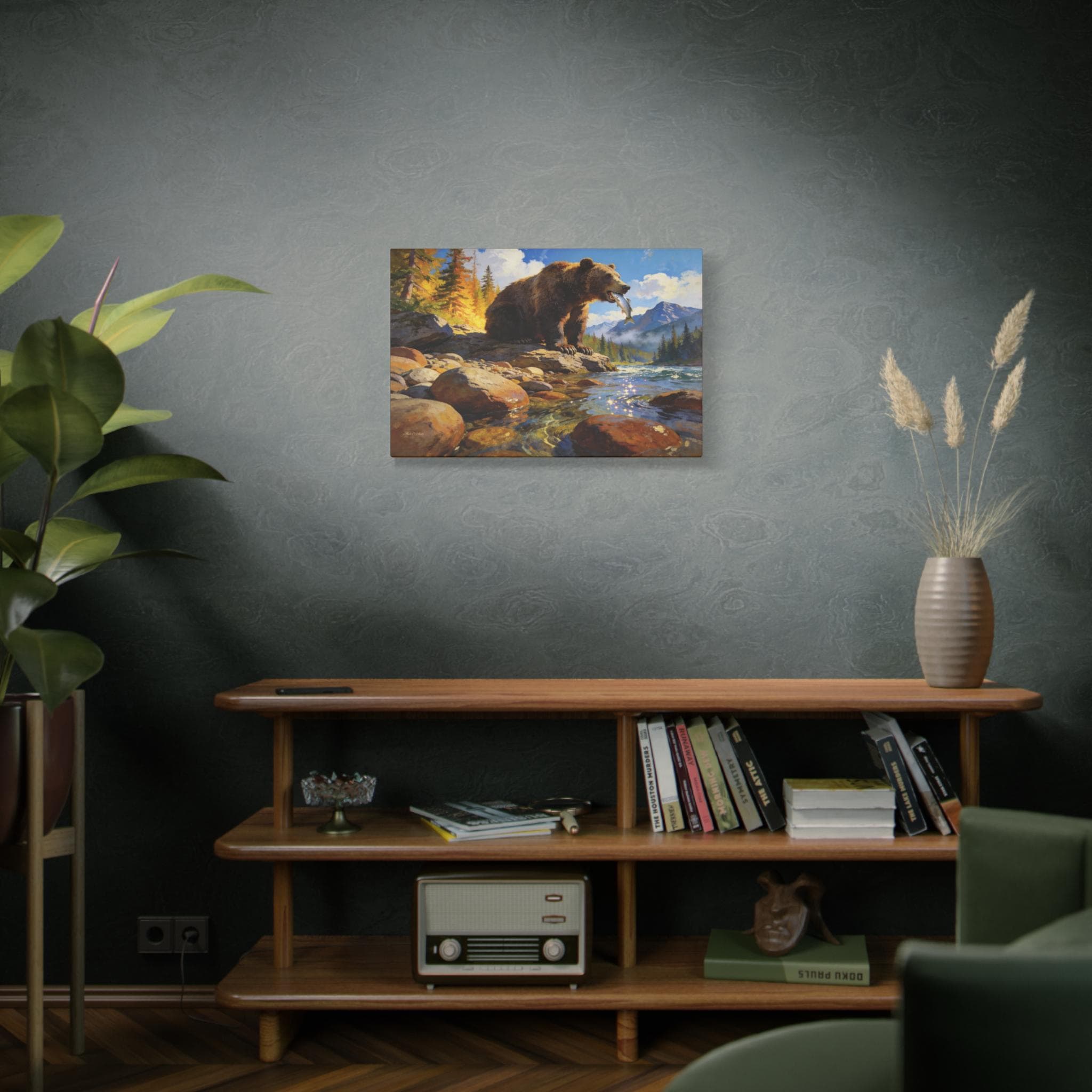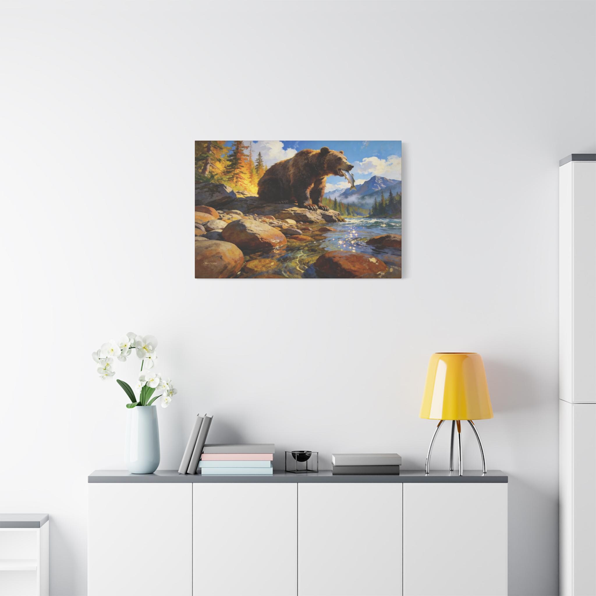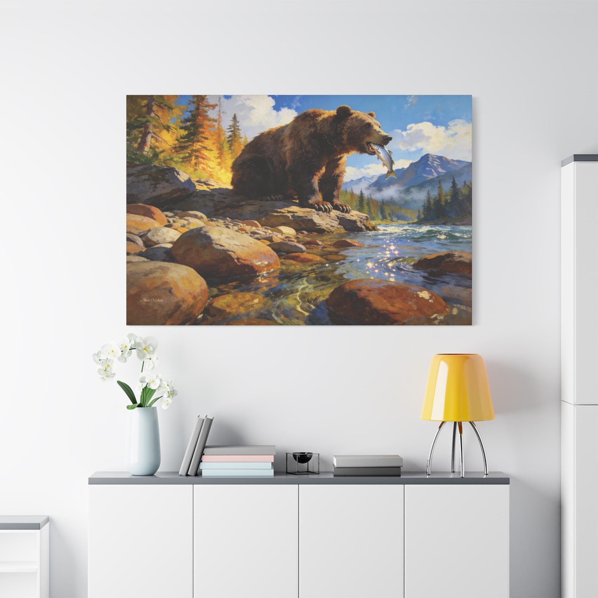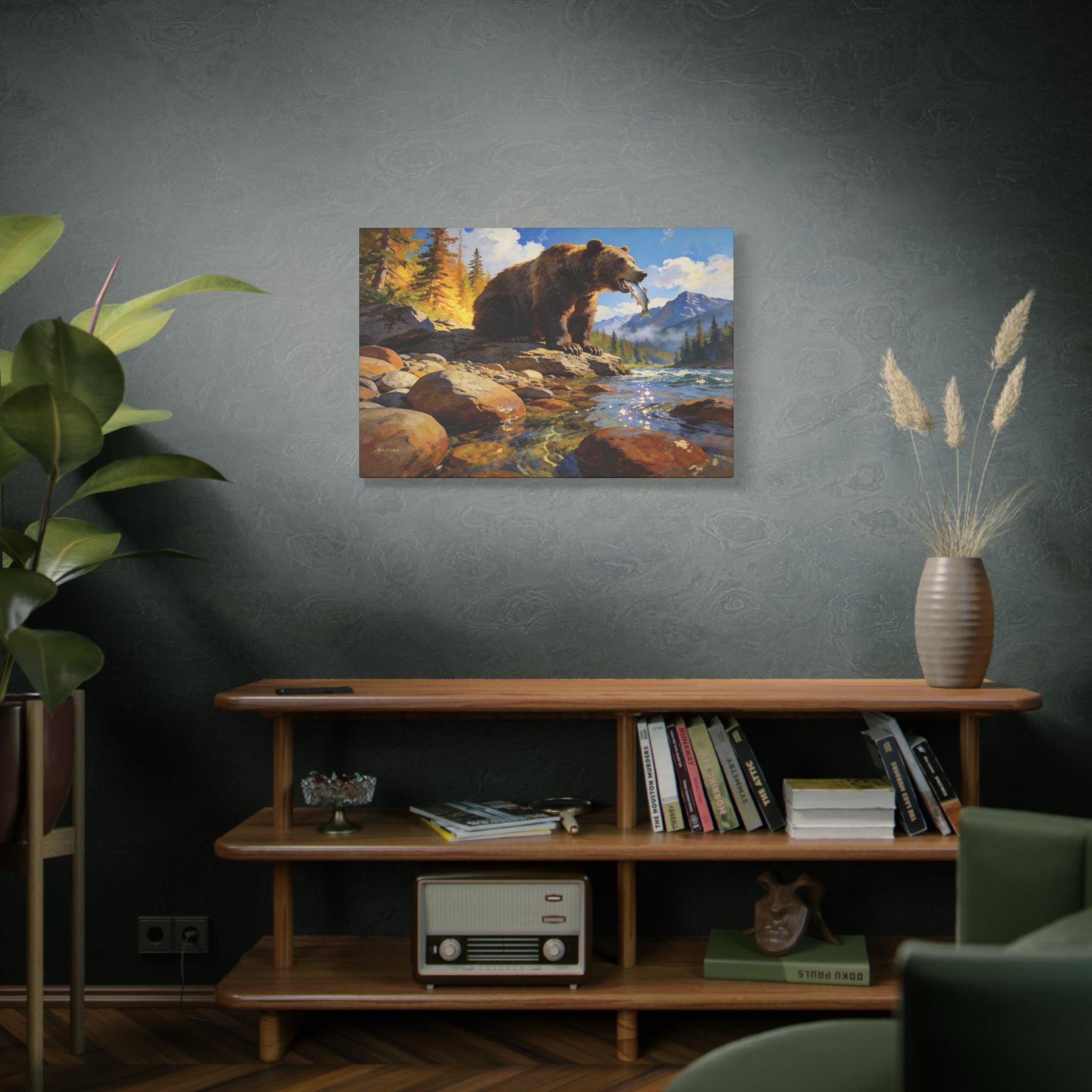 Bring the untamed beauty of the wilderness into your home with "The Golden Catch." This stunning canvas print captures a powerful moment in nature: a majestic grizzly bear securing its prize amidst a rushing river.