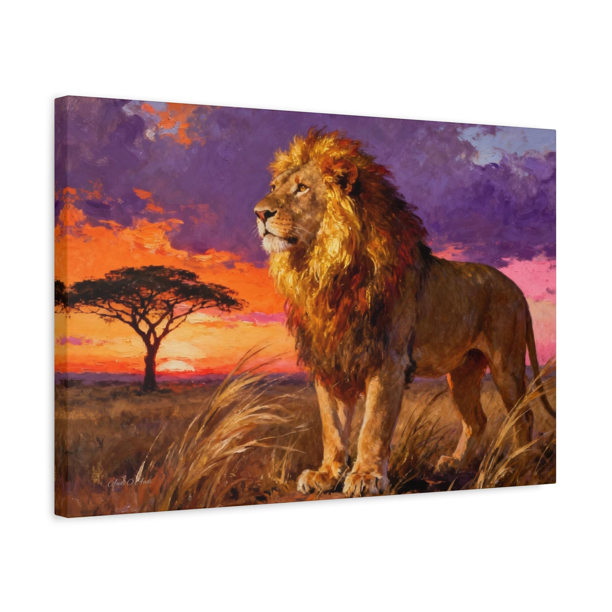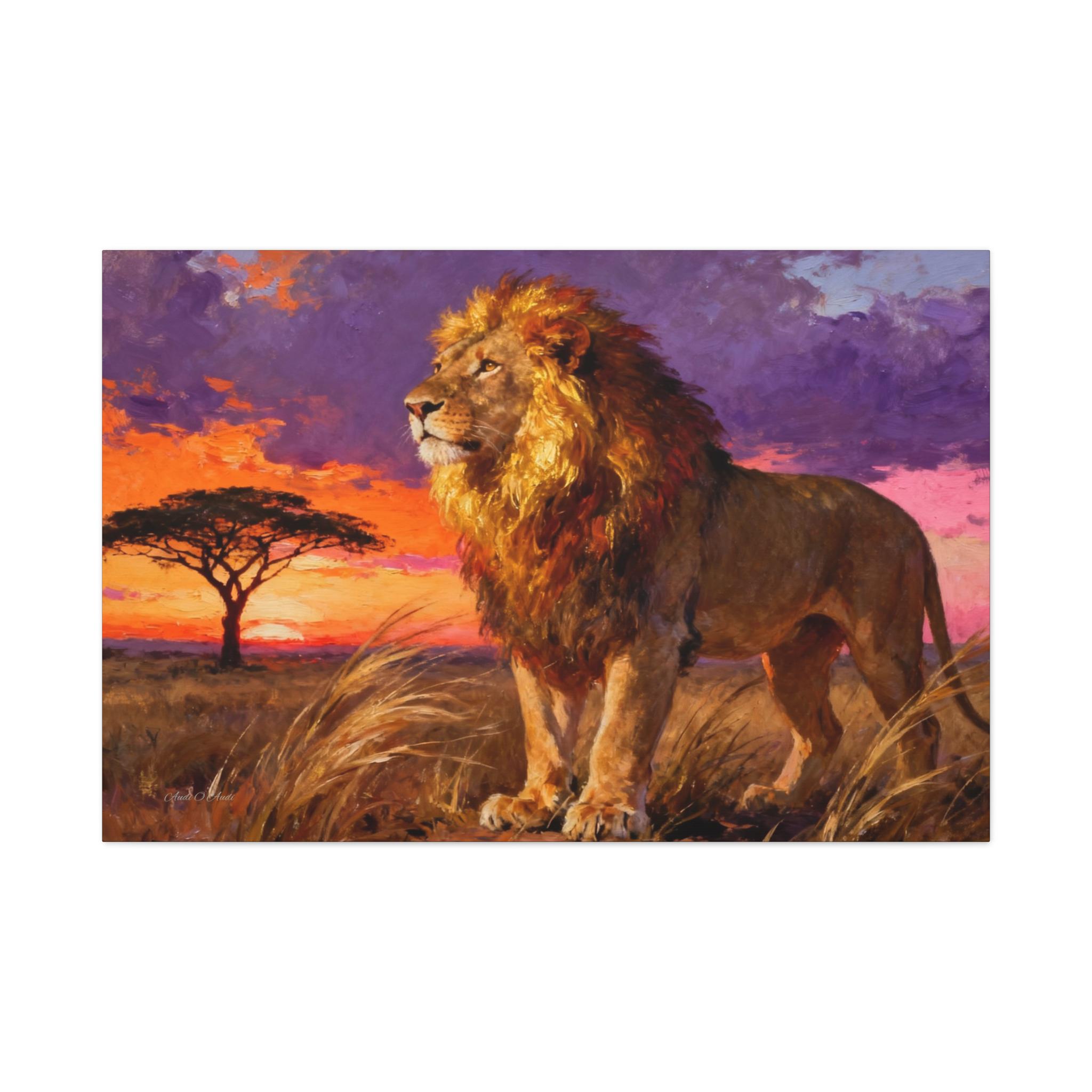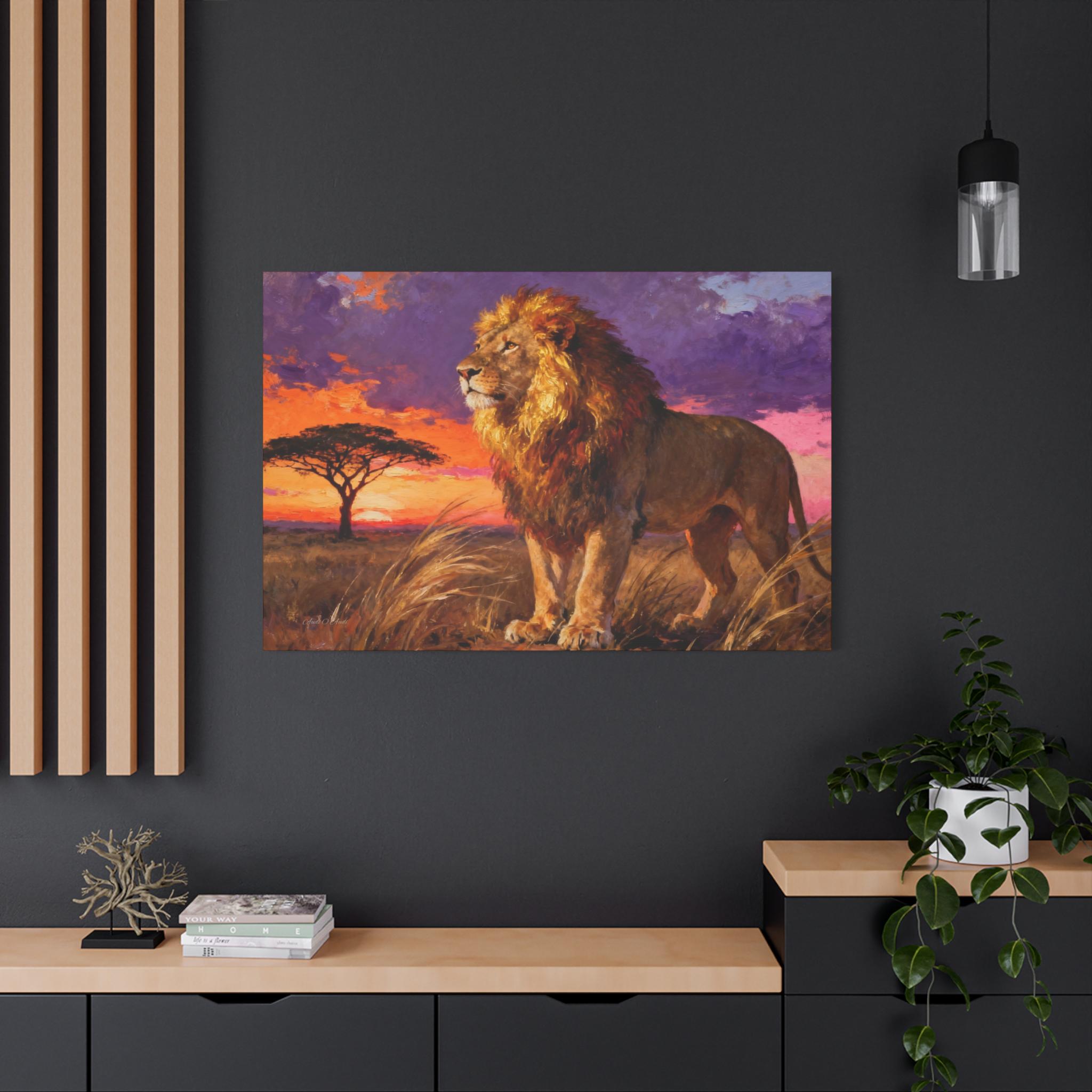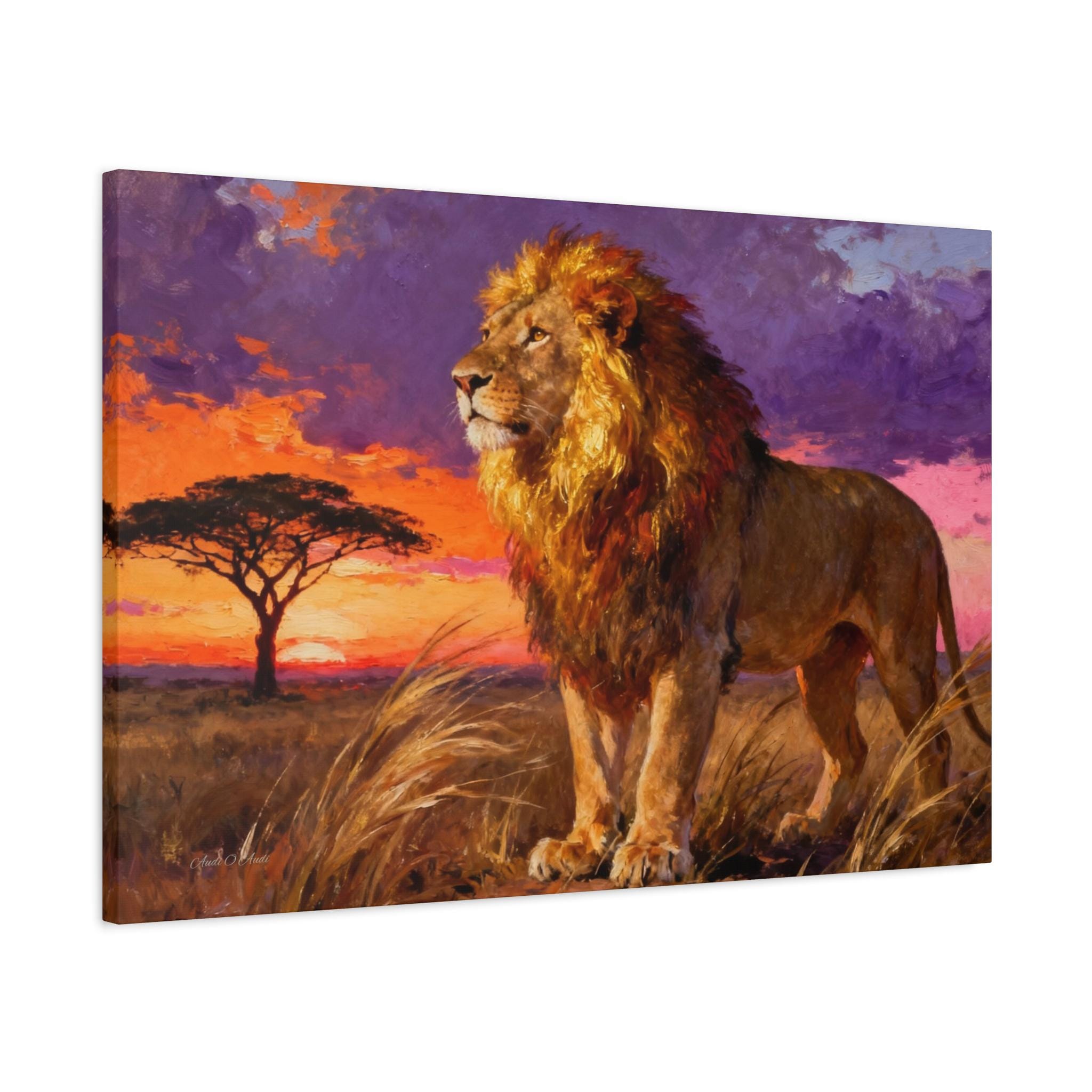 Capture the untamed spirit of the African plains with this breathtaking canvas print. "The Golden Guardian" features a majestic male lion standing proud against a dramatic, vivid backdrop of a setting sun.