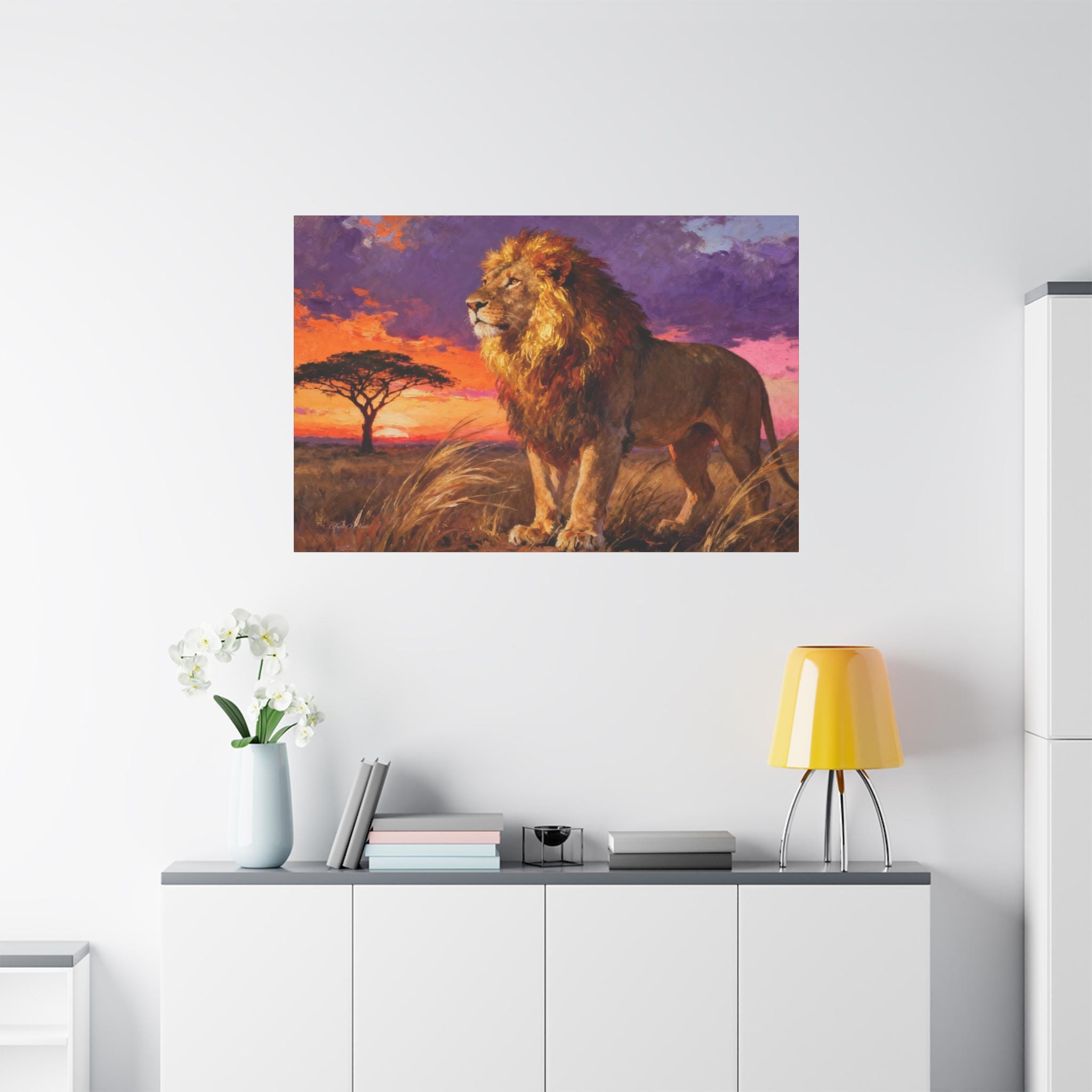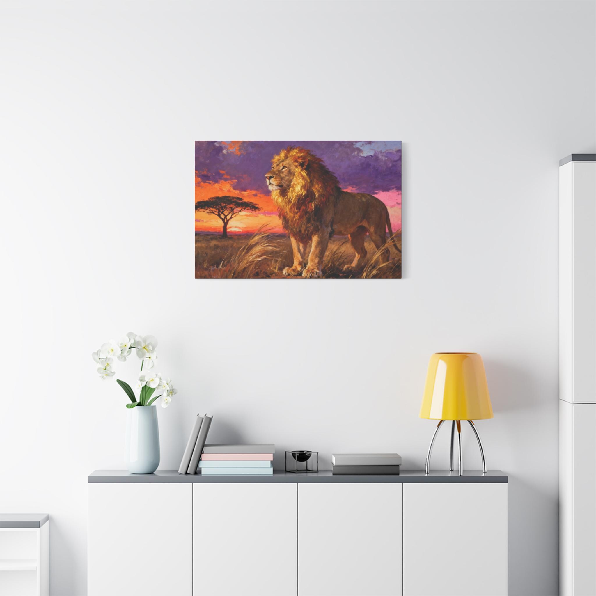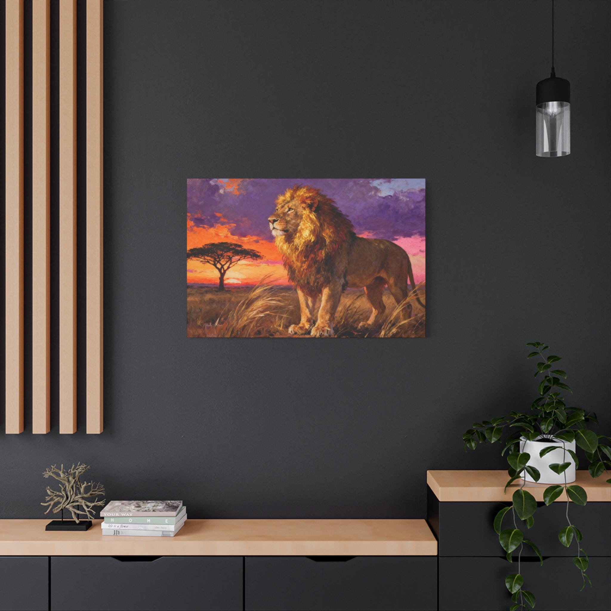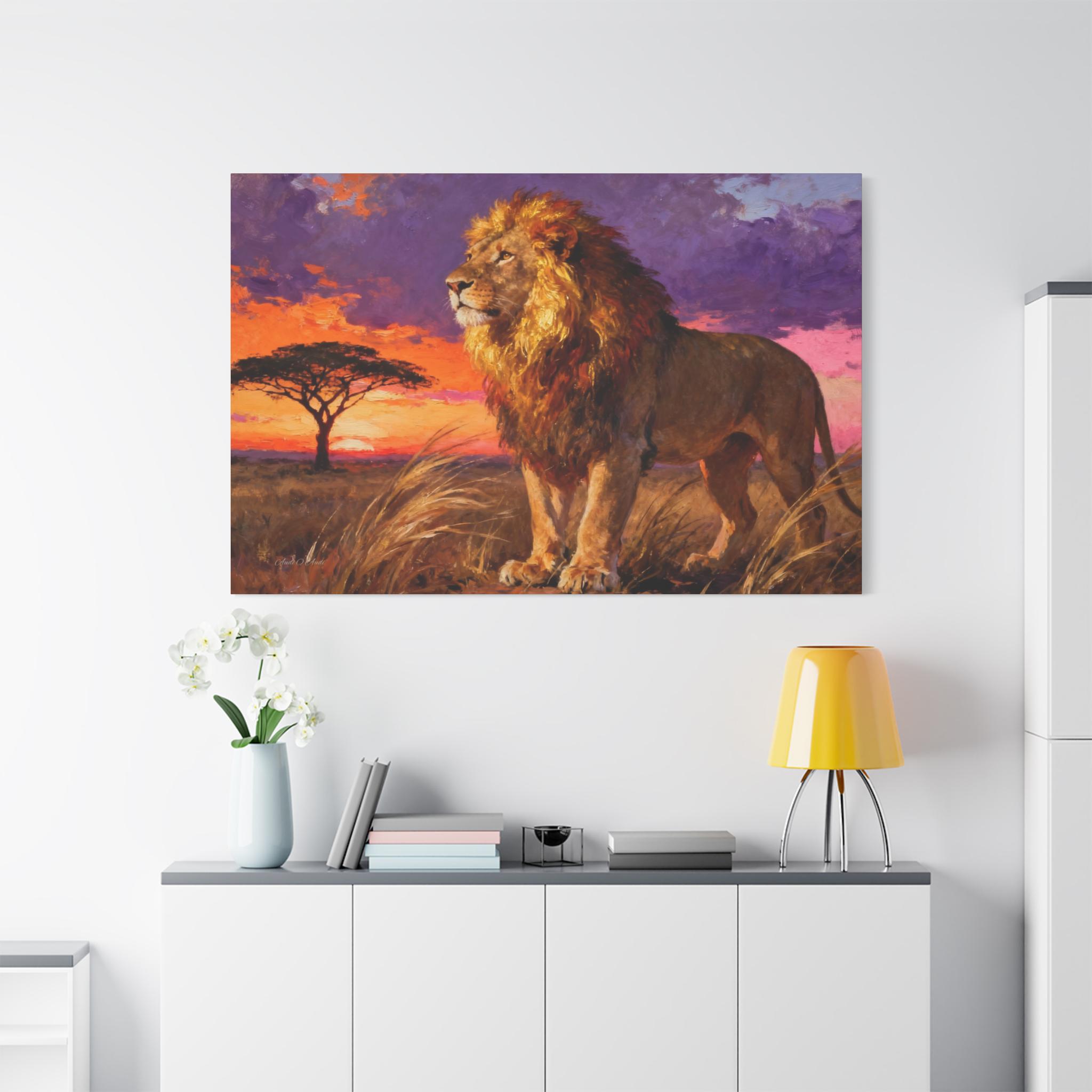 Capture the untamed spirit of the African plains with this breathtaking canvas print. "The Golden Guardian" features a majestic male lion standing proud against a dramatic, vivid backdrop of a setting sun.
