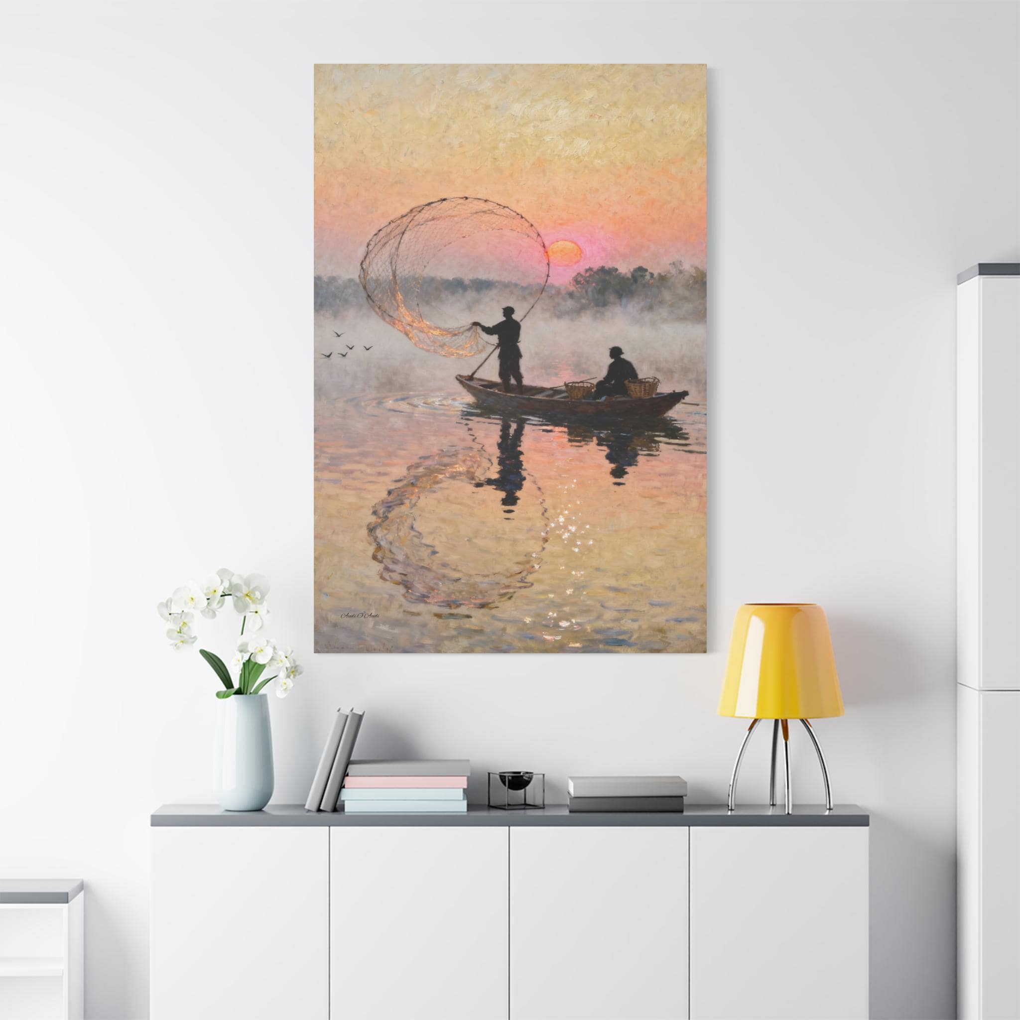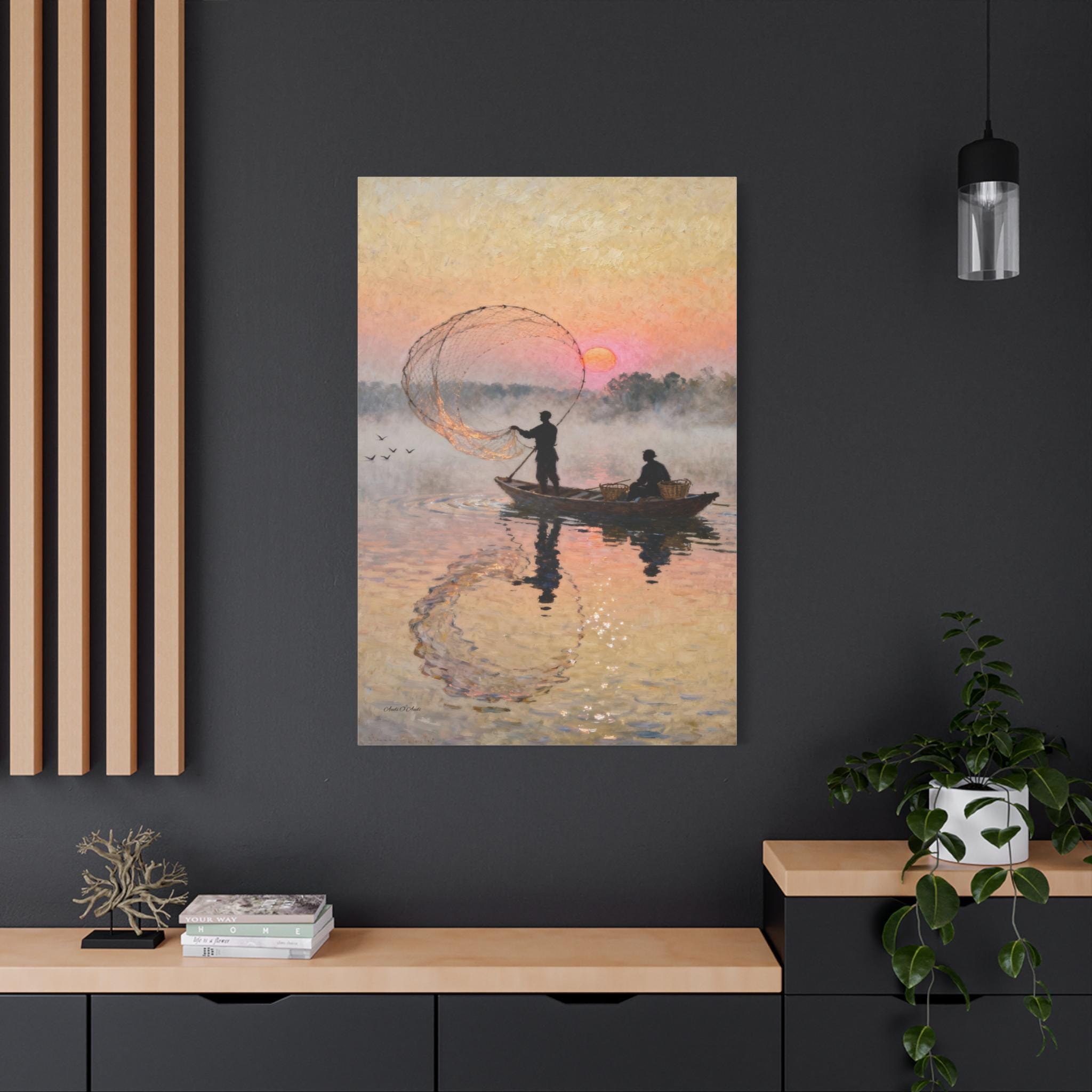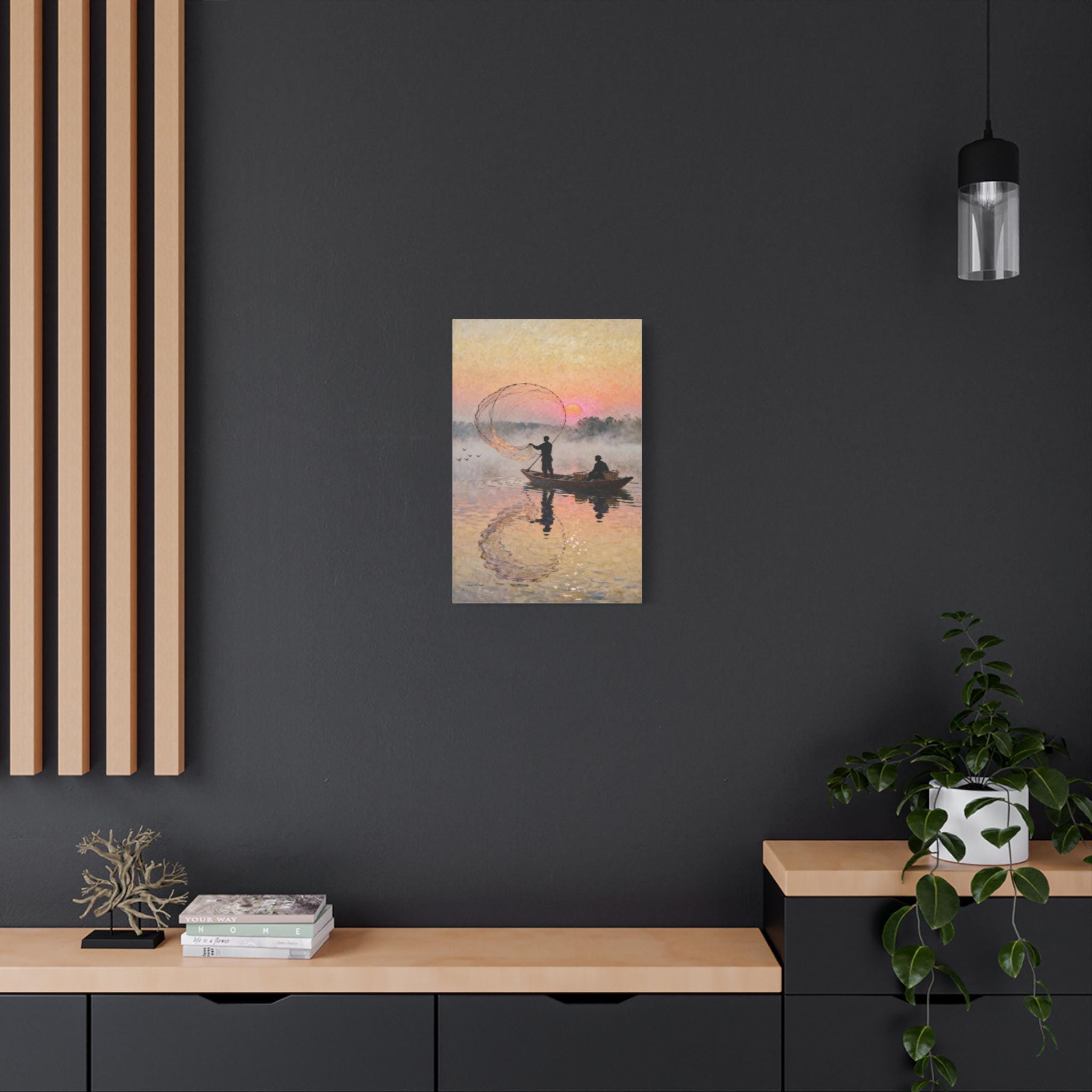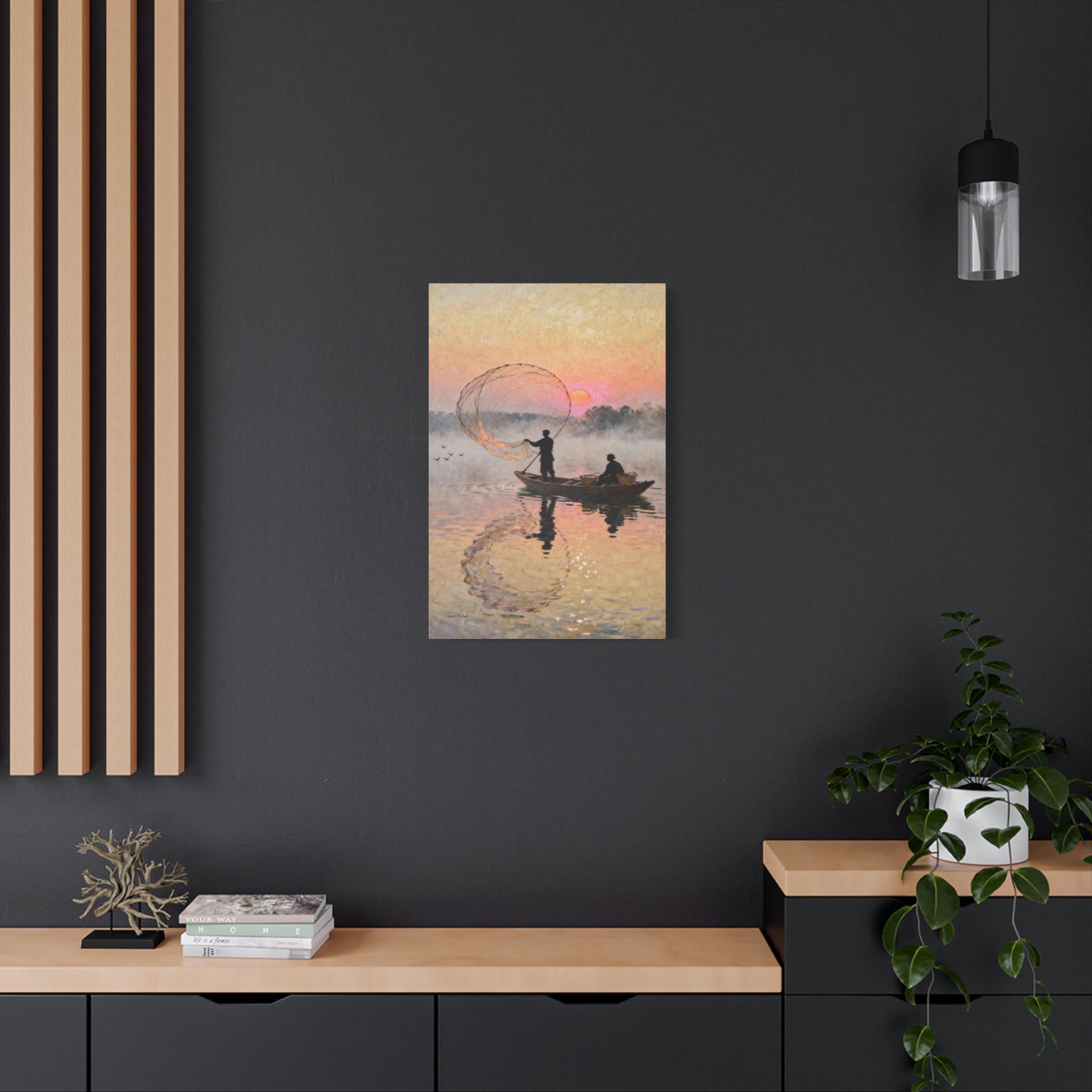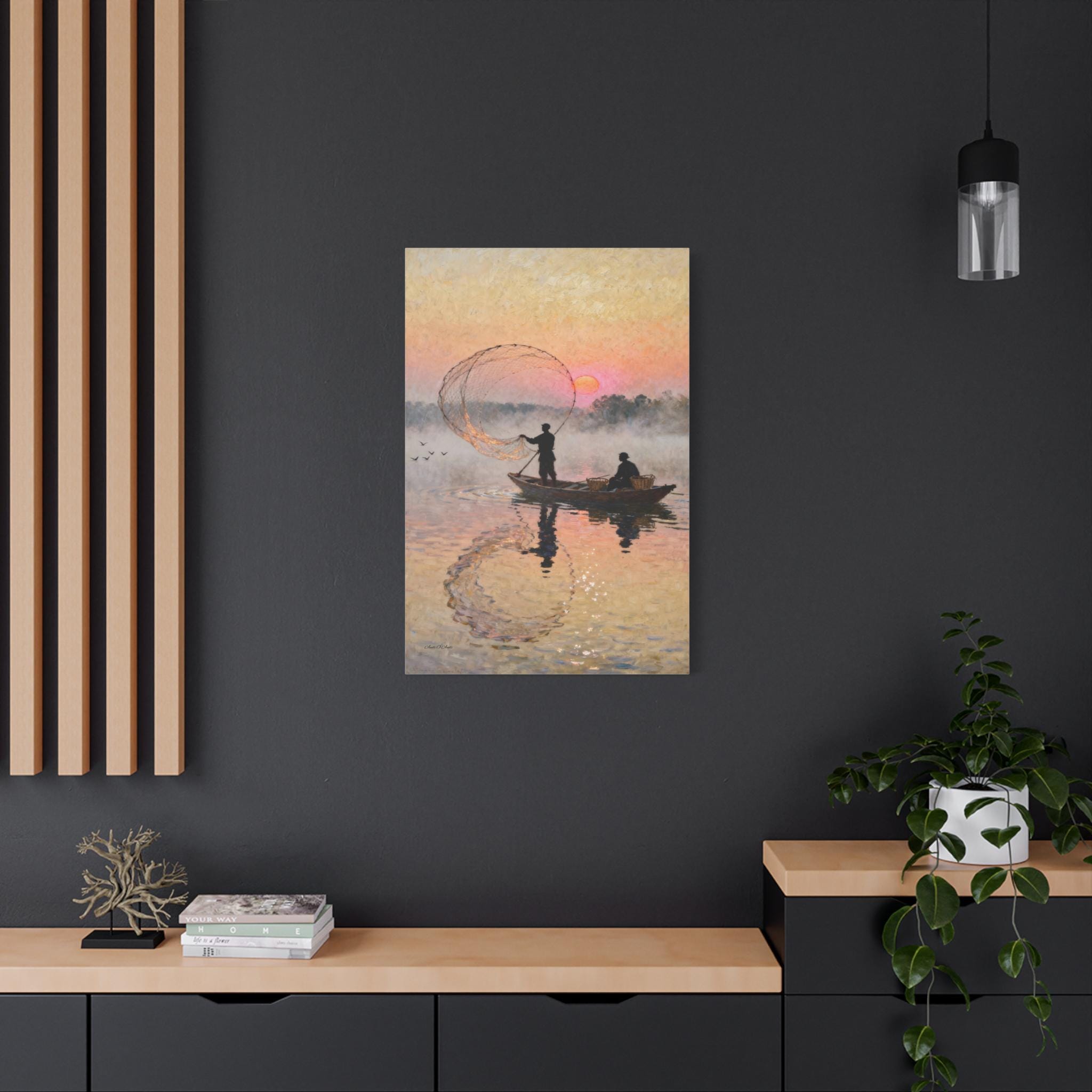 Bring the quiet, peaceful beauty of a morning on the water into your home with this stunning fishermen canvas print. This captivating artwork captures two silhouetted figures in a small wooden boat on a calm, misty river. One fisherman is gracefully casting a large, circular net against the backdrop of a glowing, soft pink and peach sunrise.