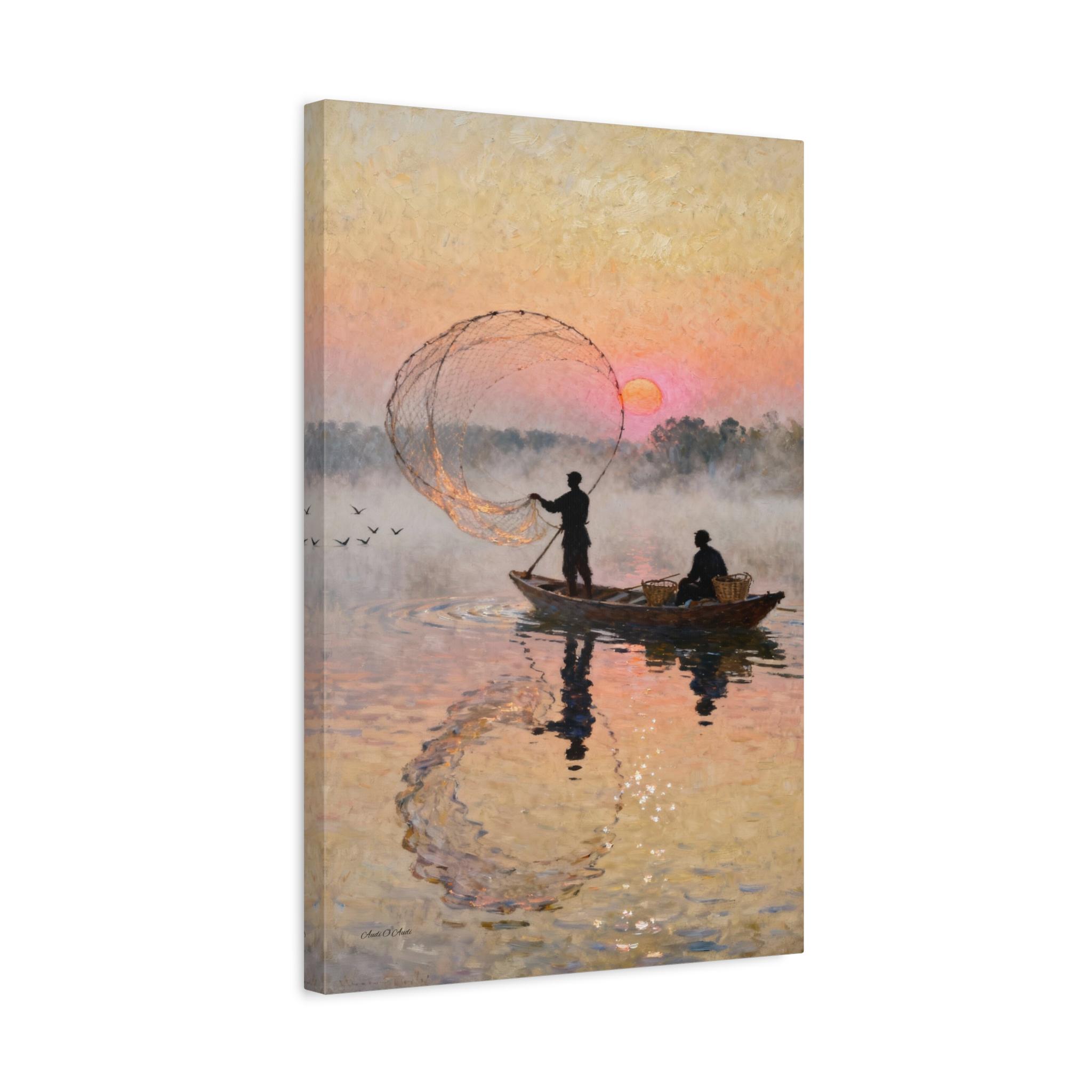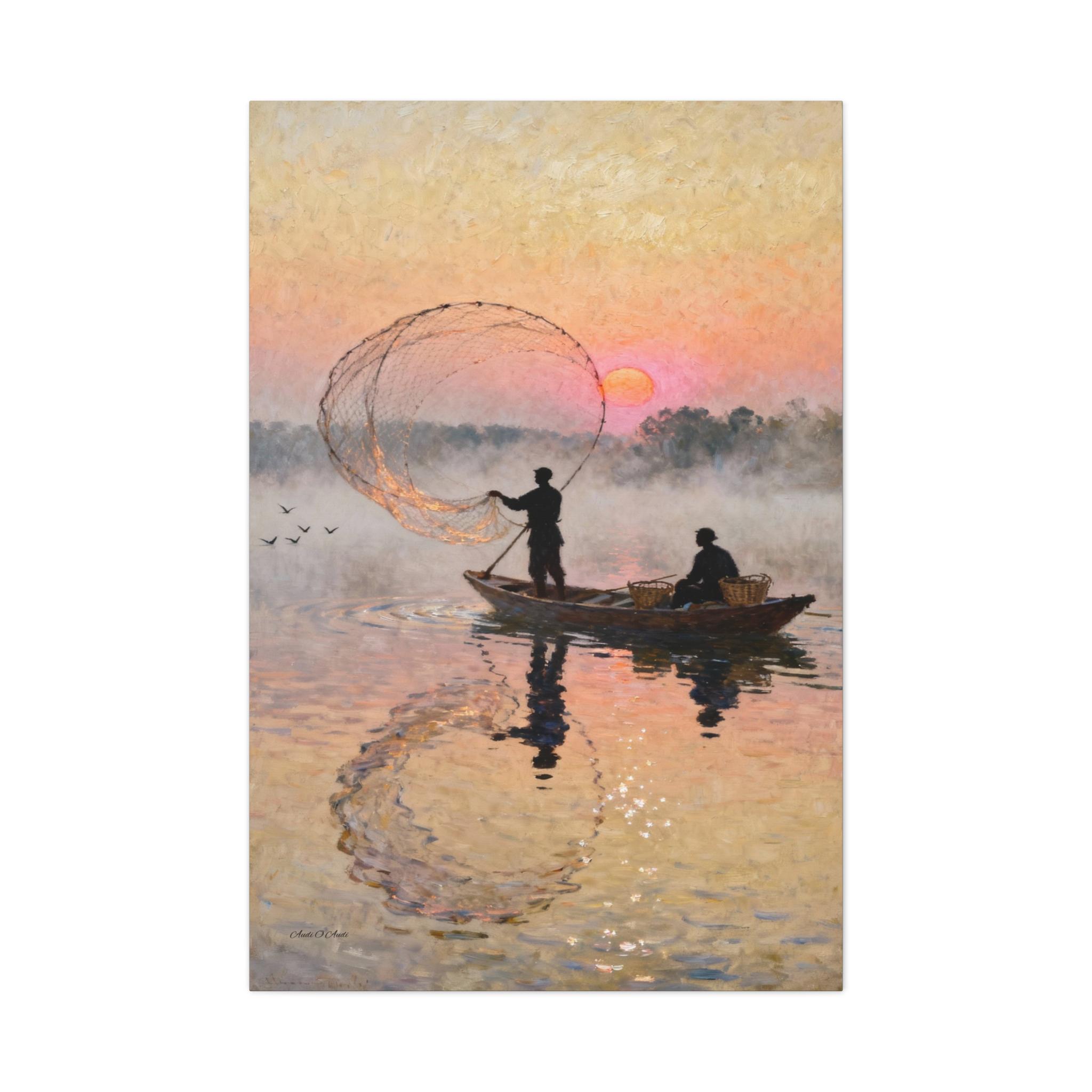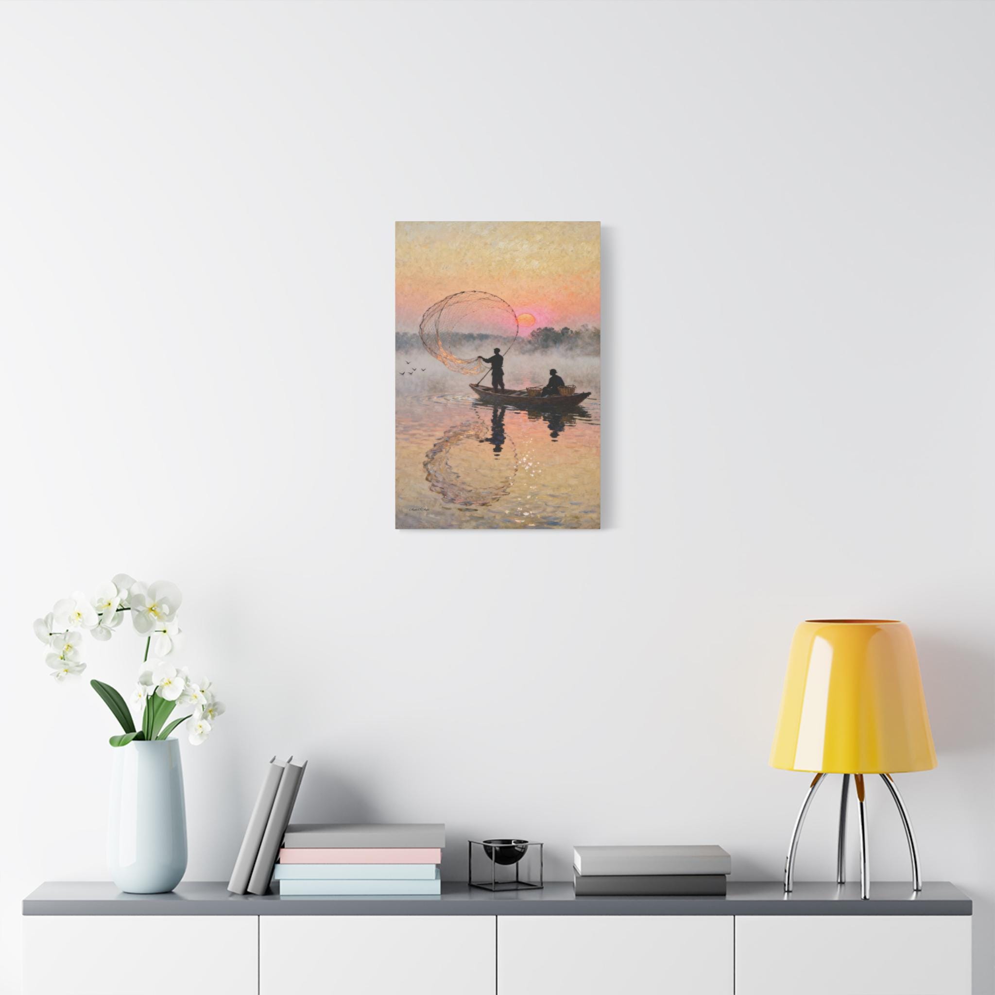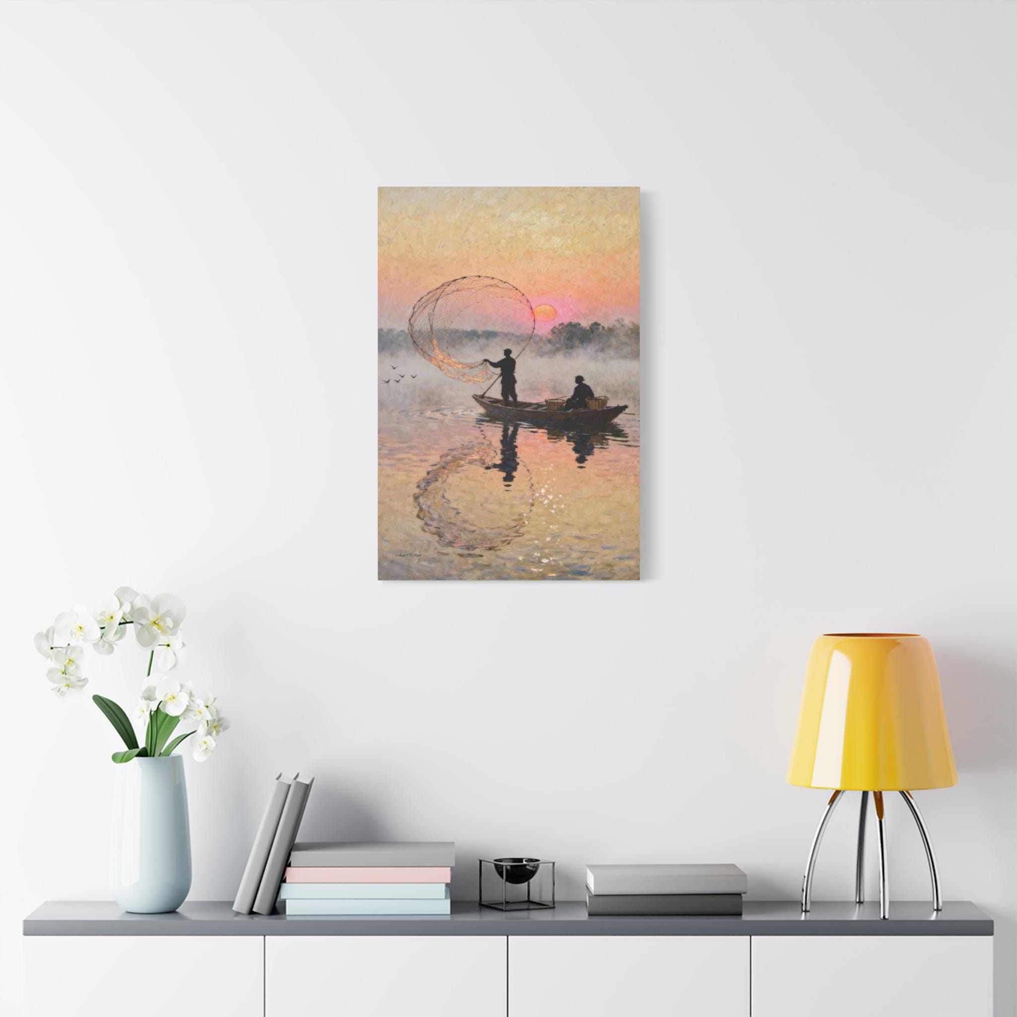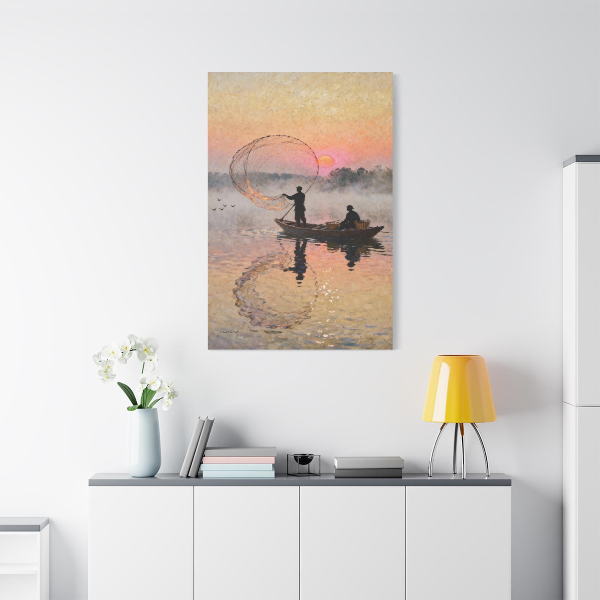 Bring the quiet, peaceful beauty of a morning on the water into your home with this stunning fishermen canvas print. This captivating artwork captures two silhouetted figures in a small wooden boat on a calm, misty river. One fisherman is gracefully casting a large, circular net against the backdrop of a glowing, soft pink and peach sunrise.