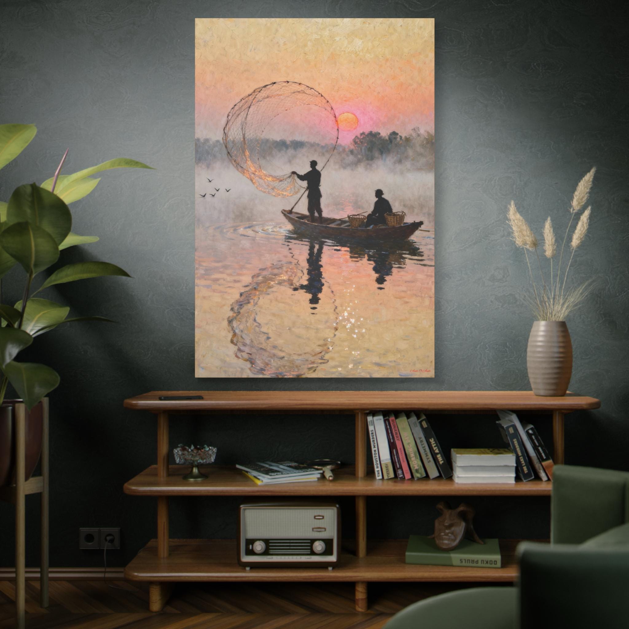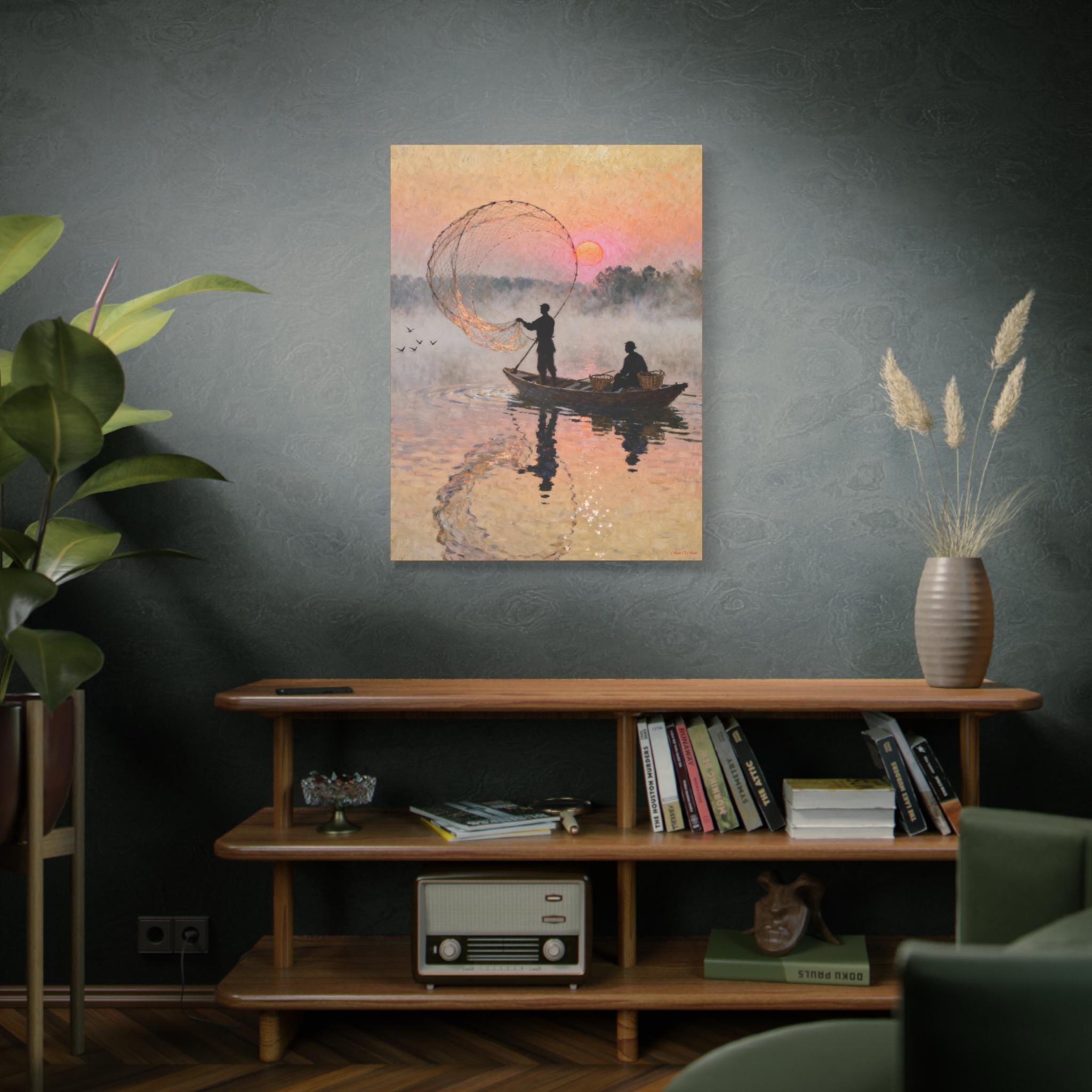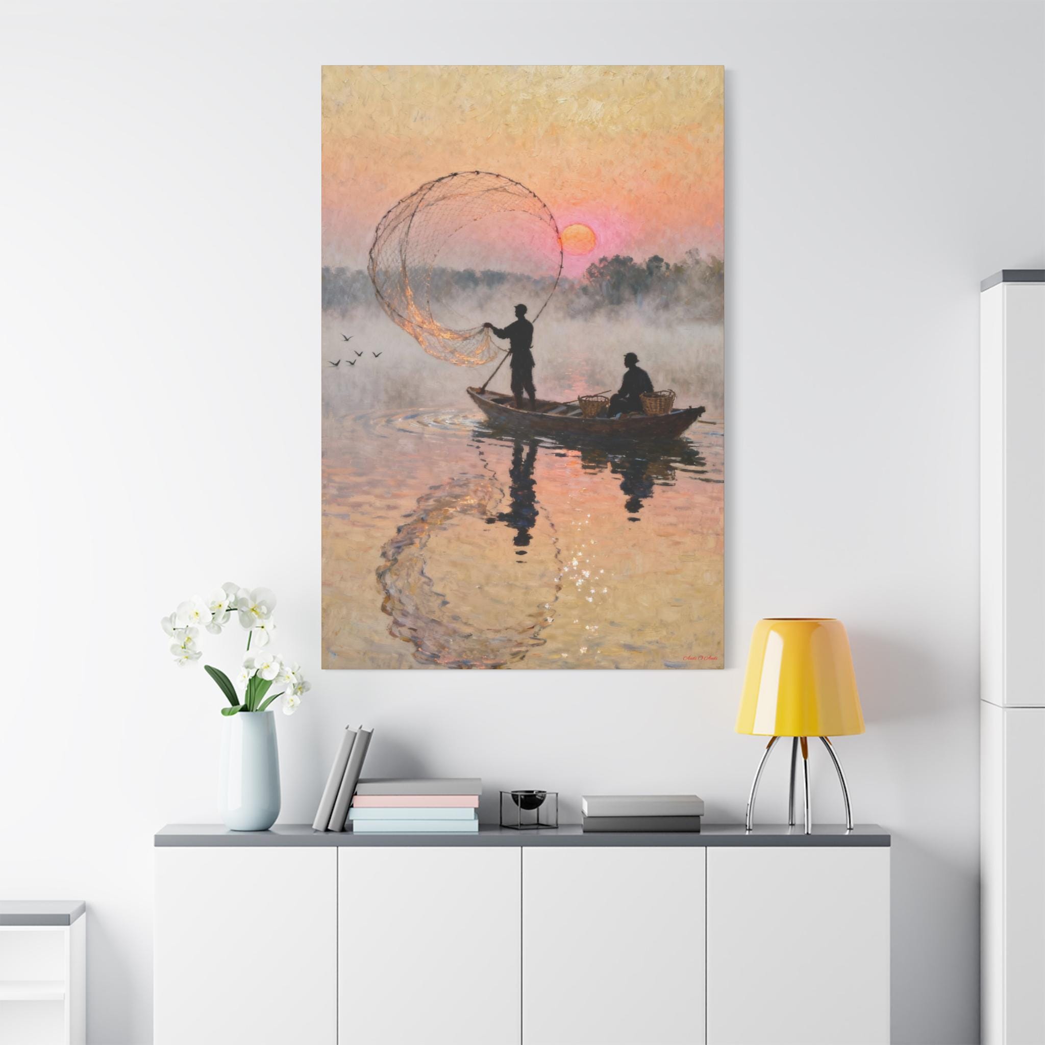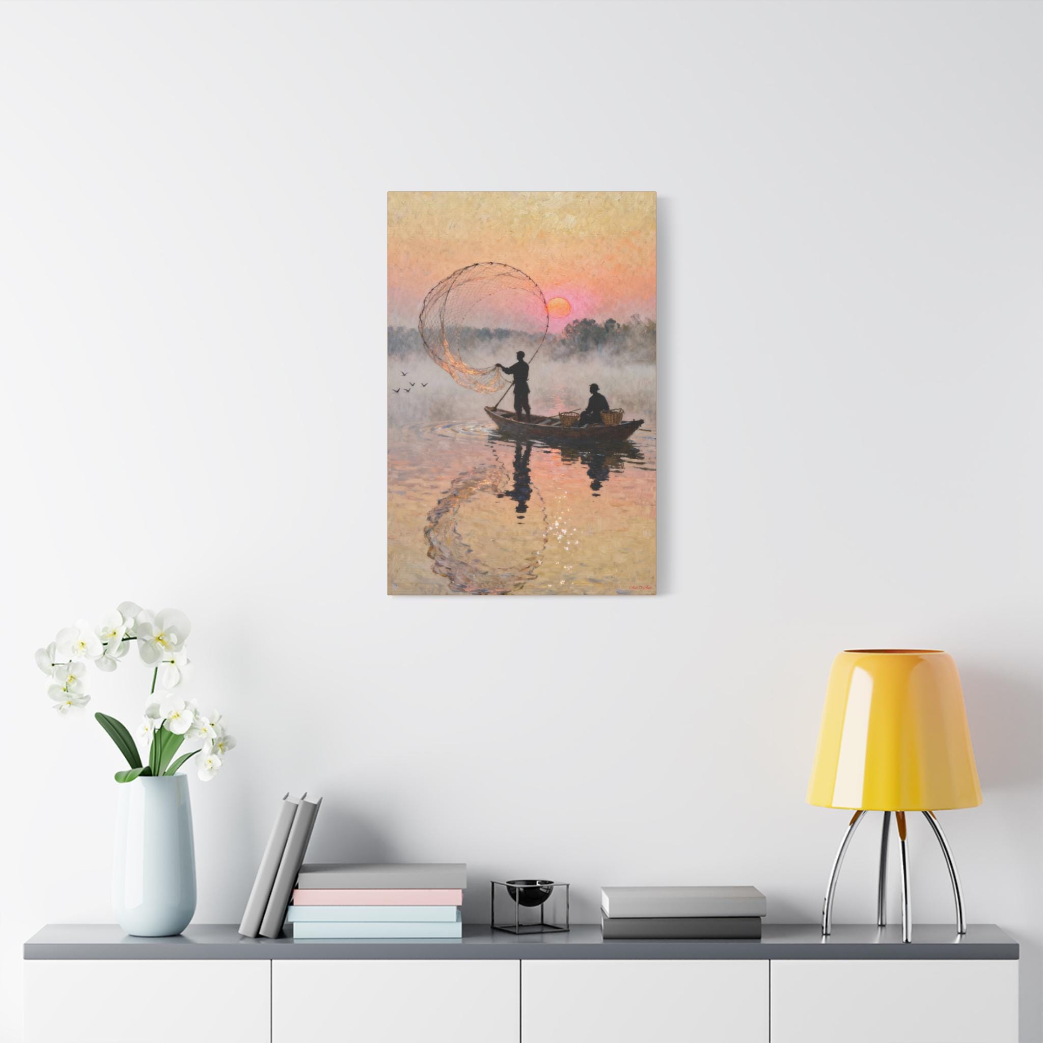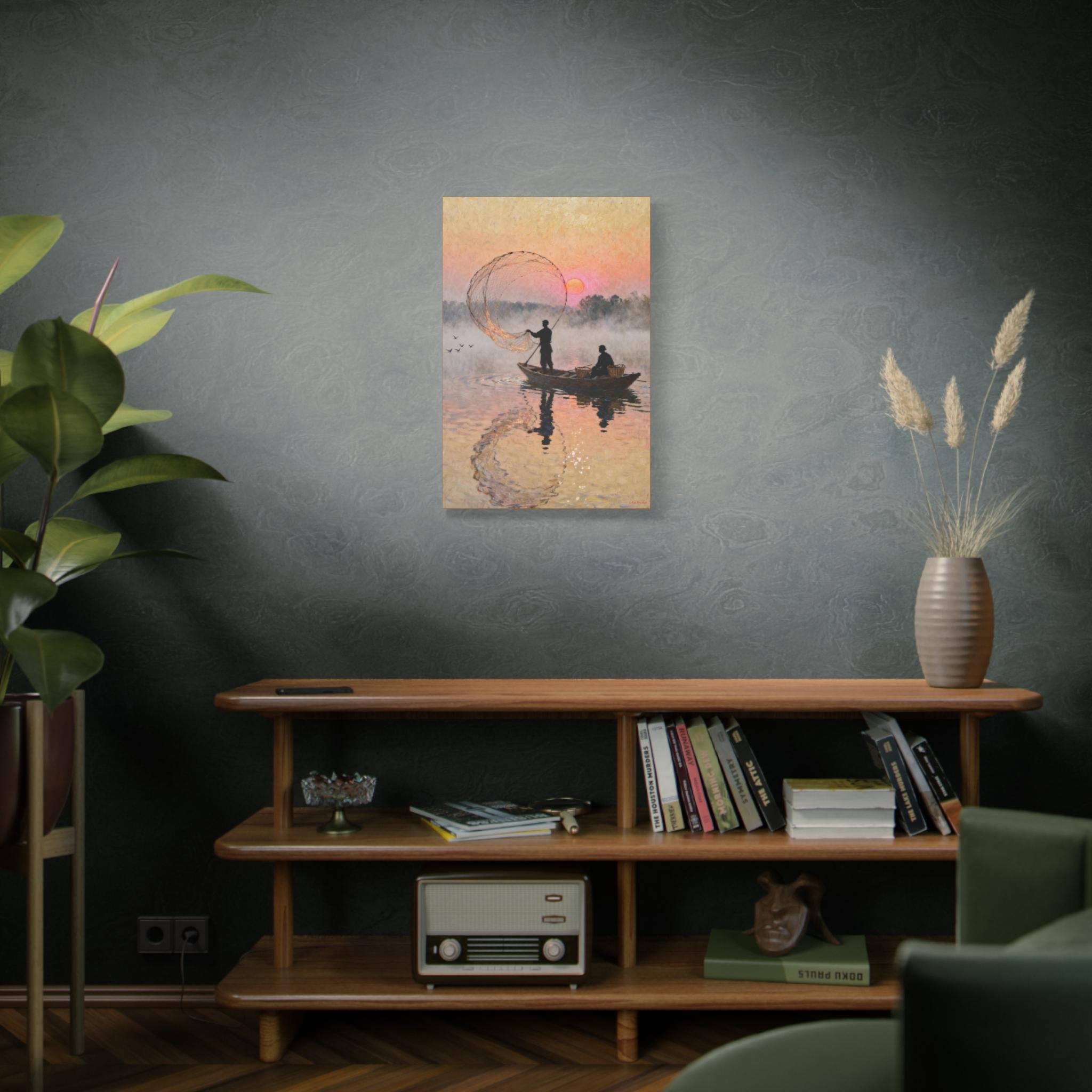 Fishermen at Sunrise Canvas Print: Vintage Fishing Scene Wall Art