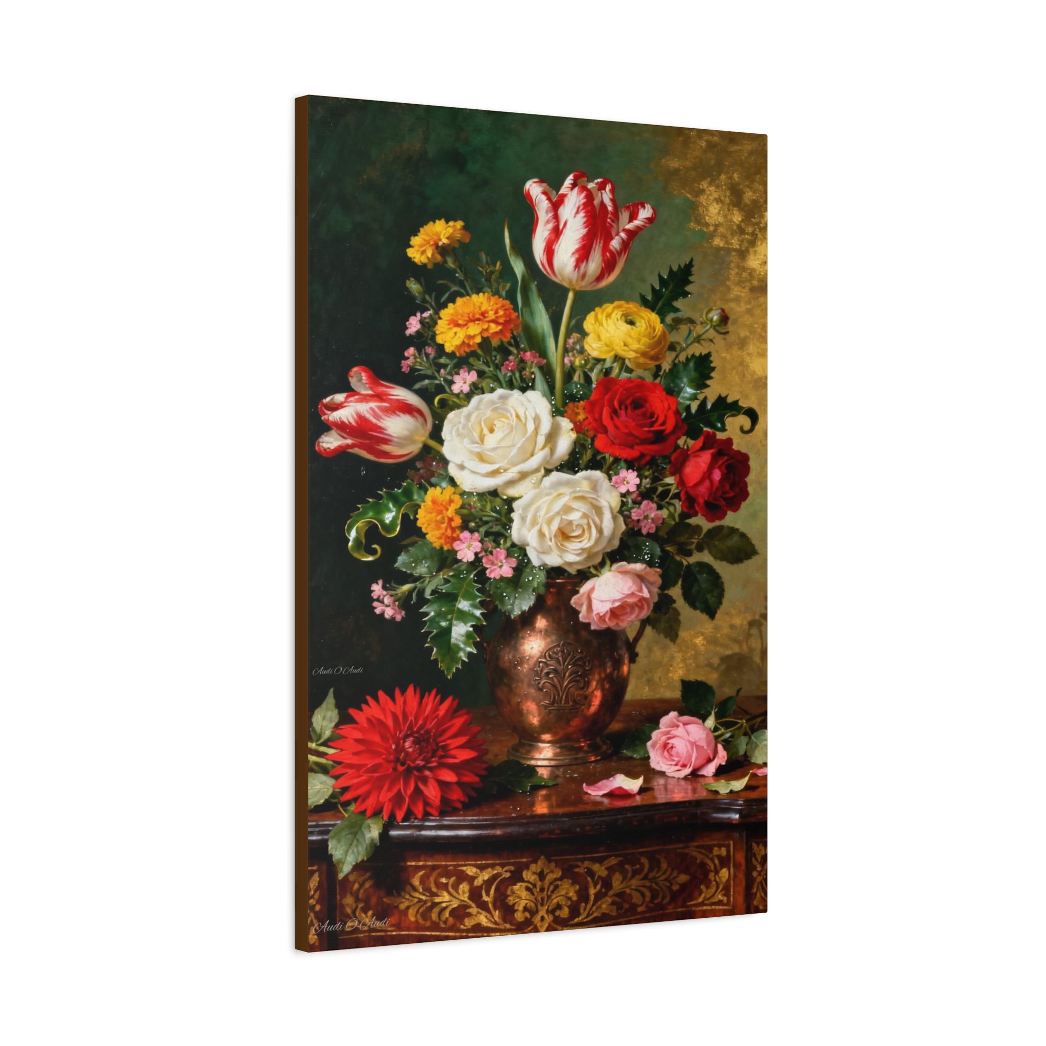 This is an exceptional Giclée Canvas Print reproduction of a 17th-Century Dutch Golden Age style still life, characterized by its meticulous detail, dramatic lighting, and opulent subject matter. This type of painting is often referred to as a Florilegium (a collection of flowers).