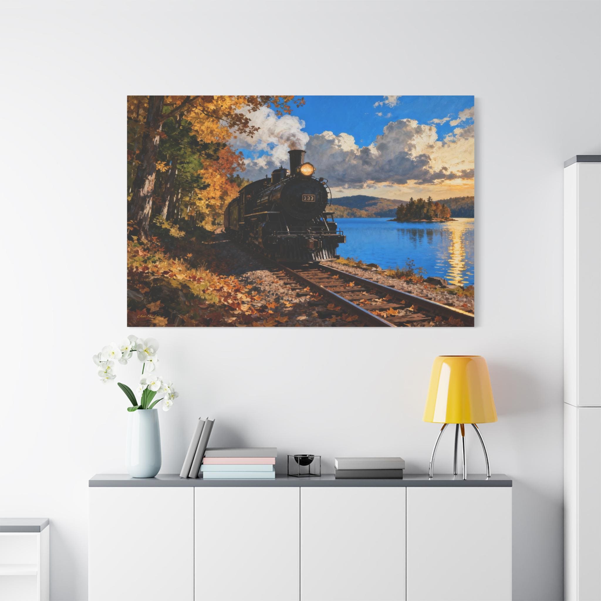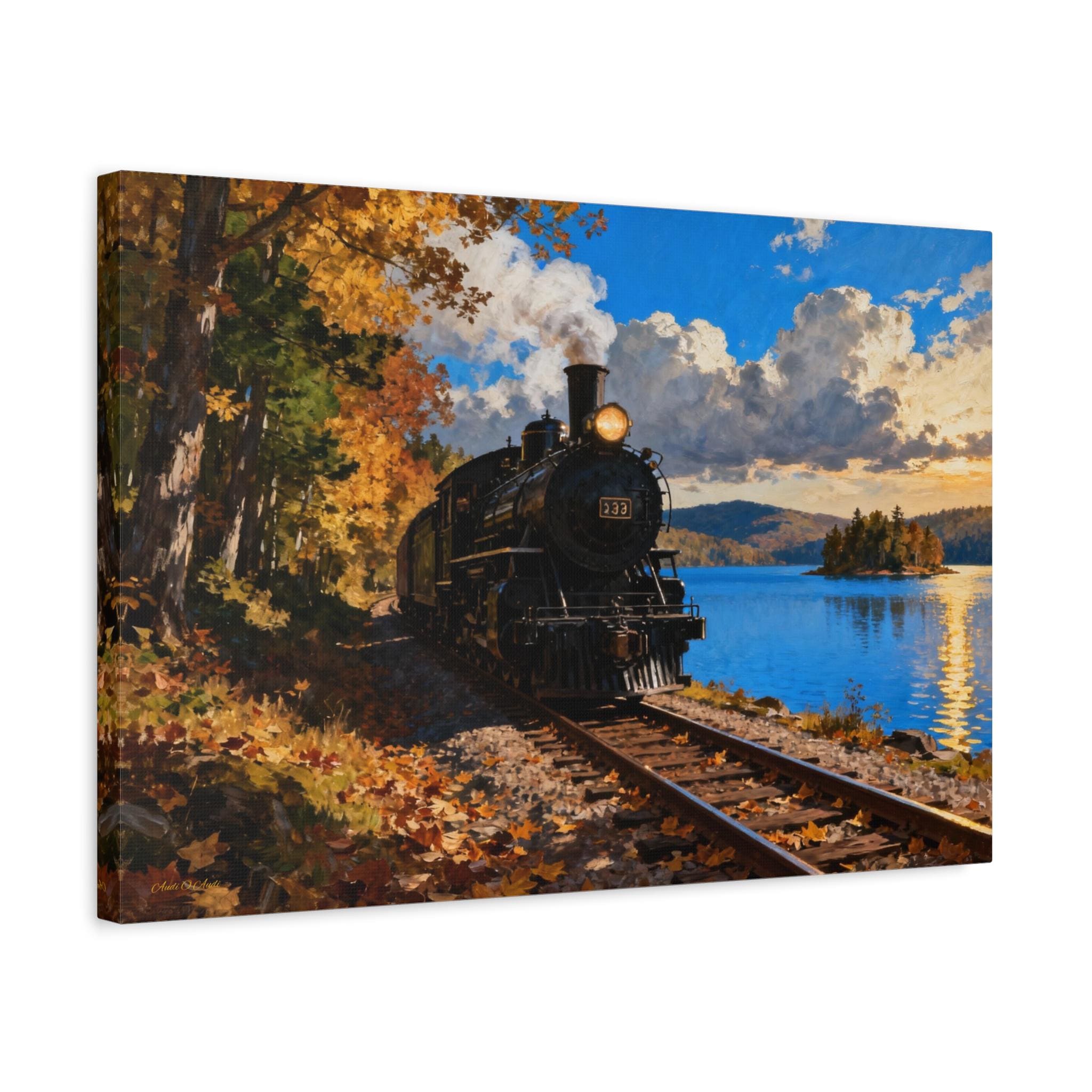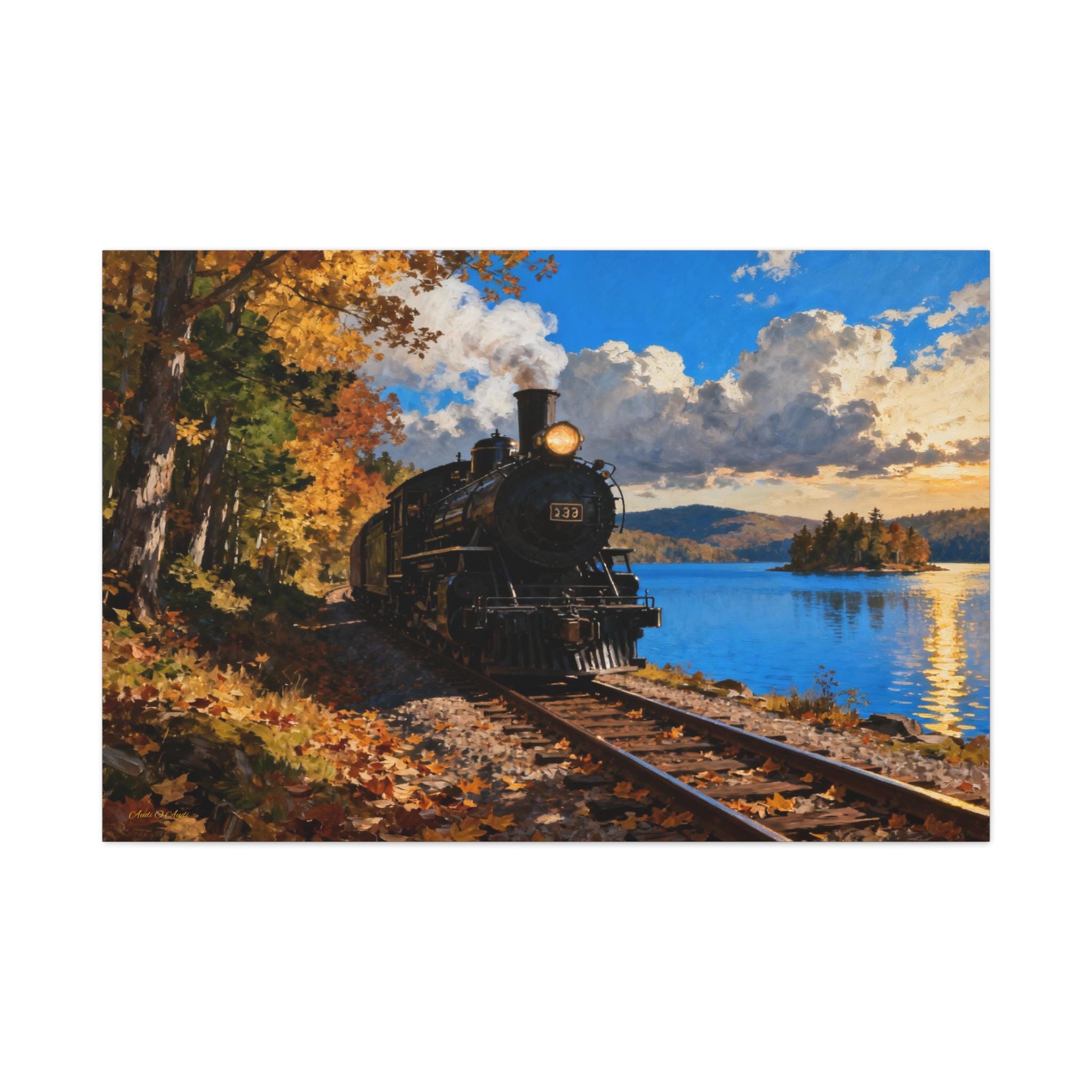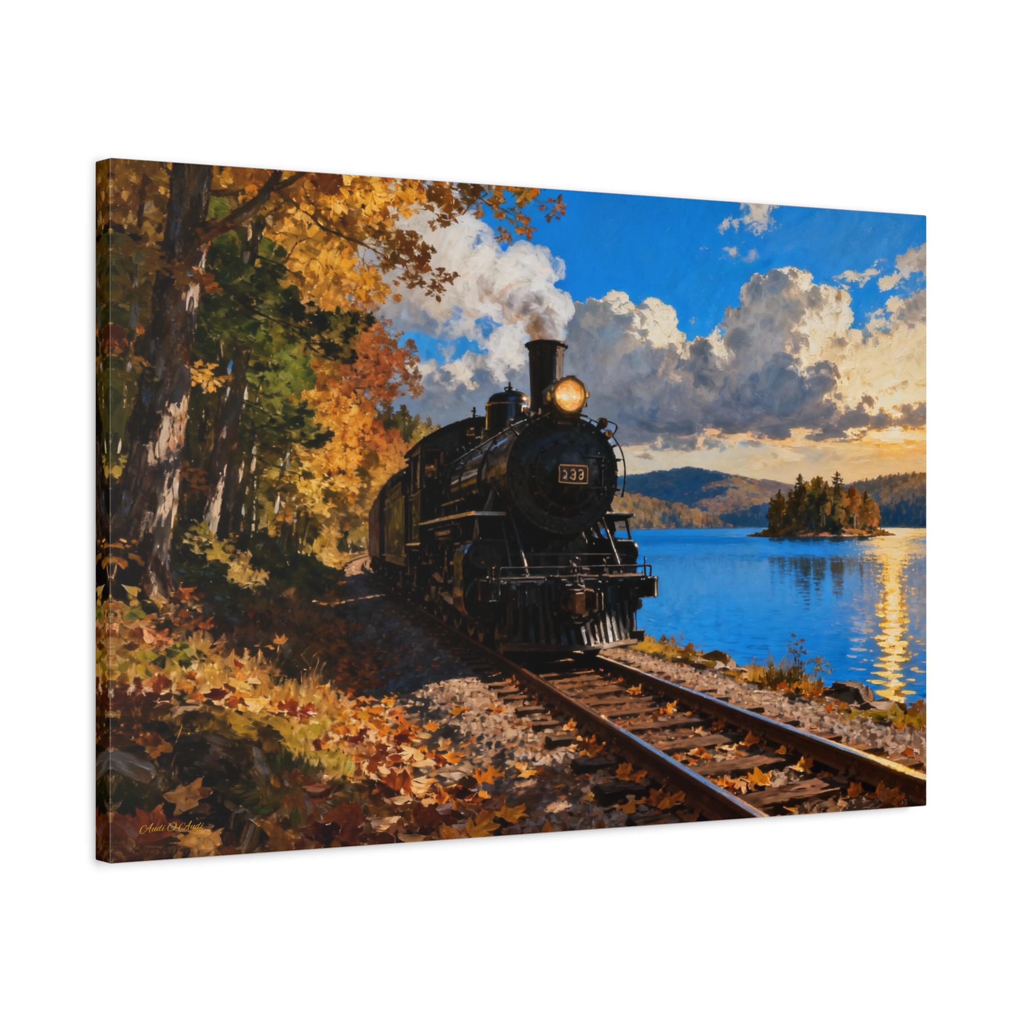 All aboard for a journey through a golden autumn landscape with this nostalgic canvas print of a vintage steam locomotive. This breathtaking artwork features a classic black steam engine (No. 233) chugging along a lakeside track, surrounded by vibrant fall foliage and bathed in the warm glow of a setting sun.