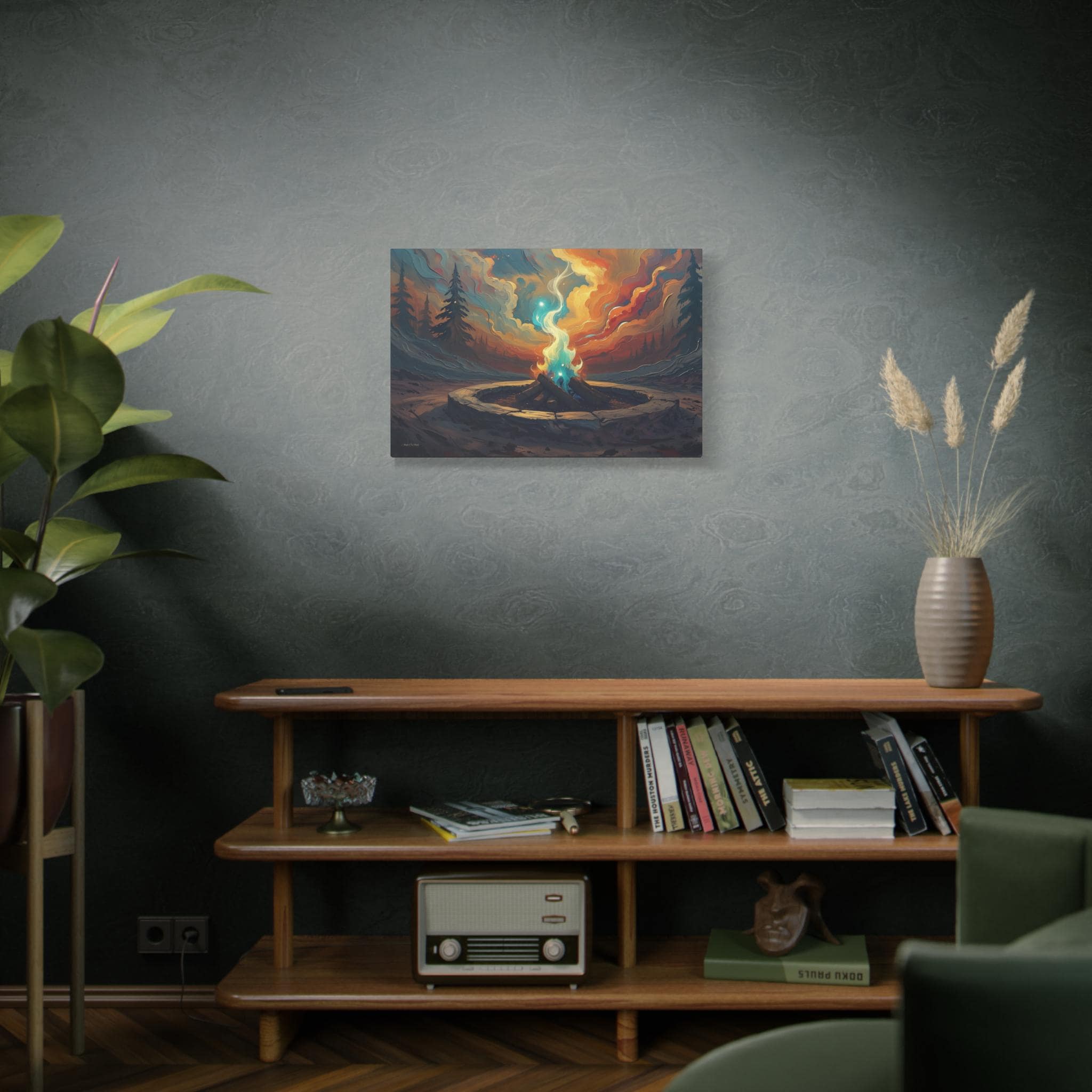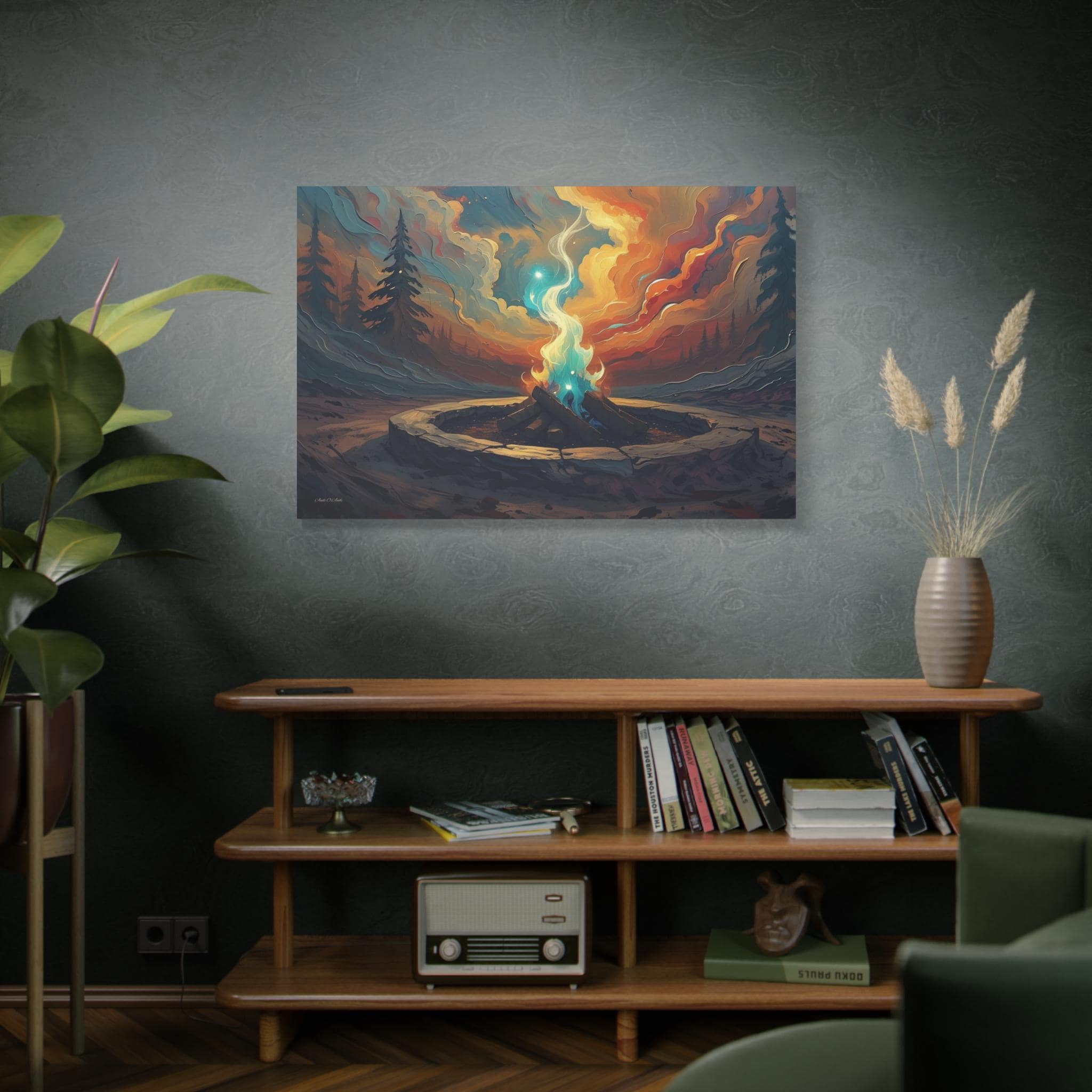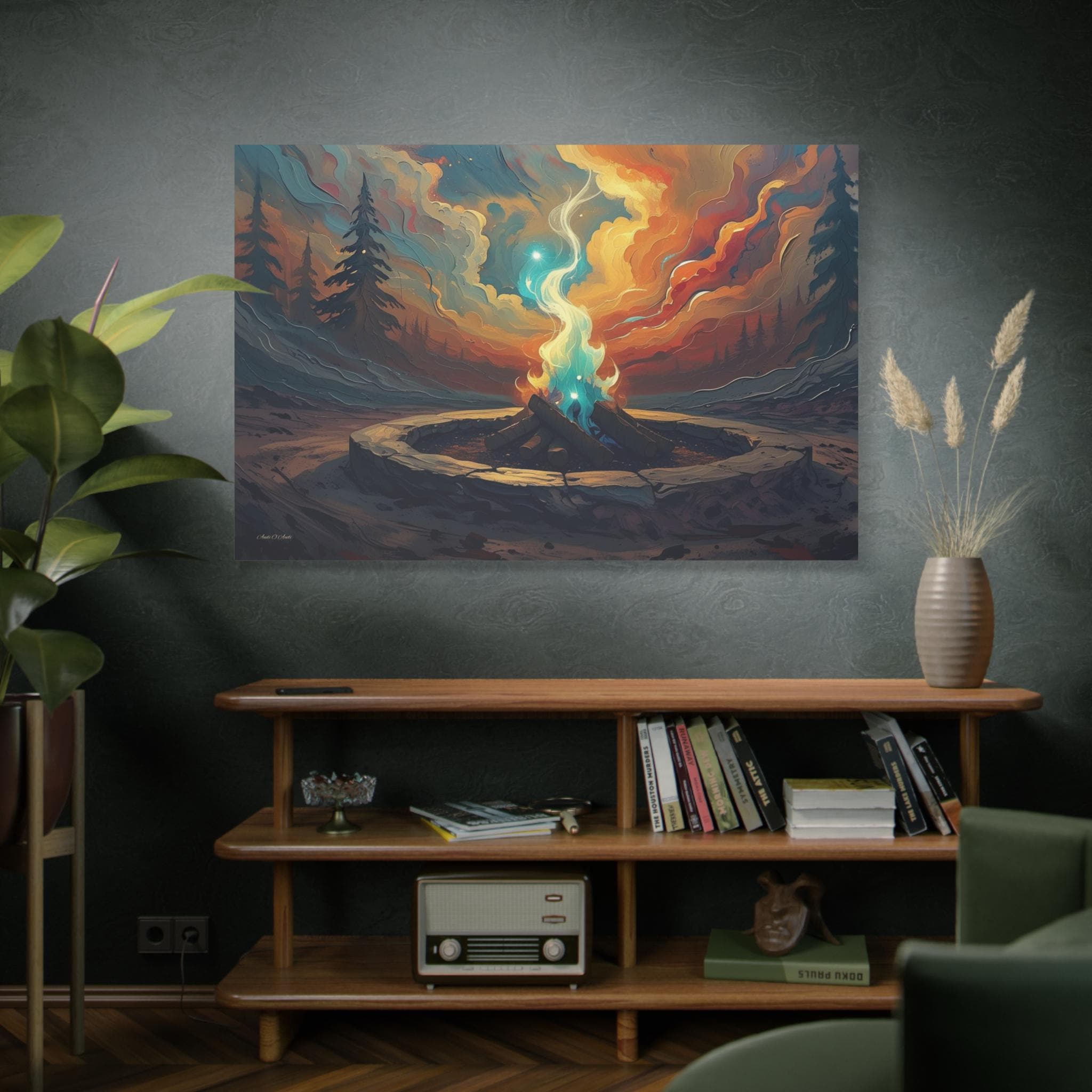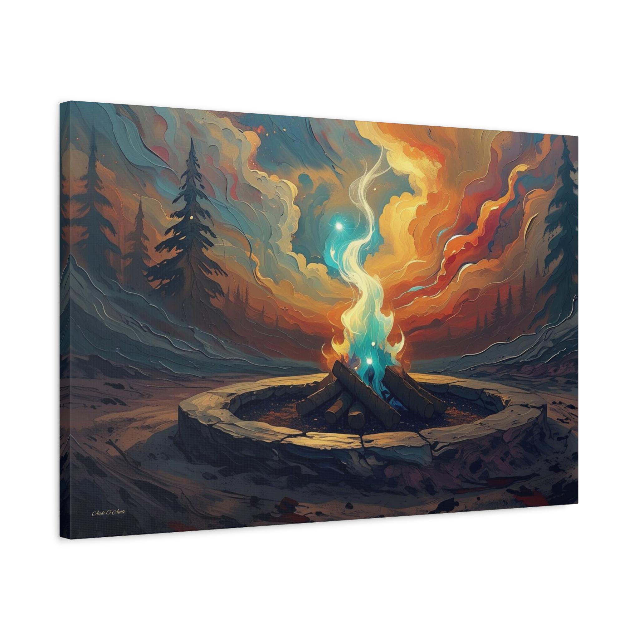 Bring the cozy, crackling atmosphere of a perfect evening campfire into your home. This stunning canvas print captures a vibrant fire pit surrounded by a stone ring, its warm, golden light reflecting beautifully on the surrounding tall grass and towering pine trees. Set against a deep, serene twilight sky, this artwork evokes feelings of peace, warmth, and the simple magic of the wilderness.